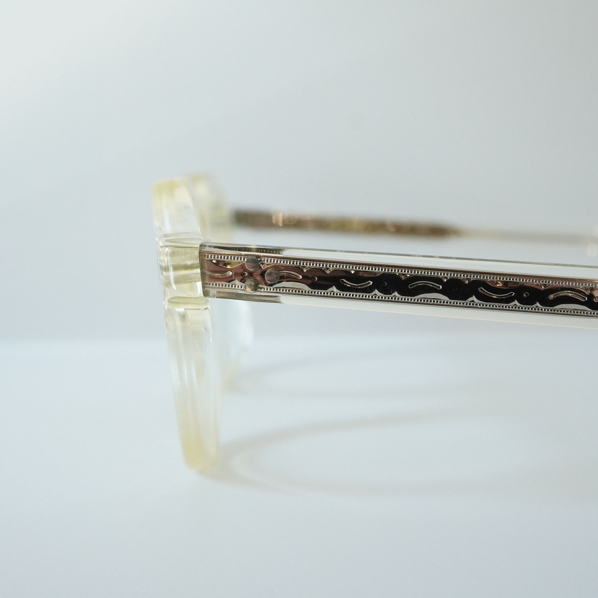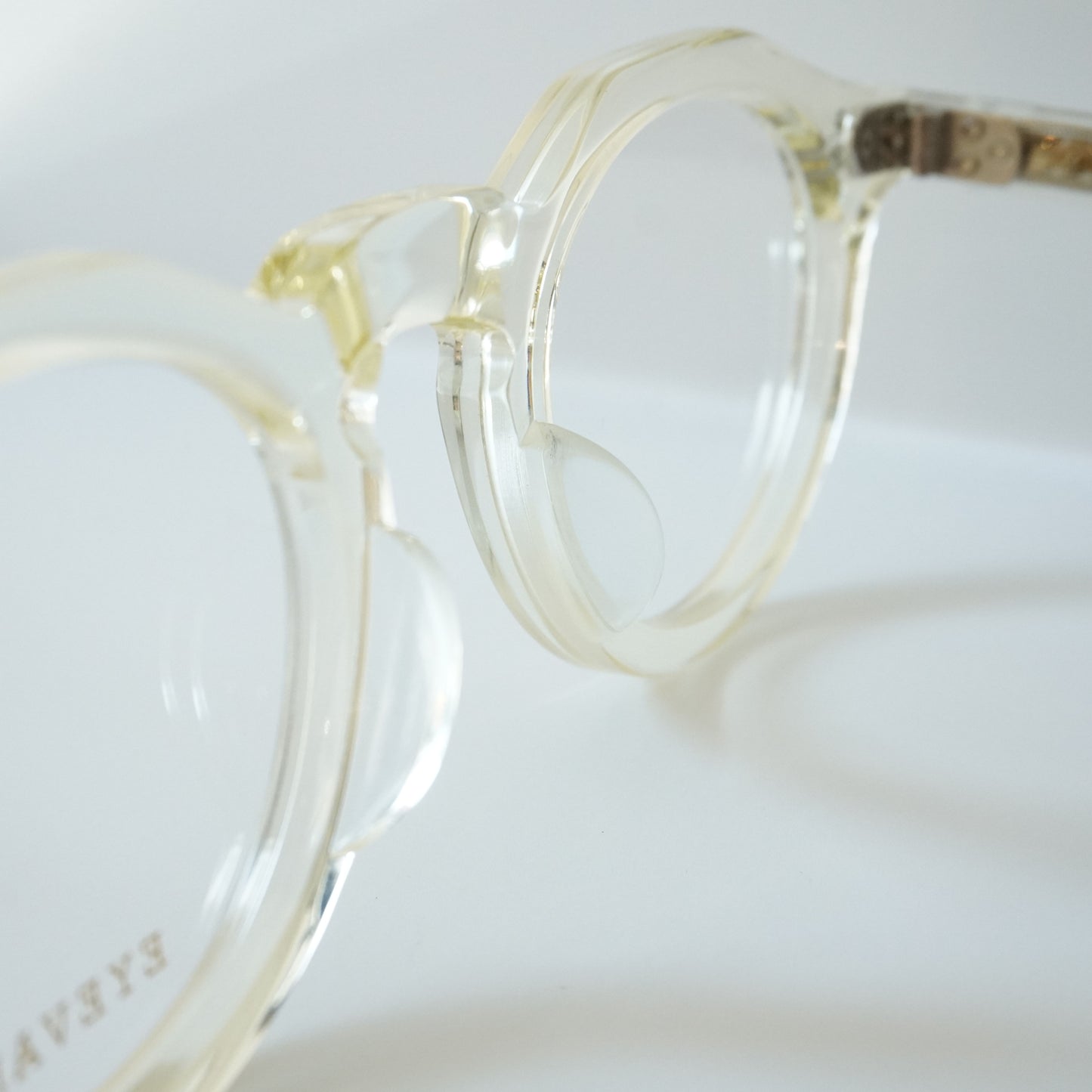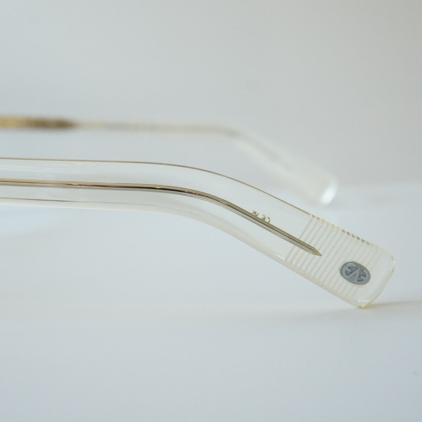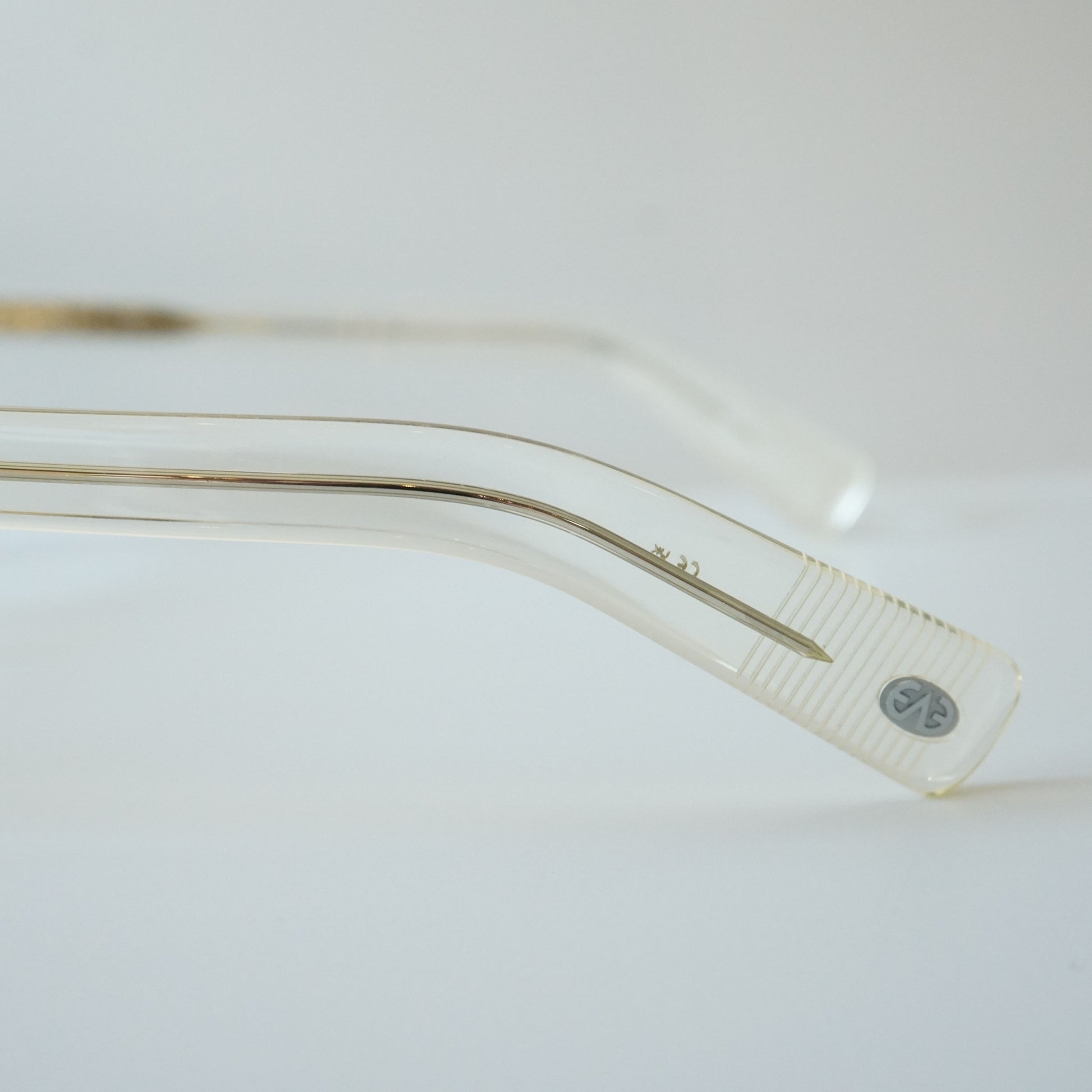 This model expresses E YEVAN's idea of French vintage with its thick, edgy front and extra-thick wide temples. The front and temple hinges are original reproductions of the 60s design, and the manufacturing method uses a riveting technique with a fixed hinge. We paid particular attention to the details of the vintage style, such as making the pins of the riveting as invisible as possible.