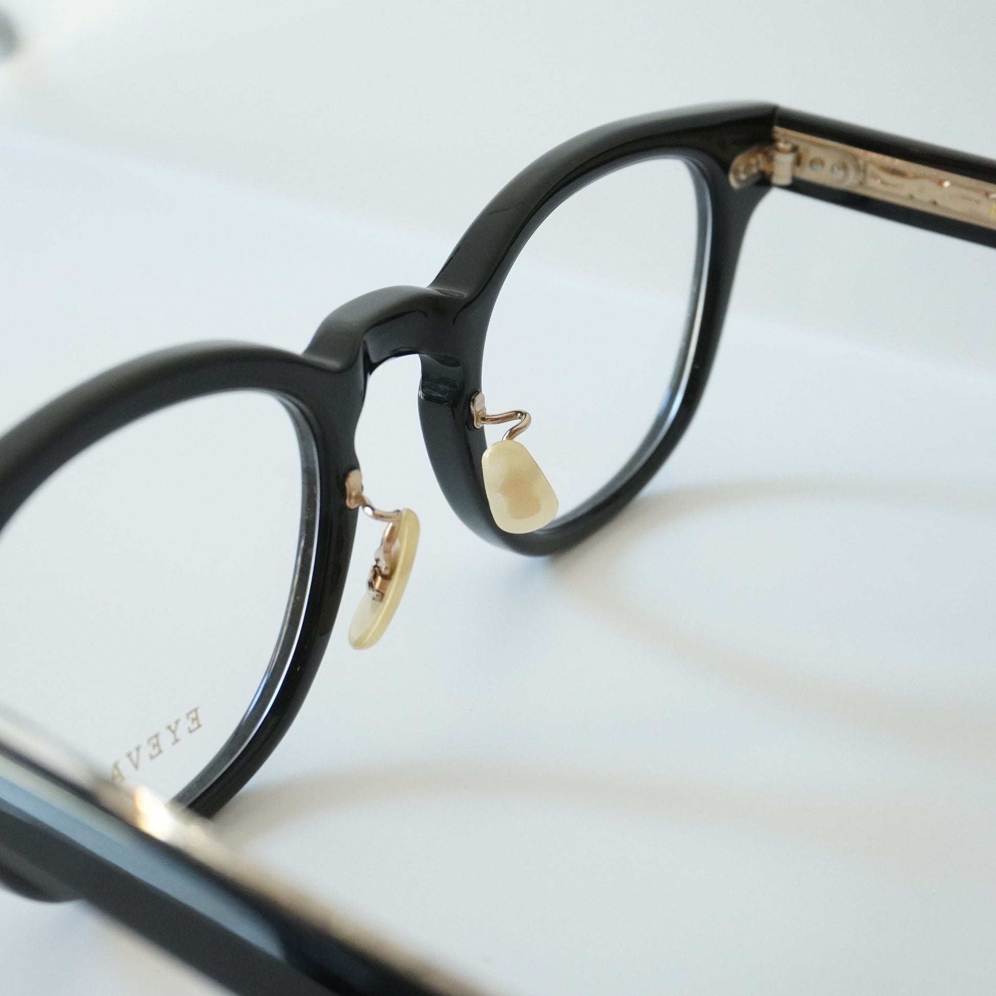The COMFORTABLE PAD MODEL "Webb-CP" is a version of EYEVAN's iconic model "Webb" with a cling arm. "Webb" is a masterpiece of Wellington plastic frames that uses original rivet hinges and an original temple core with a pattern inspired by classic car parts engraved on the front and back. The cling arm pad provides a more comfortable fit. The pad color is a vintage style, creating a luxurious look.
