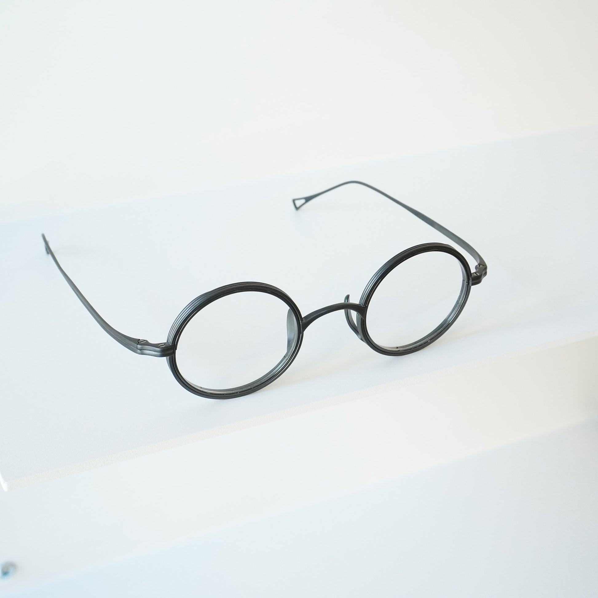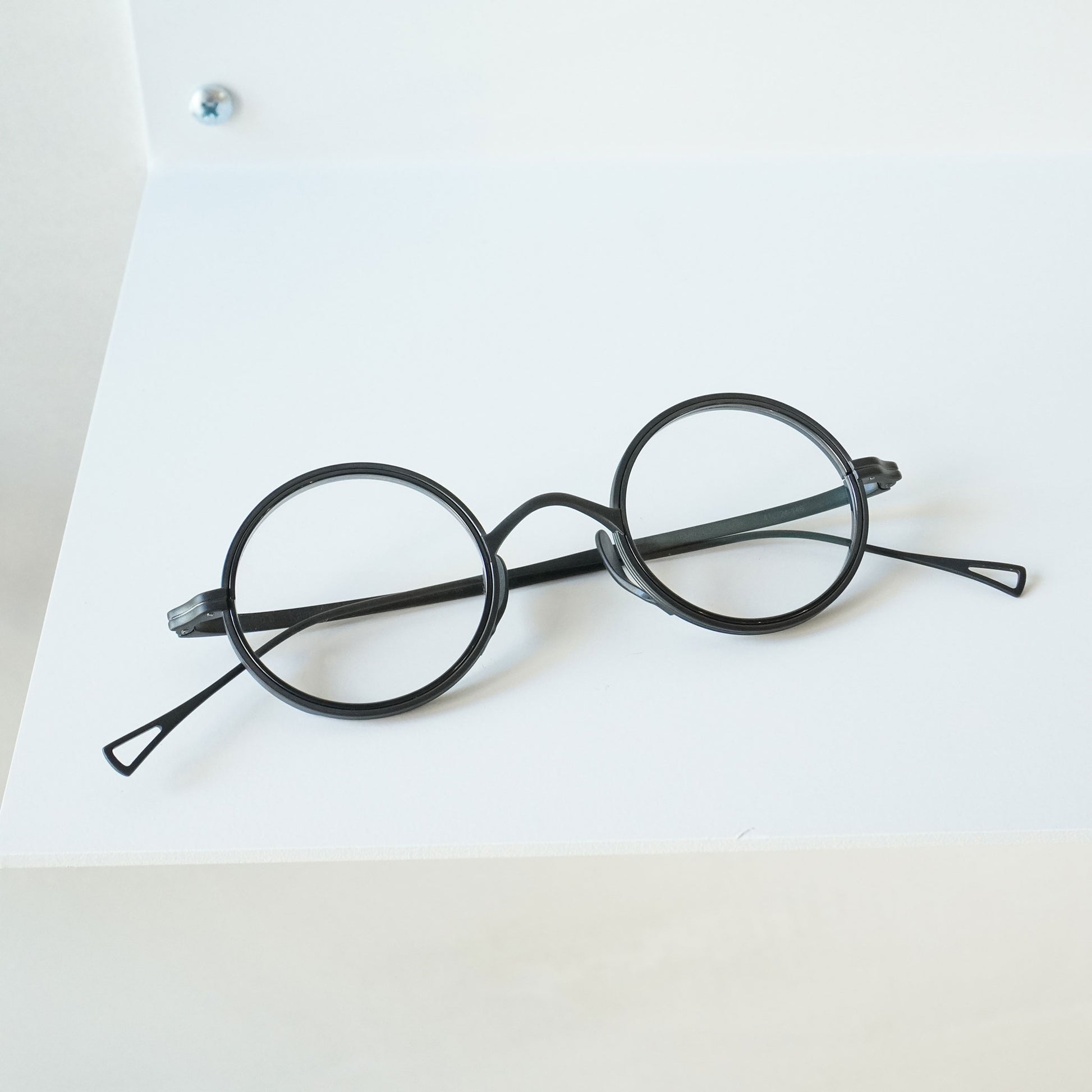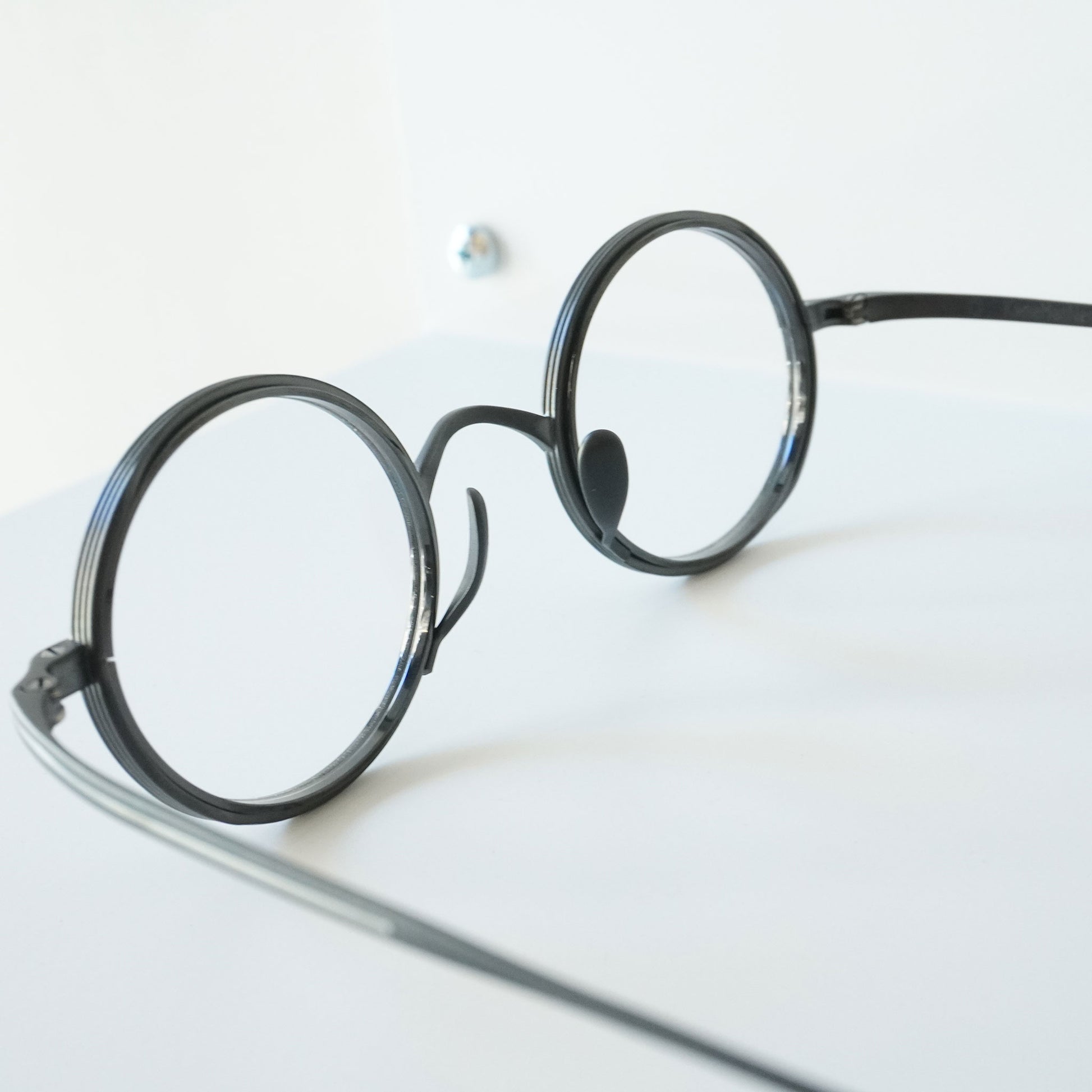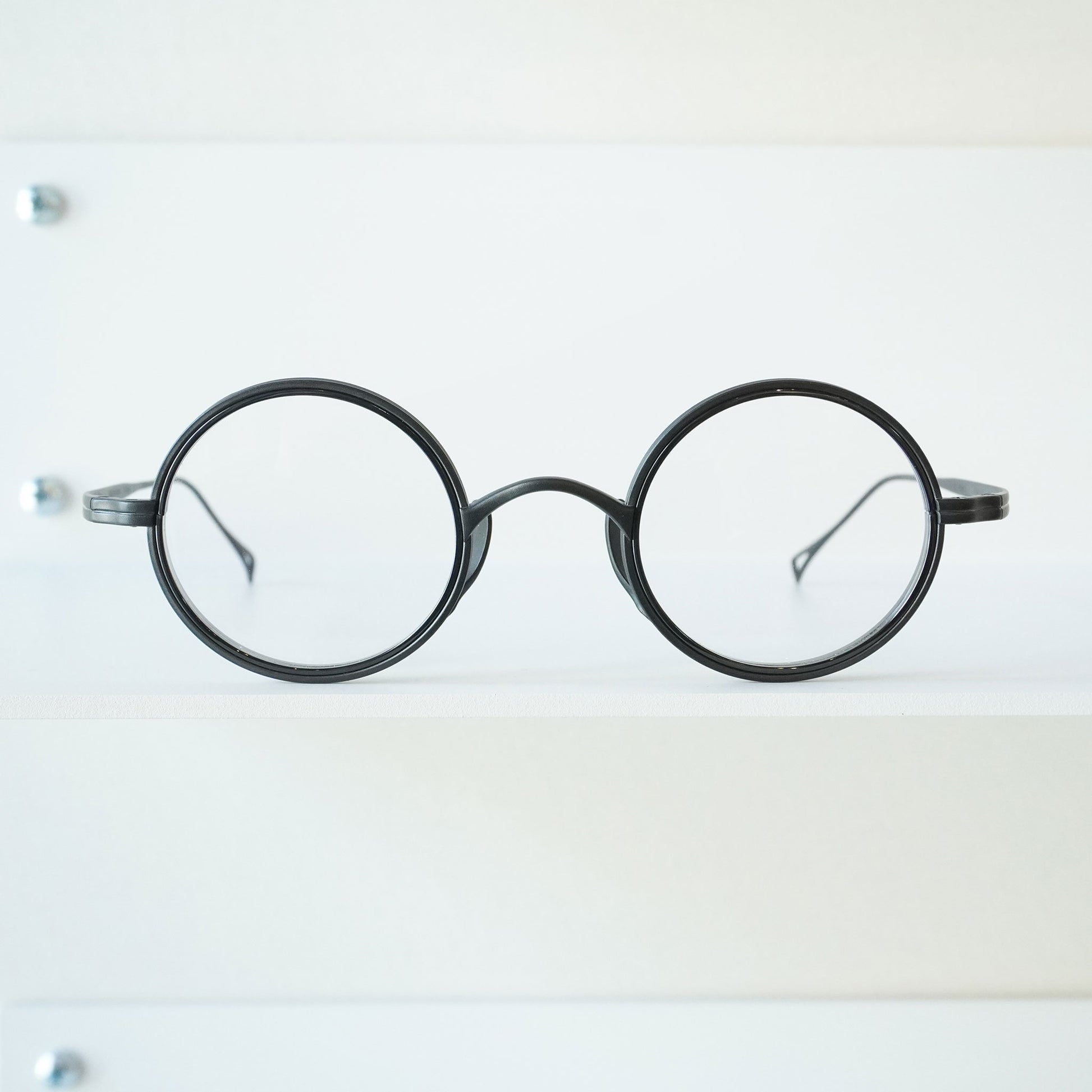 Round glasses with thick lens rims. The nose pads are designed to rise from the bottom for beauty and functionality. The all-titanium material is so lightweight that you'll be surprised at how light it is when you put them on. Recommended for those considering reading glasses or prescription glasses.