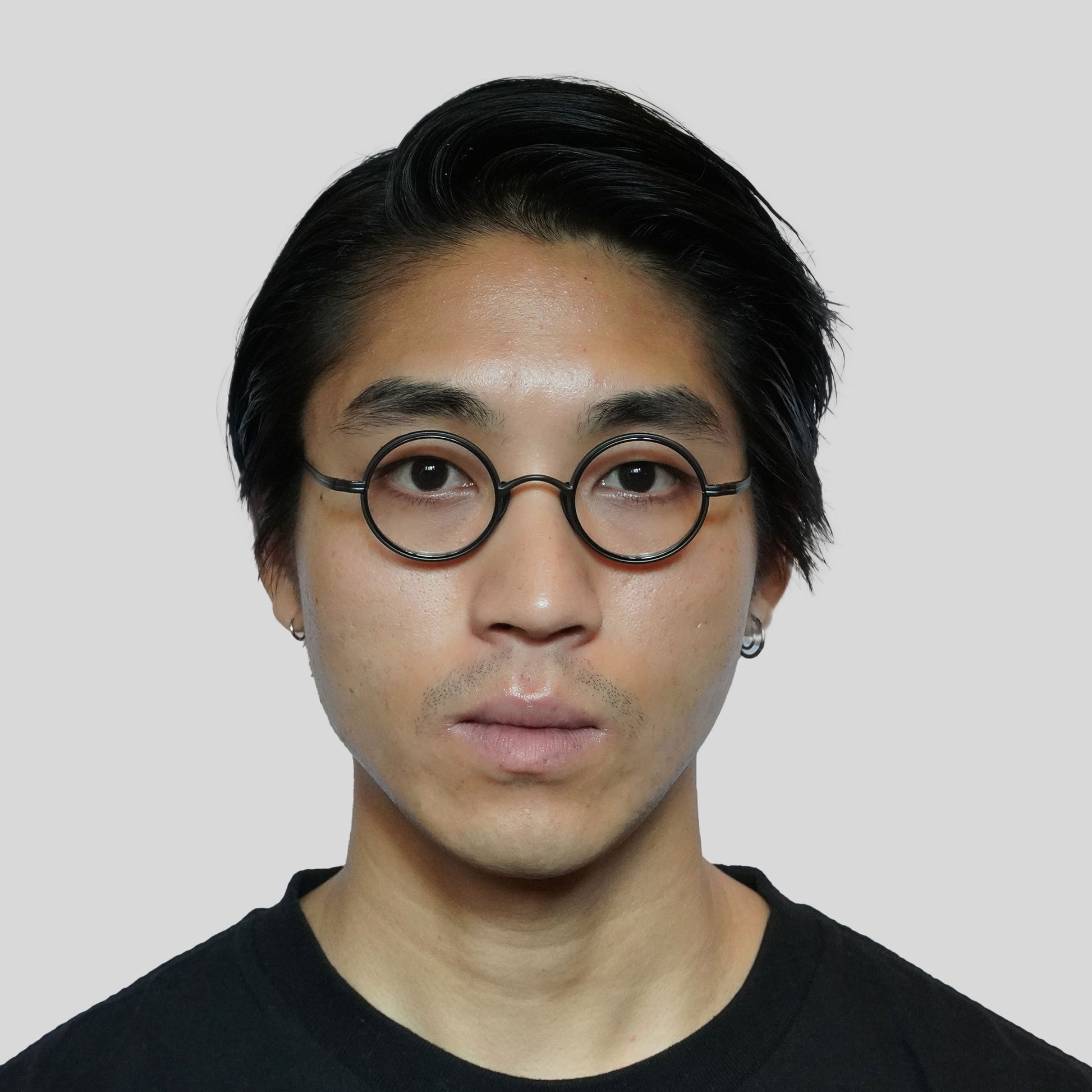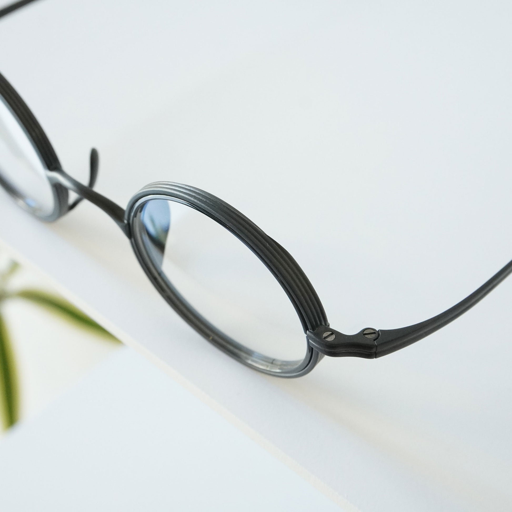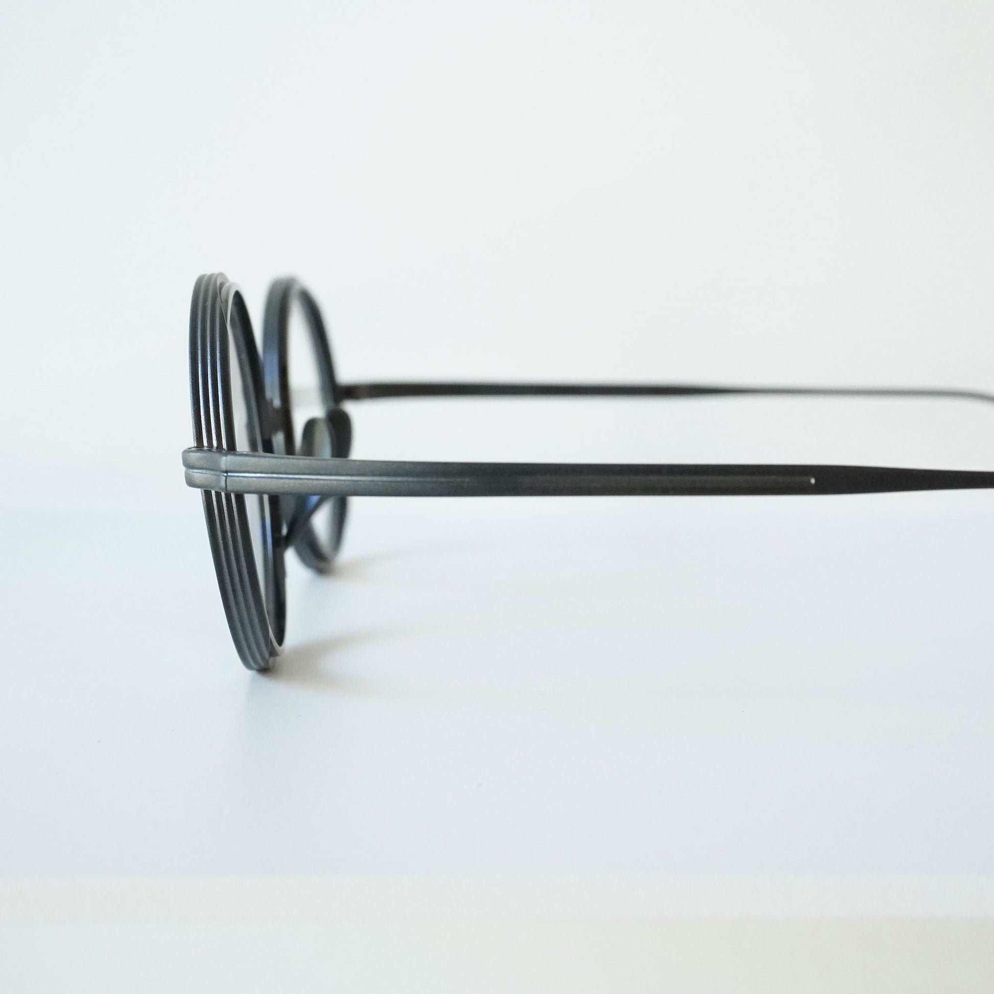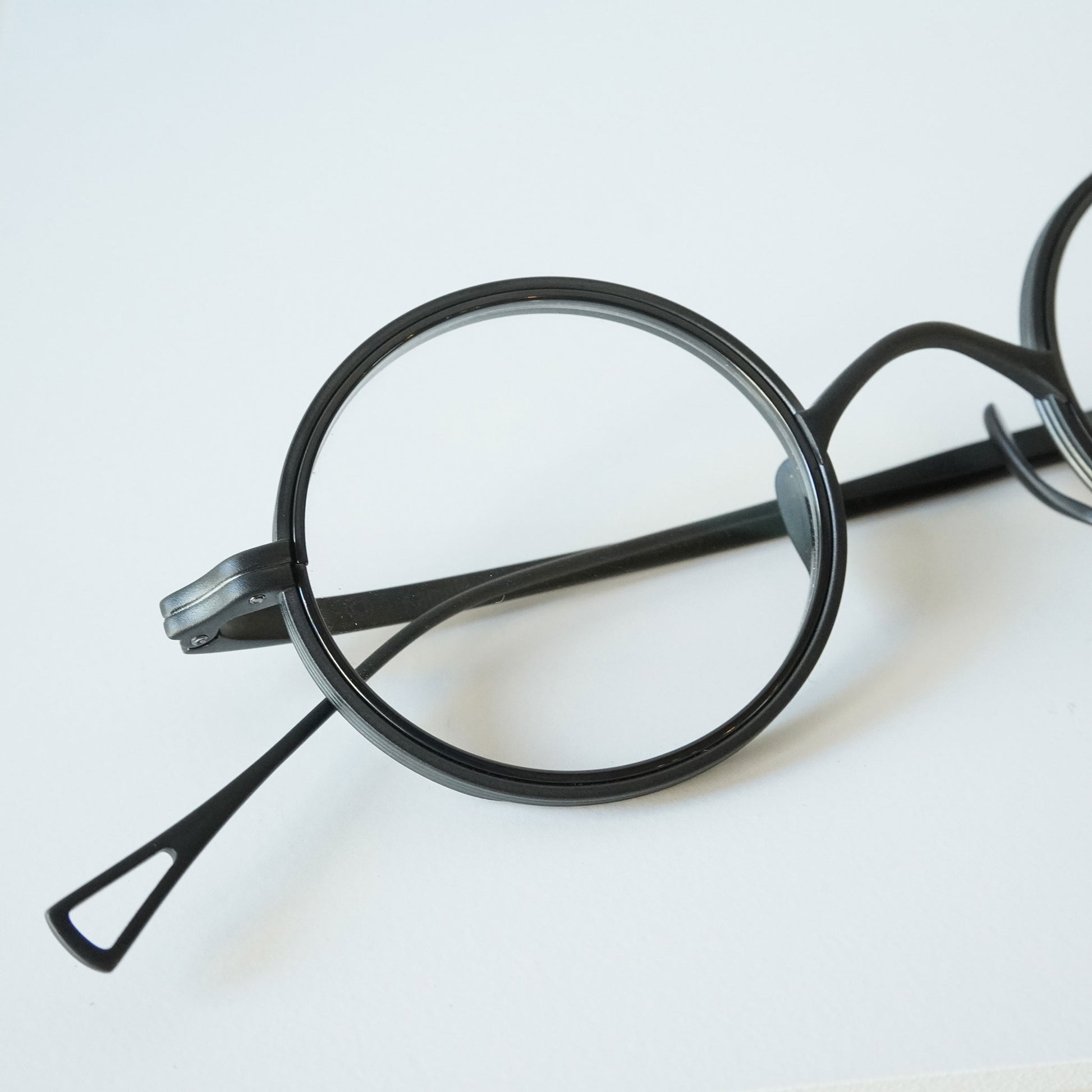 Round glasses with thick lens rims. The nose pads are designed to rise from the bottom for beauty and functionality. The all-titanium material is so lightweight that you'll be surprised at how light it is when you put them on. Recommended for those considering reading glasses or prescription glasses.