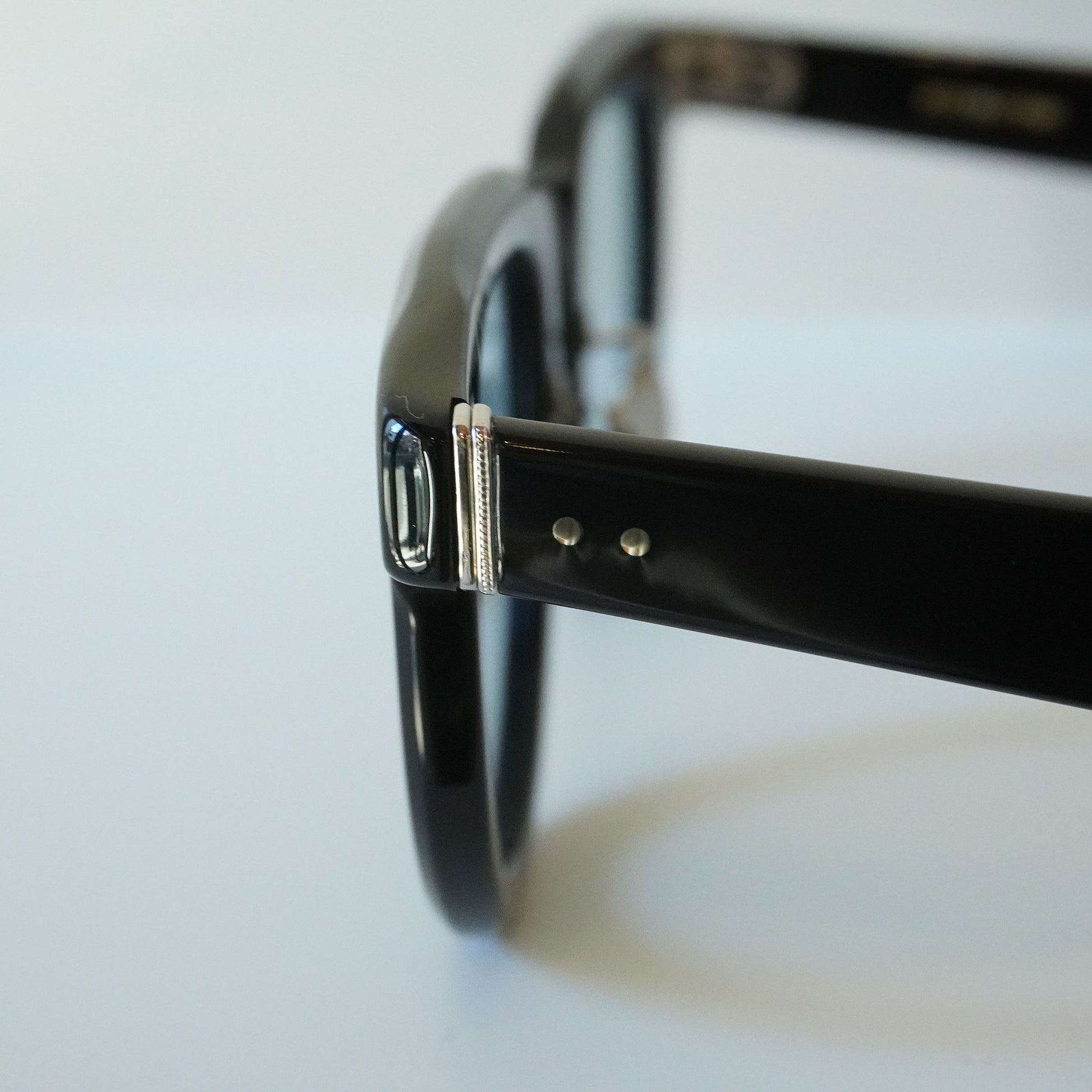 This model is based on a lens shape sampled from a catalog of a historical American eyeglass manufacturer published in 1935. It took several seasons to incorporate this lens shape into the frame design, and it is extremely distinctive, making it difficult to tell the left from the right at first glance. The front and temples are equipped with military hinges with two pin rivets spaced apart. These hinges and the flat washers on the inside are newly made parts for this model. The details and ideas are classic, but the overall design gives off a modern vibe. The sunglasses use original "Ivan Curve Lenses", Japanese-made glass lenses, which are mixed with metal particles to create the color, and then melted and molded one by one.