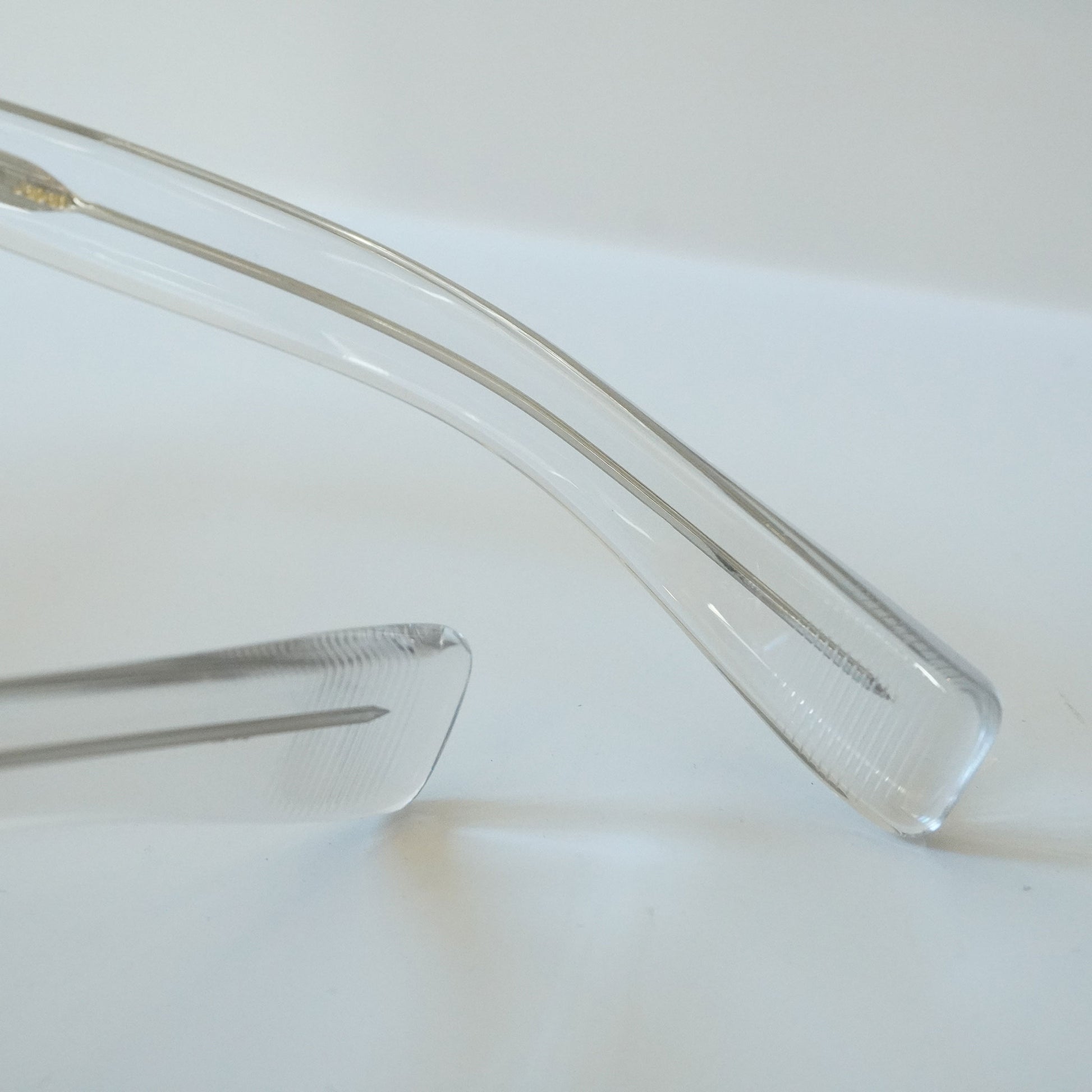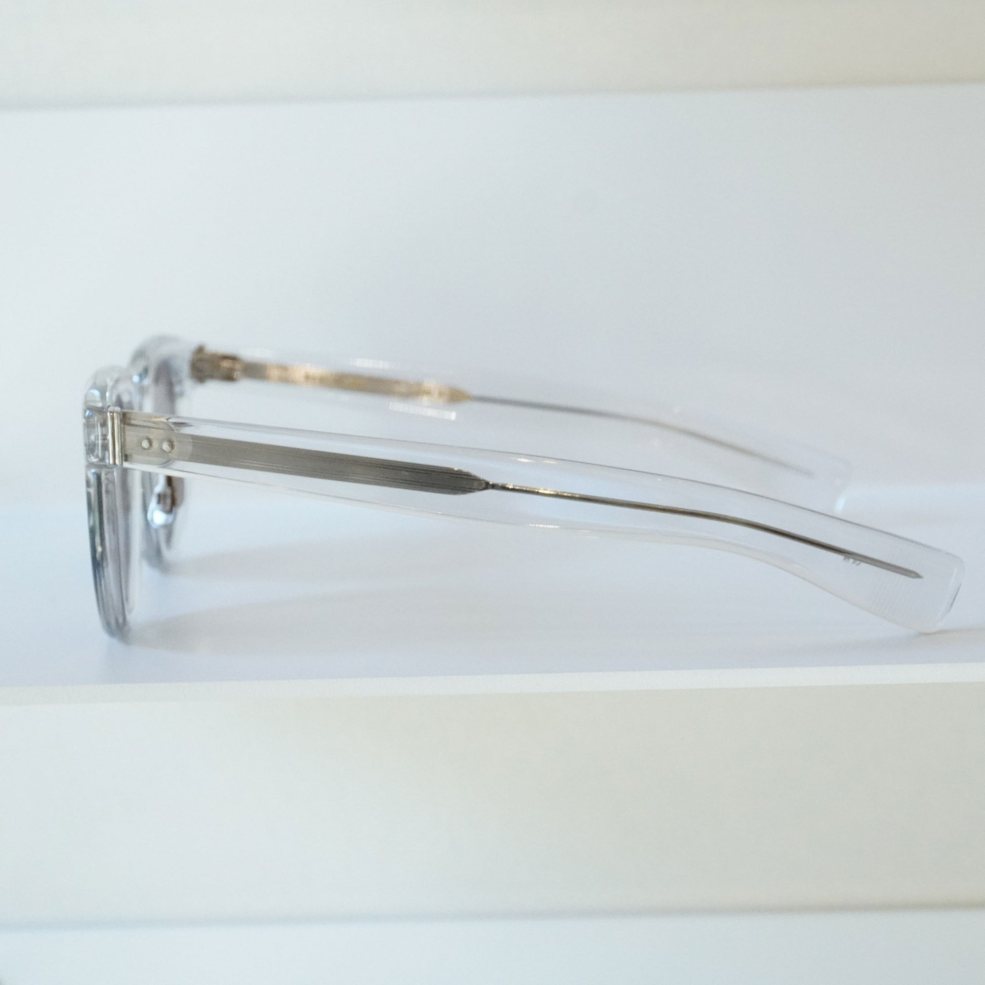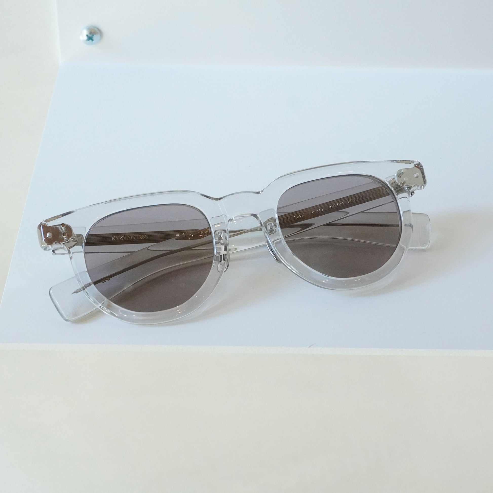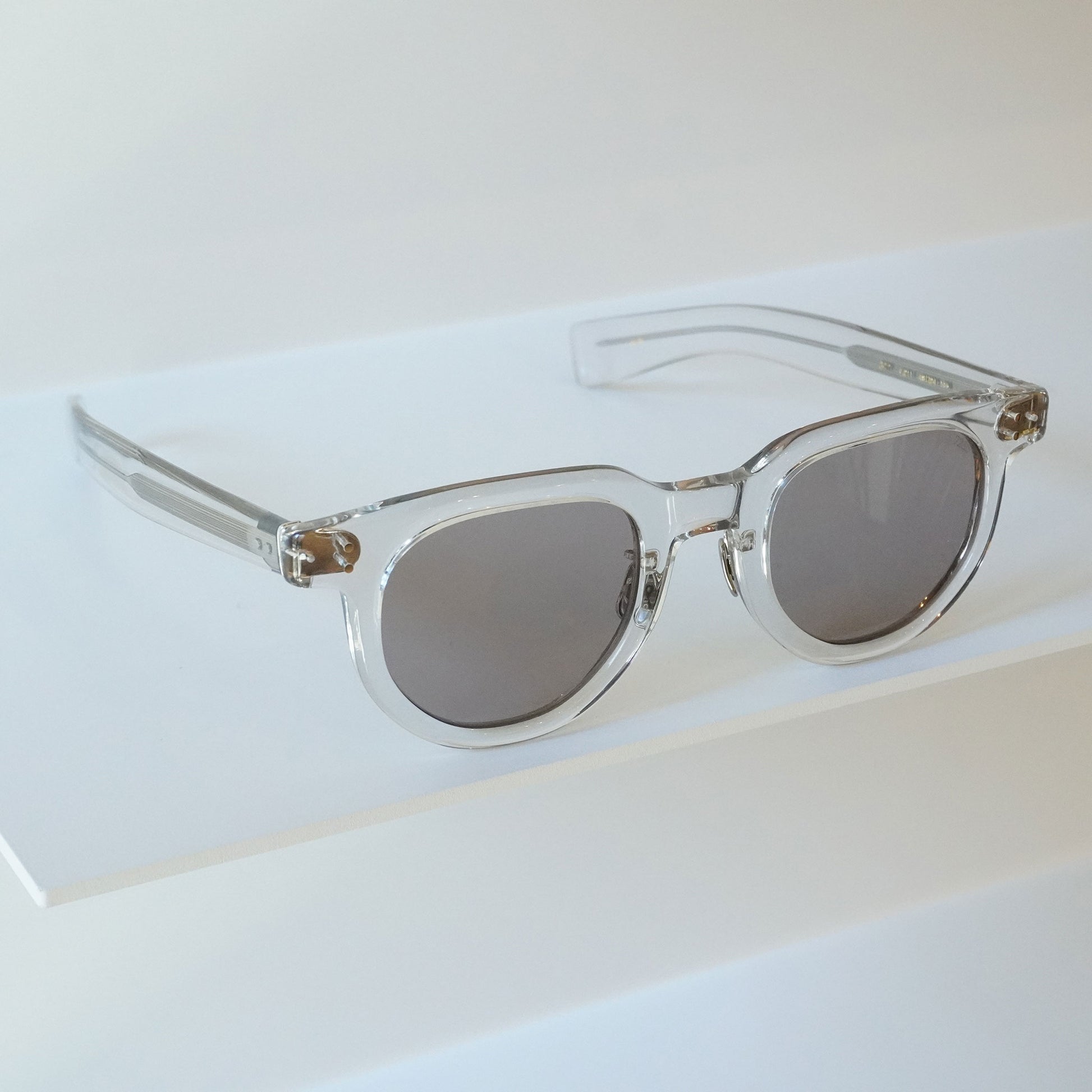 This model is based on a lens shape sampled from a catalog of a historical American eyeglass manufacturer published in 1935. It took several seasons to incorporate this lens shape into the frame design, and it is extremely distinctive, making it difficult to tell the left from the right at first glance. The front and temples are equipped with military hinges with two pin rivets spaced apart. These hinges and the flat washers on the inside are newly made parts for this model. The details and ideas are classic, but the overall design gives off a modern vibe. The sunglasses use original "Ivan Curve Lenses", Japanese-made glass lenses, which are mixed with metal particles to create the color, and then melted and molded one by one.