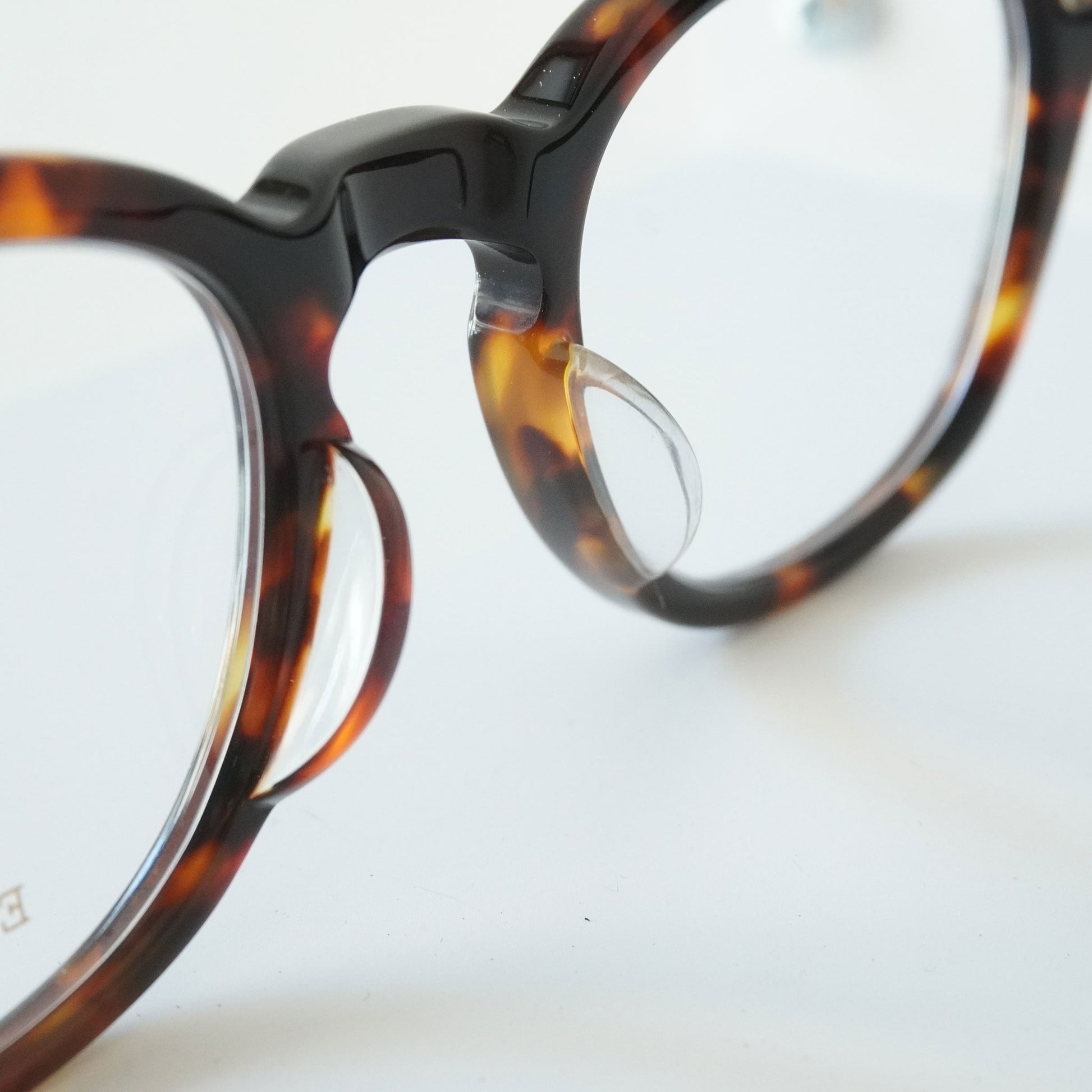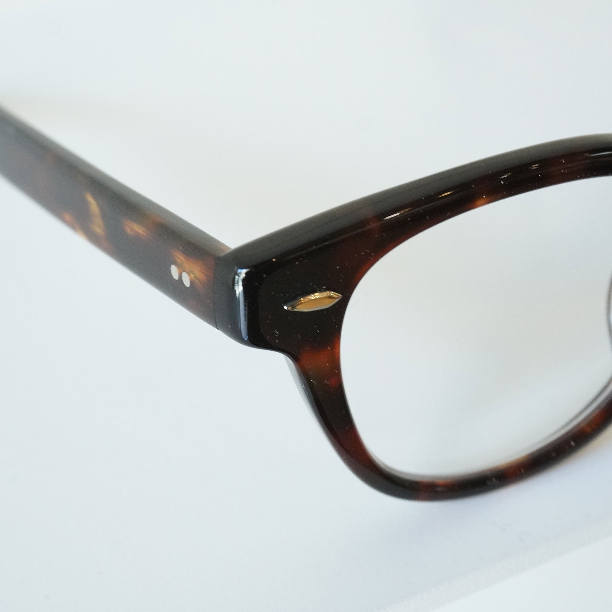 ボストンウェリントンフロントに、オリジナルのカシメ飾り丁番を採用したプラスチックフレーム。 テンプル芯には、クラシックカーのパーツからインスパイアされた柄を表裏に彫り込んだオリジナル芯を採用しています。