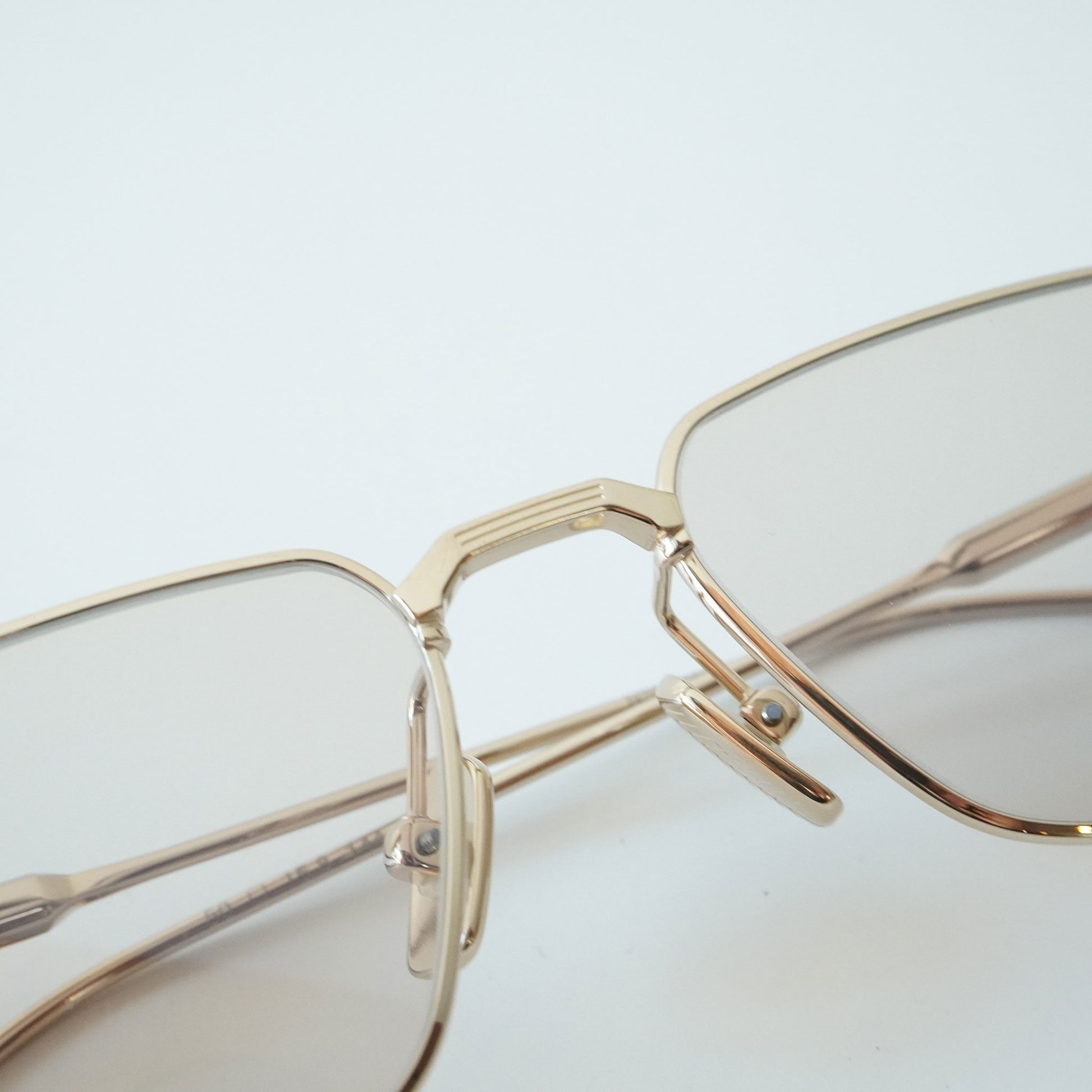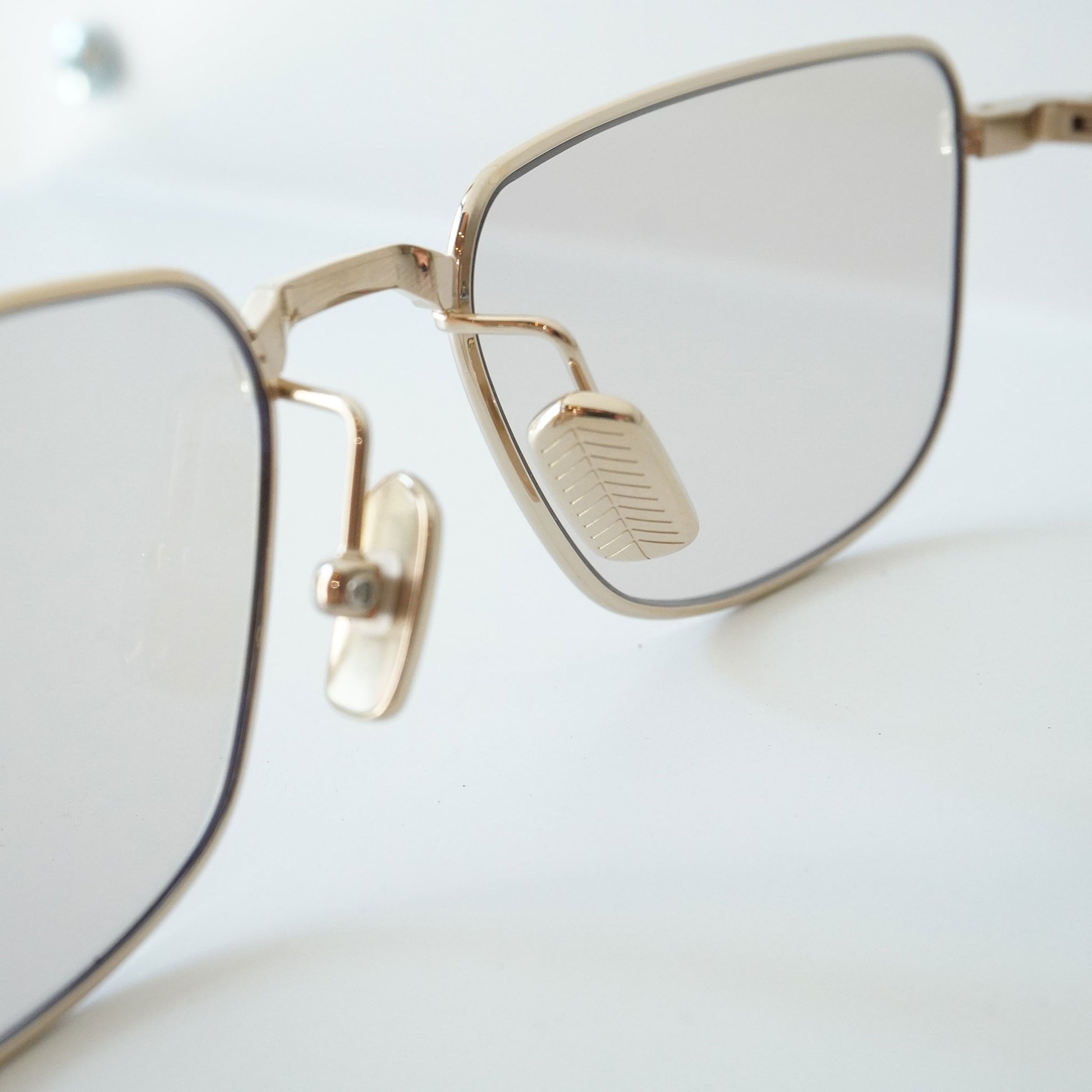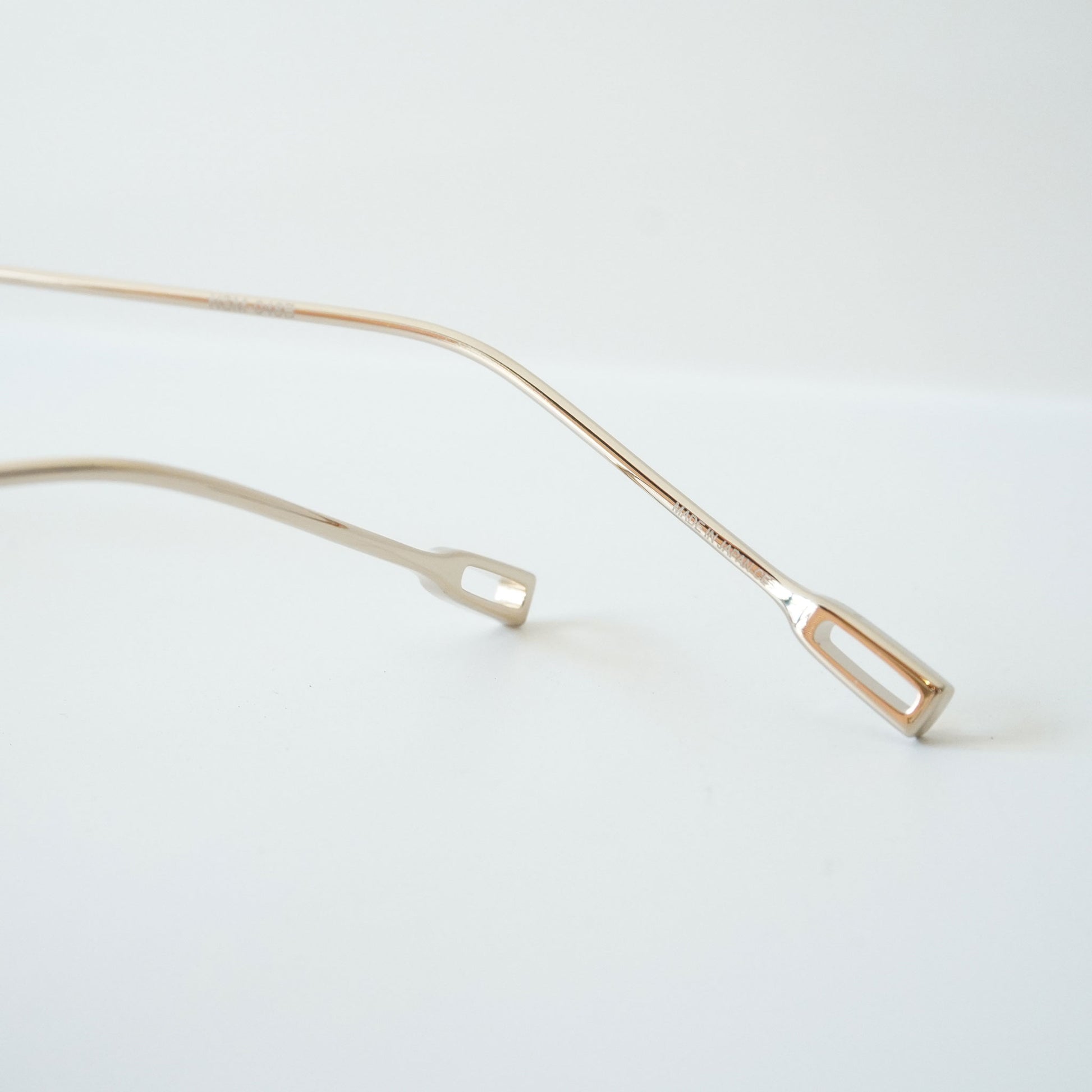 リーディンググラスを彷彿とさせる天地幅の浅い直線的なラインで、独特なデザインでありながらも知的な印象をもつメタルフレームです!