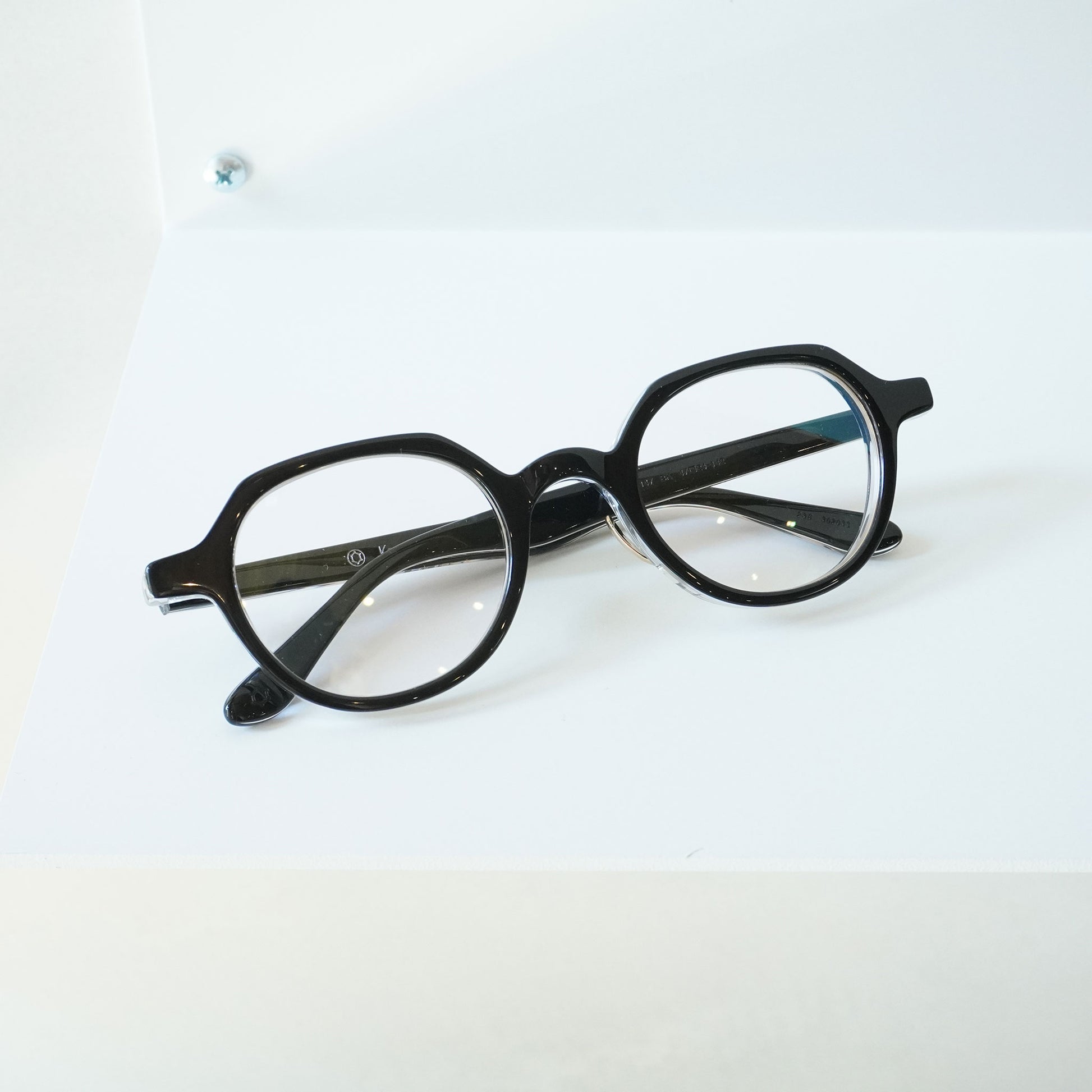 カメマンネンのアセテートシリーズです。フレンチヴィンテージをほのかに感じさせる独特なシェイプ。個性的になりすぎず知的で上品な印象のメガネです。太さのあるフレームですが重くならない優秀なモデル。
