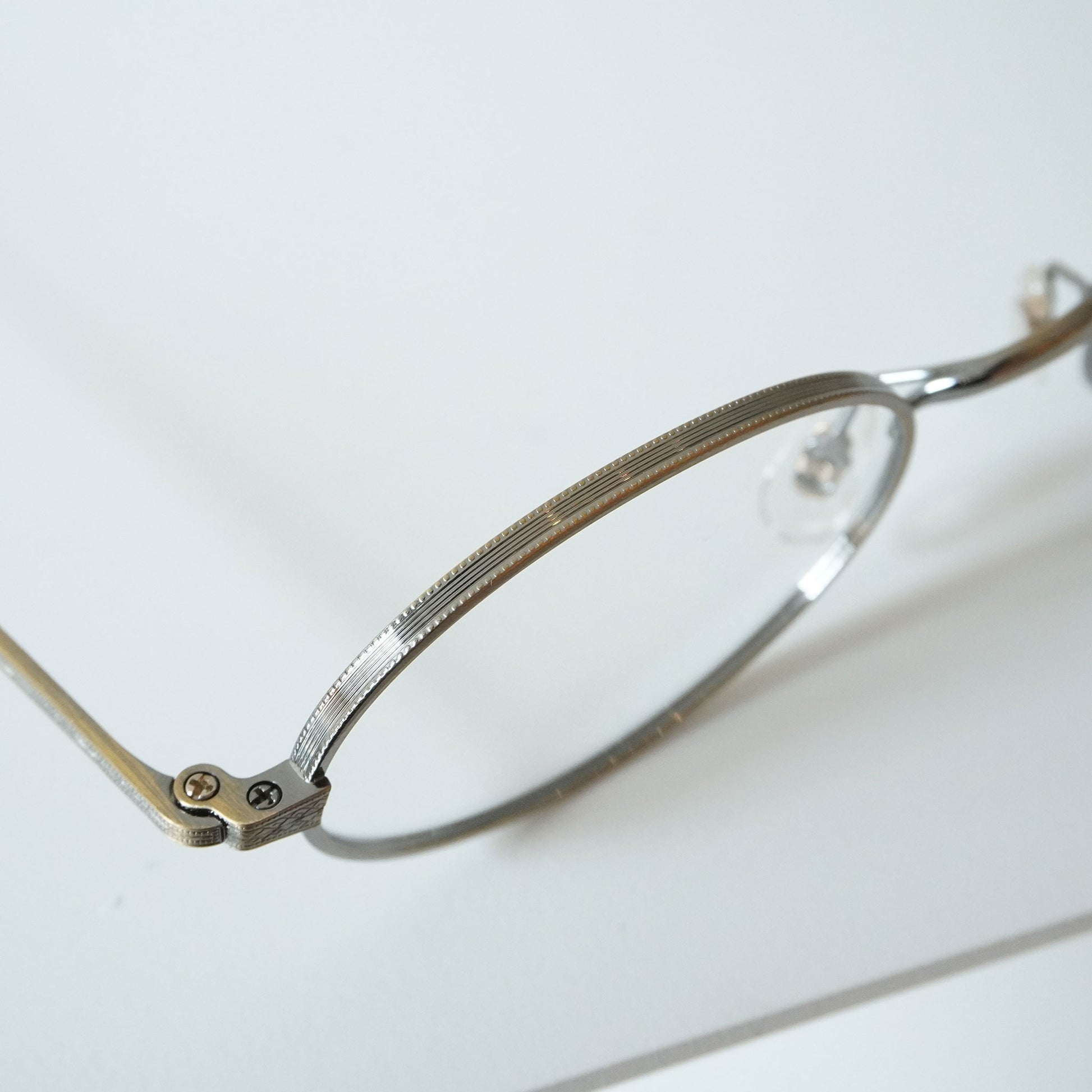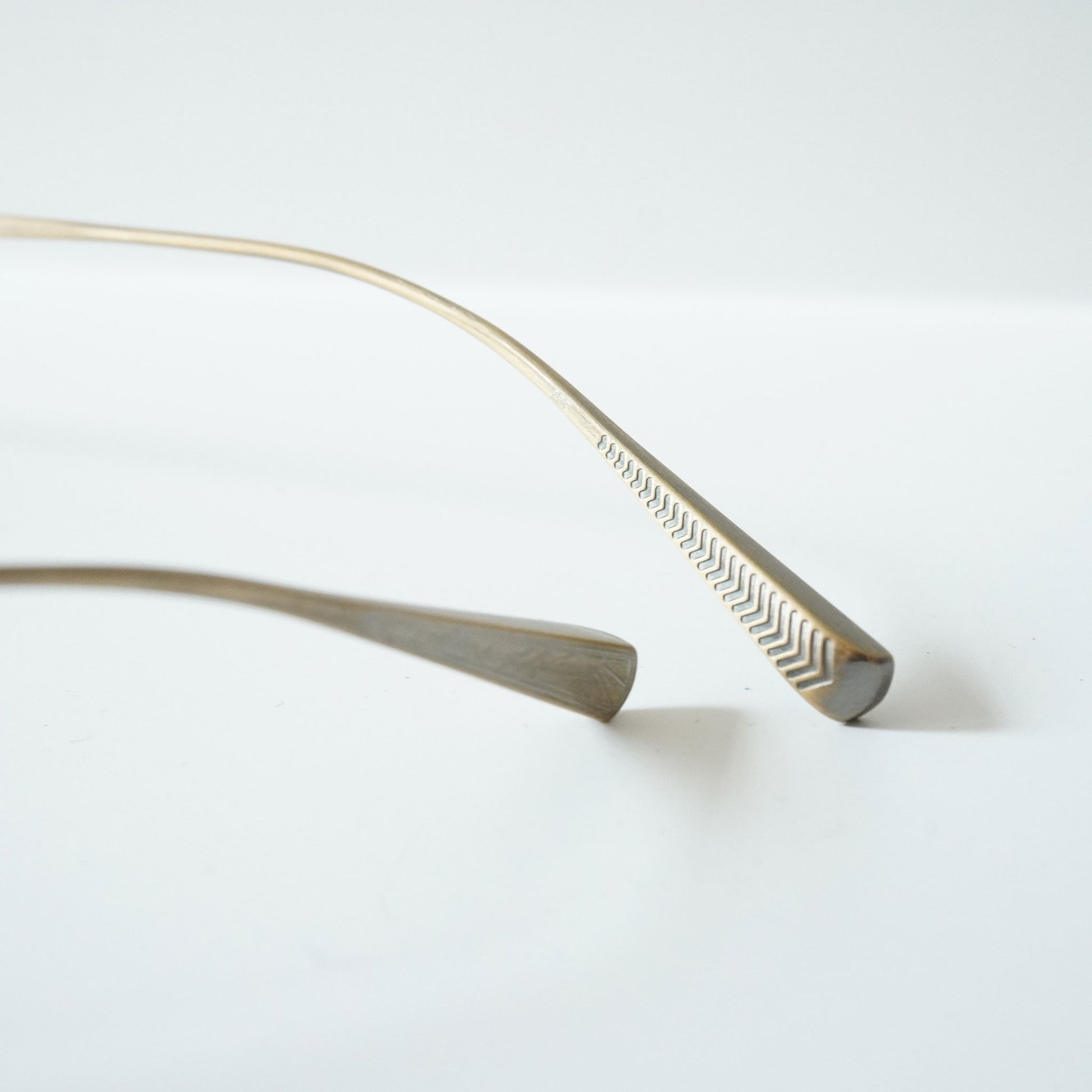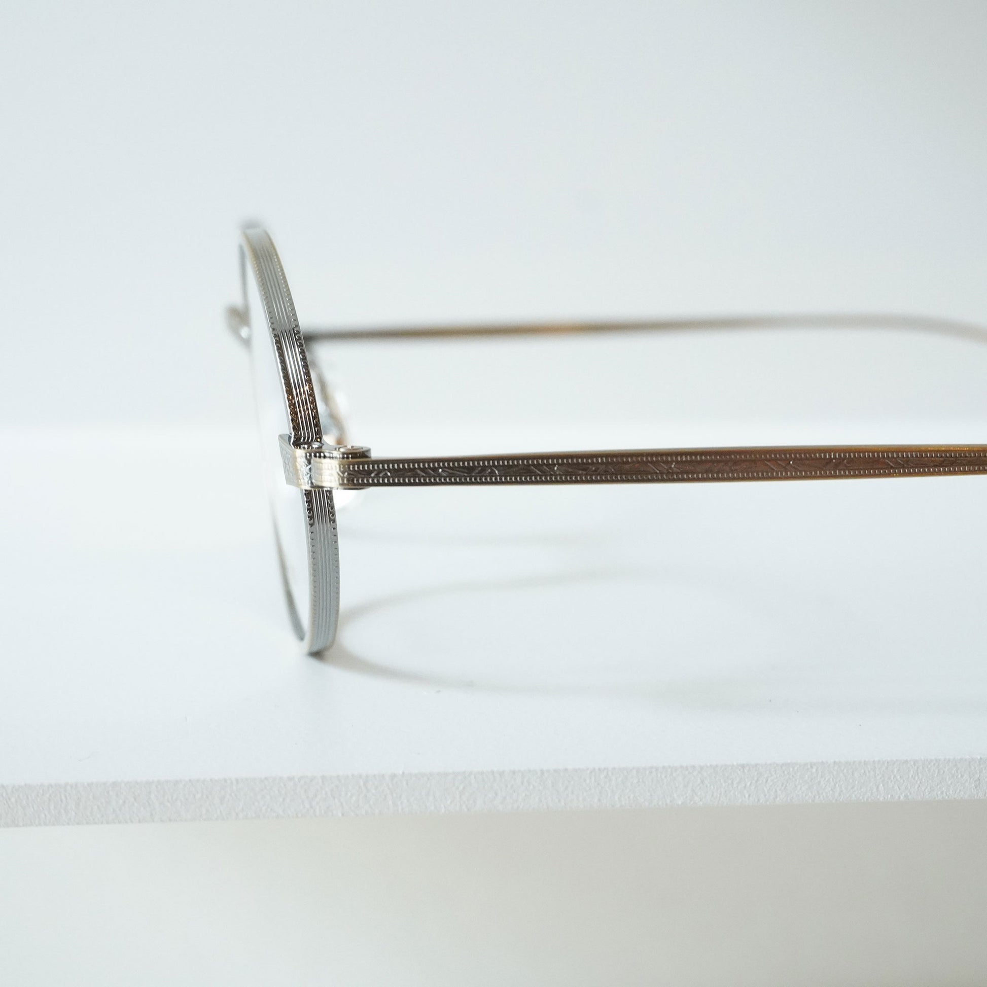 2023SSシーズンモデル『Creston』から派生した新しいフレーム。1930年代のメタルフレームのブリッジが着想源となった、通常のリムよりわずかに厚みを持つオリジナルリムと、職人の手掘りマスターにより丁番の内部まで装飾されたヨロイ、繊細な模様の入ったチタンテンプルの組み合わせに柔らかな曲線のWブリッジを合わせた。レンズシェイプは、1980年代後半にイギリスの小さな工房で作られた14Kのヴィンテージフレームからサンプリングしています。