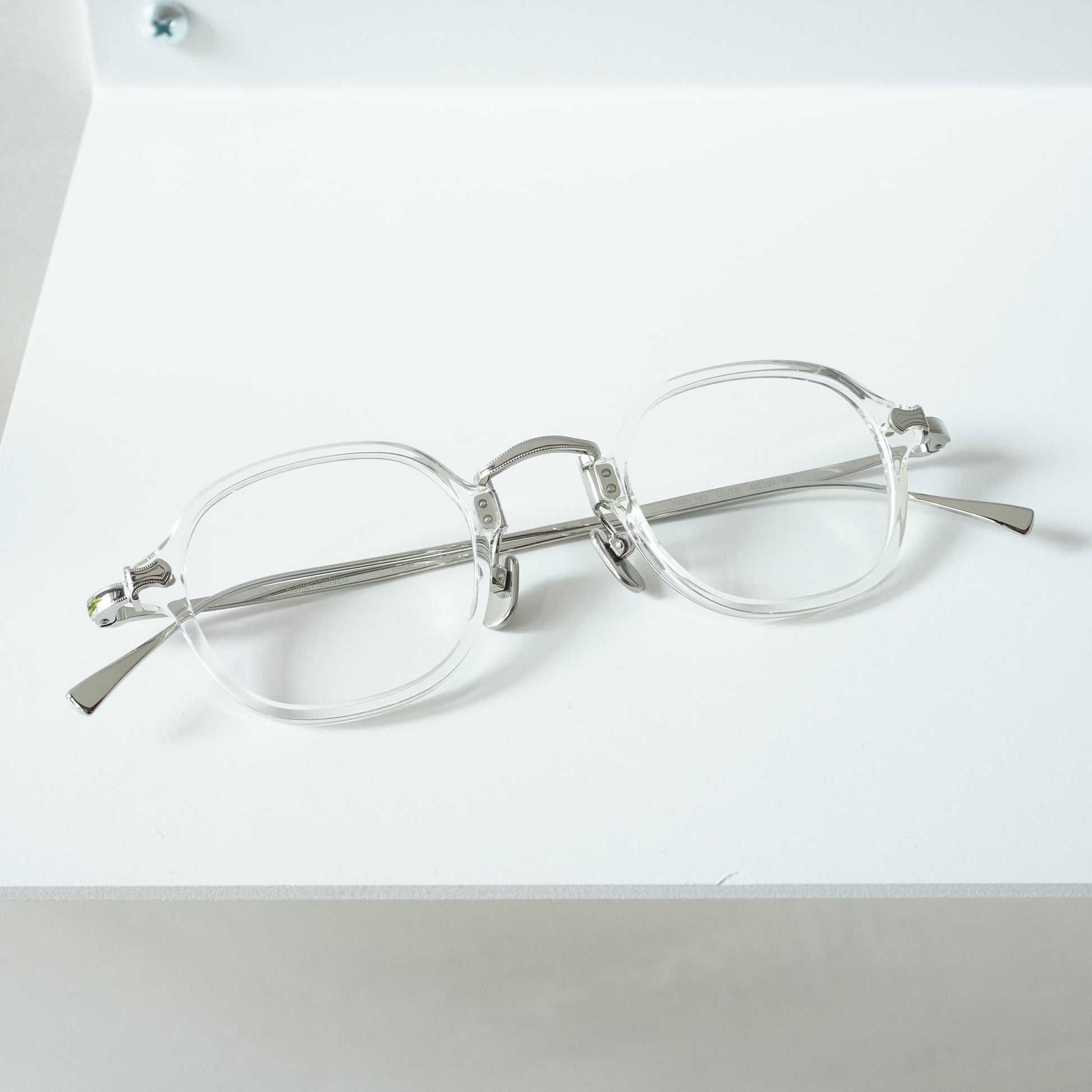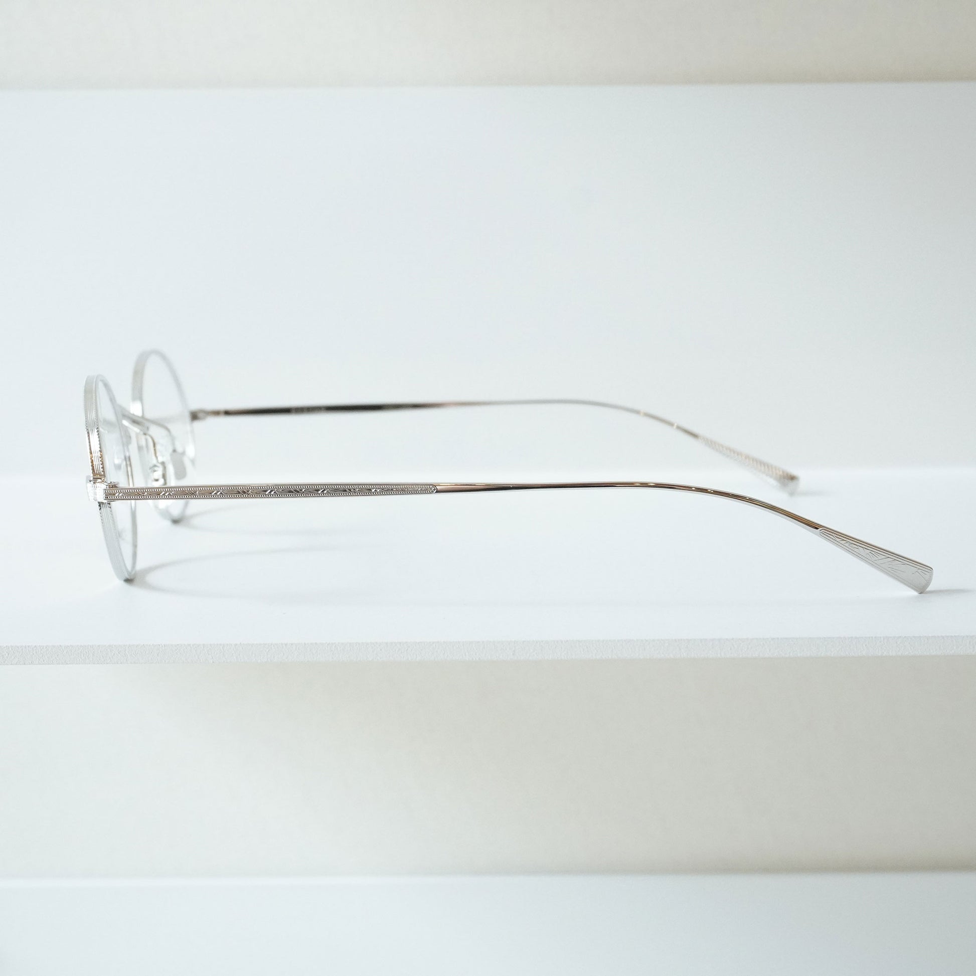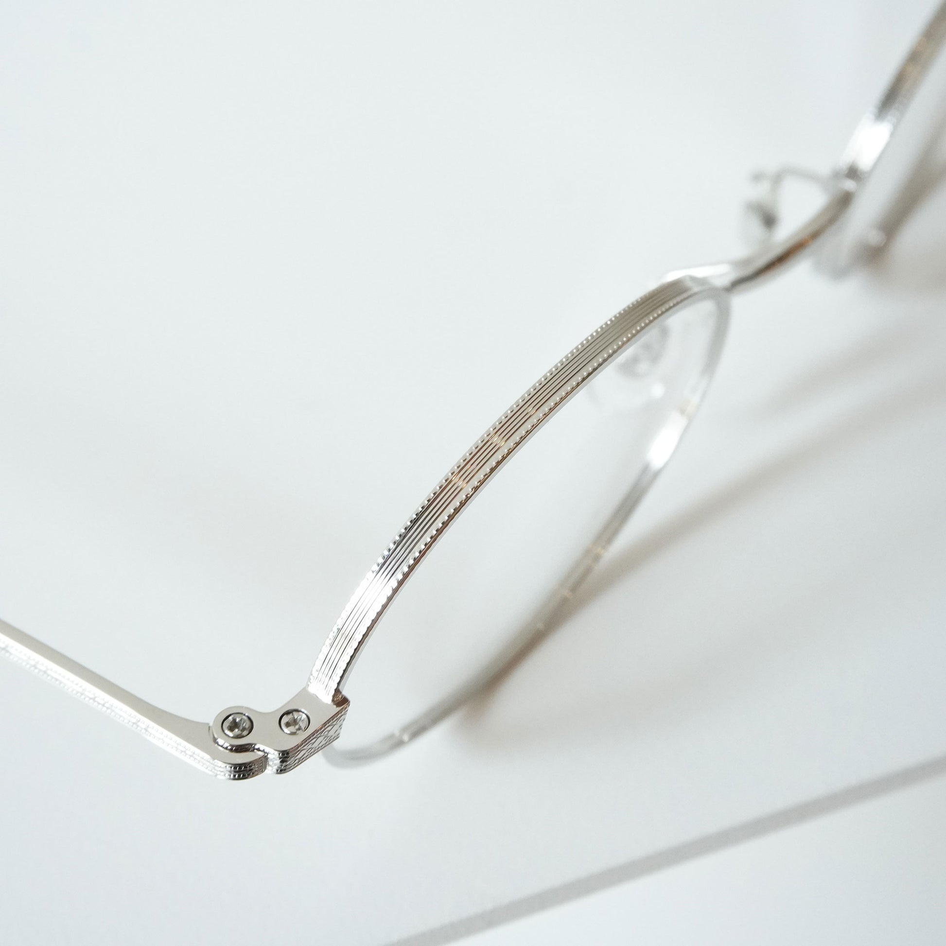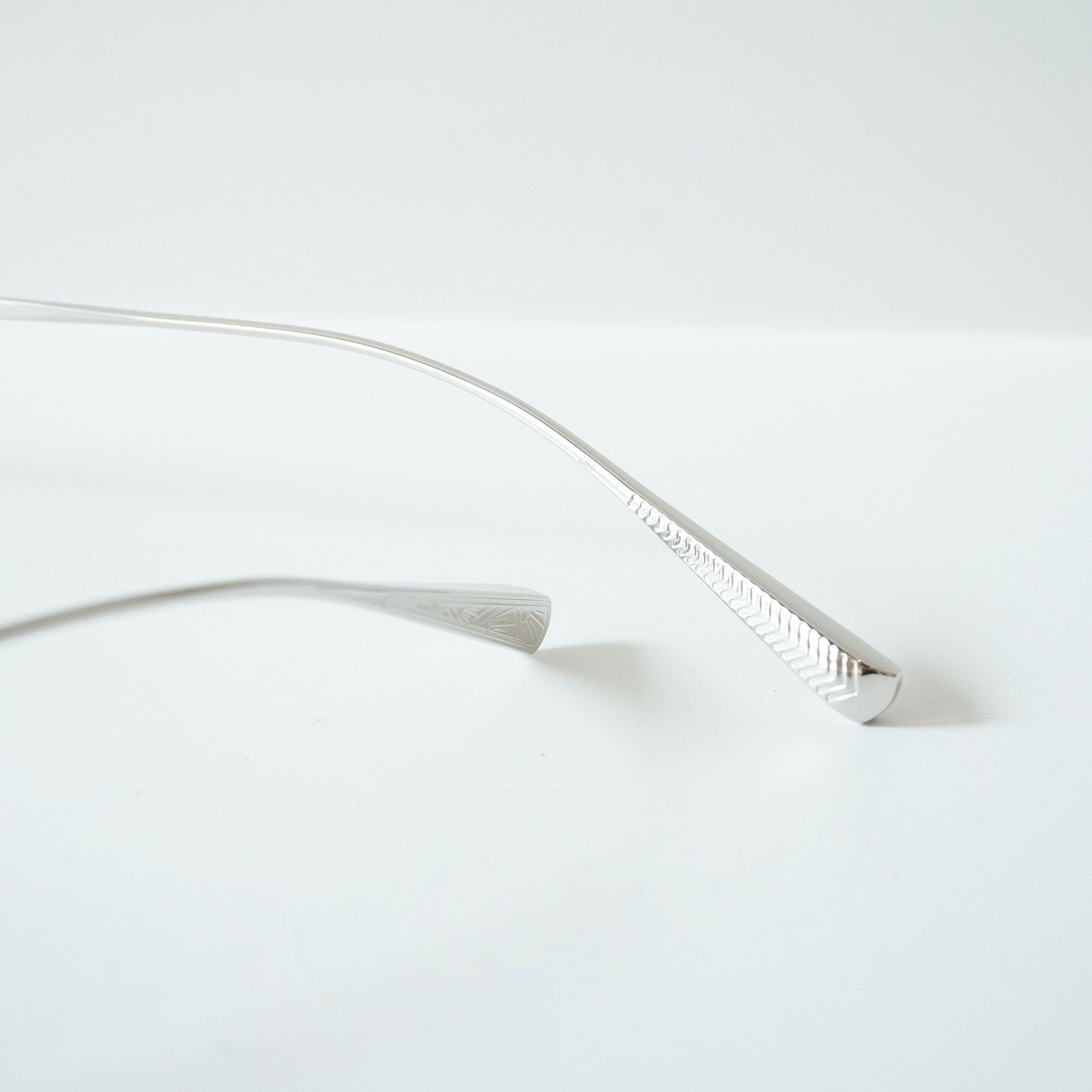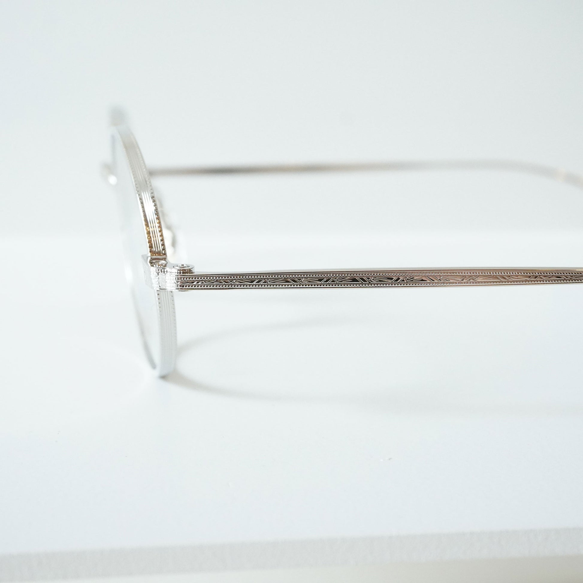 2023SSシーズンモデル『Creston』から派生した新しいフレーム。1930年代のメタルフレームのブリッジが着想源となった、通常のリムよりわずかに厚みを持つオリジナルリムと、職人の手掘りマスターにより丁番の内部まで装飾されたヨロイ、繊細な模様の入ったチタンテンプルの組み合わせに柔らかな曲線のWブリッジを合わせた。レンズシェイプは、1980年代後半にイギリスの小さな工房で作られた14Kのヴィンテージフレームからサンプリングしています。