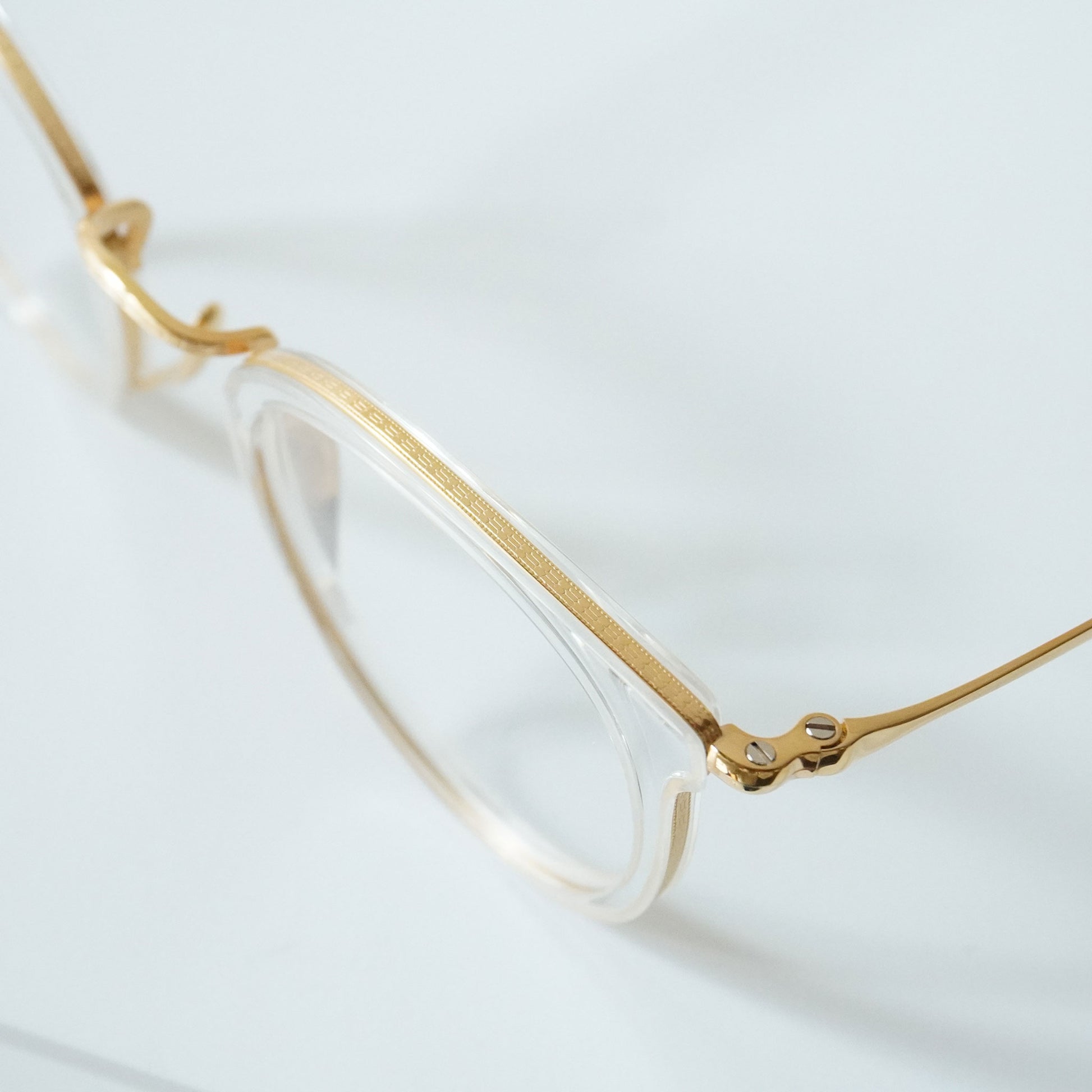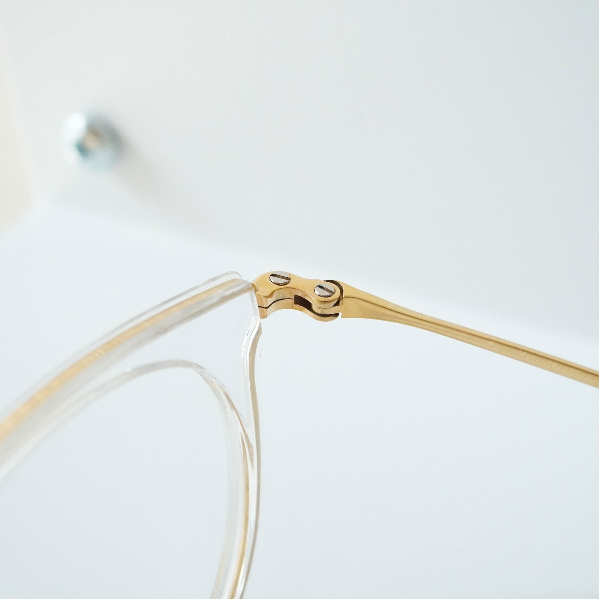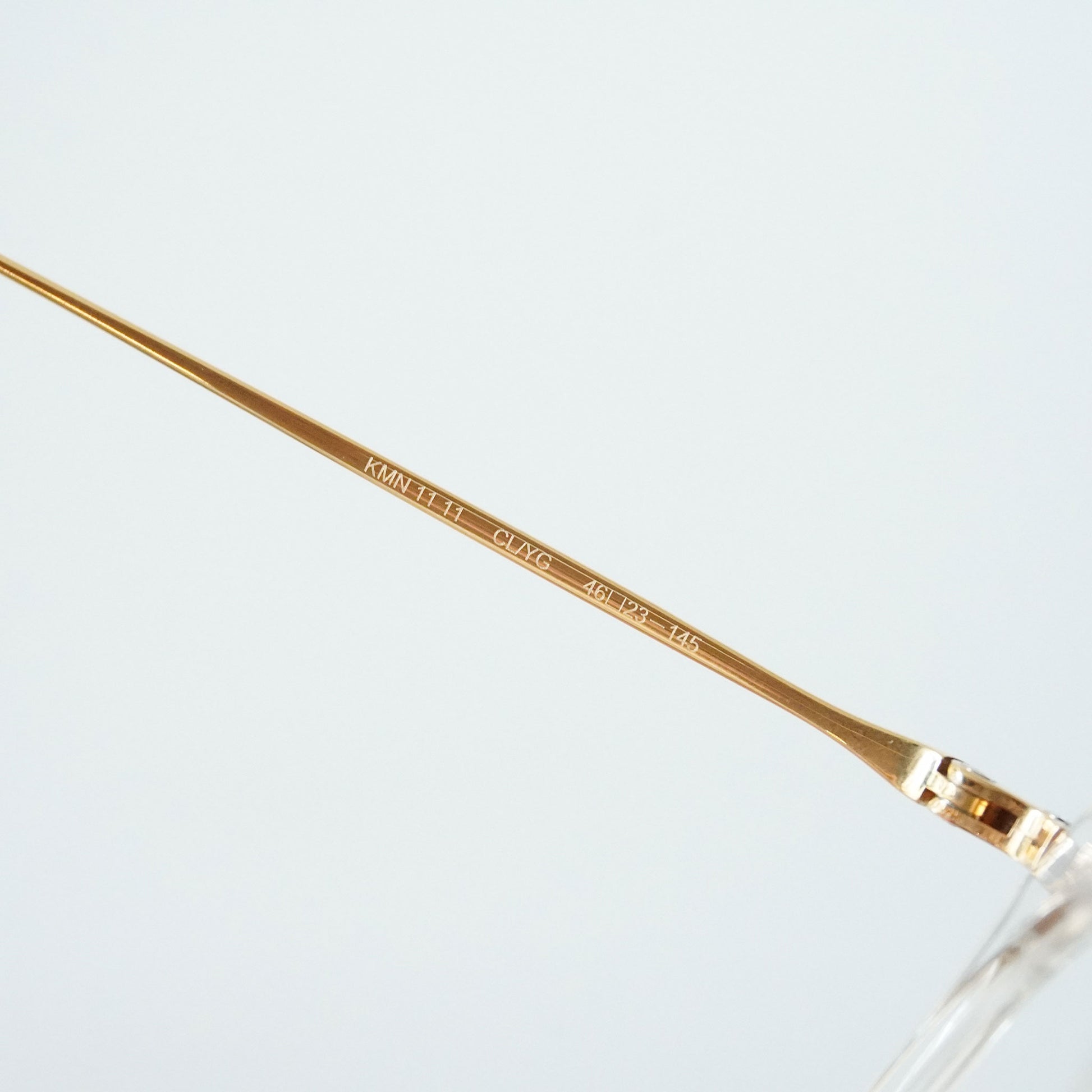 形は、やや釣りあがった印象に見えるボストンシェイプ、ブリッジはチタン製でカメマンネンのロゴが彫金されています。リム部分はとても美しく高級感のある仕様で、ブリッジと同じロゴが彫金されています。やや厚みもあるので度入りの方にもオススメです。テンプルはしなやかで長時間でも疲れにくい装着感を実現しています。鼻パッドはスプーンのような形状で独特なデザインが目を惹きます。
