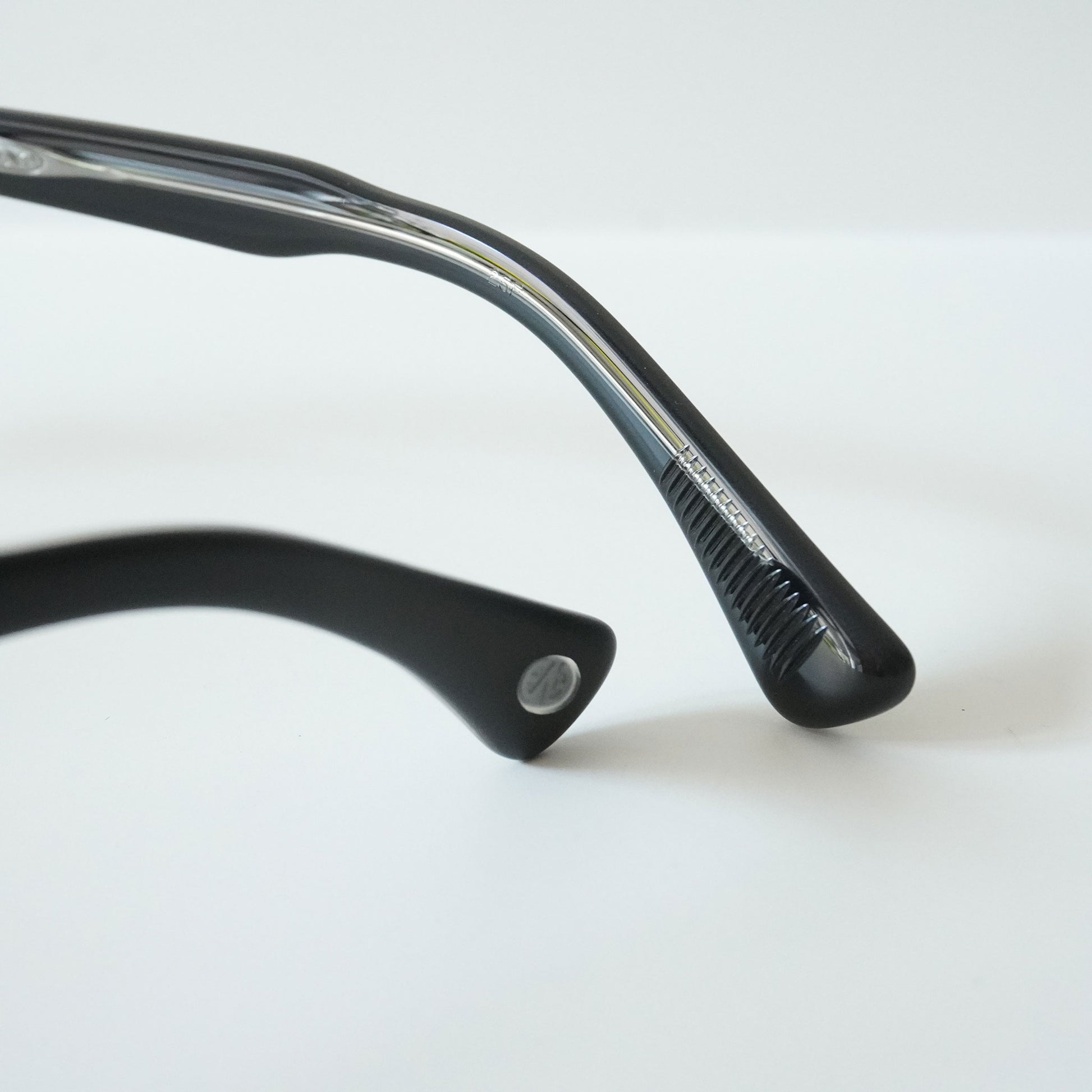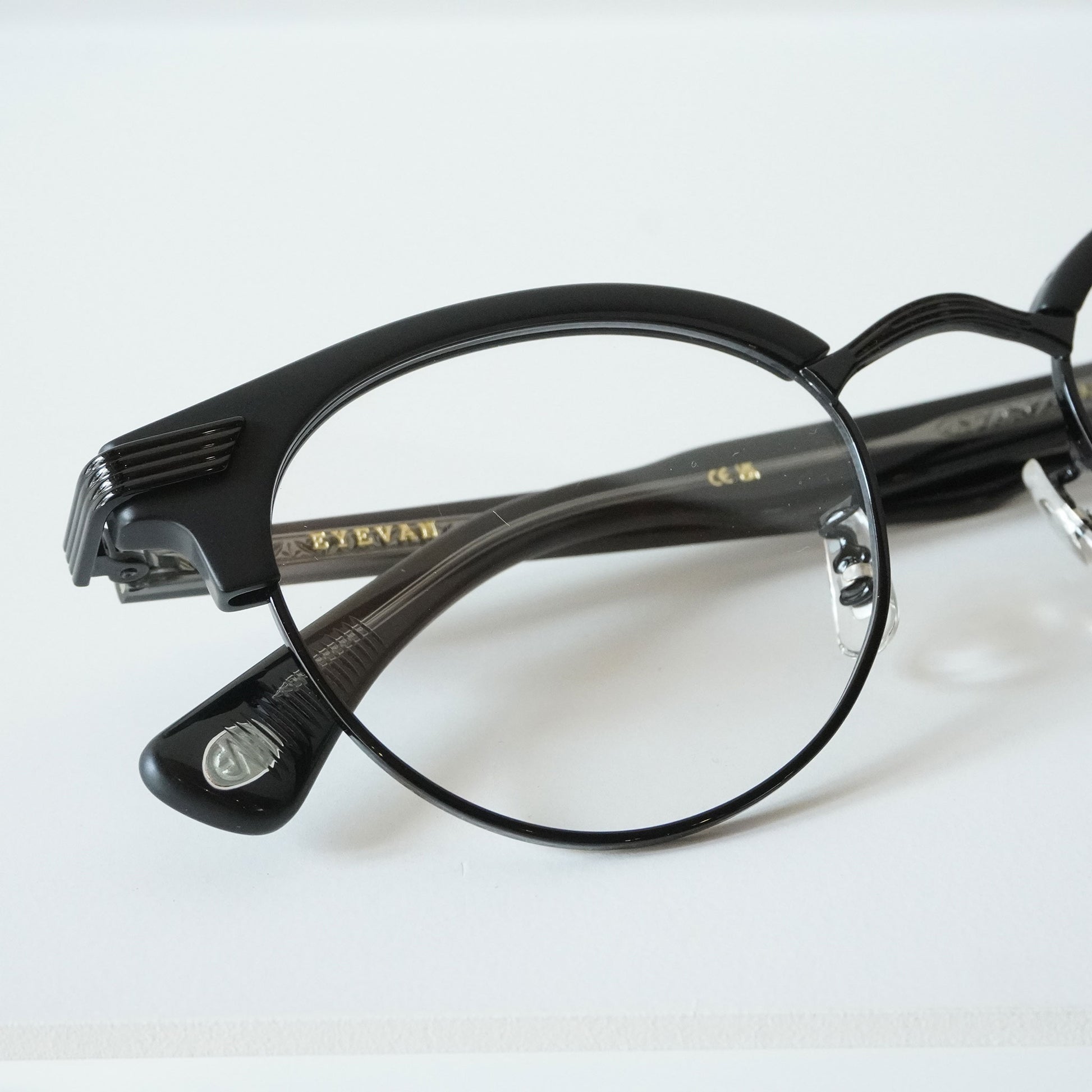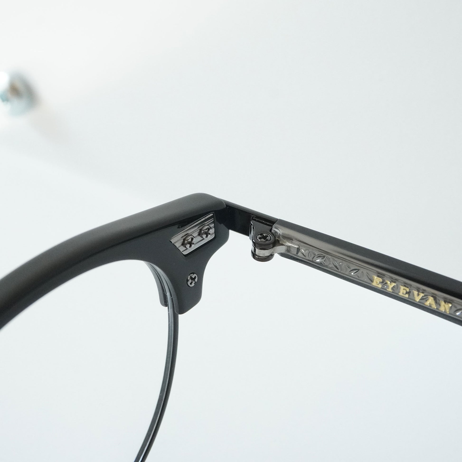 1940年代一部のアメリカンヴィンテージに見られた最初期のサーモントが着想源のフレーム。そのデザインのキーとなる印象的な曲智仕様のヨロイパーツは、型から起こしオリジナルで再現した。 あえてブリッジには繊細なデザイン、玉形にはモダンなシェイプを組み合わせることでオリジナルのヴィンテージがもつ武骨さに繊細なイメージをMIXしたEYEVANらしい新しいサーモントブロウとなった。