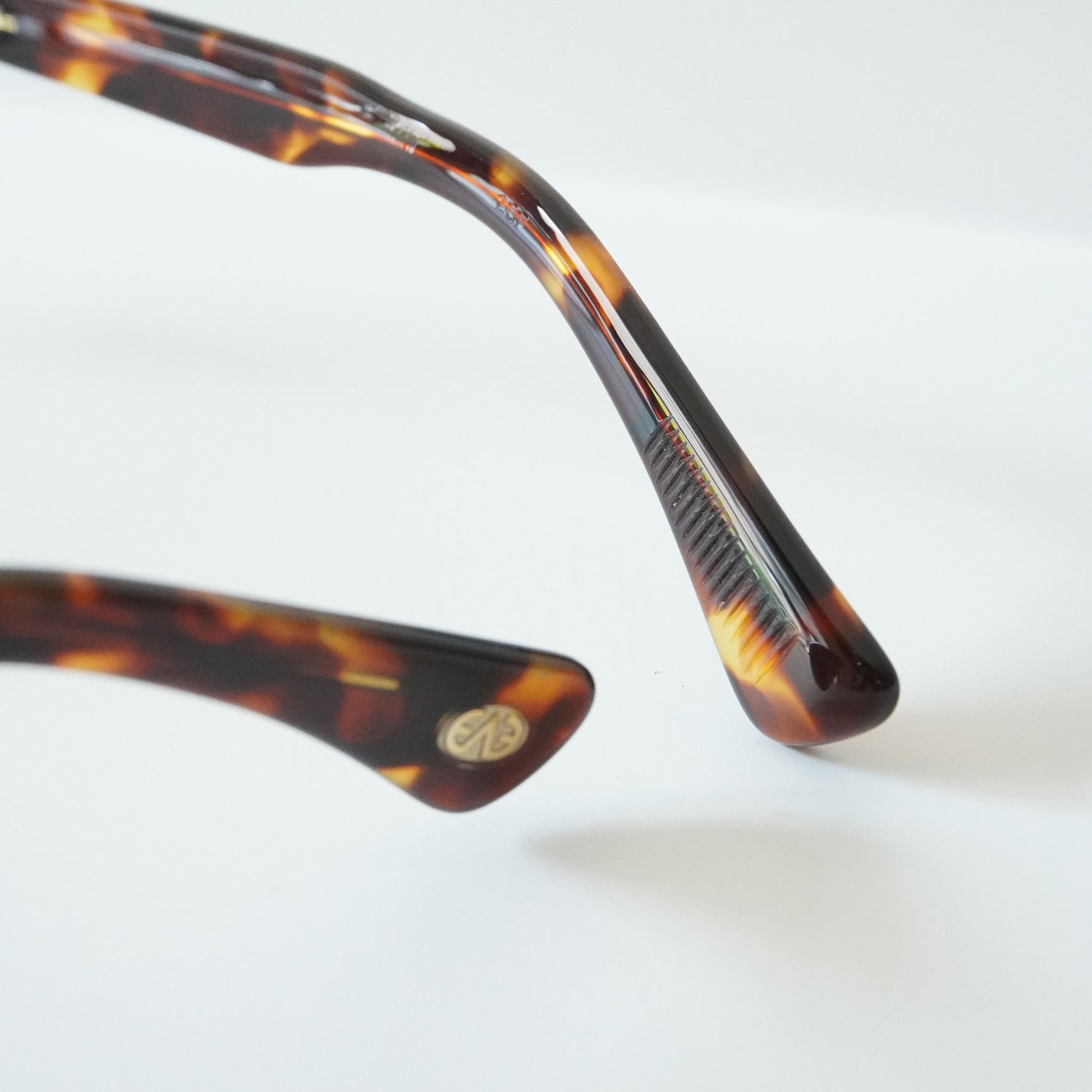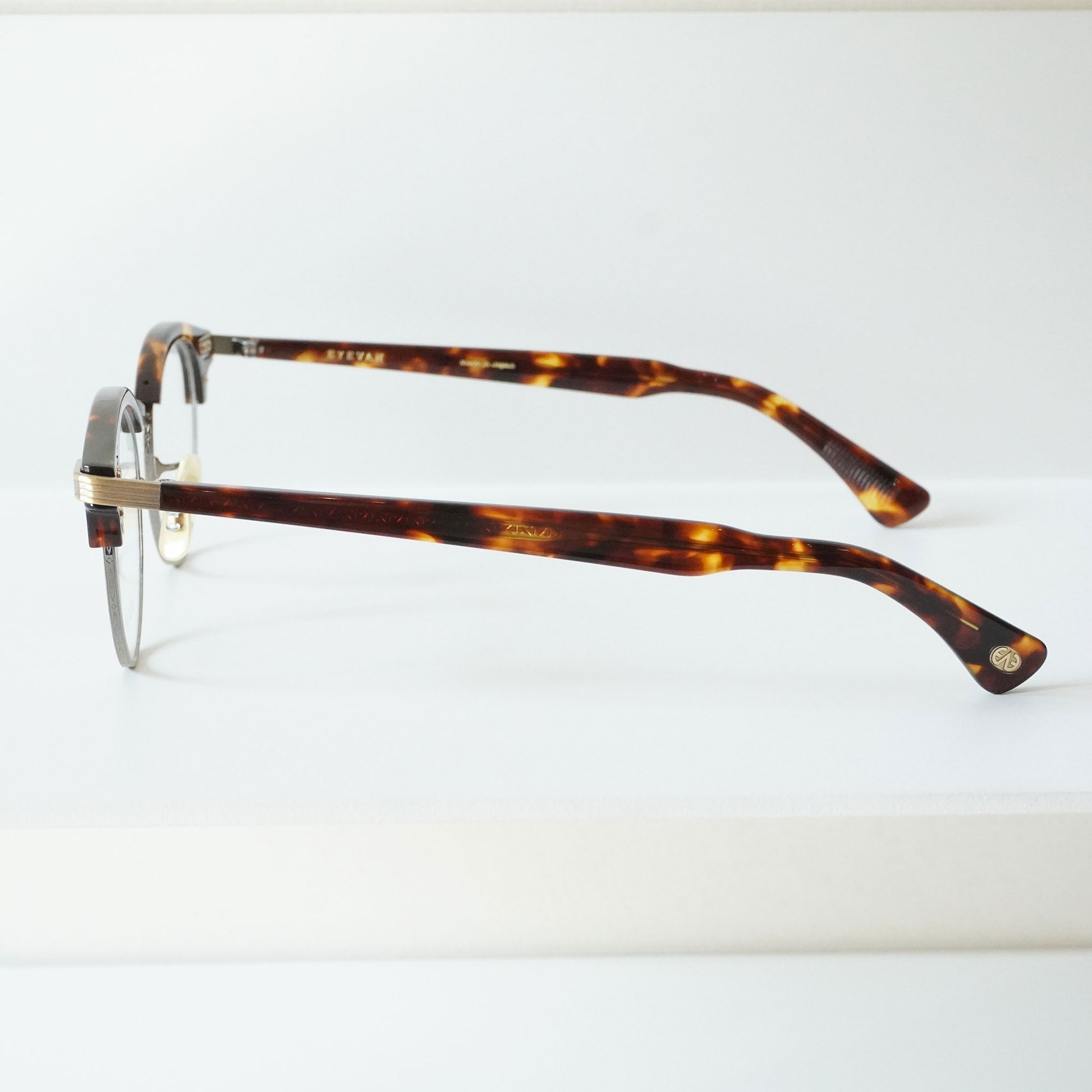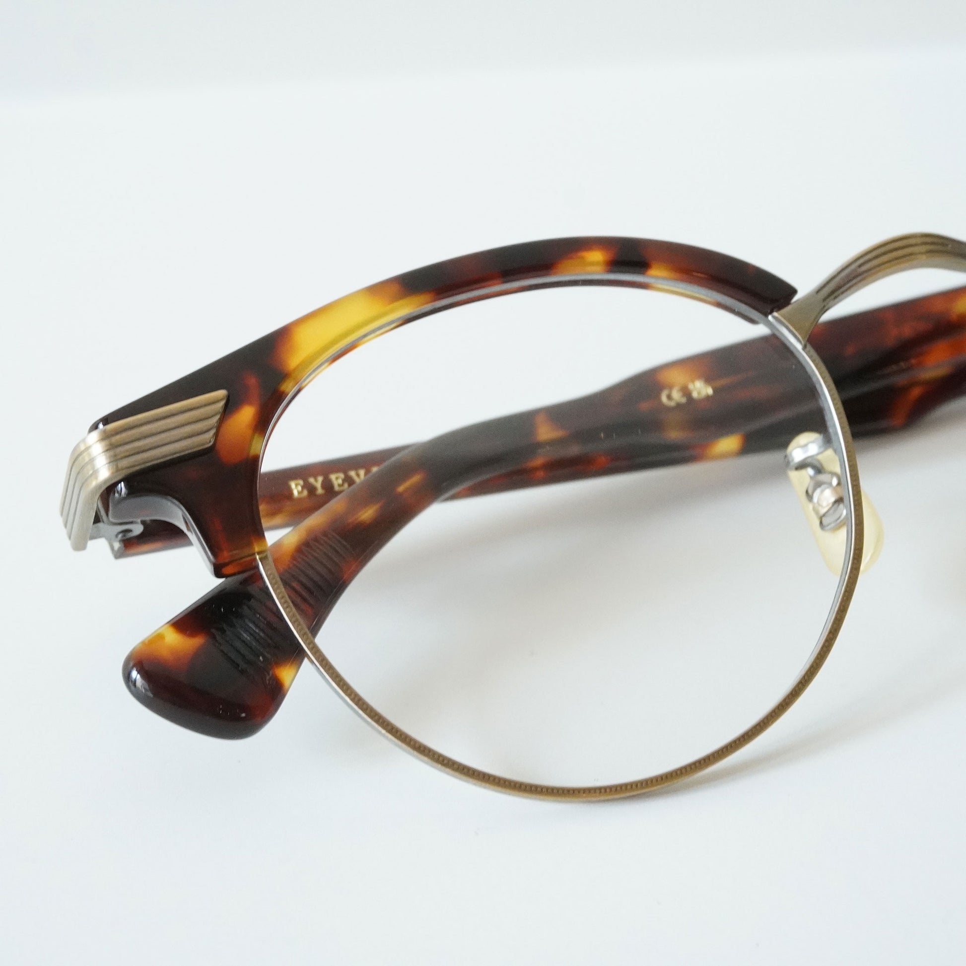 1940年代一部のアメリカンヴィンテージに見られた最初期のサーモントが着想源のフレーム。そのデザインのキーとなる印象的な曲智仕様のヨロイパーツは、型から起こしオリジナルで再現した。 あえてブリッジには繊細なデザイン、玉形にはモダンなシェイプを組み合わせることでオリジナルのヴィンテージがもつ武骨さに繊細なイメージをMIXしたEYEVANらしい新しいサーモントブロウとなった。