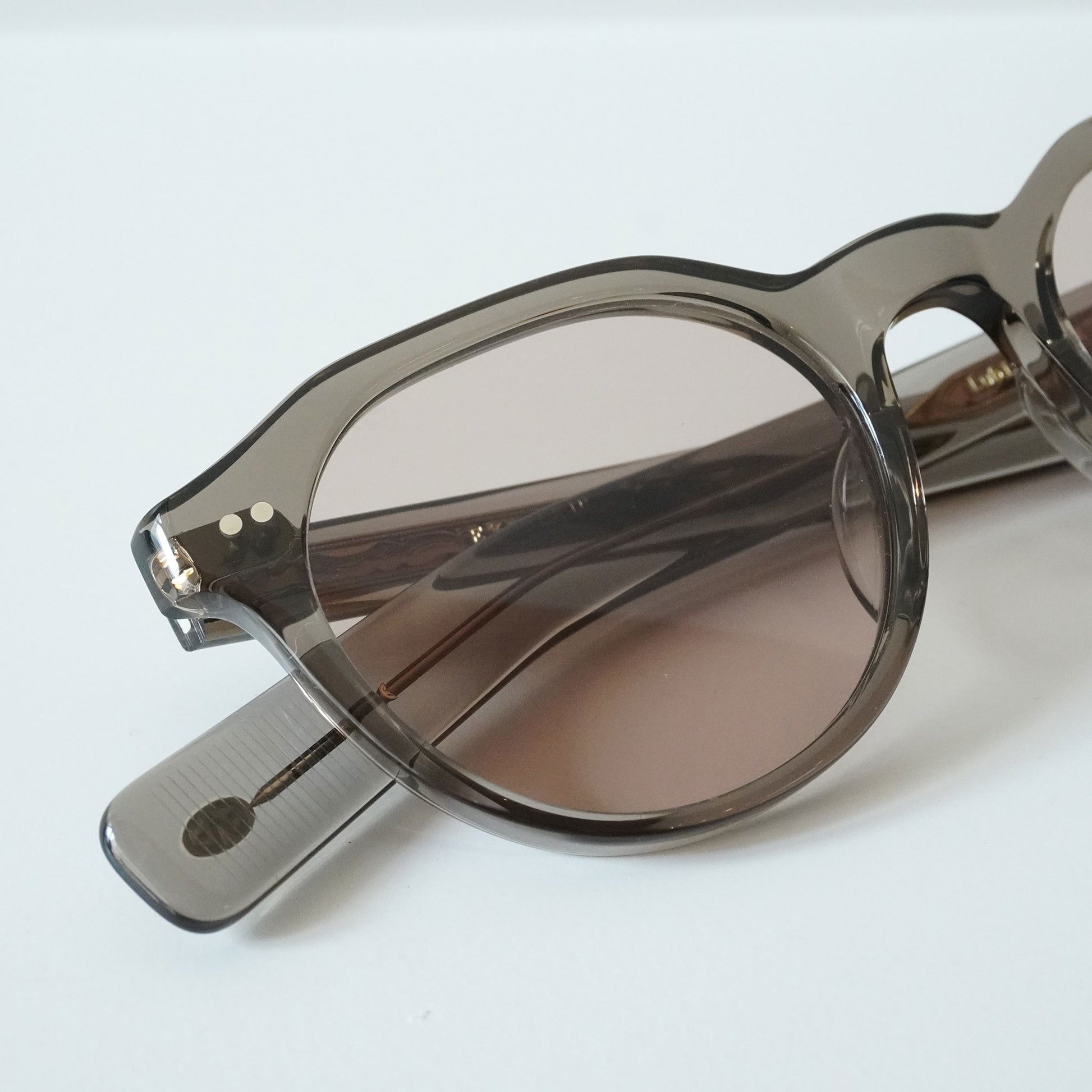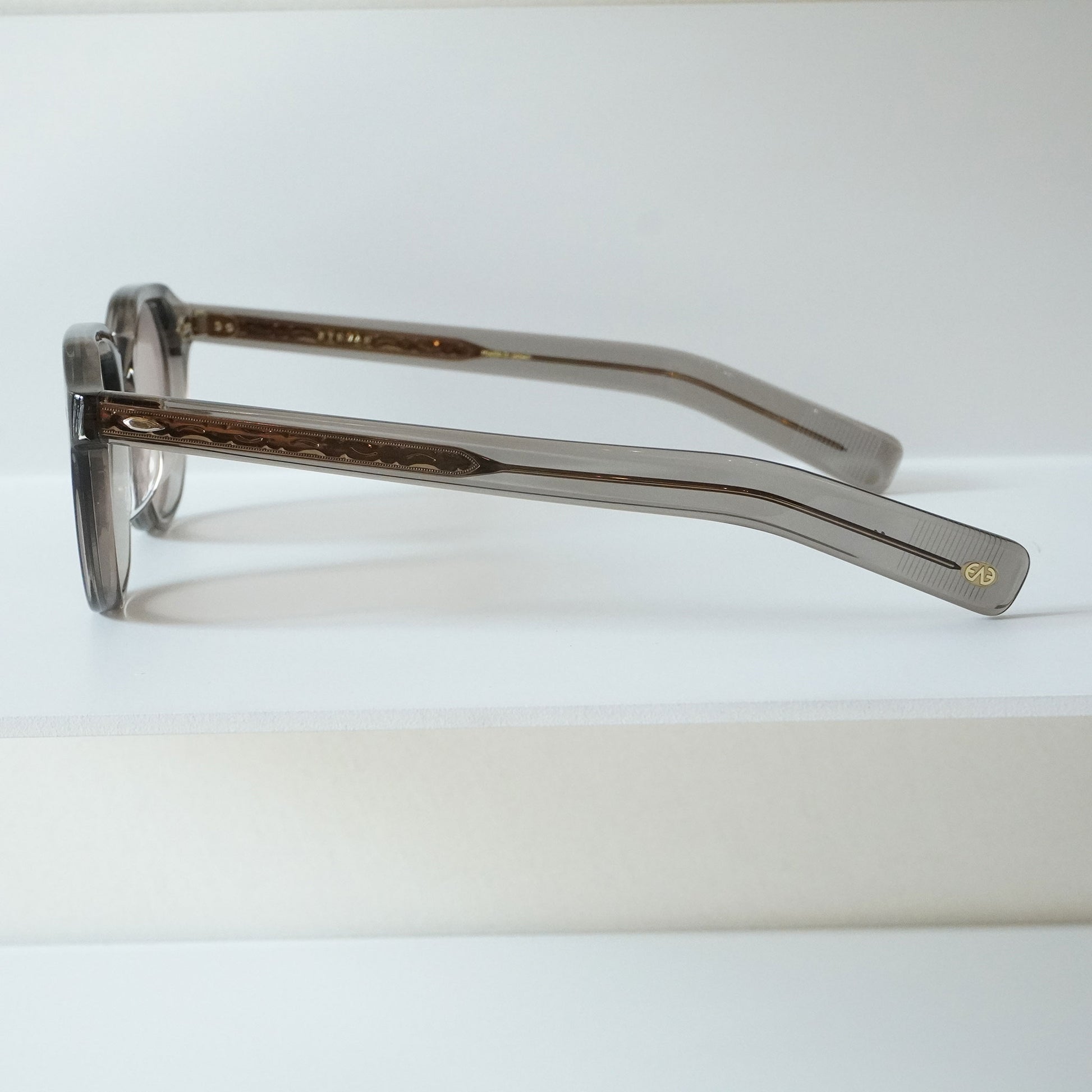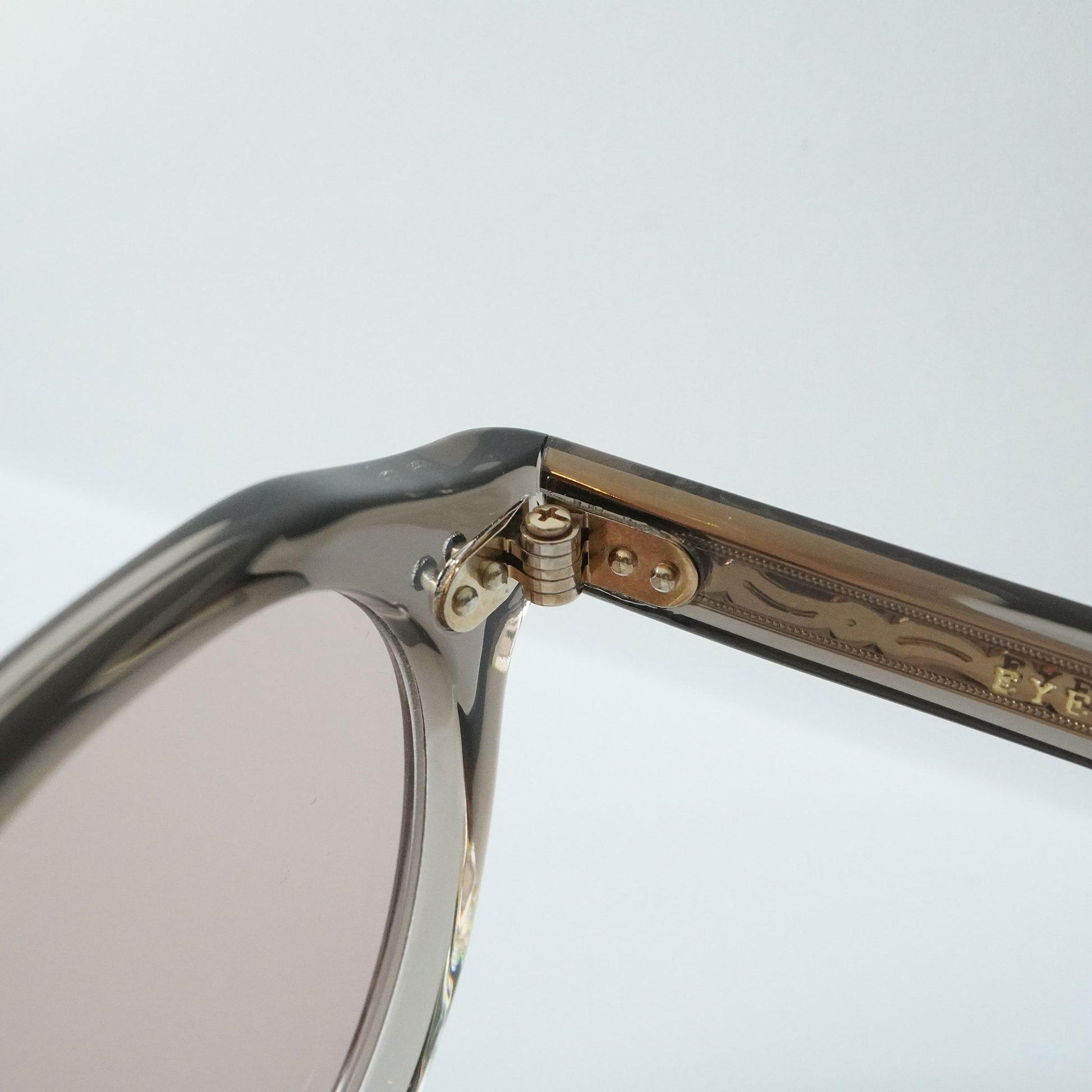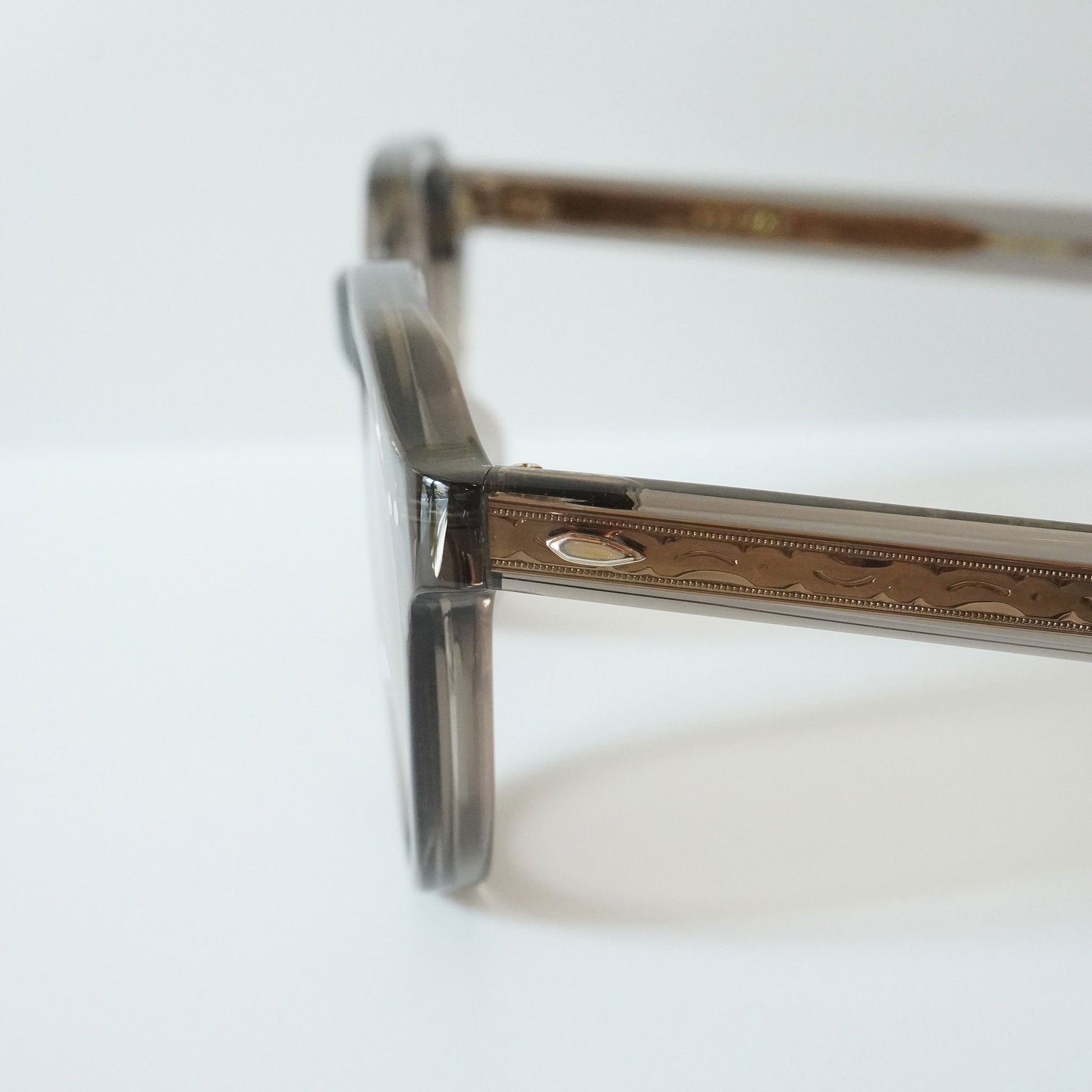 6mm生地をフロントに使ったクラウンパントフロントに、2PIN丁番を採用したプラスチックサングラス。テンプルにはヨーロピアンヴィンテージをベースにしのみに向かって徐々に太くなるデザインと飾り丁番を施し、テンプル芯にはオリジナルの柄を表裏に彫り込んだ芯を採用し、アイヴァンらしいデザインに仕上げた。レンズはオリジナルカラーの2ベースレンズを採用。