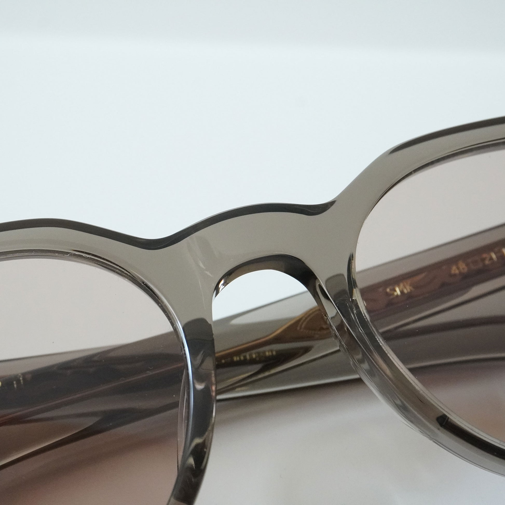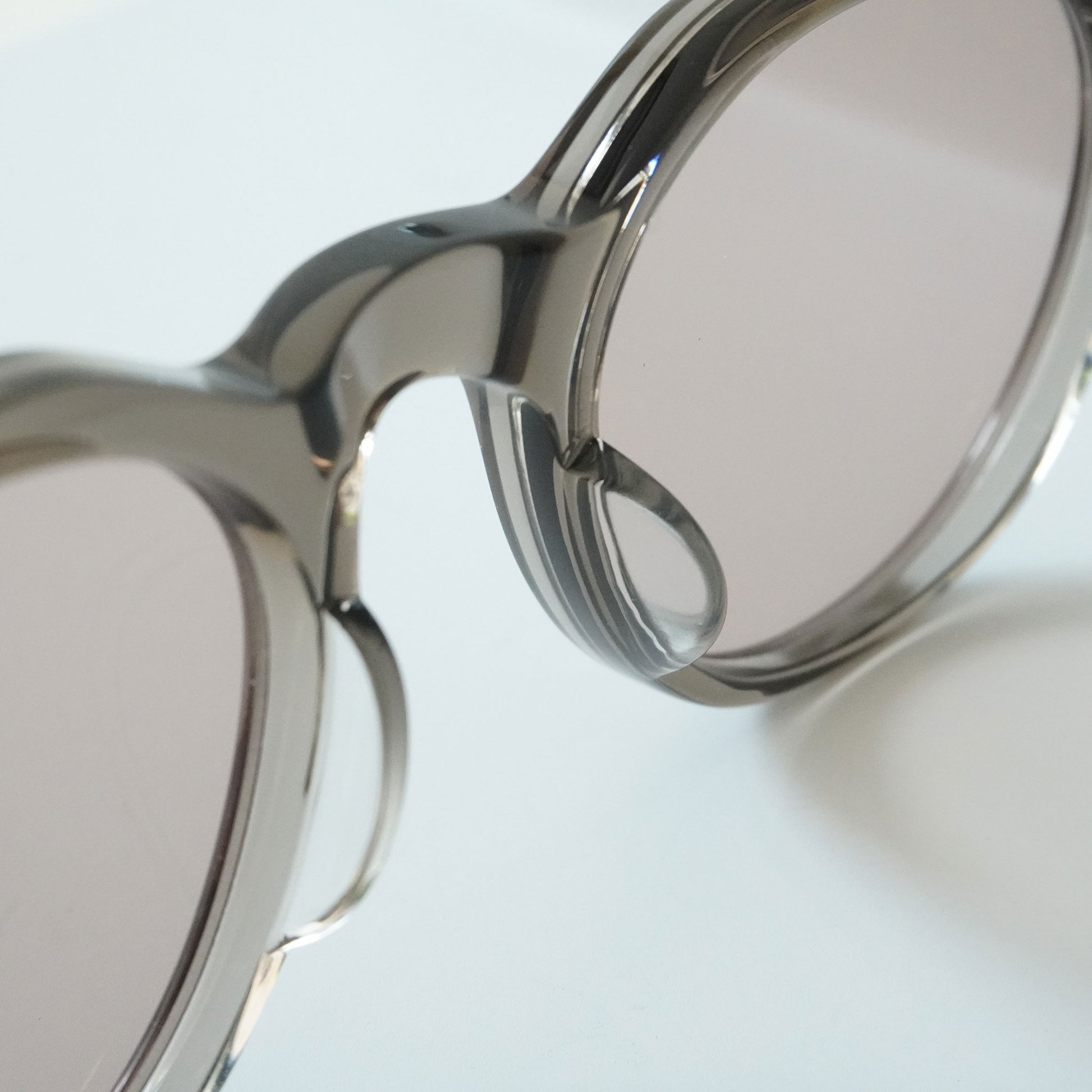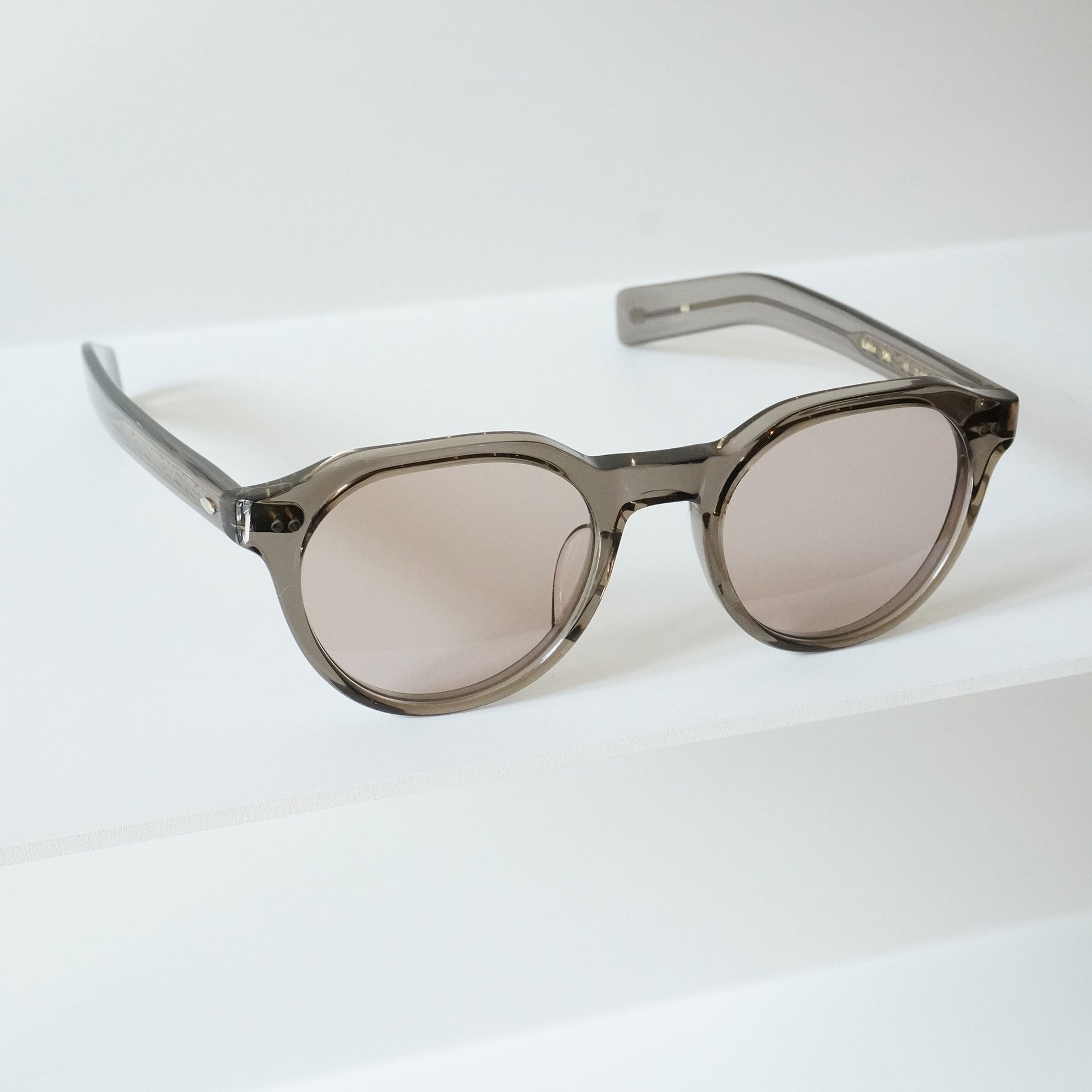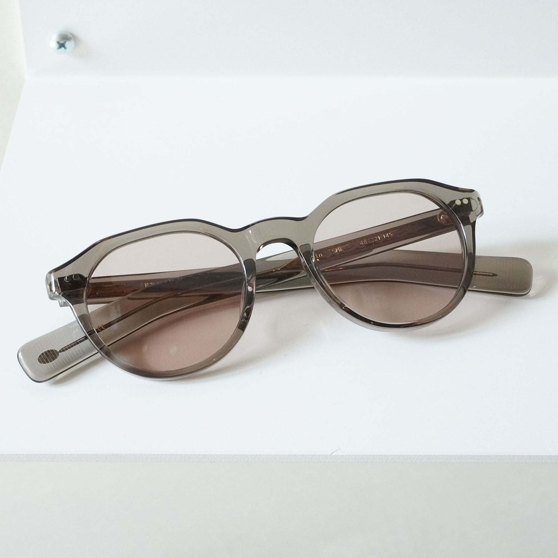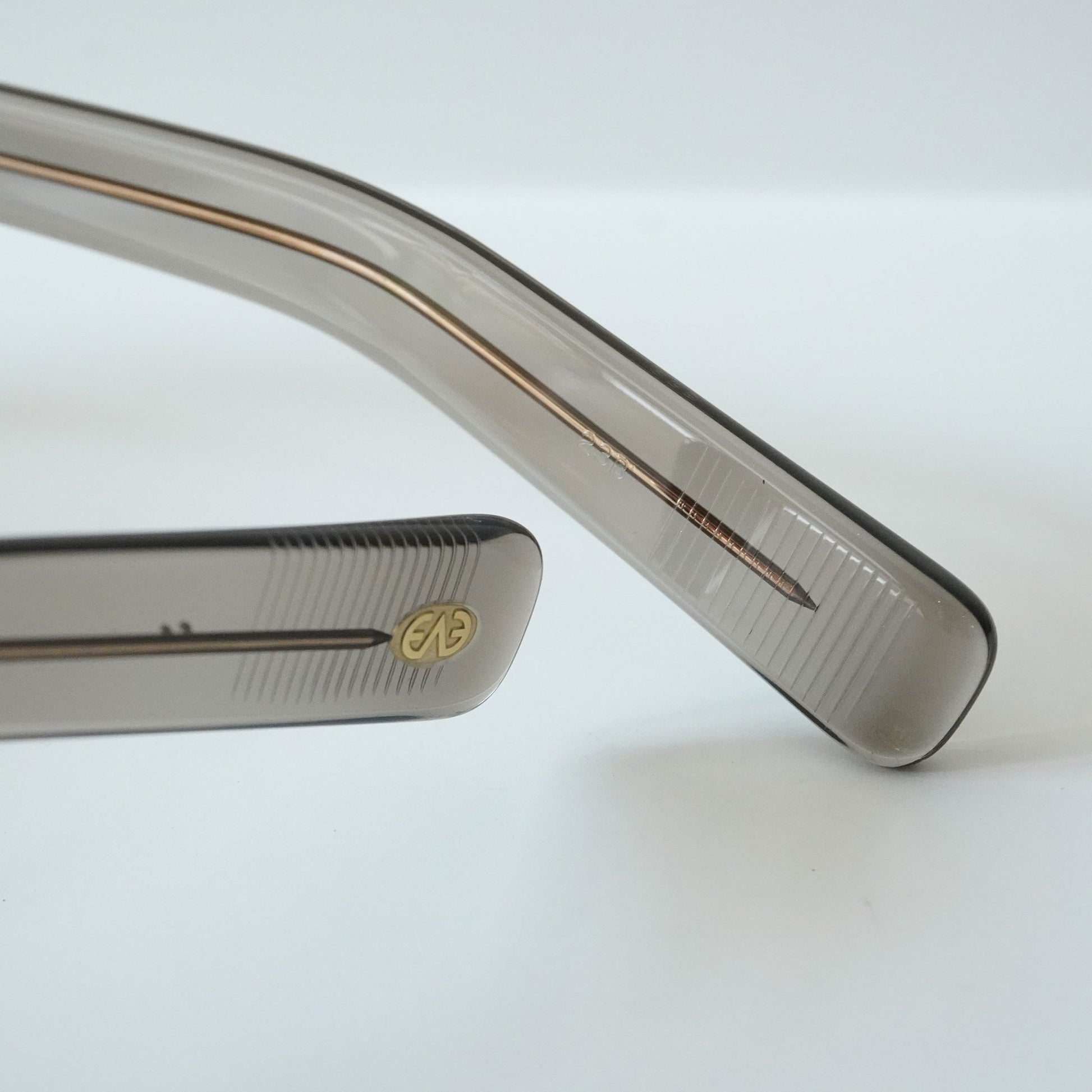 6mm生地をフロントに使ったクラウンパントフロントに、2PIN丁番を採用したプラスチックサングラス。テンプルにはヨーロピアンヴィンテージをベースにしのみに向かって徐々に太くなるデザインと飾り丁番を施し、テンプル芯にはオリジナルの柄を表裏に彫り込んだ芯を採用し、アイヴァンらしいデザインに仕上げた。レンズはオリジナルカラーの2ベースレンズを採用。