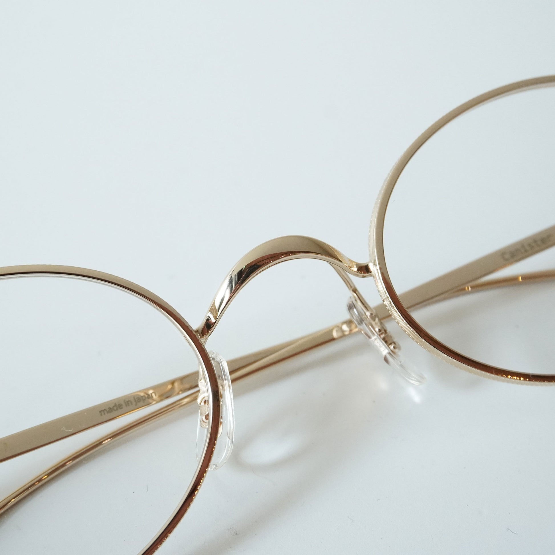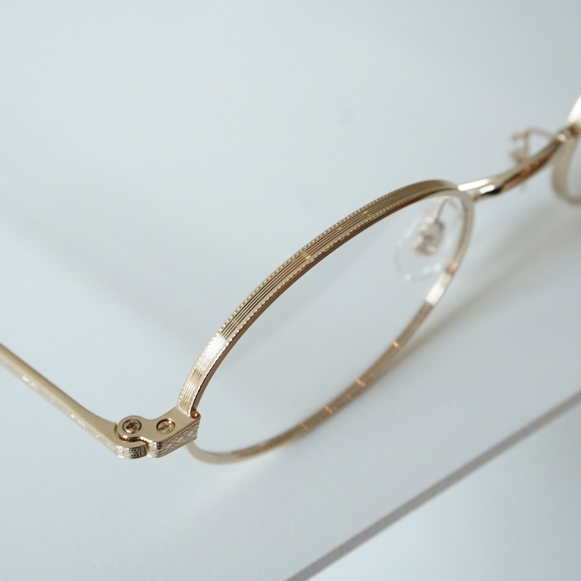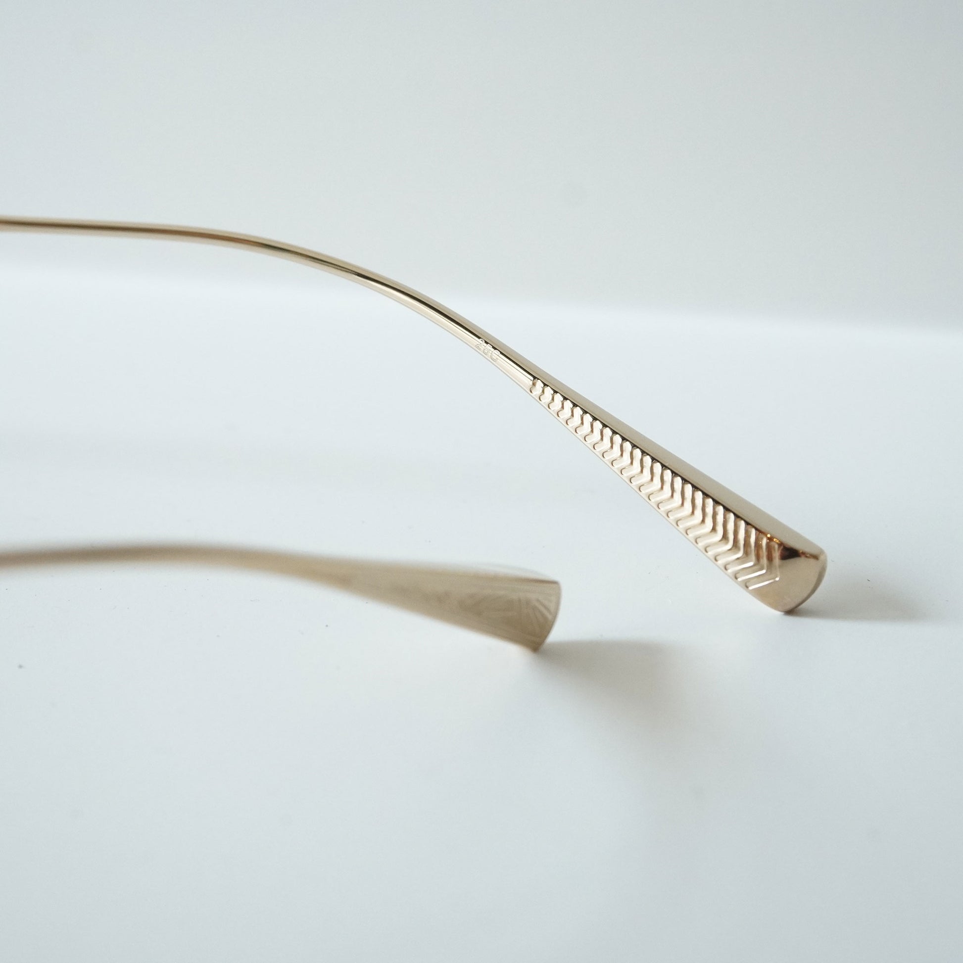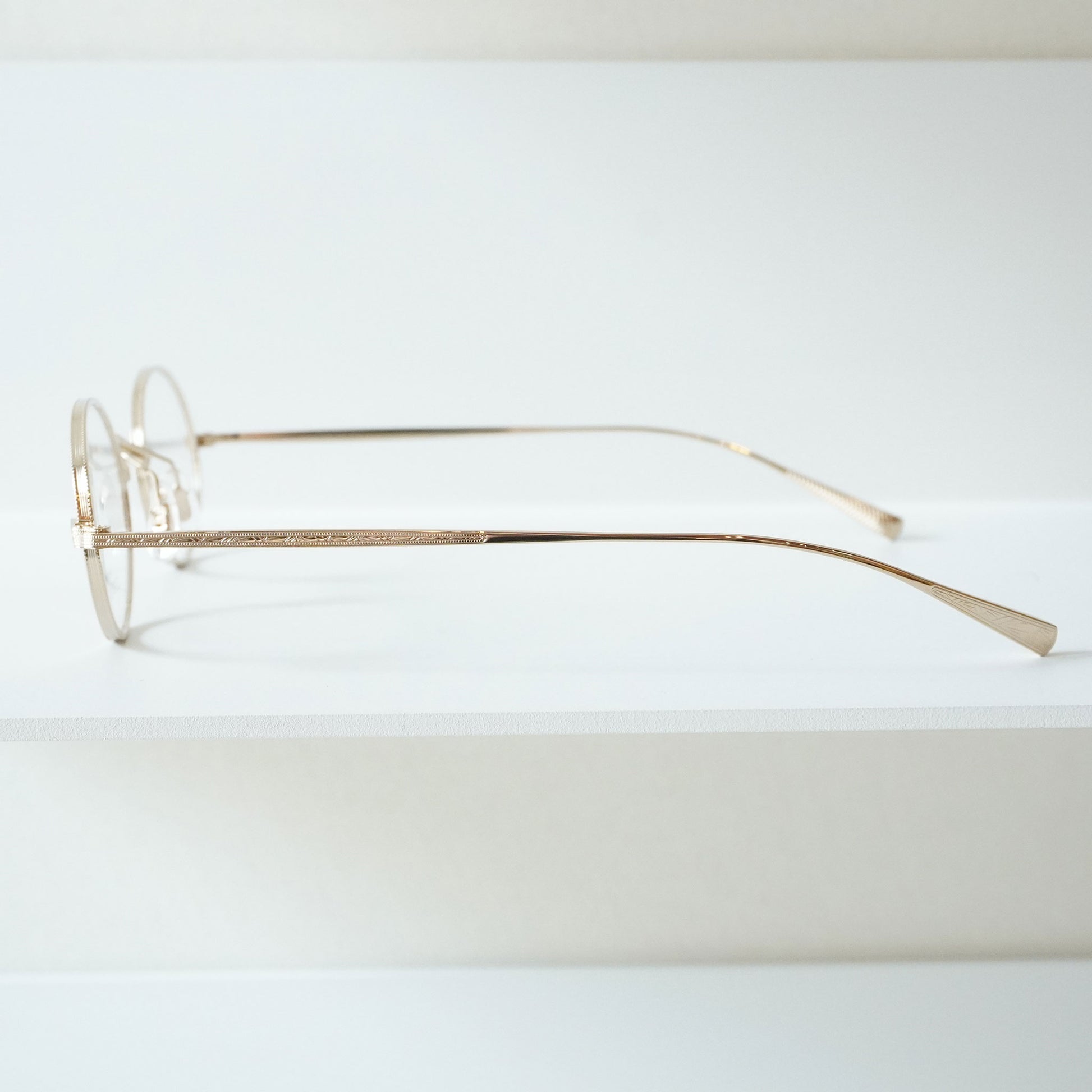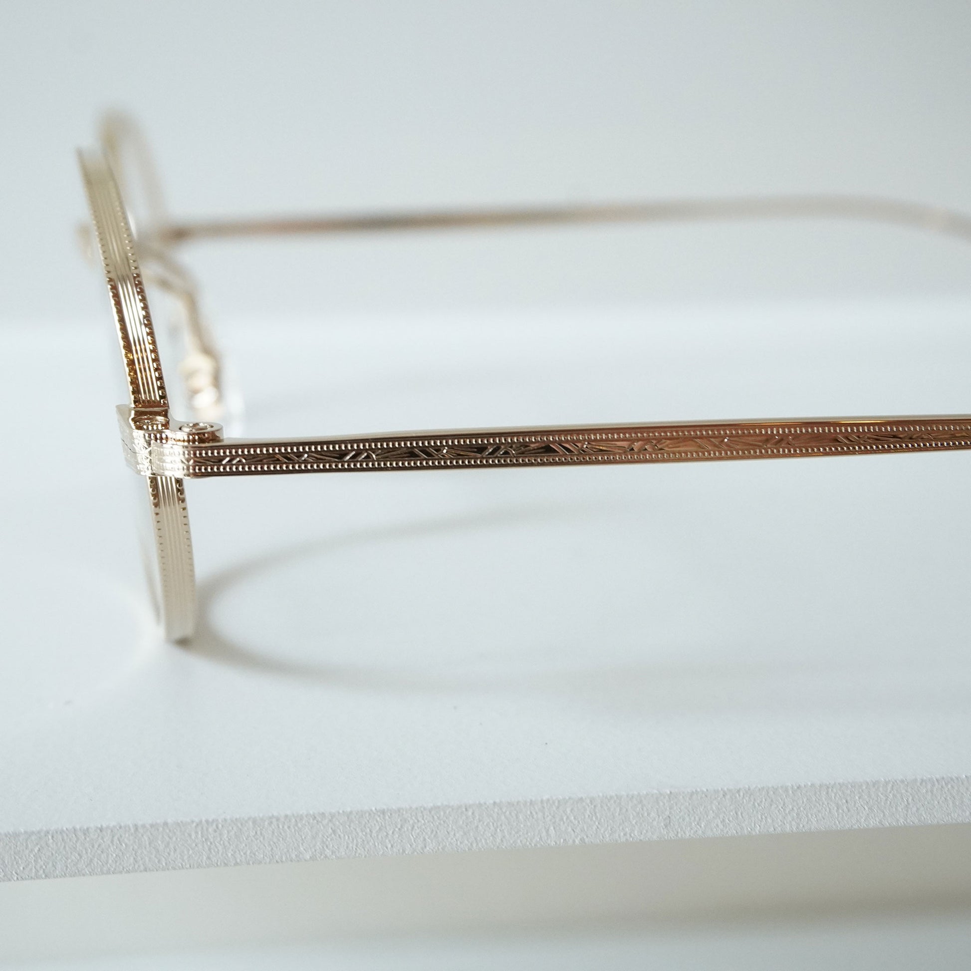2023SSシーズンモデル『Creston』から派生した新しいフレーム。1930年代のメタルフレームのブリッジが着想源となった、通常のリムよりわずかに厚みを持つオリジナルリムと、職人の手掘りマスターにより丁番の内部まで装飾されたヨロイ、繊細な模様の入ったチタンテンプルの組み合わせに柔らかな曲線のWブリッジを合わせた。レンズシェイプは、1980年代後半にイギリスの小さな工房で作られた14Kのヴィンテージフレームからサンプリングしています。