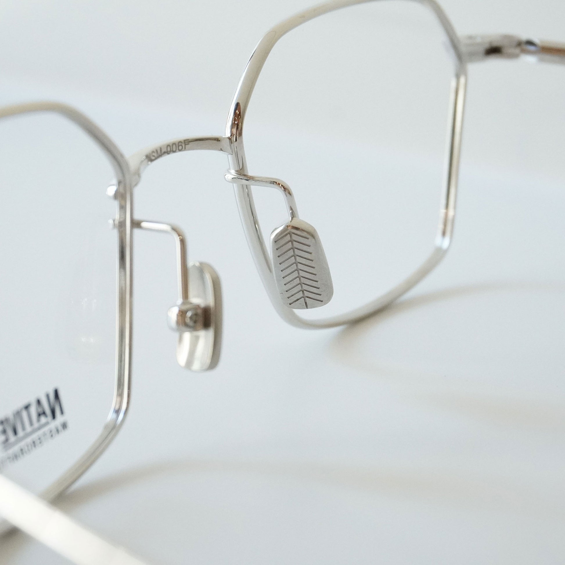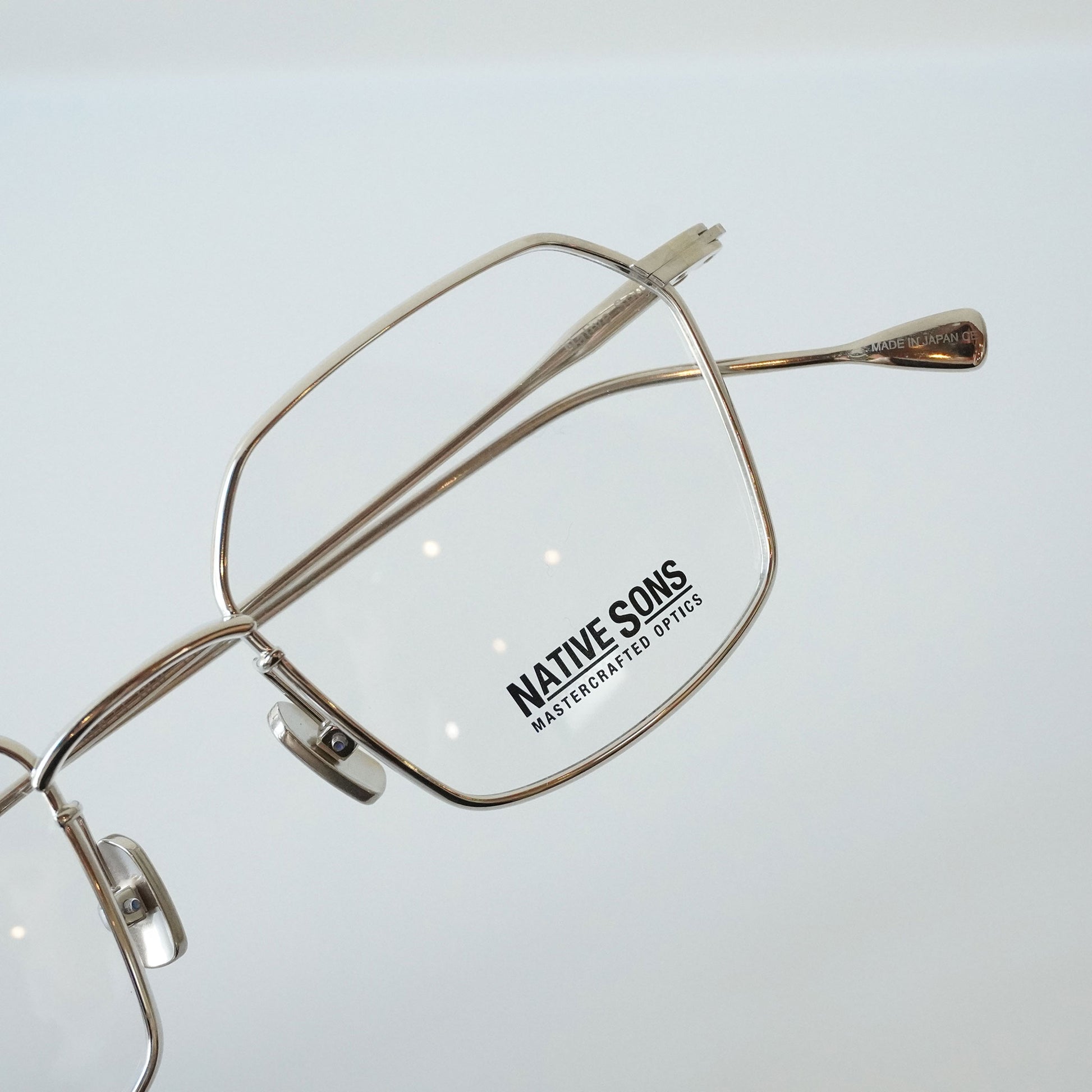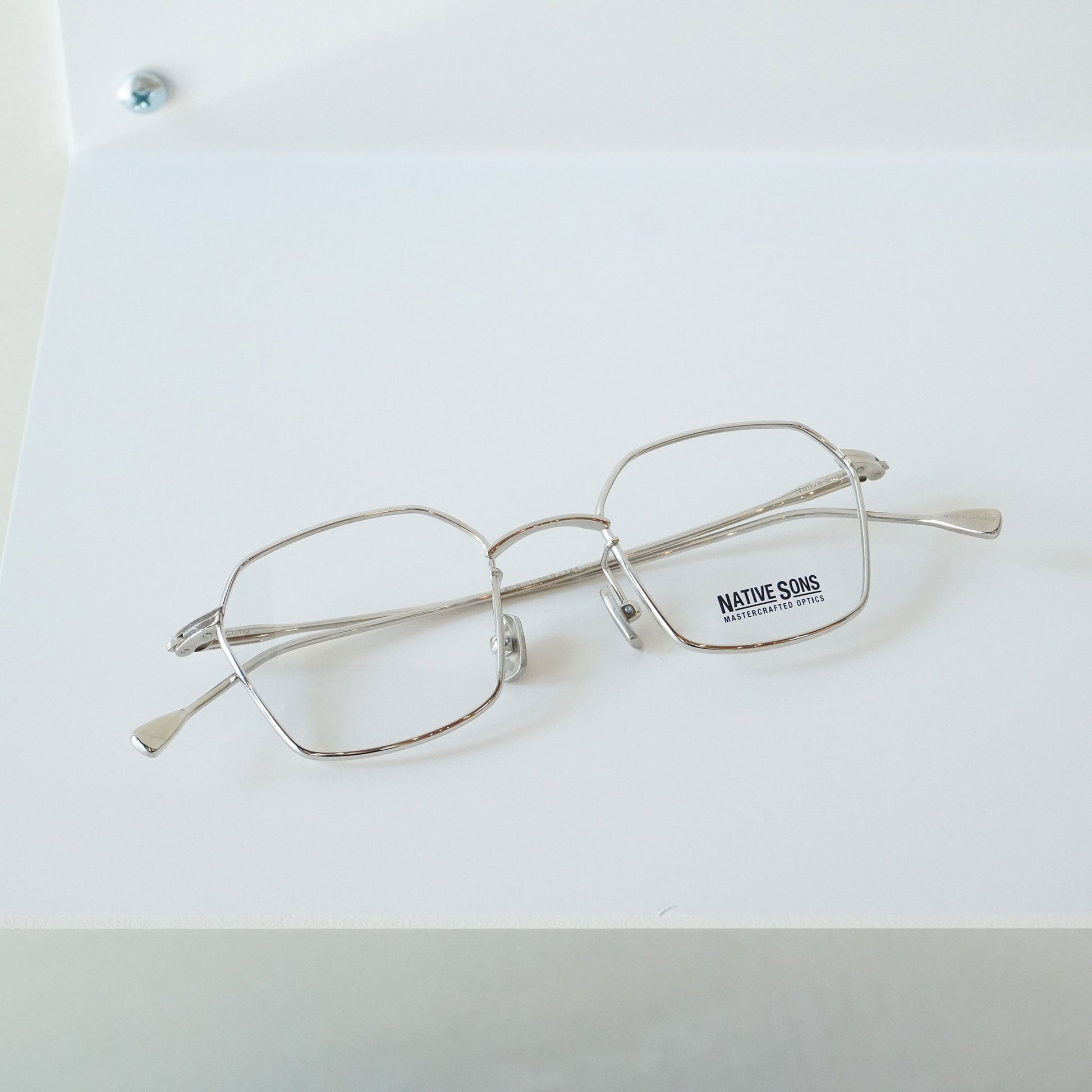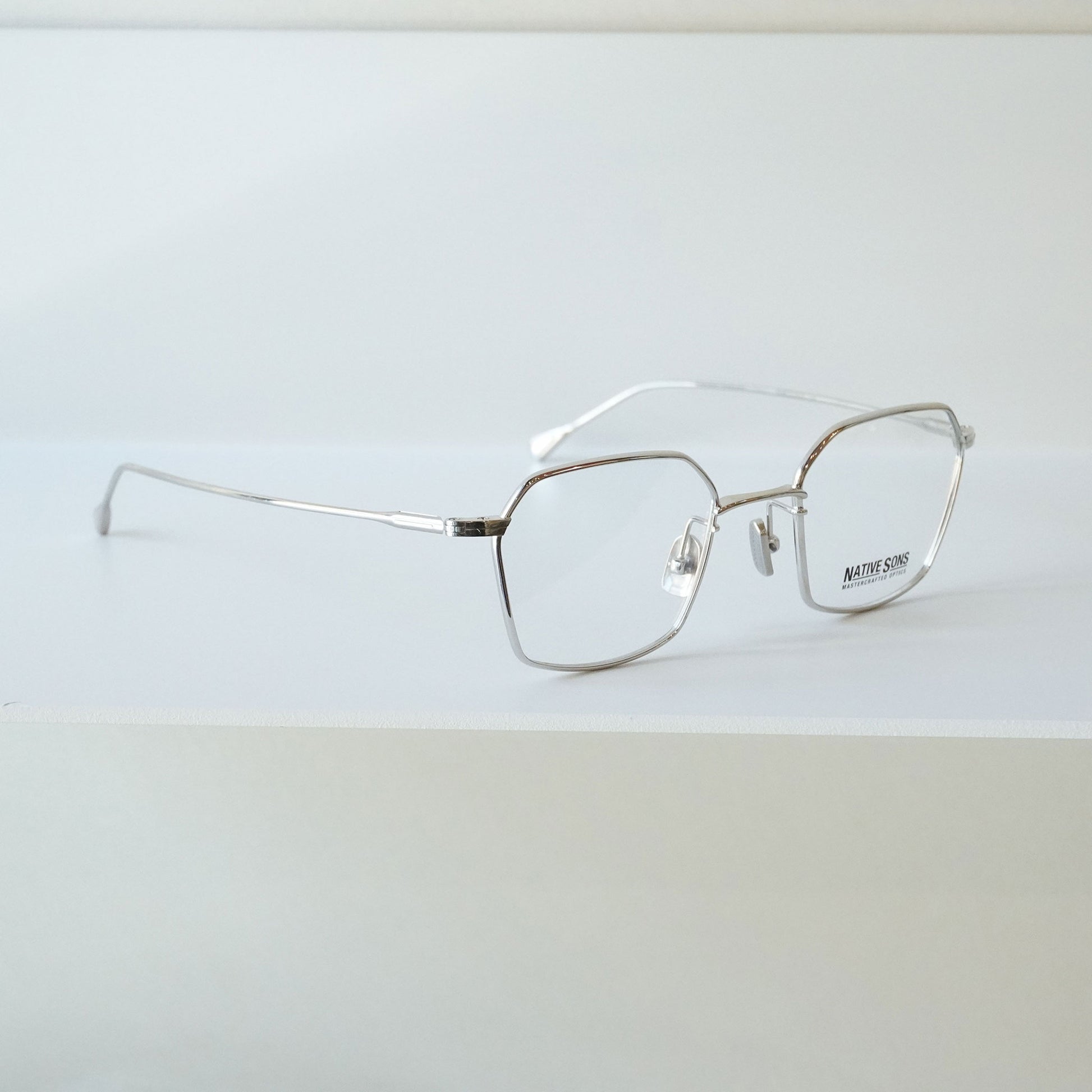 NATIVESONS(ネイティブサンズ)のシンプルなメタルシリーズ。六角形のヘキサゴン型、シンプルですがやや癖のある飽きのこないデザイン。小ぶりなサイズなので、小顔〜平均のお顔幅の方へオススメします。知的でセクシーな雰囲気のあるモデルです。