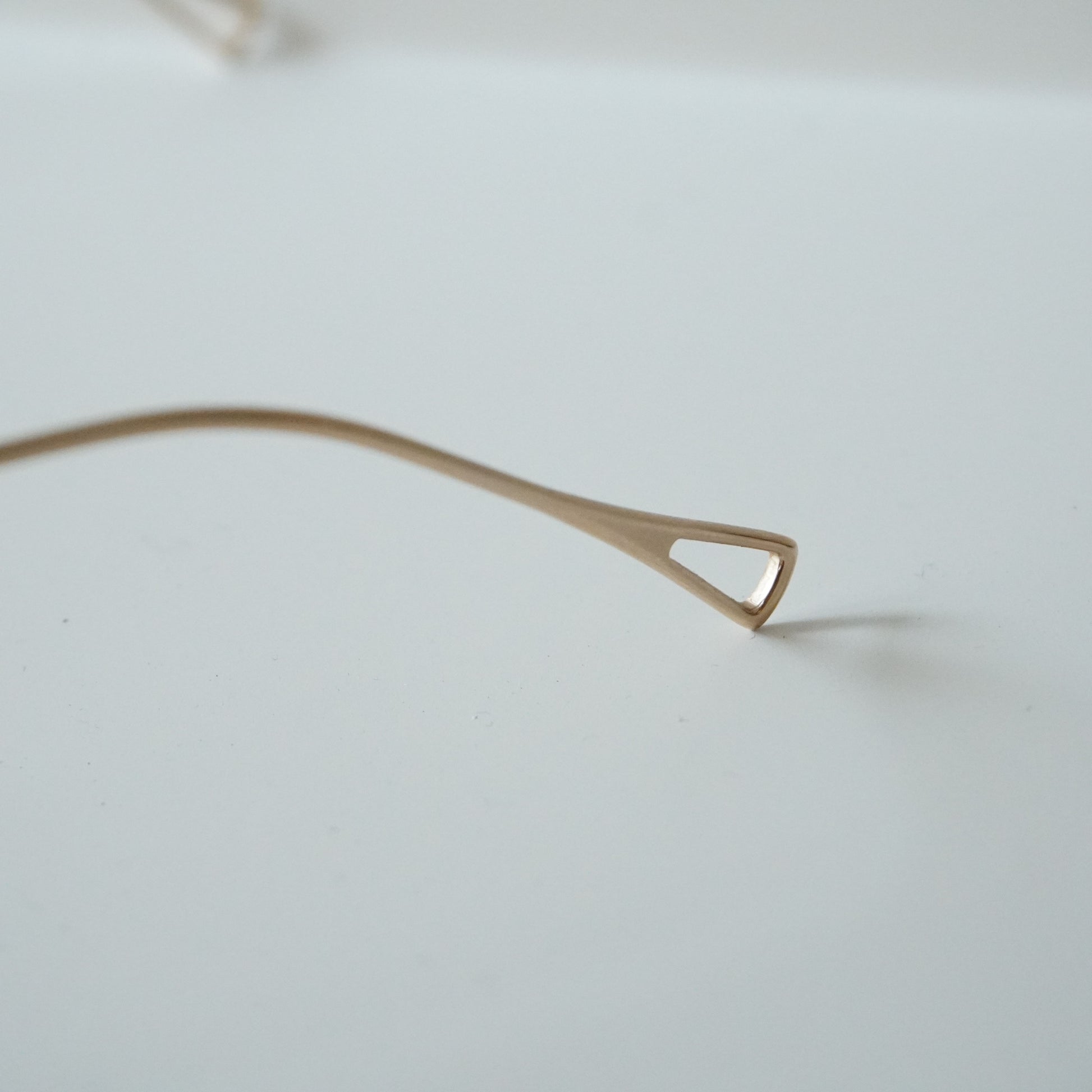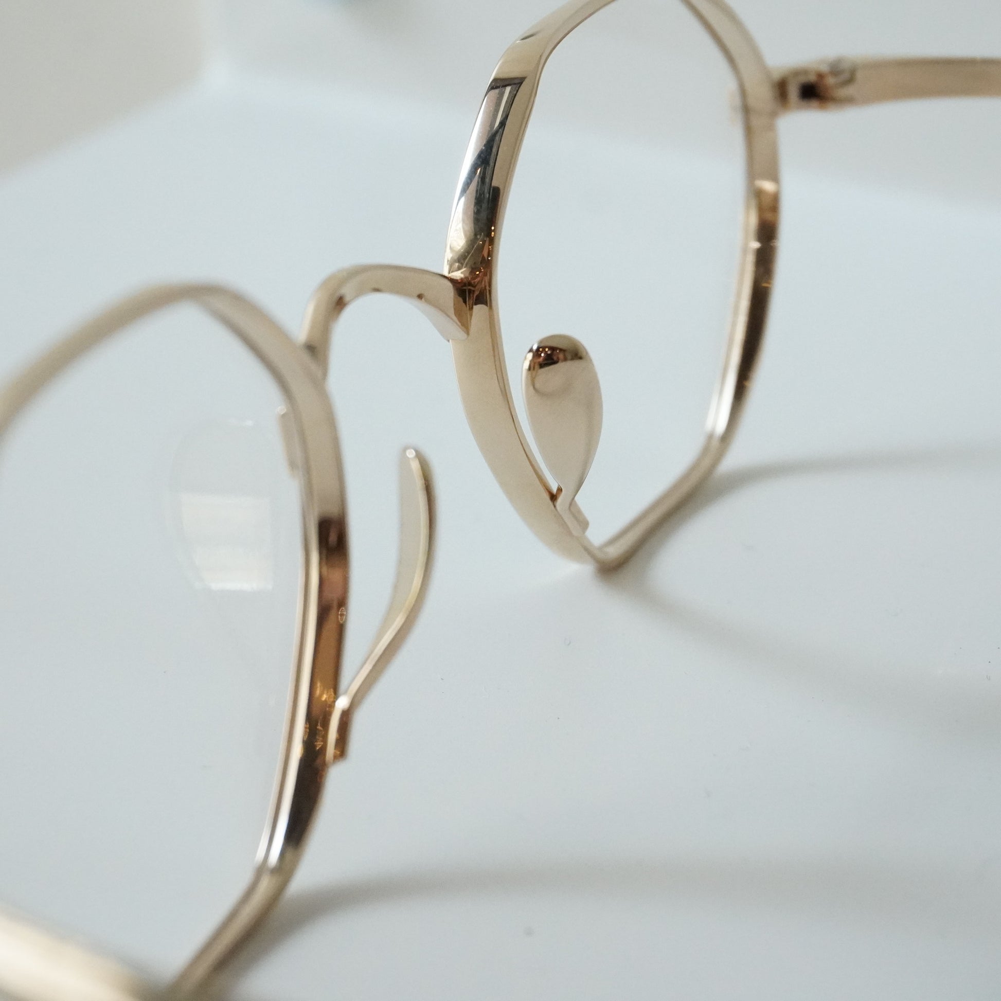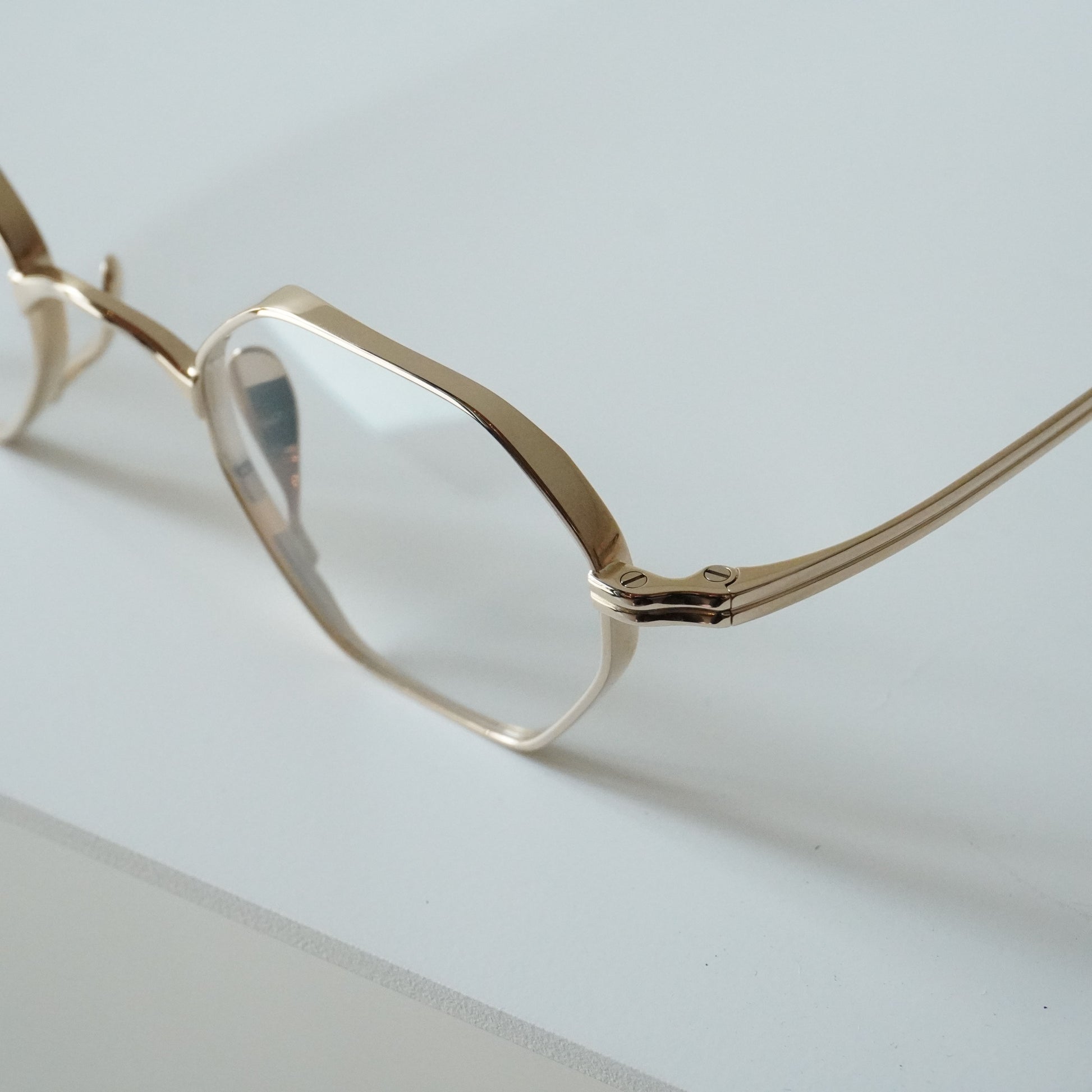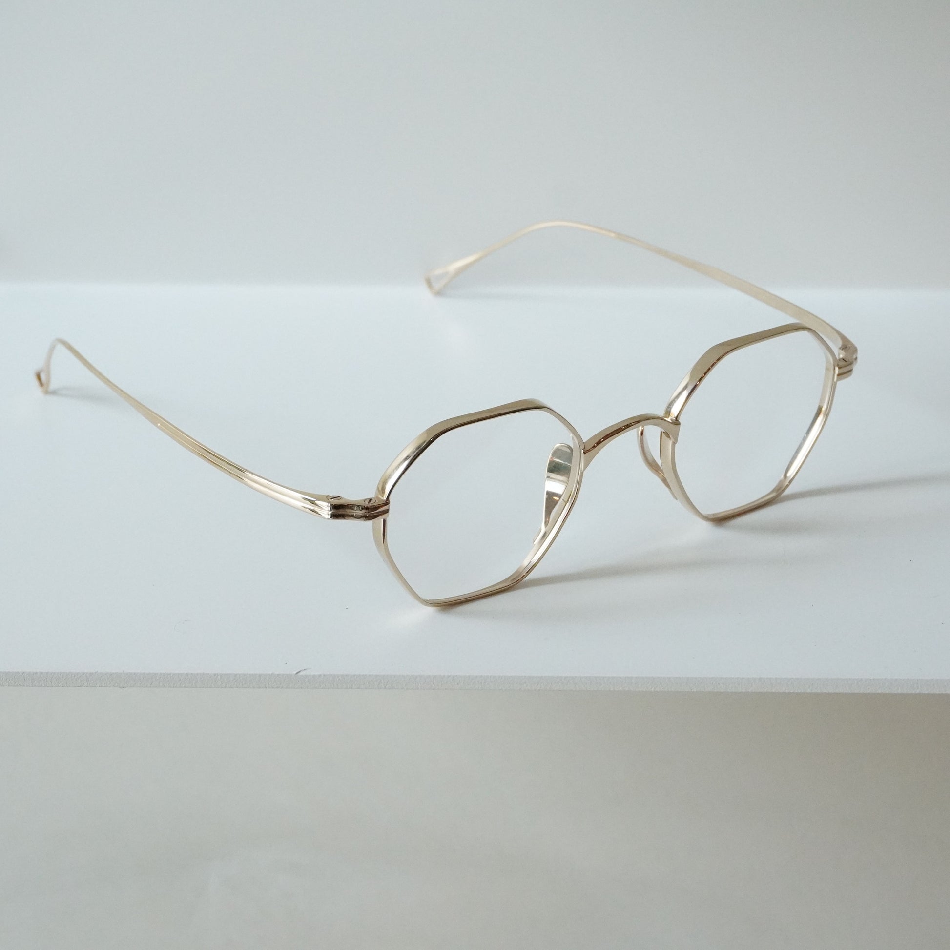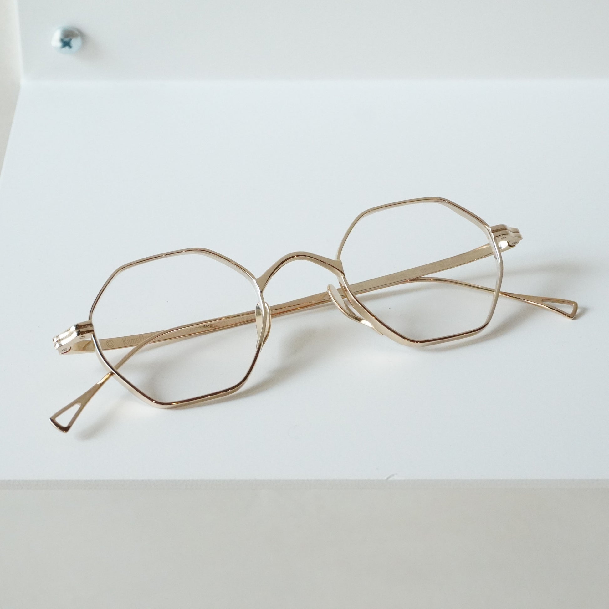 8角形のオクタゴンシェイプが特徴のオールチタンで製作されたメタルフレームです。厚みのあるリムは横顔の印象を格上げしてくれるデザイン、お度数の強い方でもレンズの厚みが気になりにくいです。鼻パットは美しさと機能性を追求した下から伸び上がるデザイン。小ぶりなサイズ感はお顔の小さい方やレトロな印象で掛けたい方にオススメです。