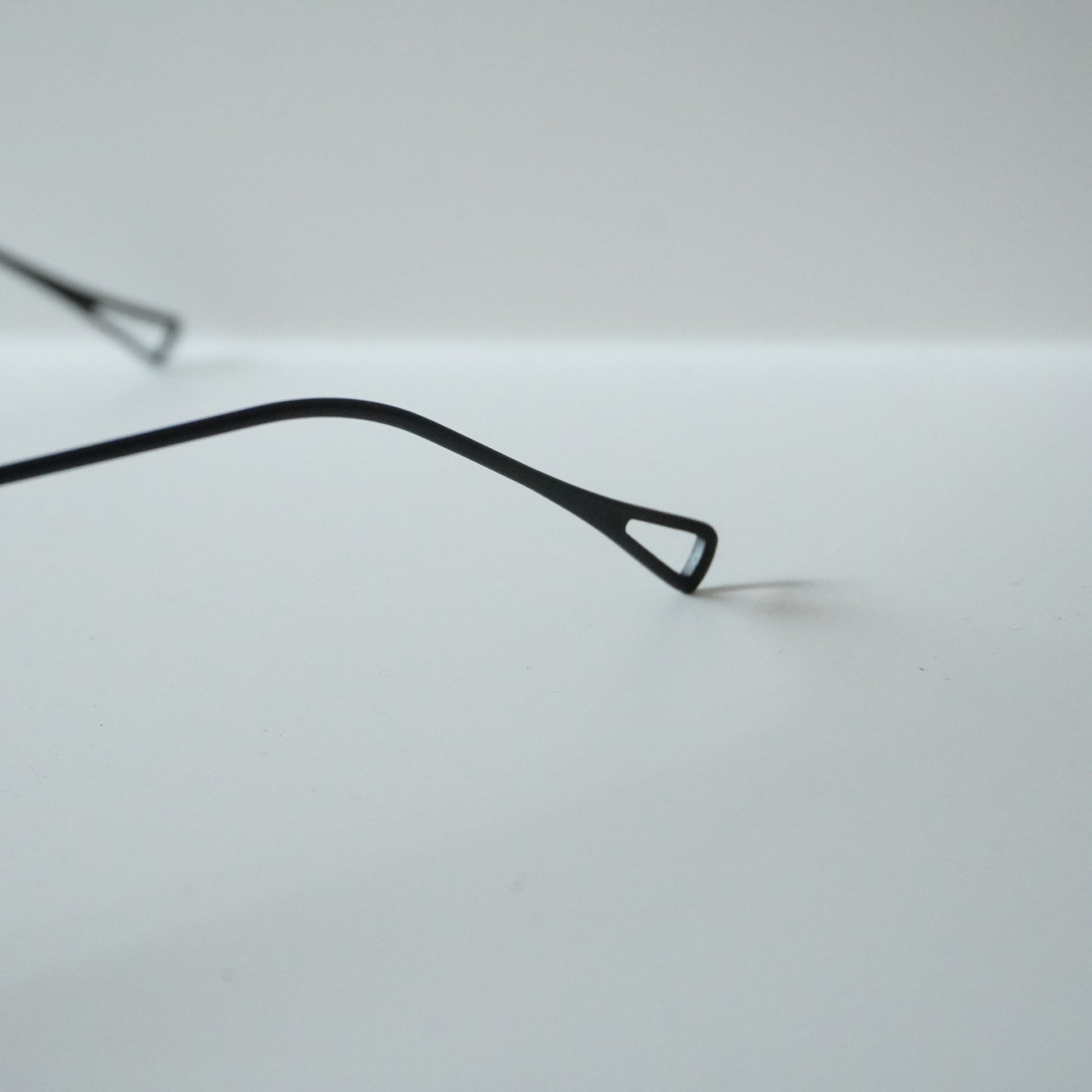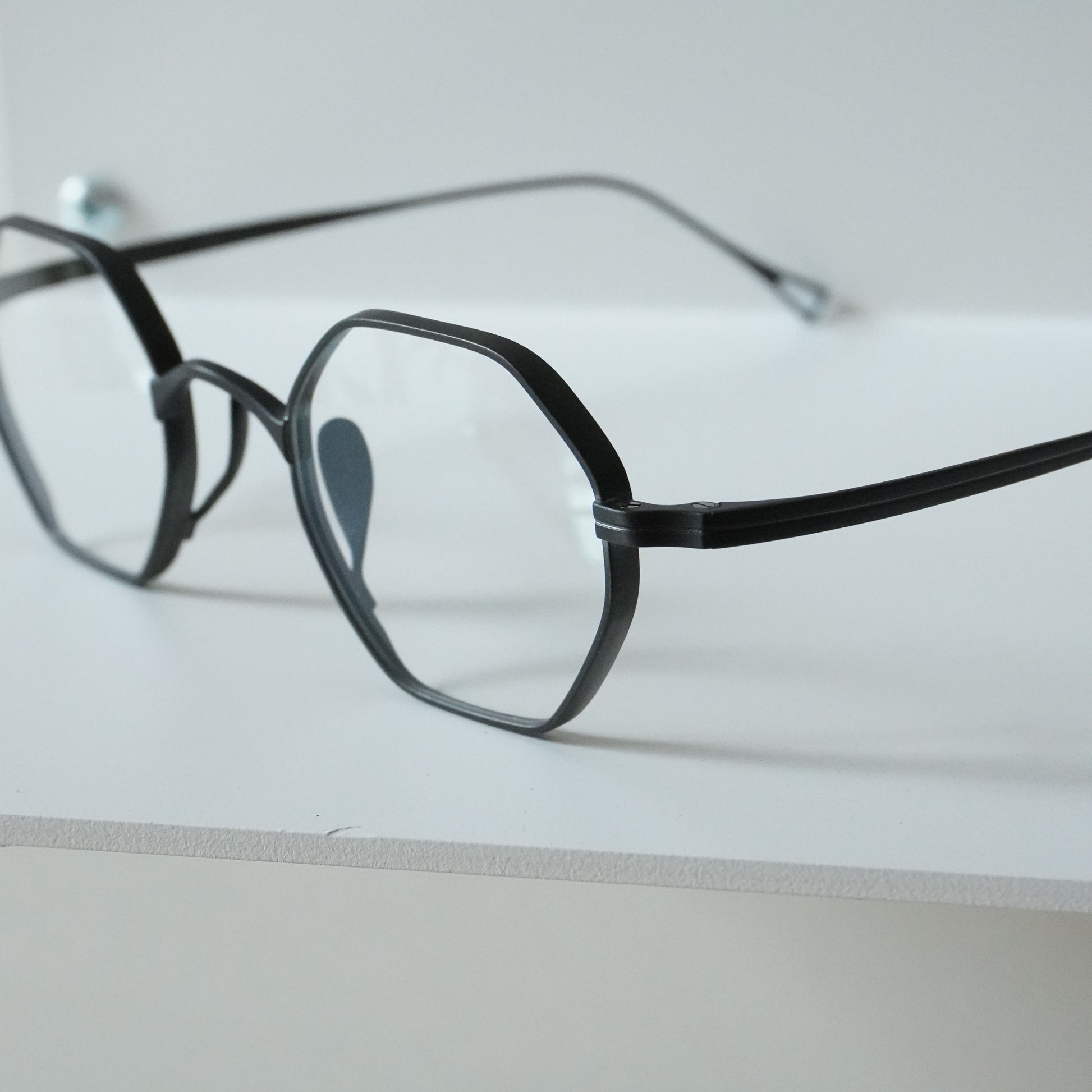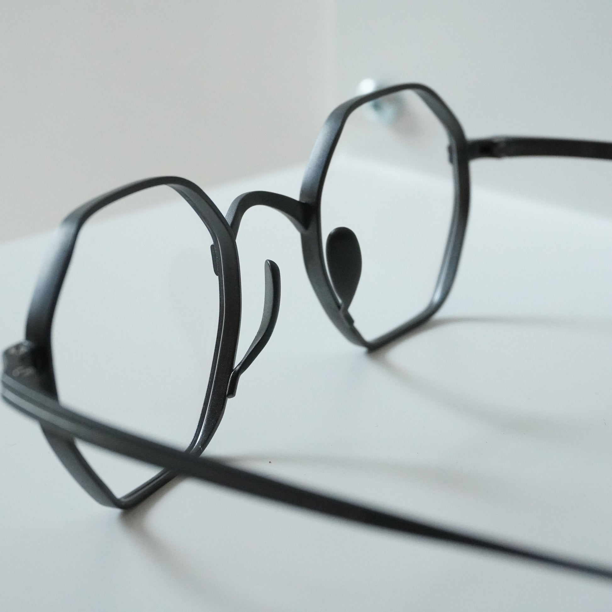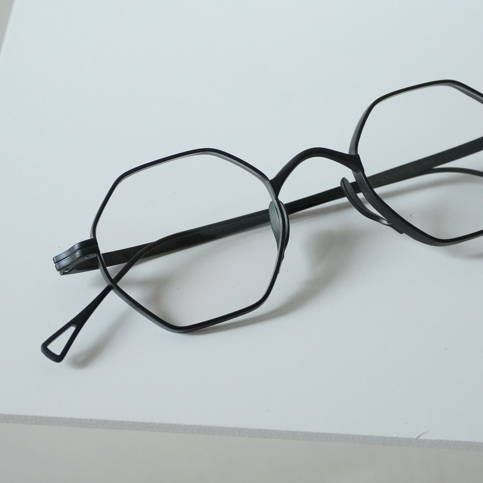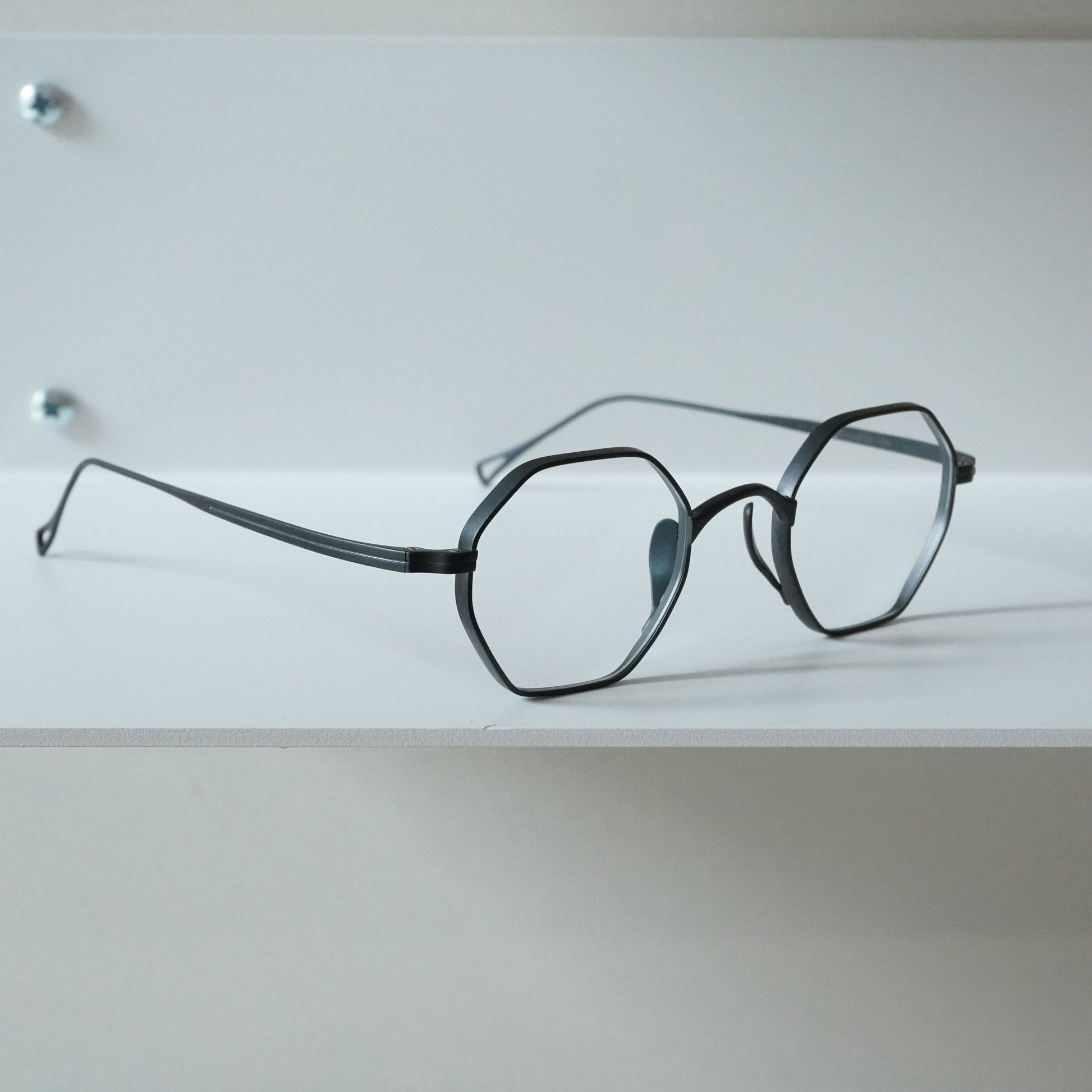 8角形のオクタゴンシェイプが特徴のオールチタンで製作されたメタルフレームです。厚みのあるリムは横顔の印象を格上げしてくれるデザイン、お度数の強い方でもレンズの厚みが気になりにくいです。鼻パットは美しさと機能性を追求した下から伸び上がるデザイン。小ぶりなサイズ感はお顔の小さい方やレトロな印象で掛けたい方にオススメです。