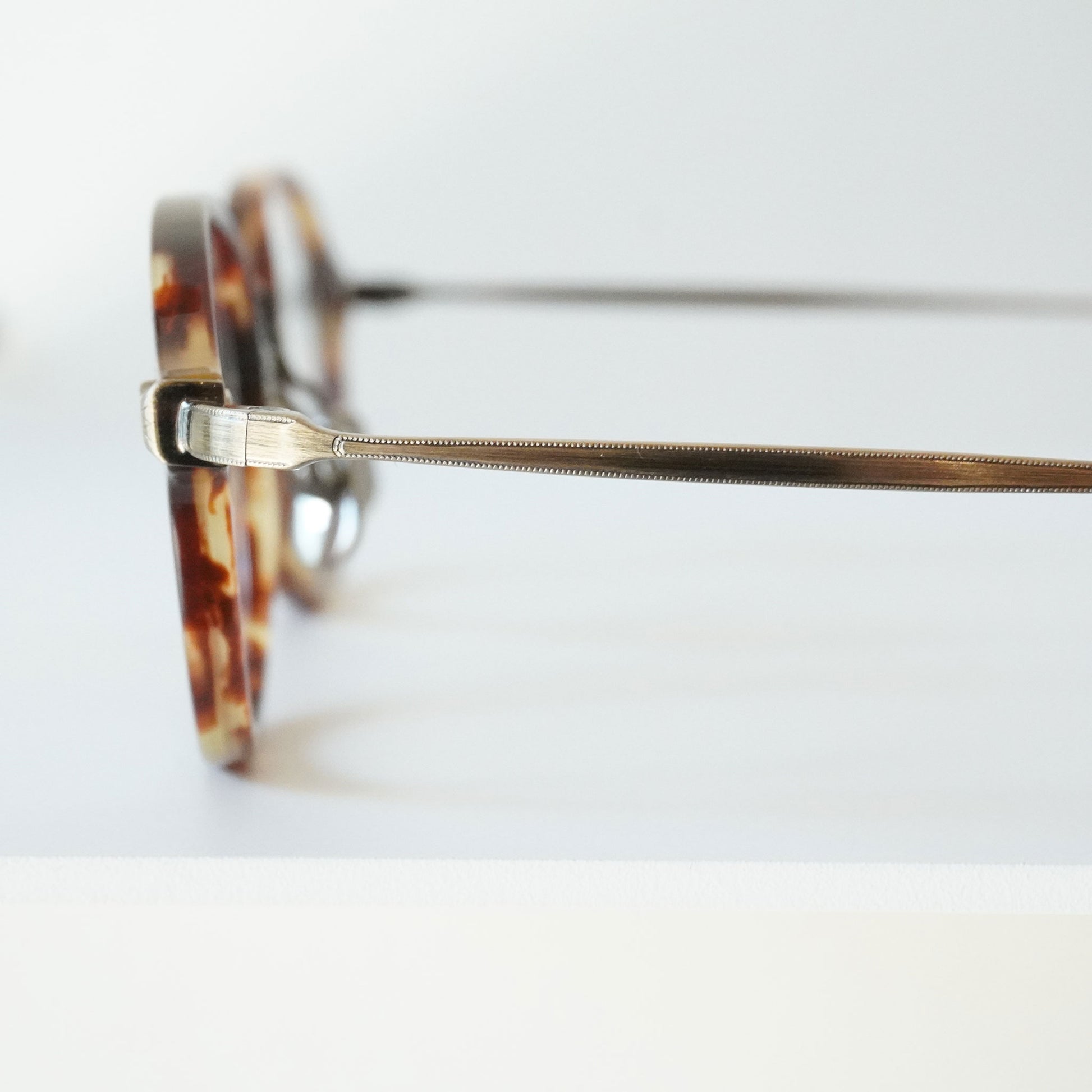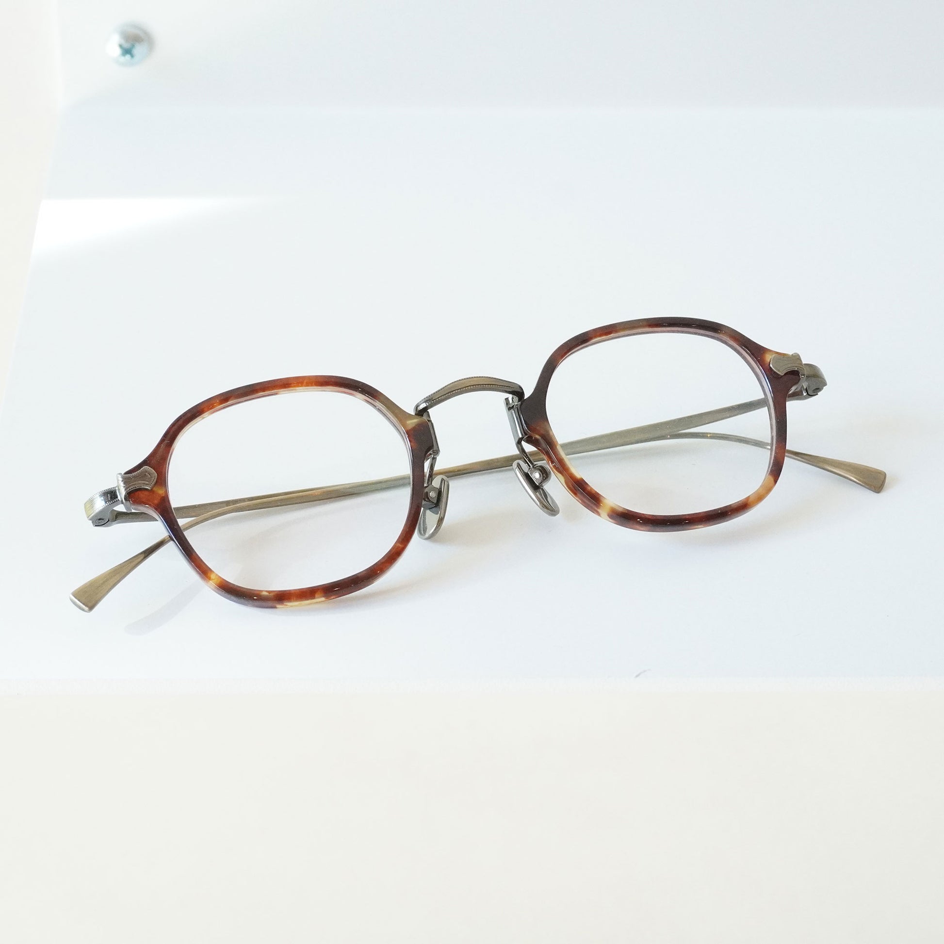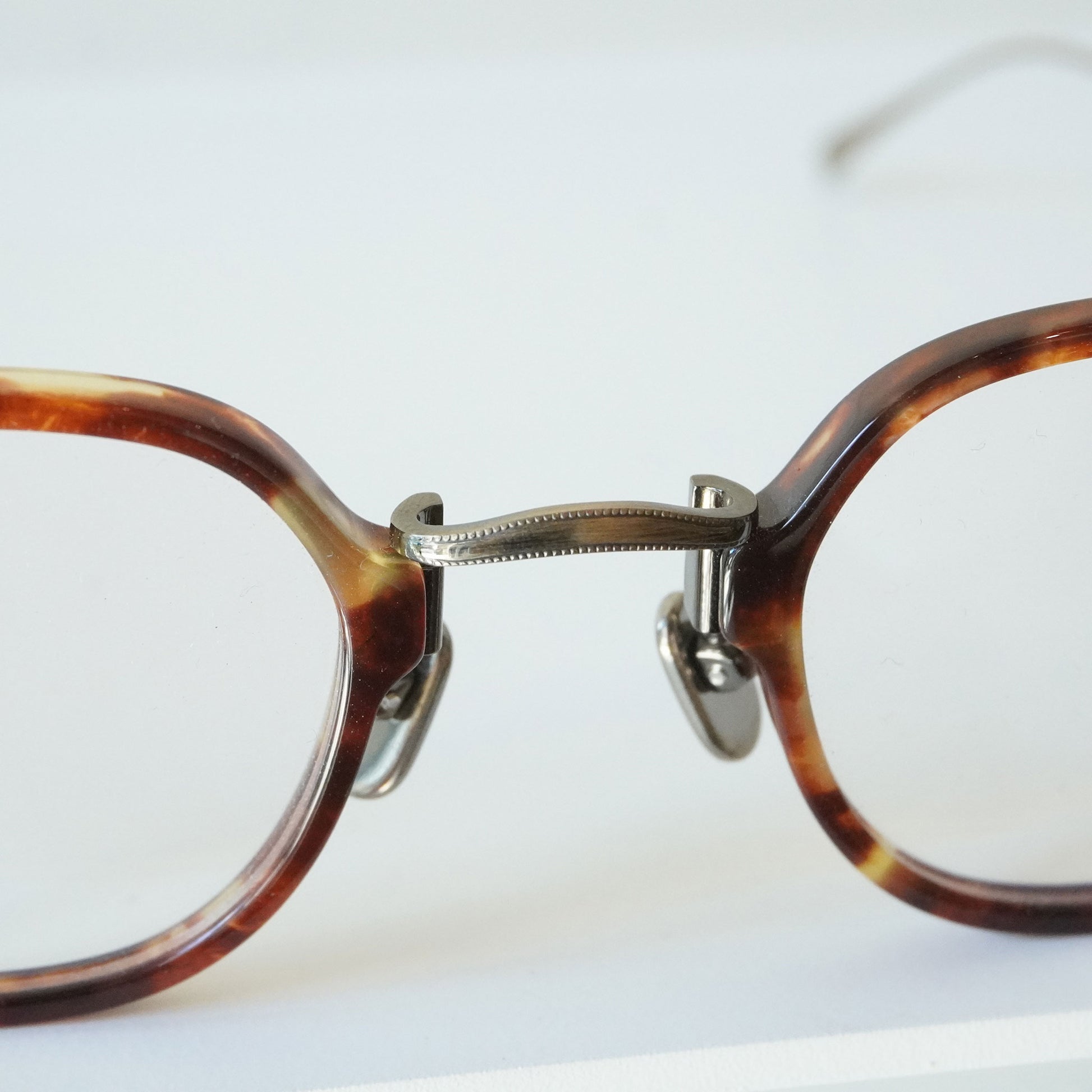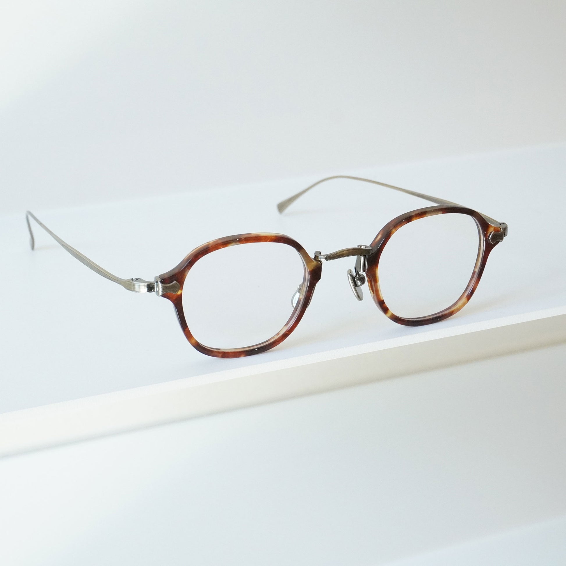 軽く掛け心地のいいコンビネーションフレーム、小さいサイズ感と四角いシェイプのバランスがいいモデルです。知的で控えめな雰囲気を持つ当店で人気のメガネ、お度数の強い方にもオススメです。