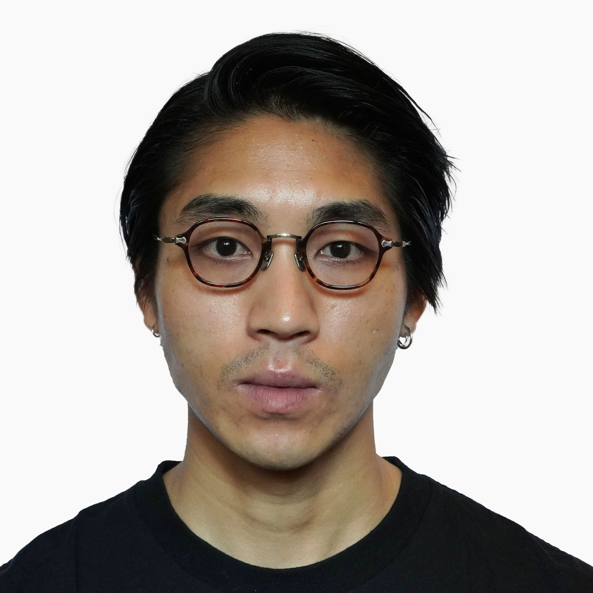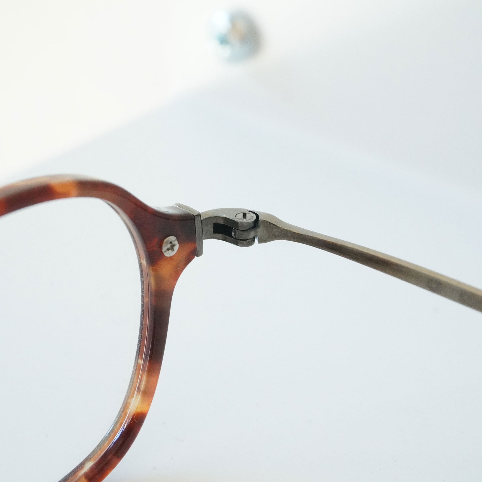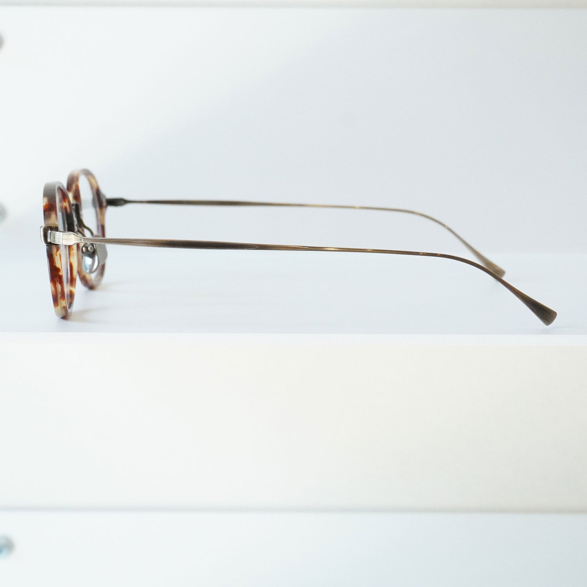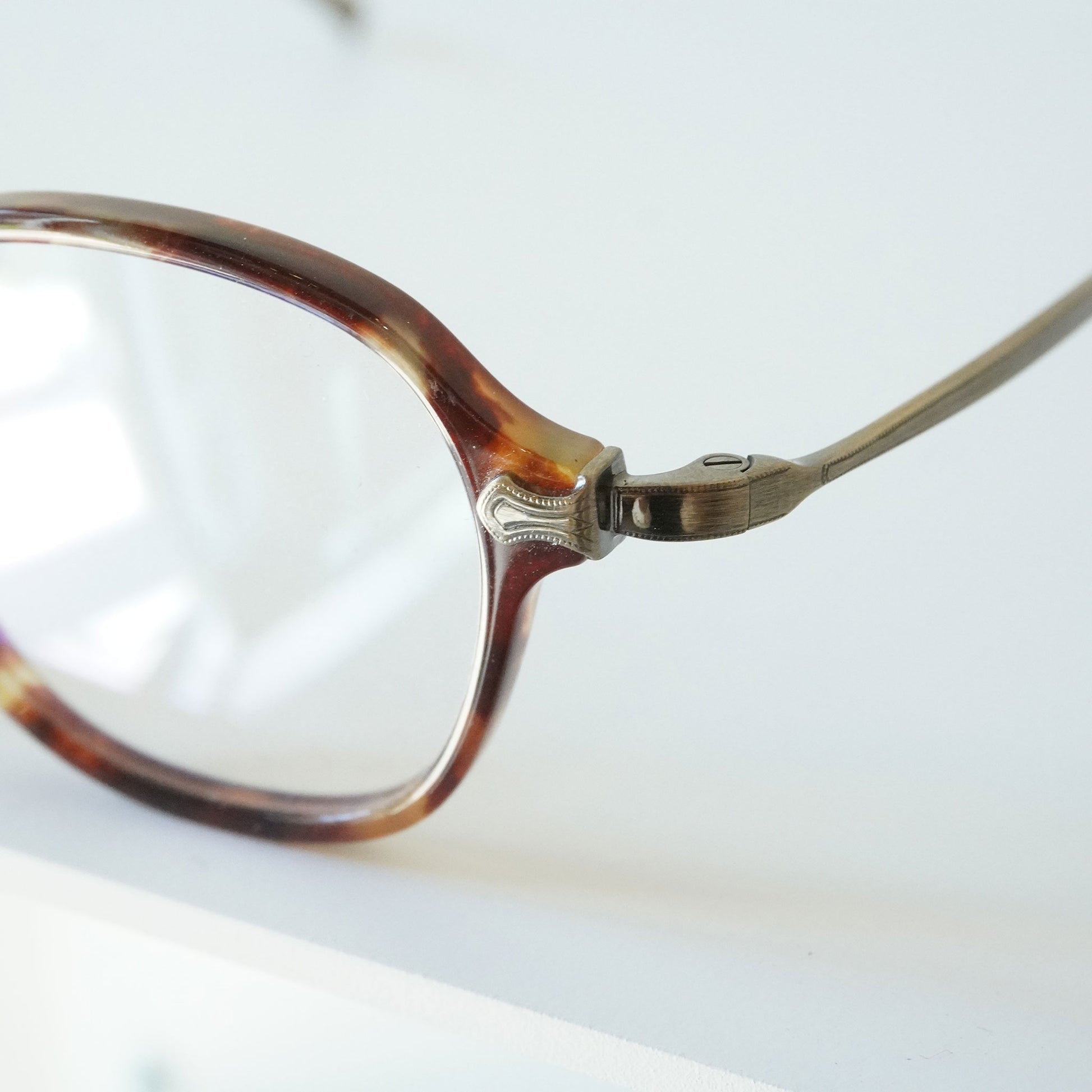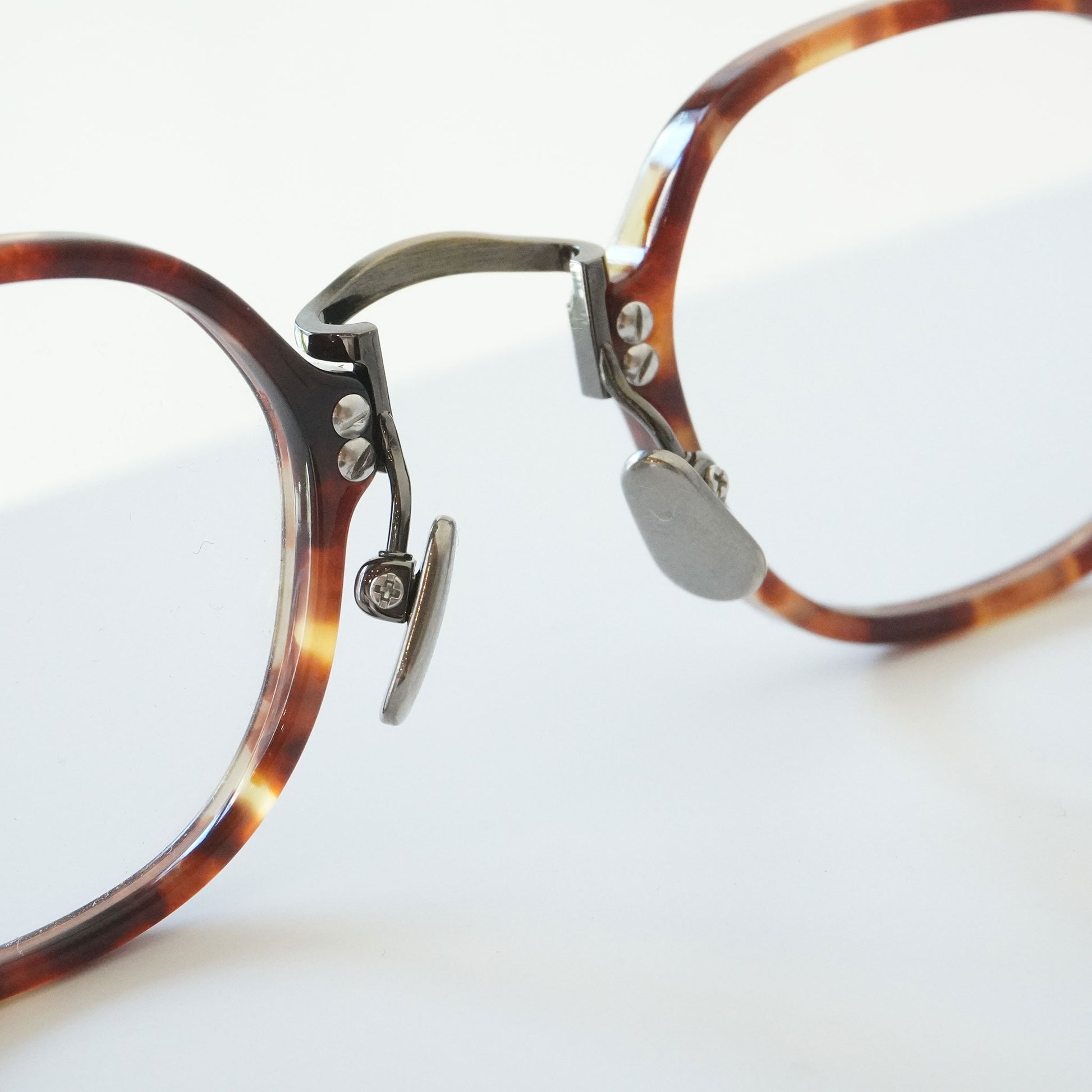 軽く掛け心地のいいコンビネーションフレーム、小さいサイズ感と四角いシェイプのバランスがいいモデルです。知的で控えめな雰囲気を持つ当店で人気のメガネ、お度数の強い方にもオススメです。