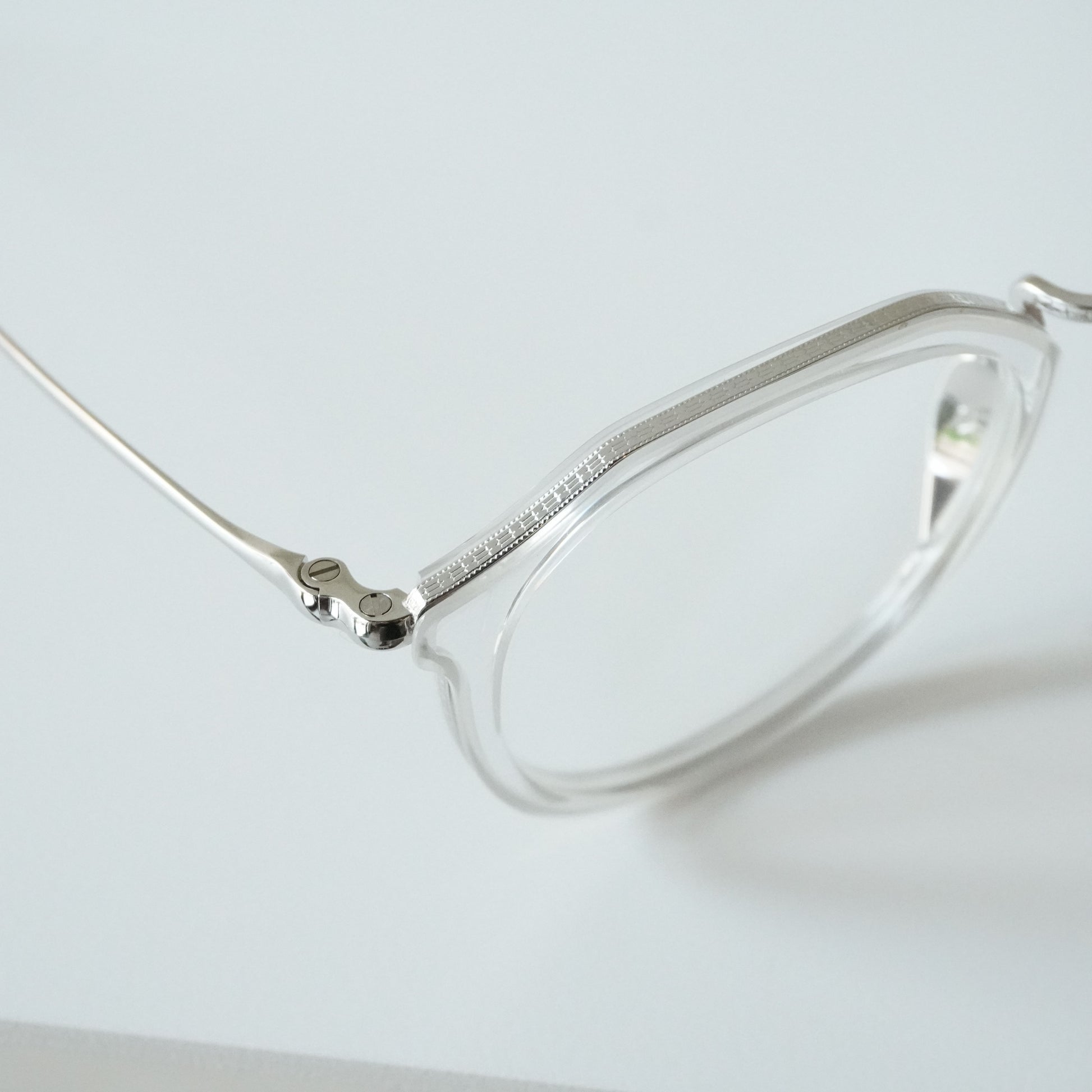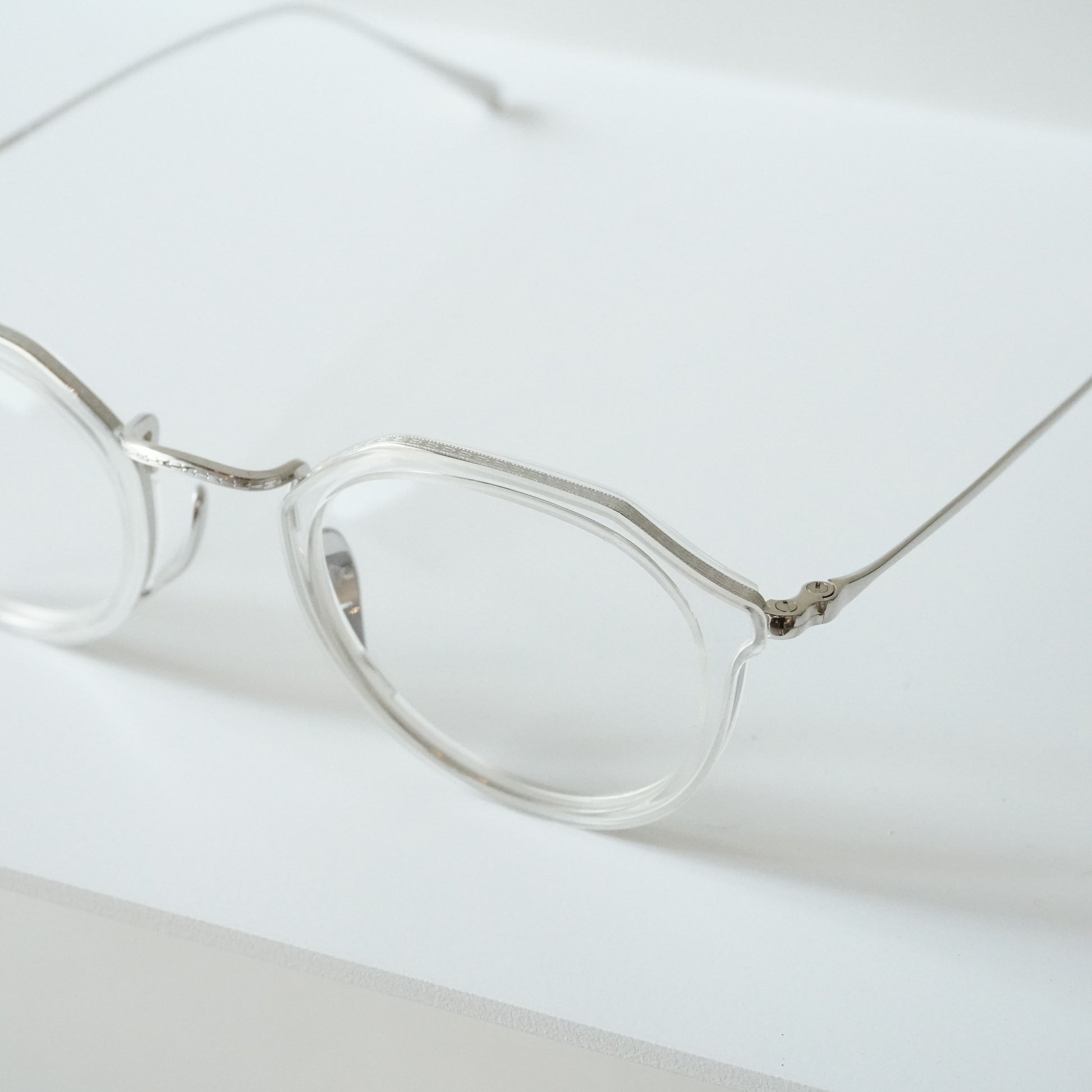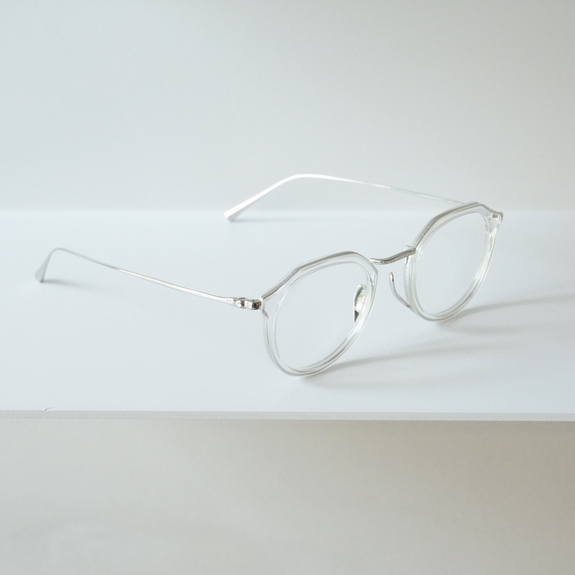 細身で掛けやすいクラウンパント型のメガネです。チタン×アセテートのコンビネーションは軽量で掛けやすく男女問わず人気があります。リム周りのチタンにはKameManNenのロゴが彫金され高級感のある仕上がりになっています。鼻パッドは下から伸び上がるシンプルで無駄のない美しい形状。幅広い方にフィットするミディアムなサイズ感です。クリアカラーは軽やかで洗練された雰囲気の出る人気カラーです。