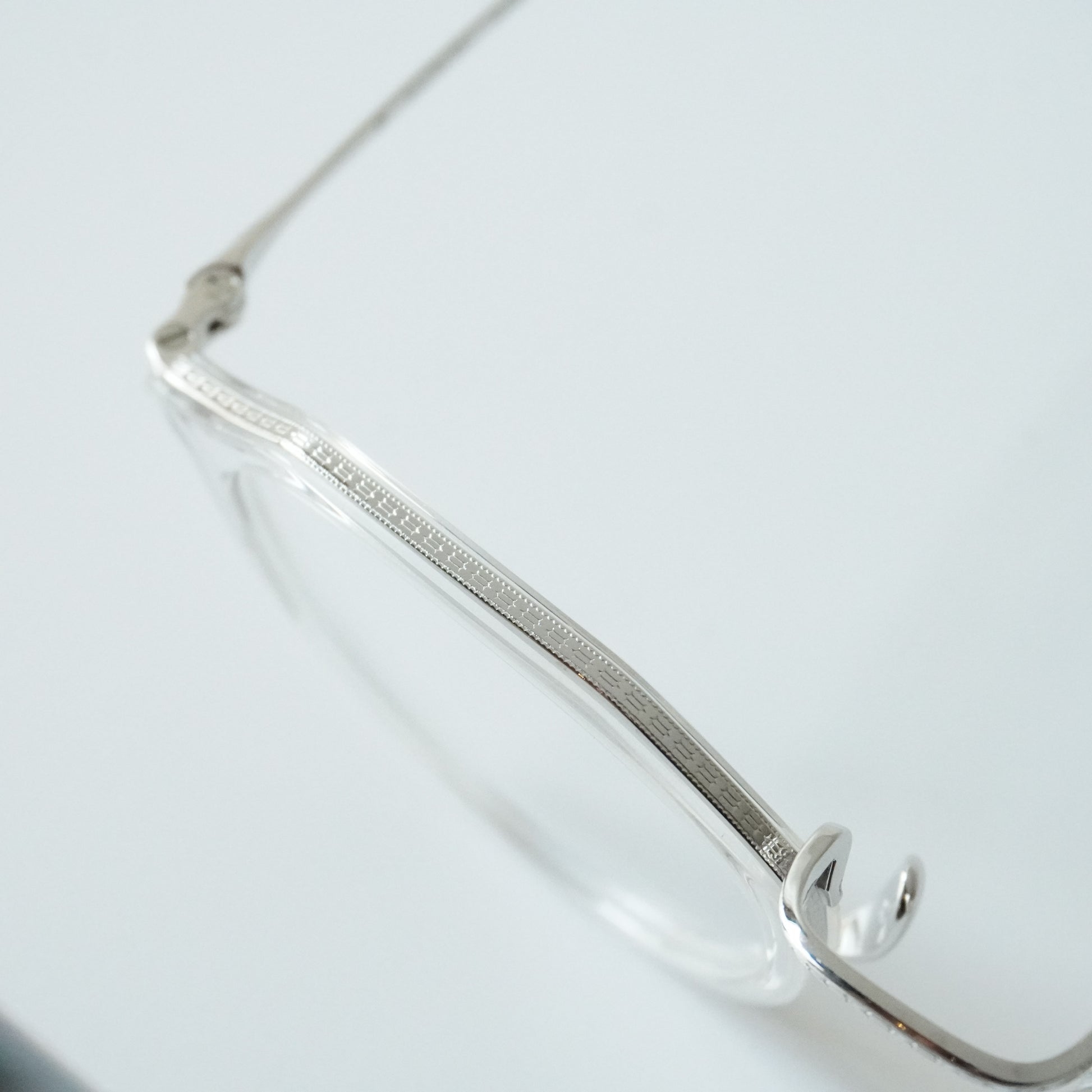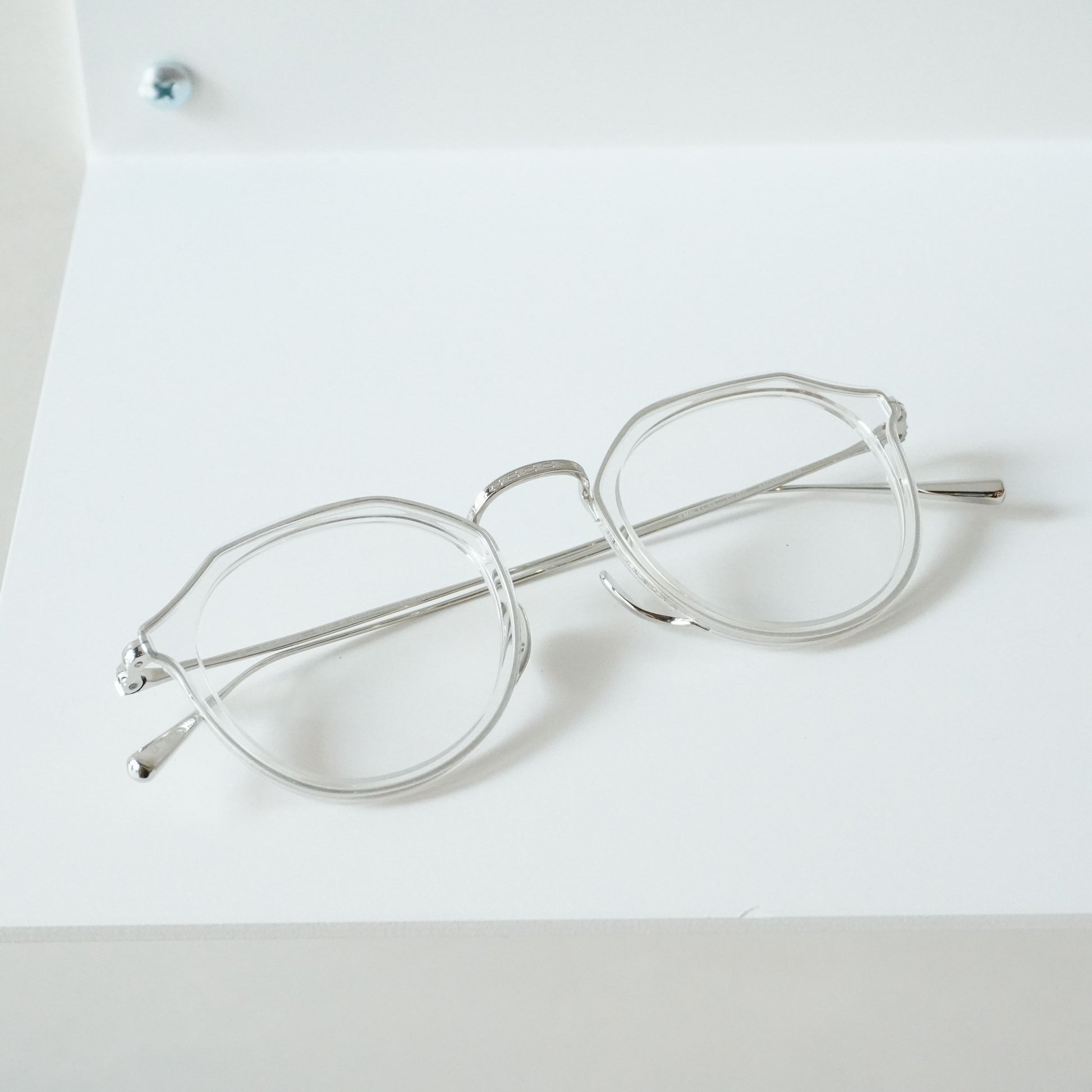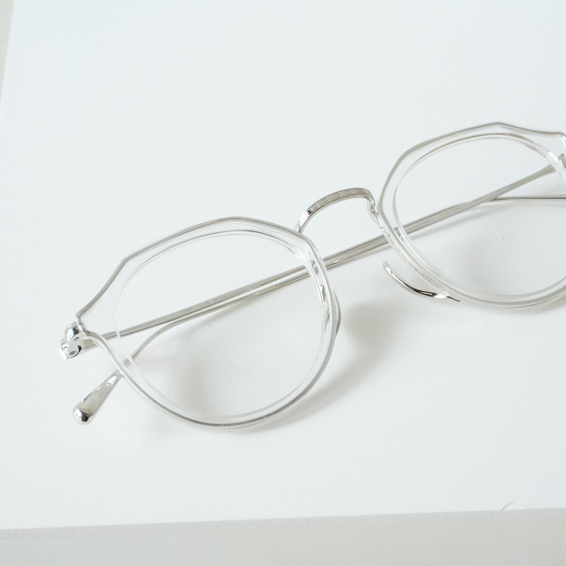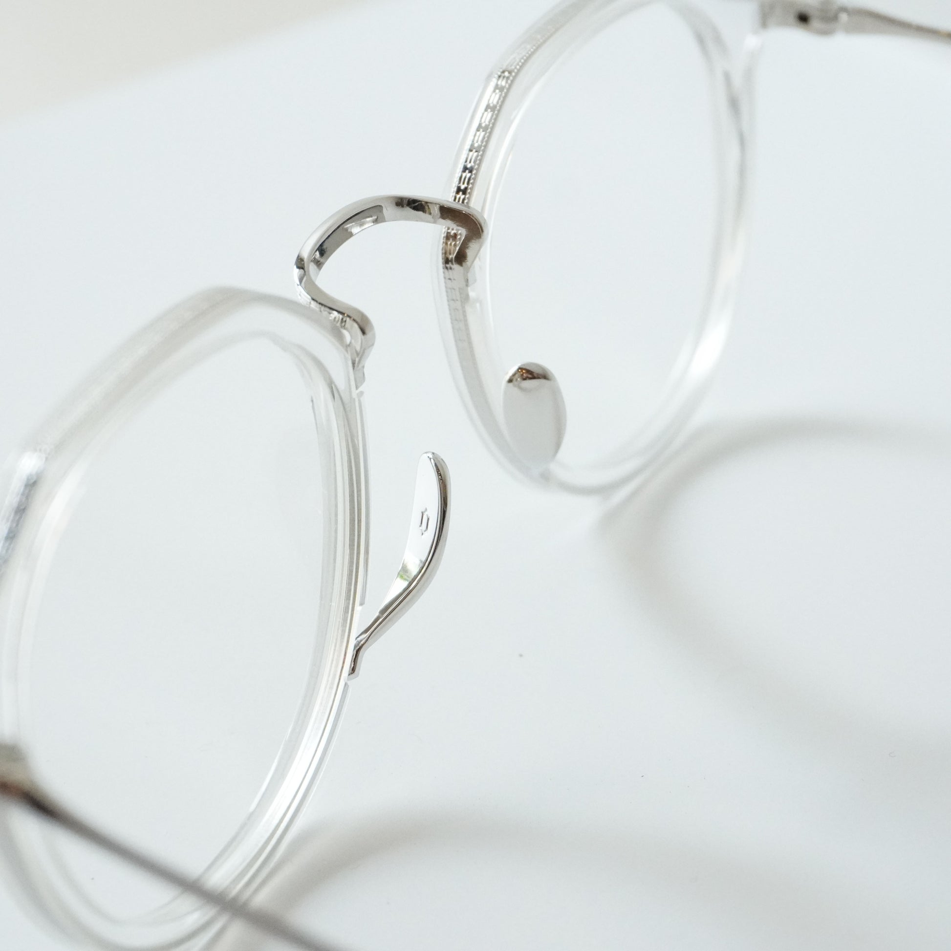 細身で掛けやすいクラウンパント型のメガネです。チタン×アセテートのコンビネーションは軽量で掛けやすく男女問わず人気があります。リム周りのチタンにはKameManNenのロゴが彫金され高級感のある仕上がりになっています。鼻パッドは下から伸び上がるシンプルで無駄のない美しい形状。幅広い方にフィットするミディアムなサイズ感です。クリアカラーは軽やかで洗練された雰囲気の出る人気カラーです。