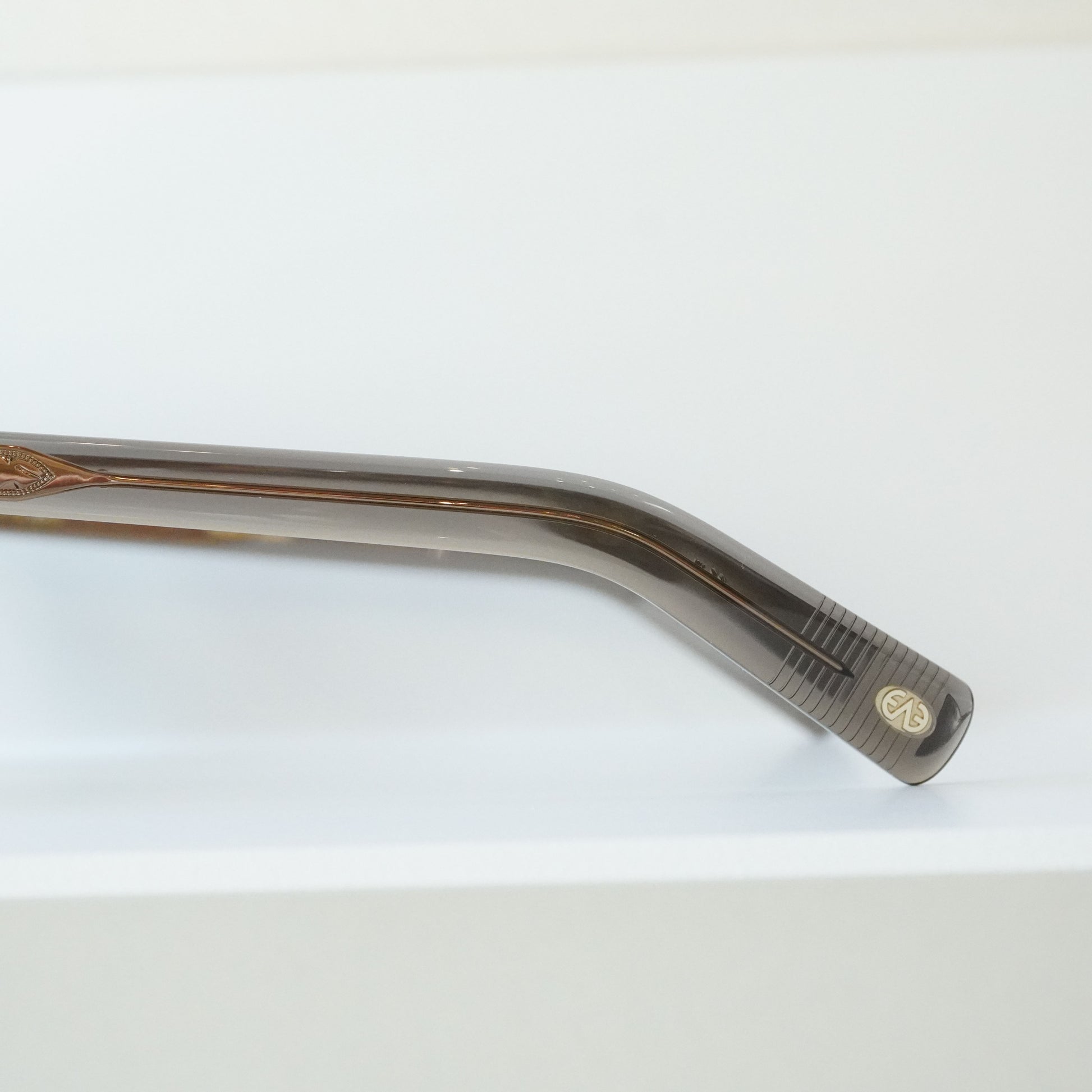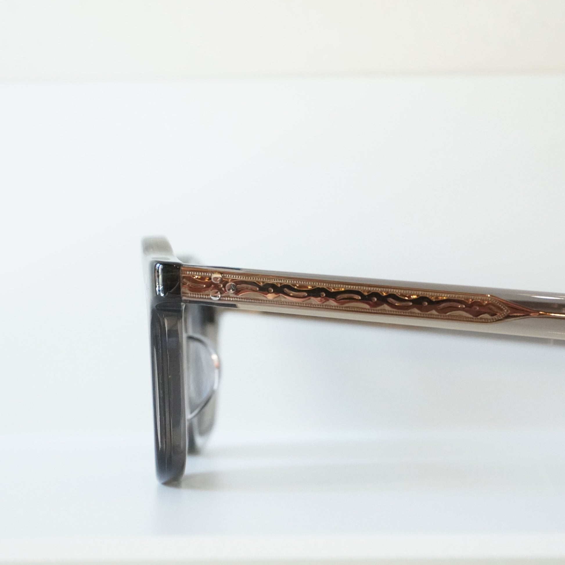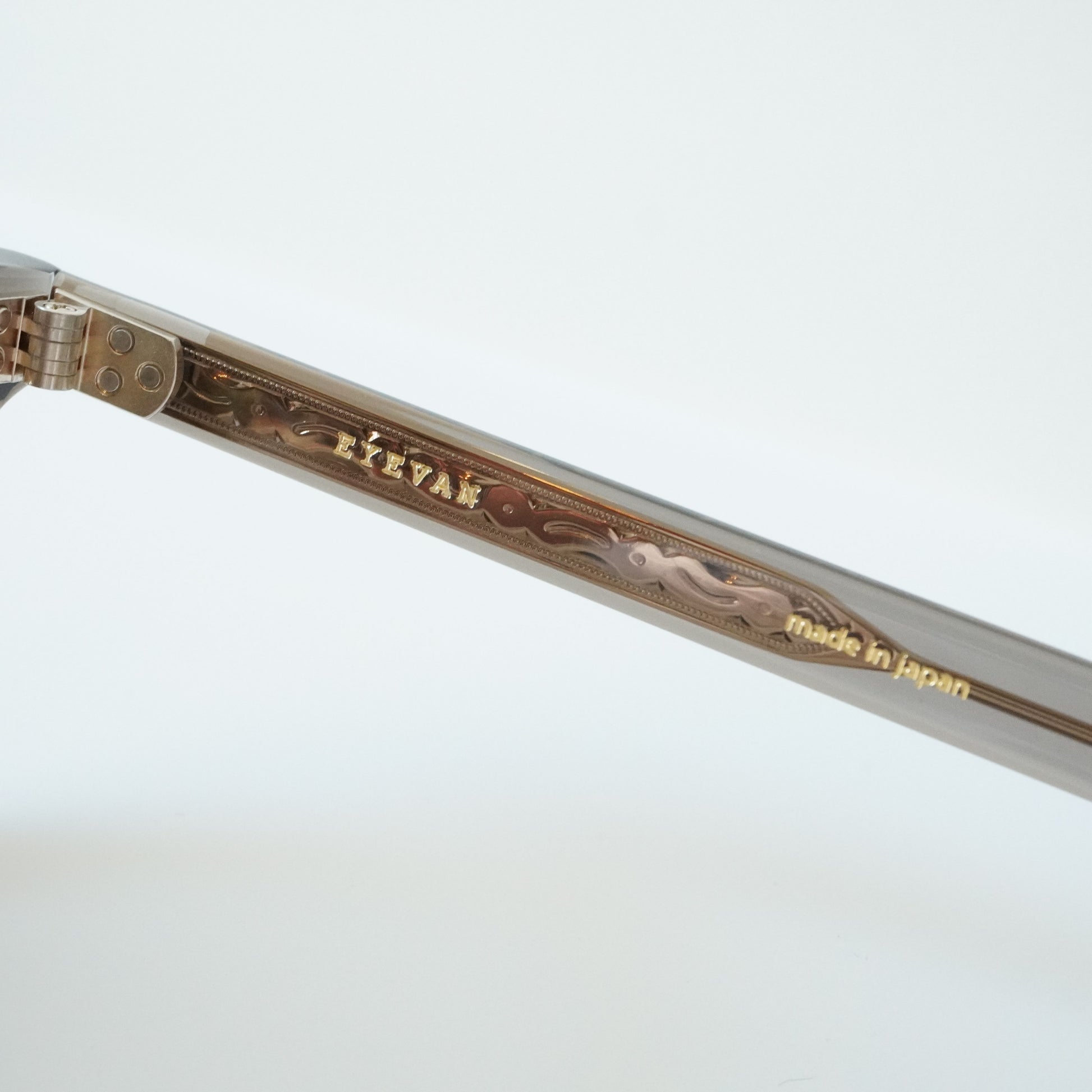 フレンチヴィンテージから着想を得た、エッヂのある肉厚なフロントと極太なワイドテンプルをEYEVAN流にデザインしたモデル。フロント、テンプル丁番には、工場に眠っていたヴィンテージのサンプルに使われていた三角形の台座の丁番をEYEVANオリジナルで再現。カシメPINには90年代に使われていた抜けを防止する補強パーツを使用。シンプルながら細部にもこだわった。