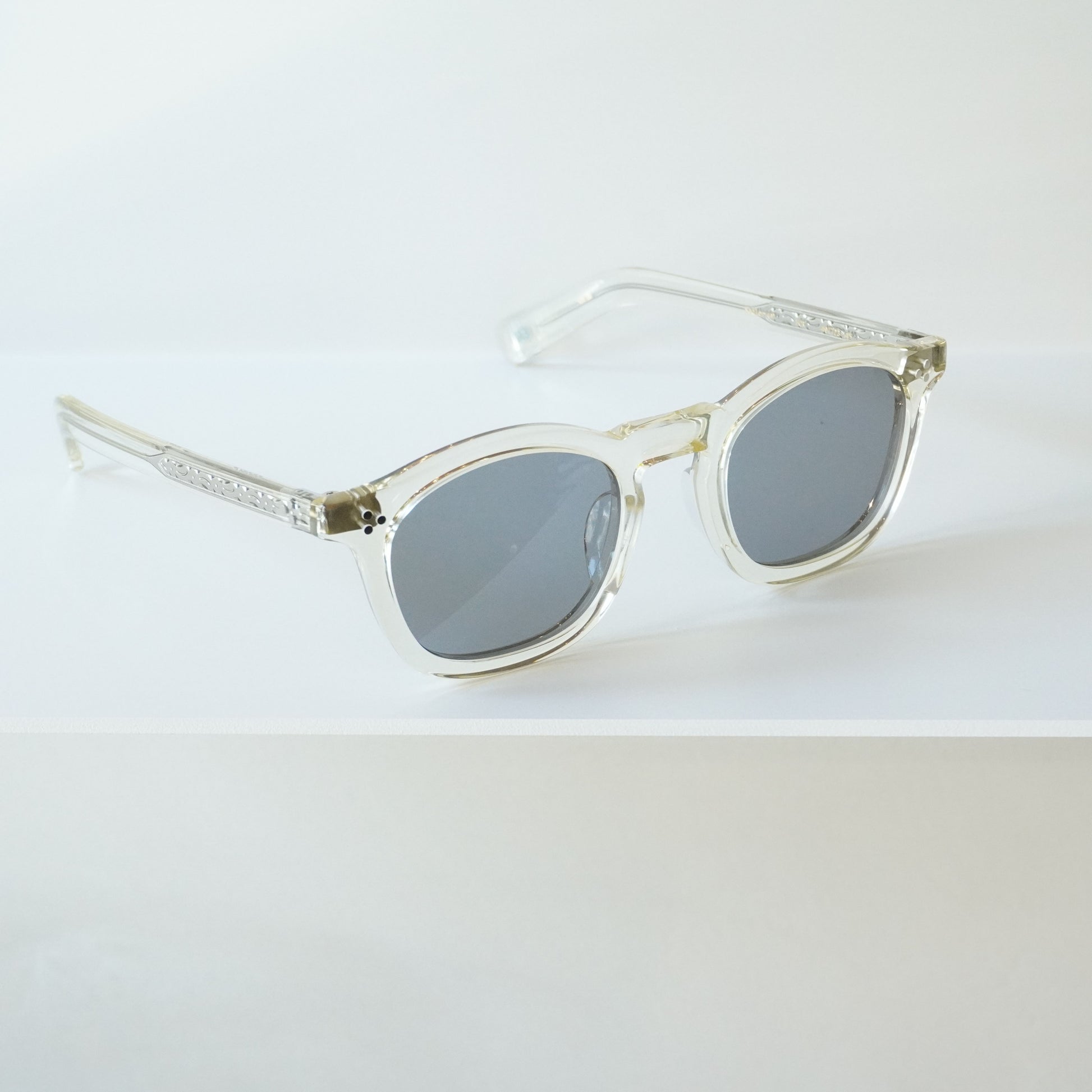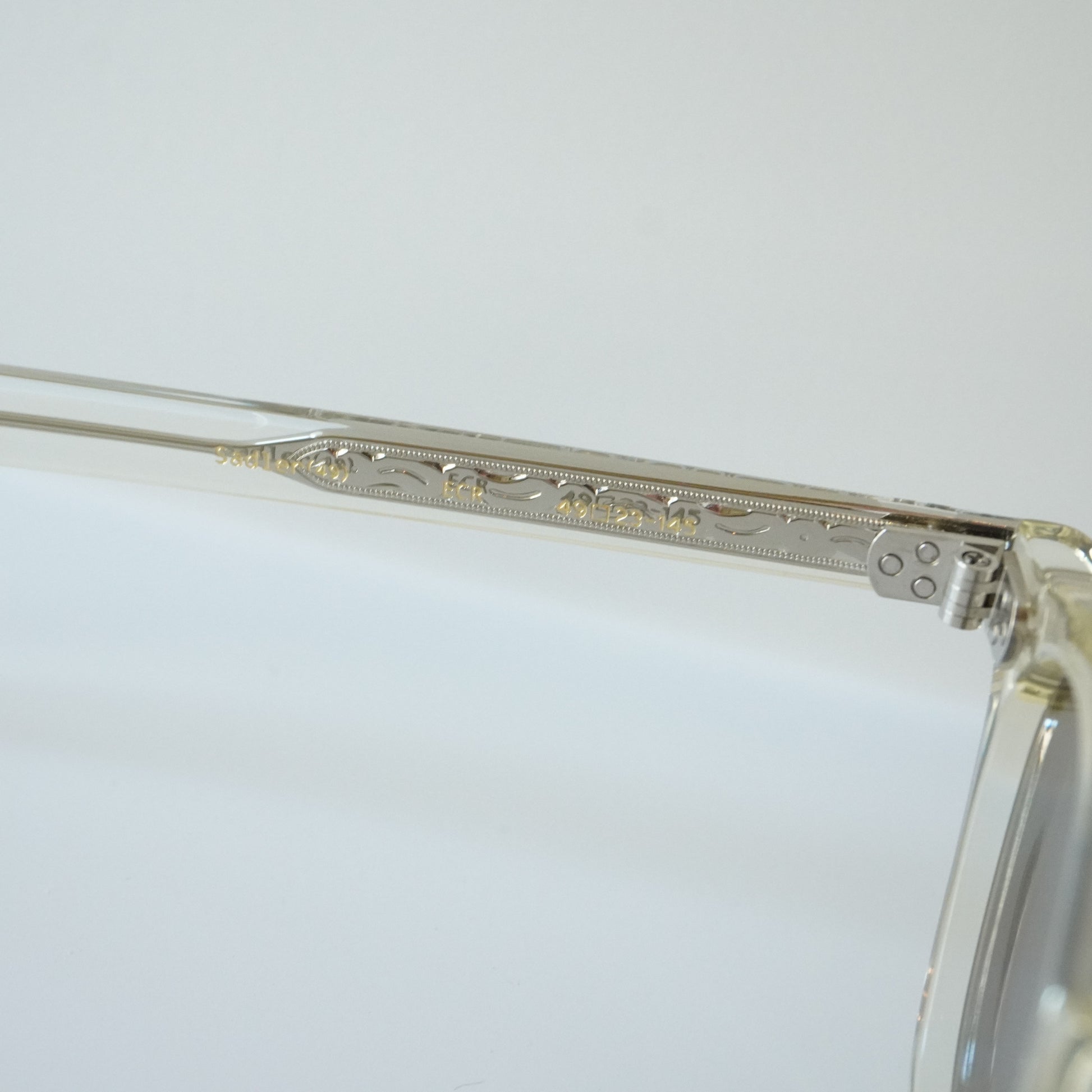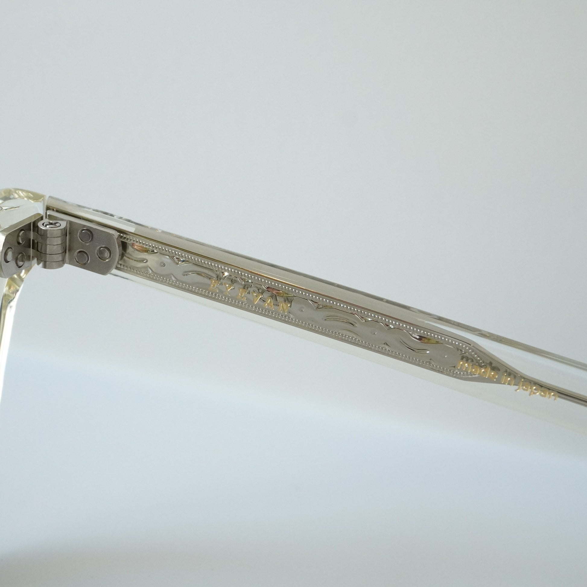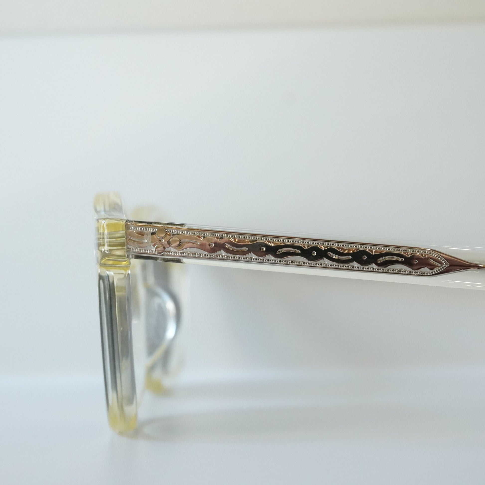 フレンチヴィンテージから着想を得た、エッヂのある肉厚なフロントと極太なワイドテンプルをEYEVAN流にデザインしたモデル。フロント、テンプル丁番には、工場に眠っていたヴィンテージのサンプルに使われていた三角形の台座の丁番をEYEVANオリジナルで再現。カシメPINには90年代に使われていた抜けを防止する補強パーツを使用。シンプルながら細部にもこだわった。