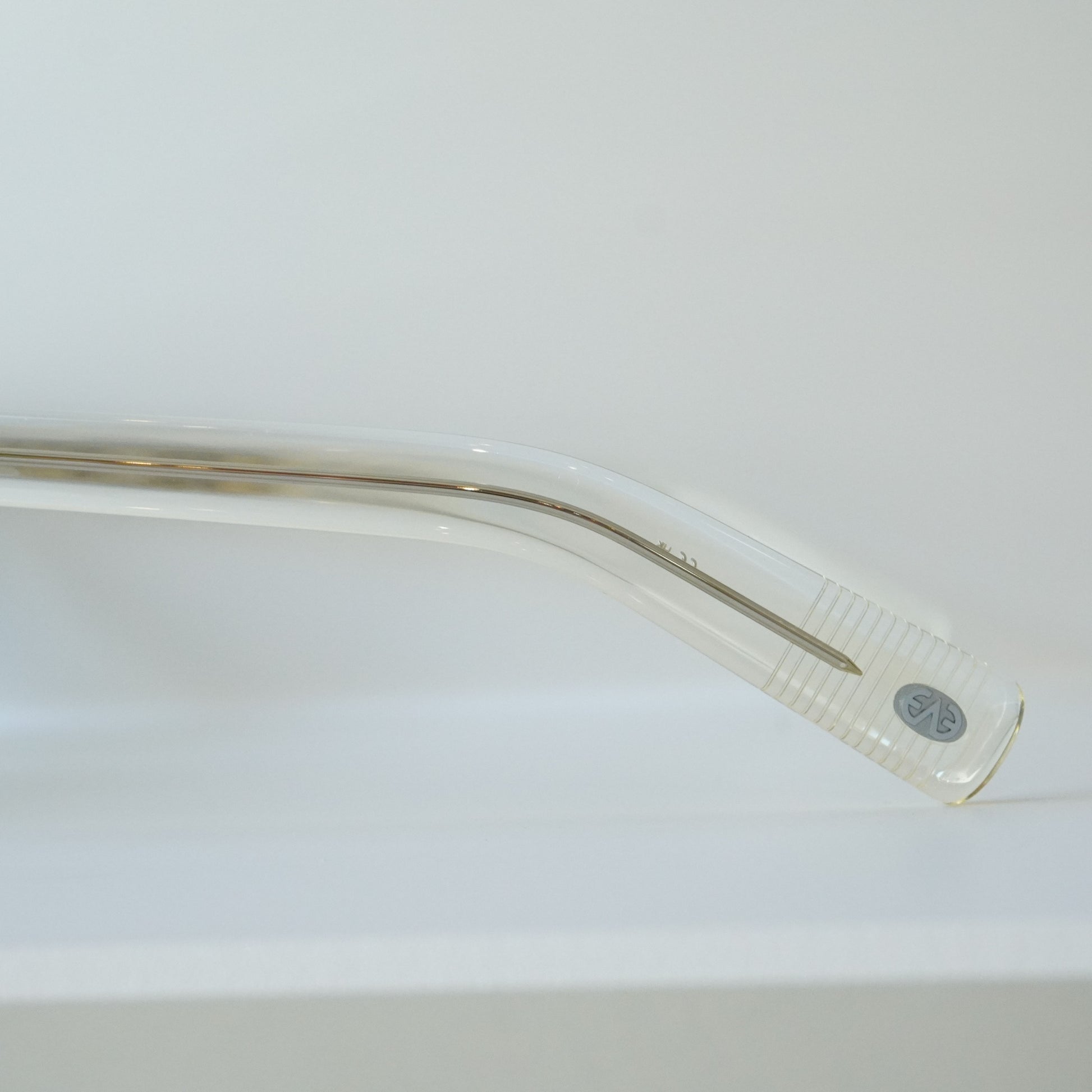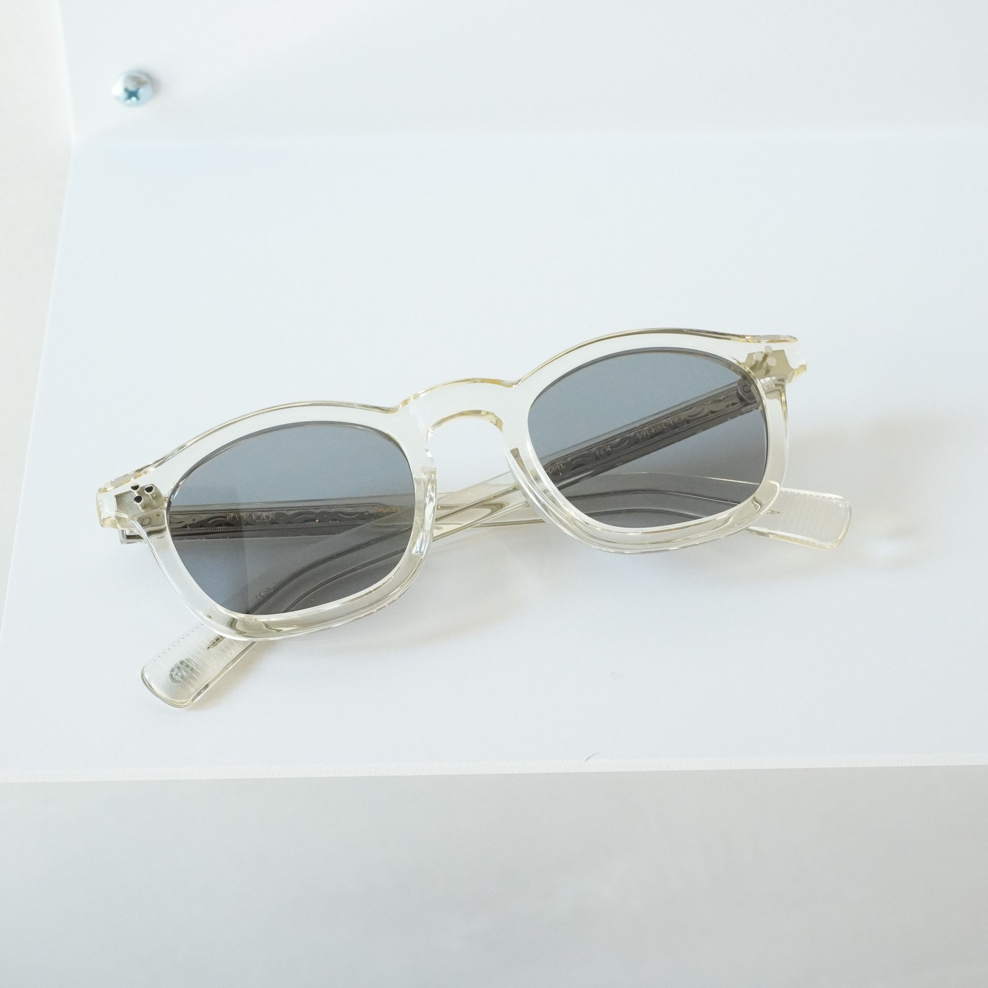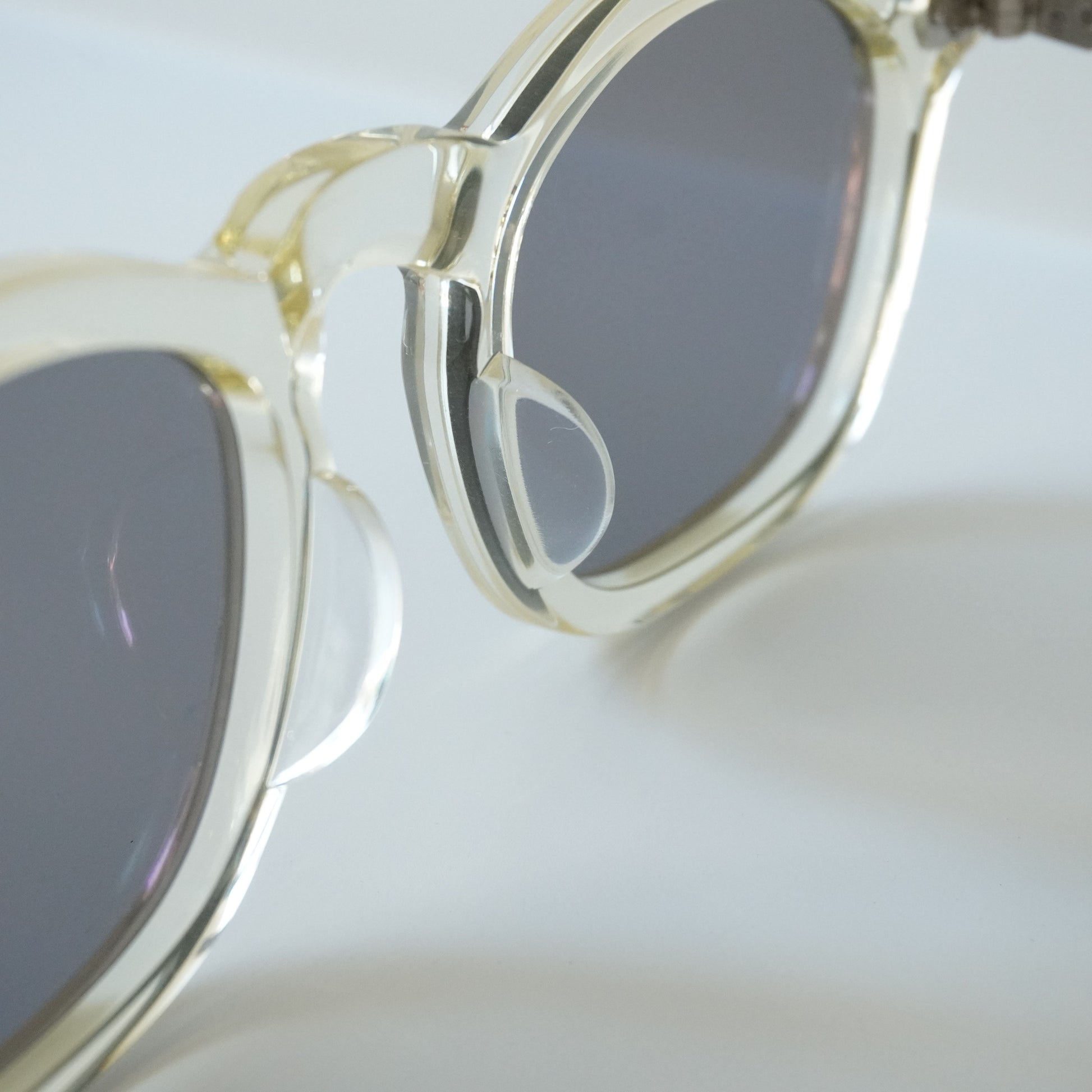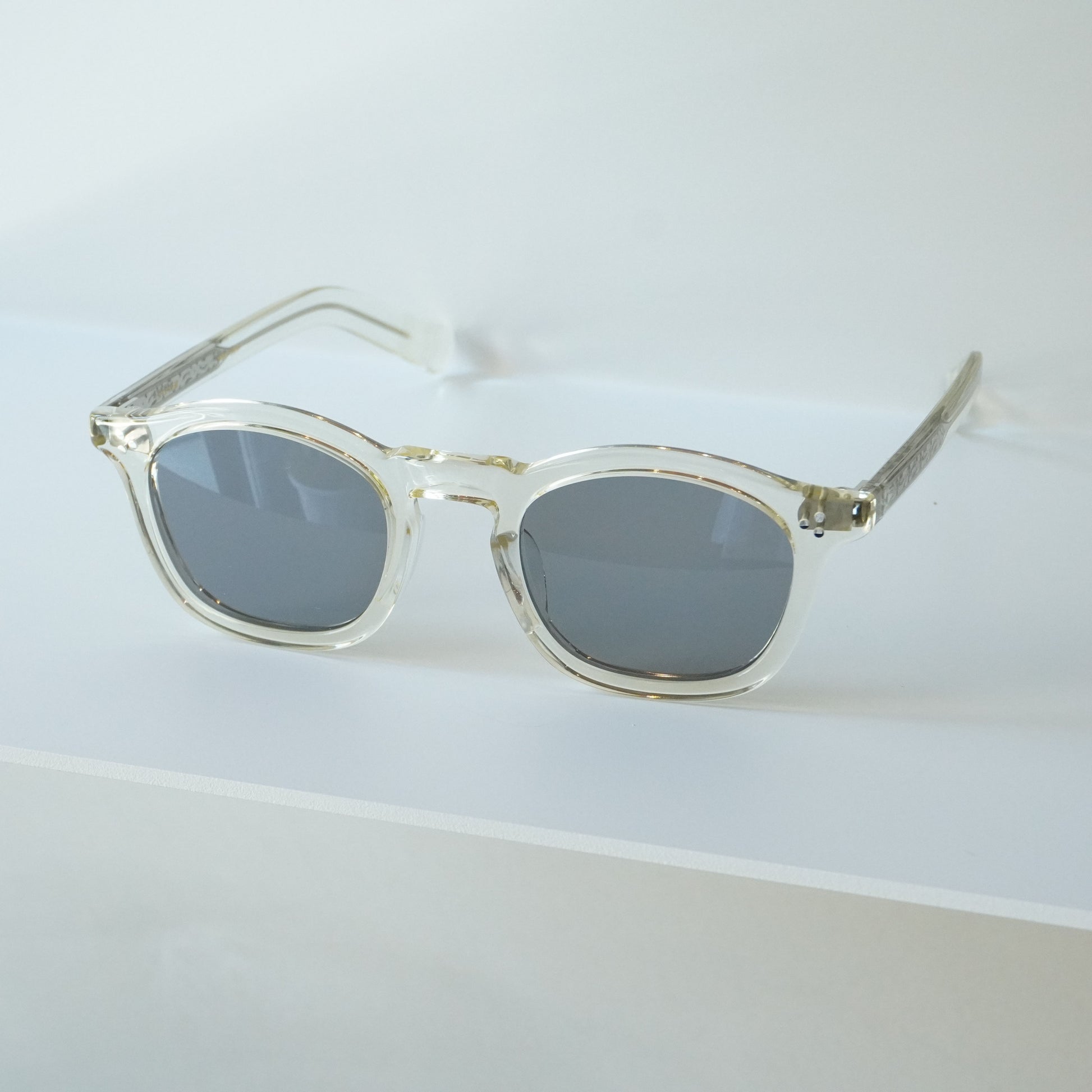 フレンチヴィンテージから着想を得た、エッヂのある肉厚なフロントと極太なワイドテンプルをEYEVAN流にデザインしたモデル。フロント、テンプル丁番には、工場に眠っていたヴィンテージのサンプルに使われていた三角形の台座の丁番をEYEVANオリジナルで再現。カシメPINには90年代に使われていた抜けを防止する補強パーツを使用。シンプルながら細部にもこだわった。