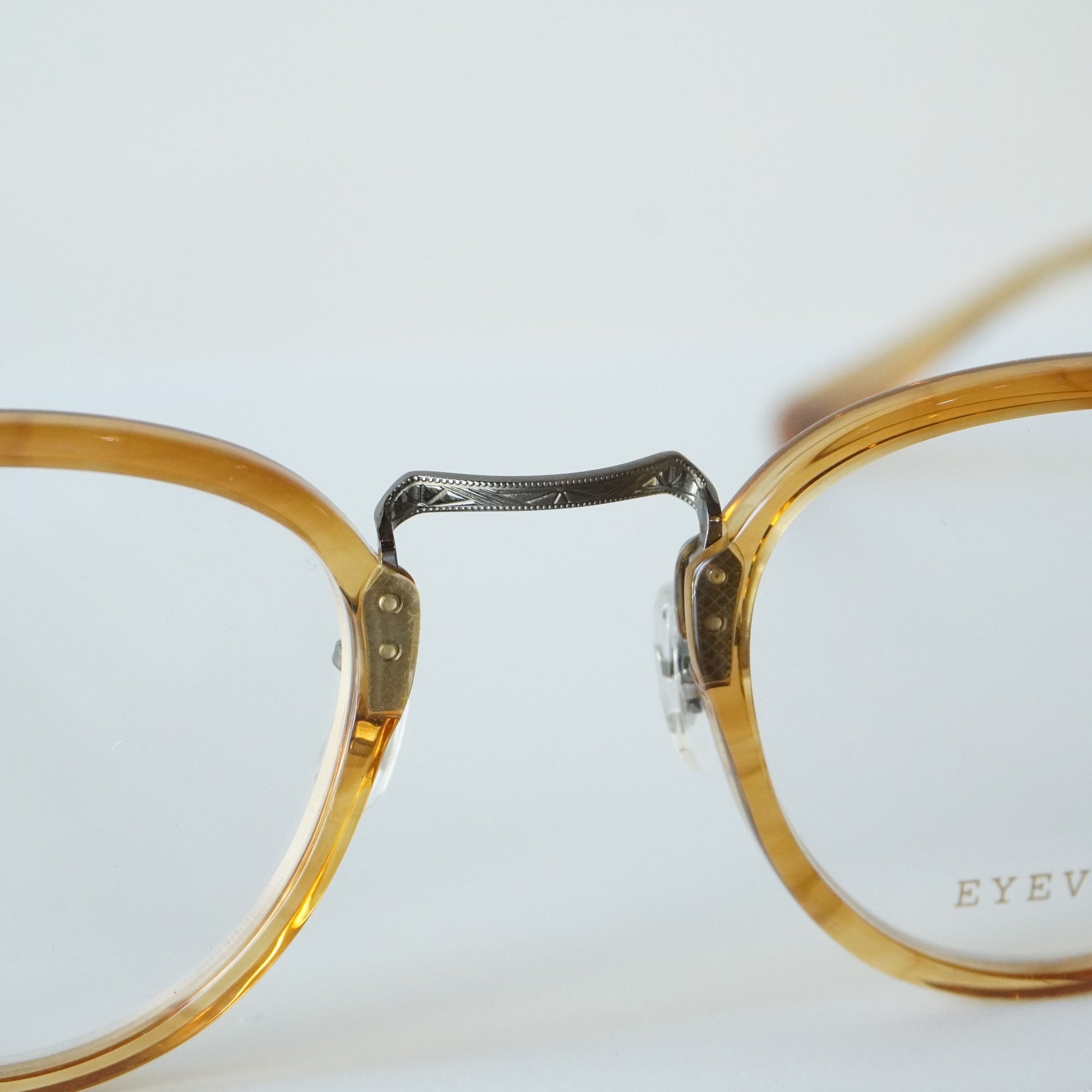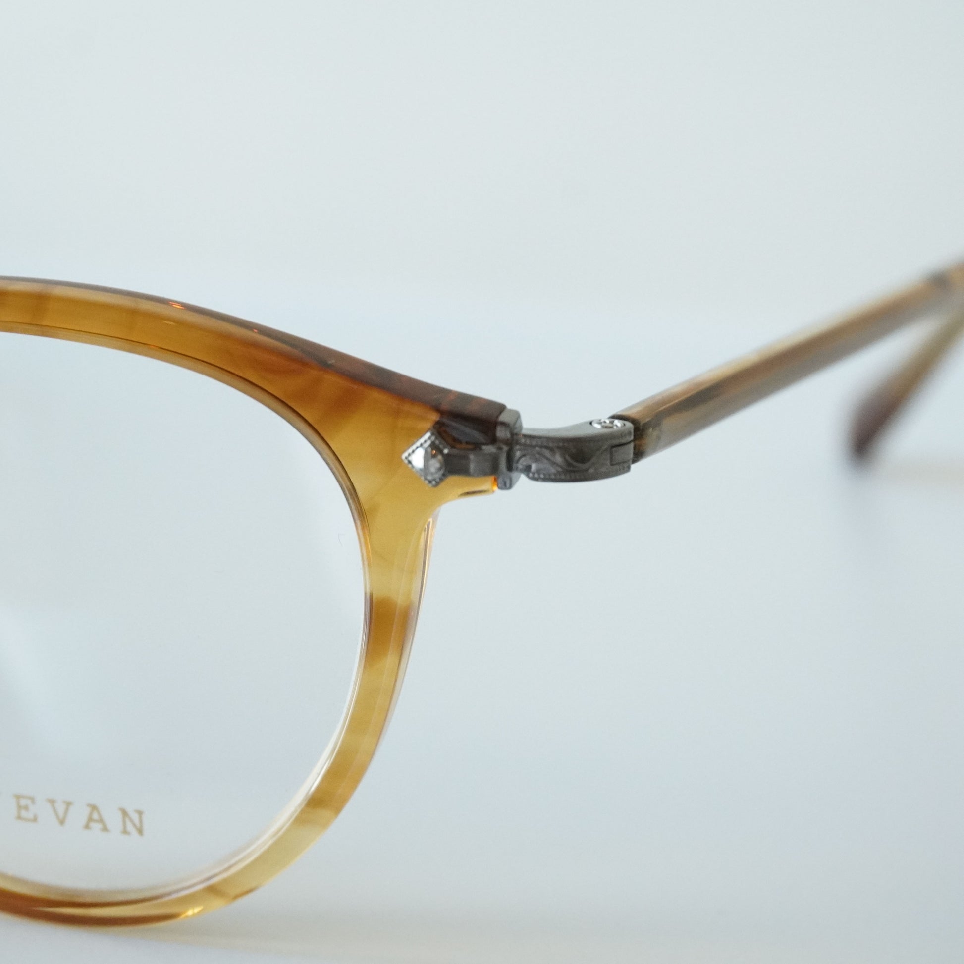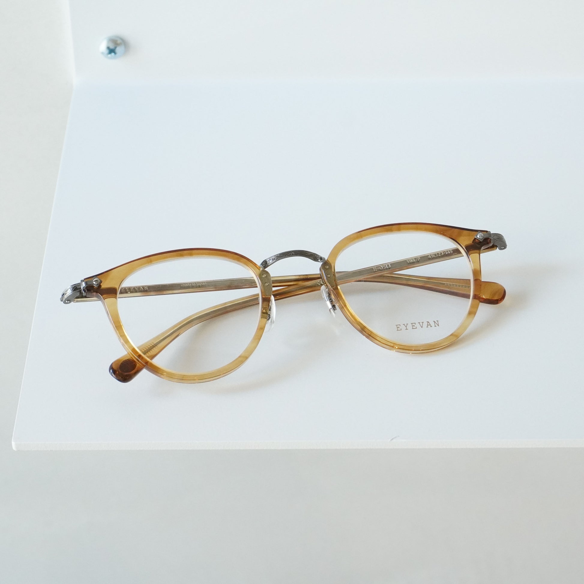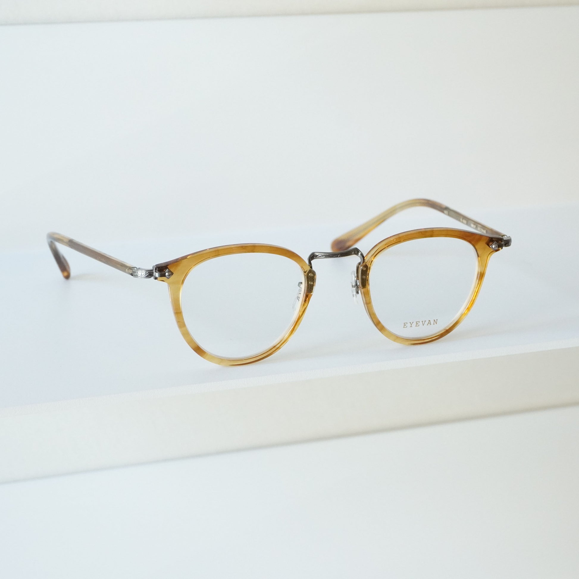 EYEVANのアイコンとなったE-500番台シリーズのE-0511につづくコンビネーションフレーム。ブリッジにはクリングス一体型のアーチバックブリッジ、テンプルは芯にβチタンを用いることによりかけ心地にも配慮した長モダンタイプ。フロントは、30年代のアメリカンヴィンテージの上リムがややフラットなパントシェイプをEYEVANらしいデザインに仕上げた。