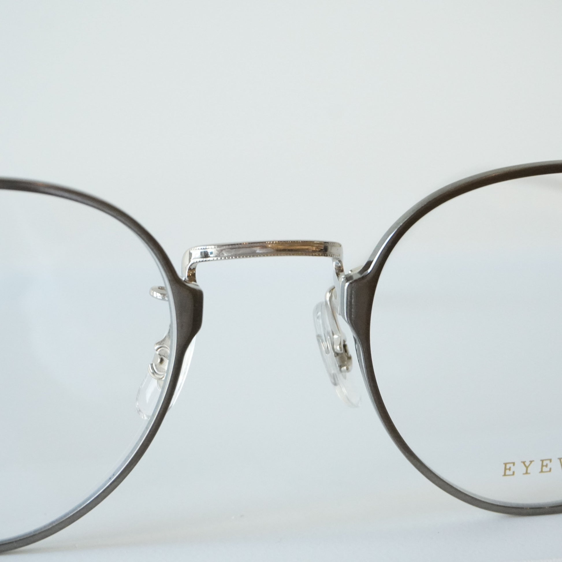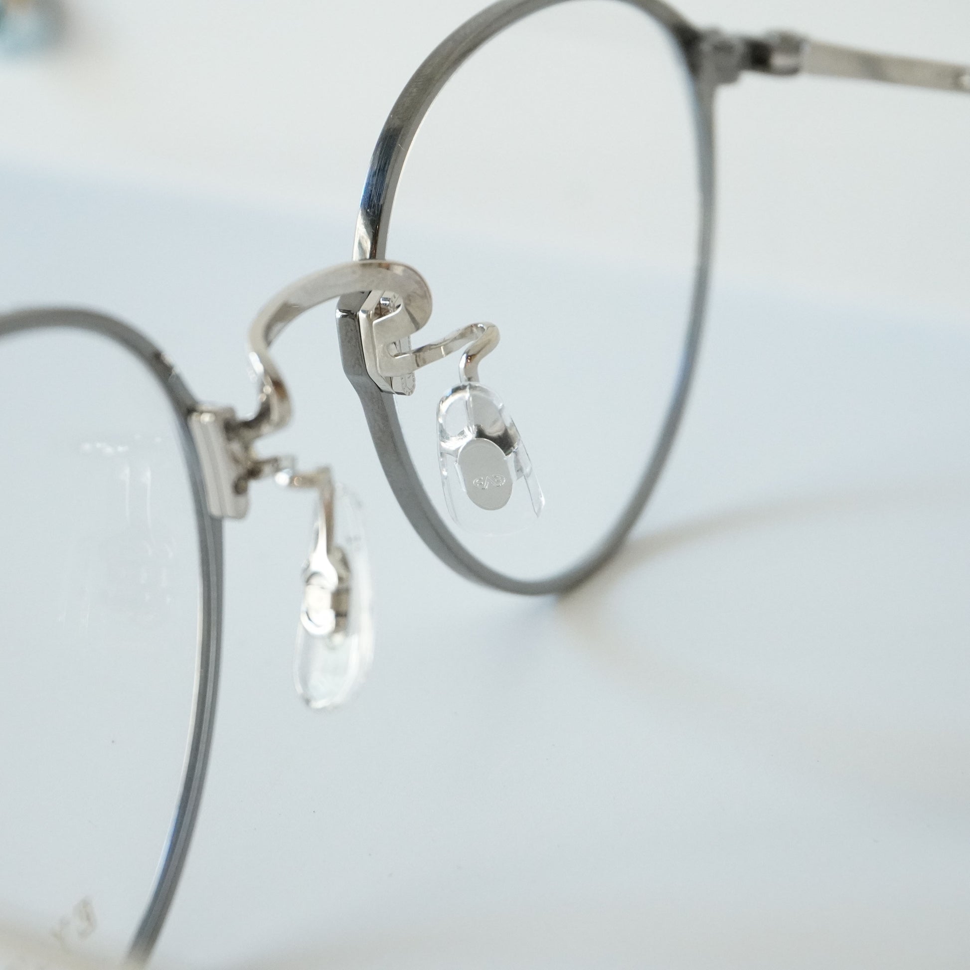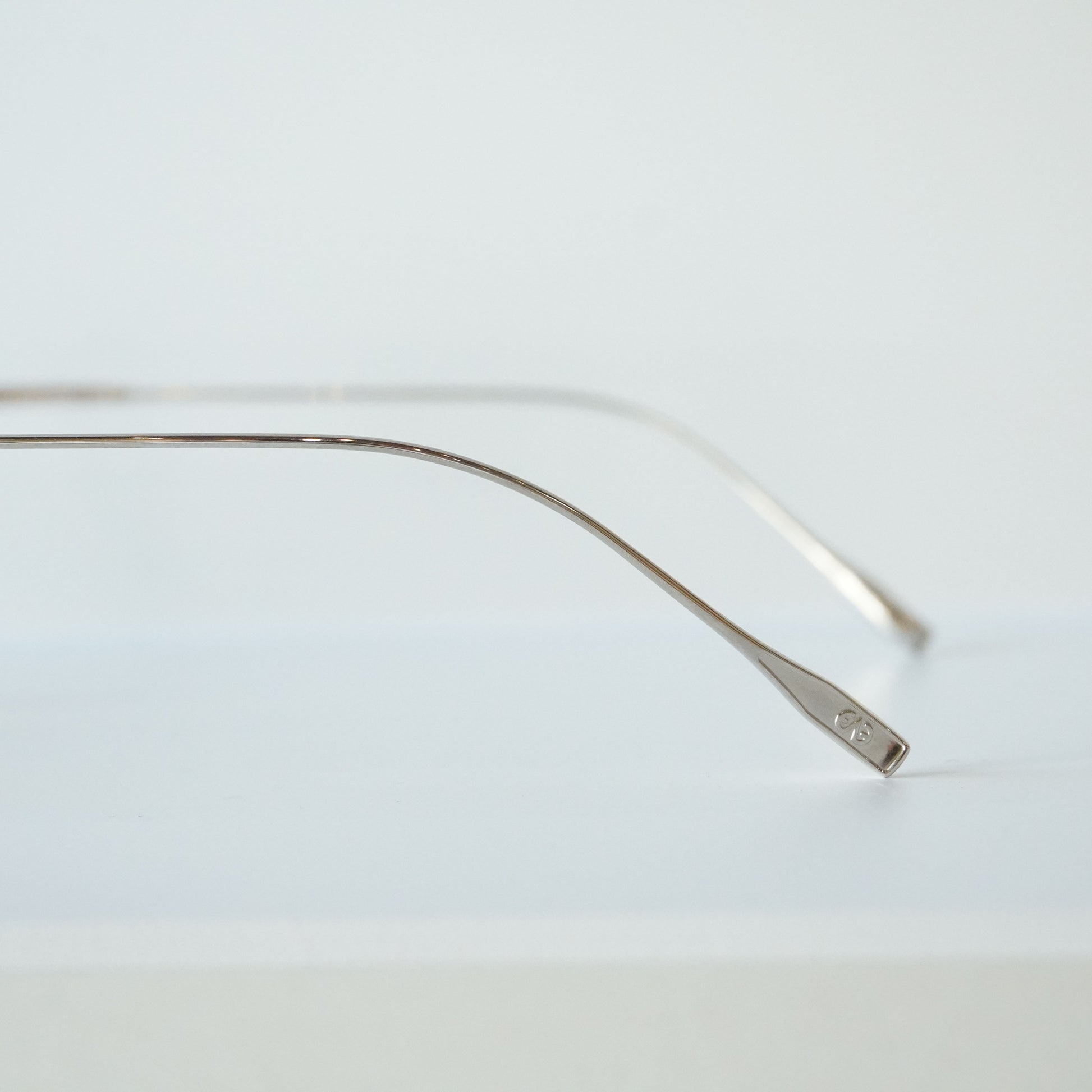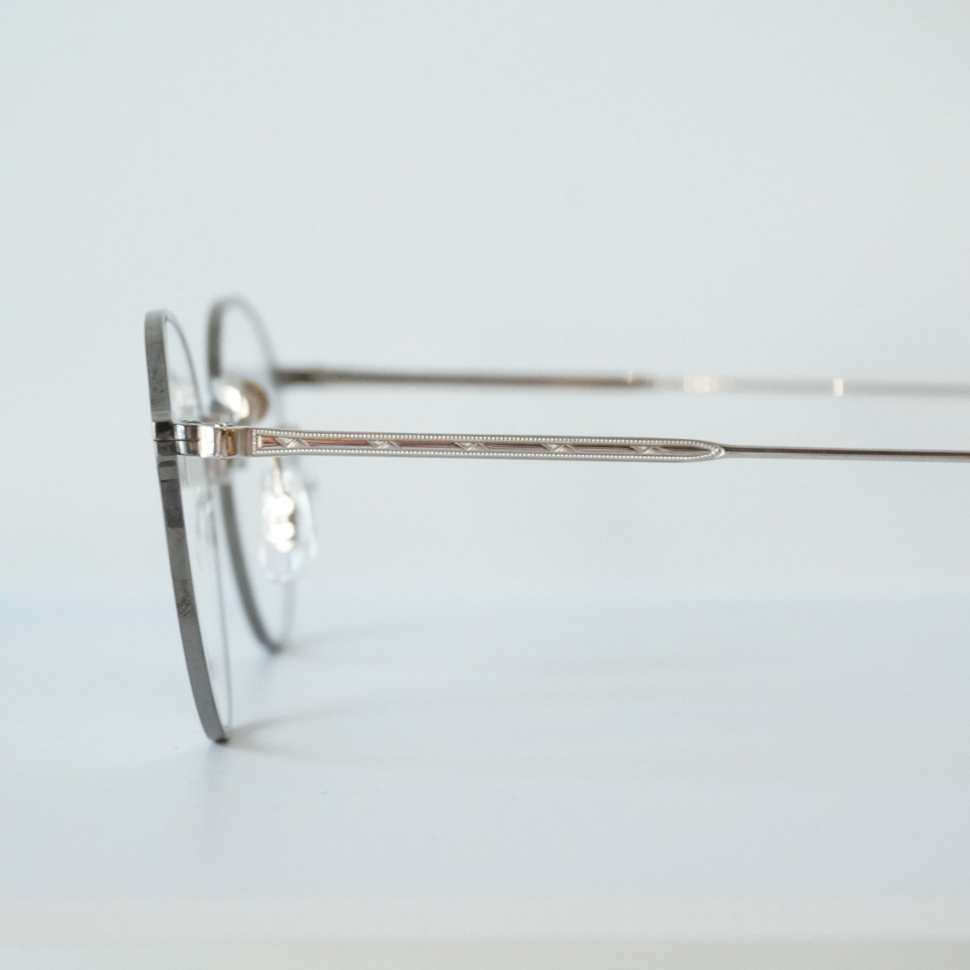 チタンシートのリムに、ヴィンテージ家具のパーツから着想を得たヨロイとブリッジをかしめたメタルフレーム。重量バランスとかけ心地にこだわったしのみにモダンな柄を組み合わせた新しいβチタンテンプルを採用。マンレイブリッジは今までにはない片側のみでかしめるという技法で、更に飾りパーツをかぶせて裏側まで装飾するという新しいスタイル。