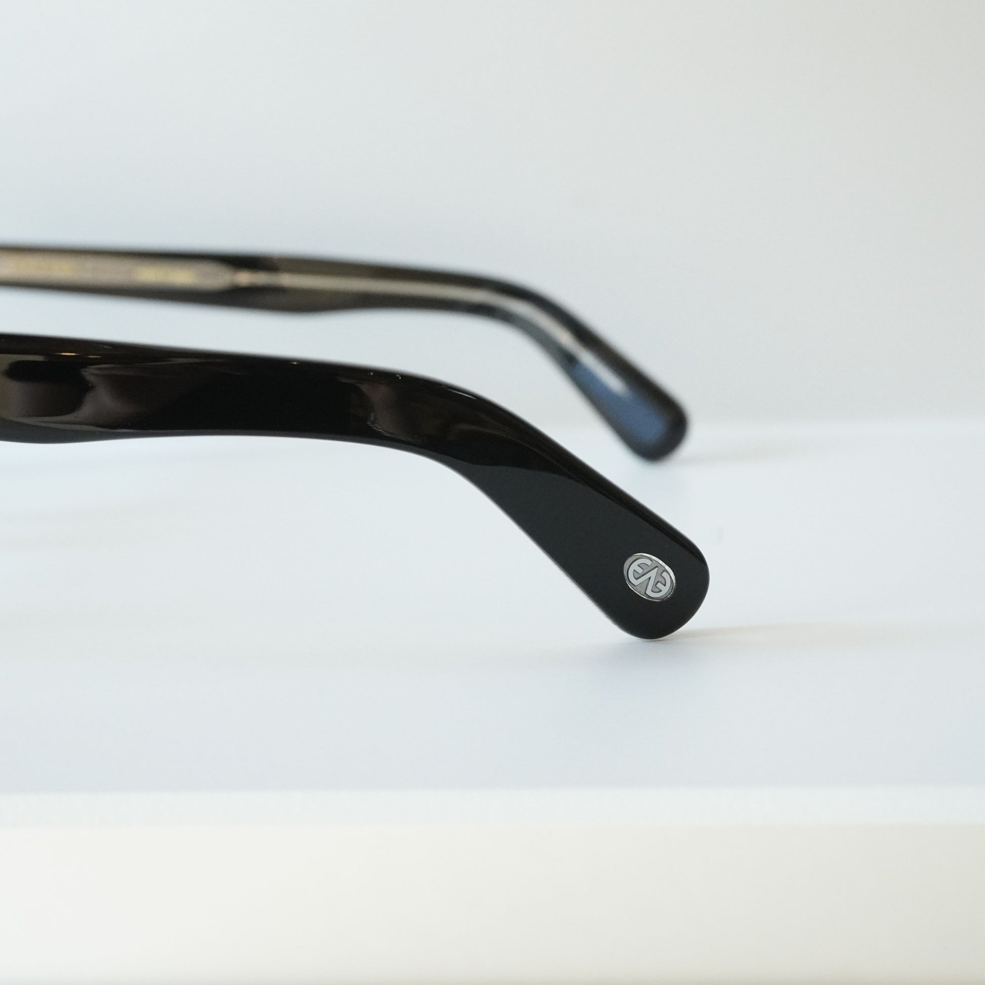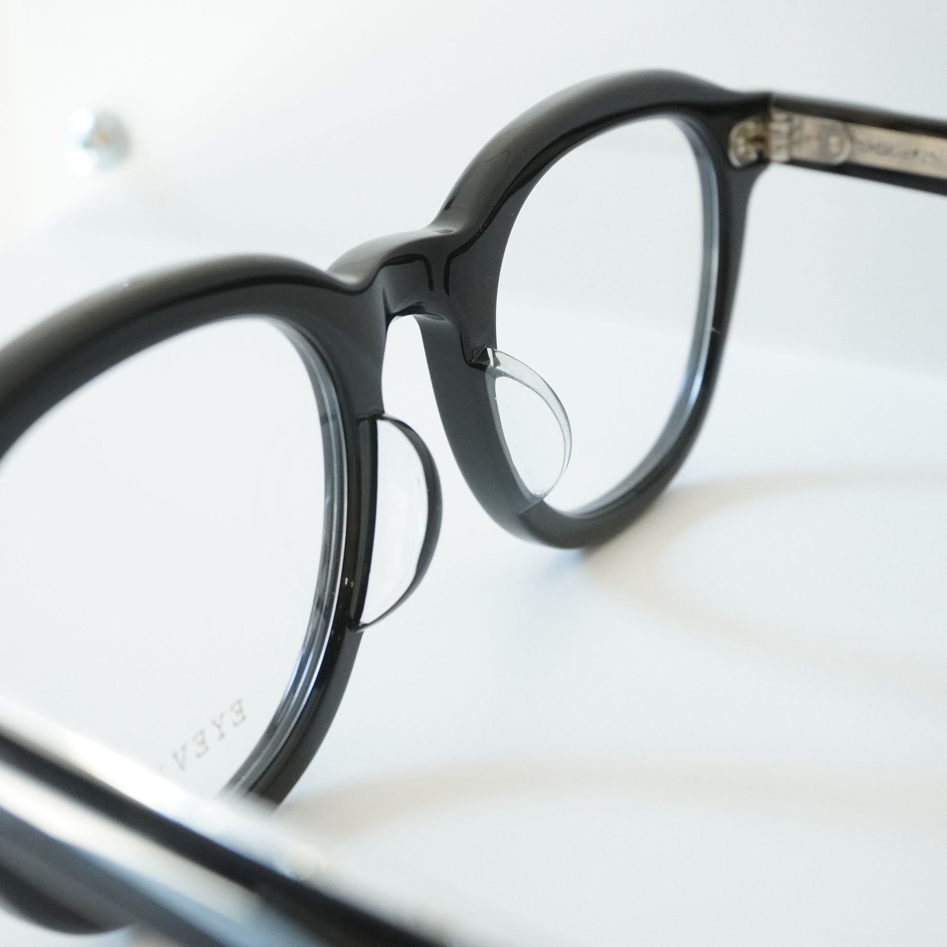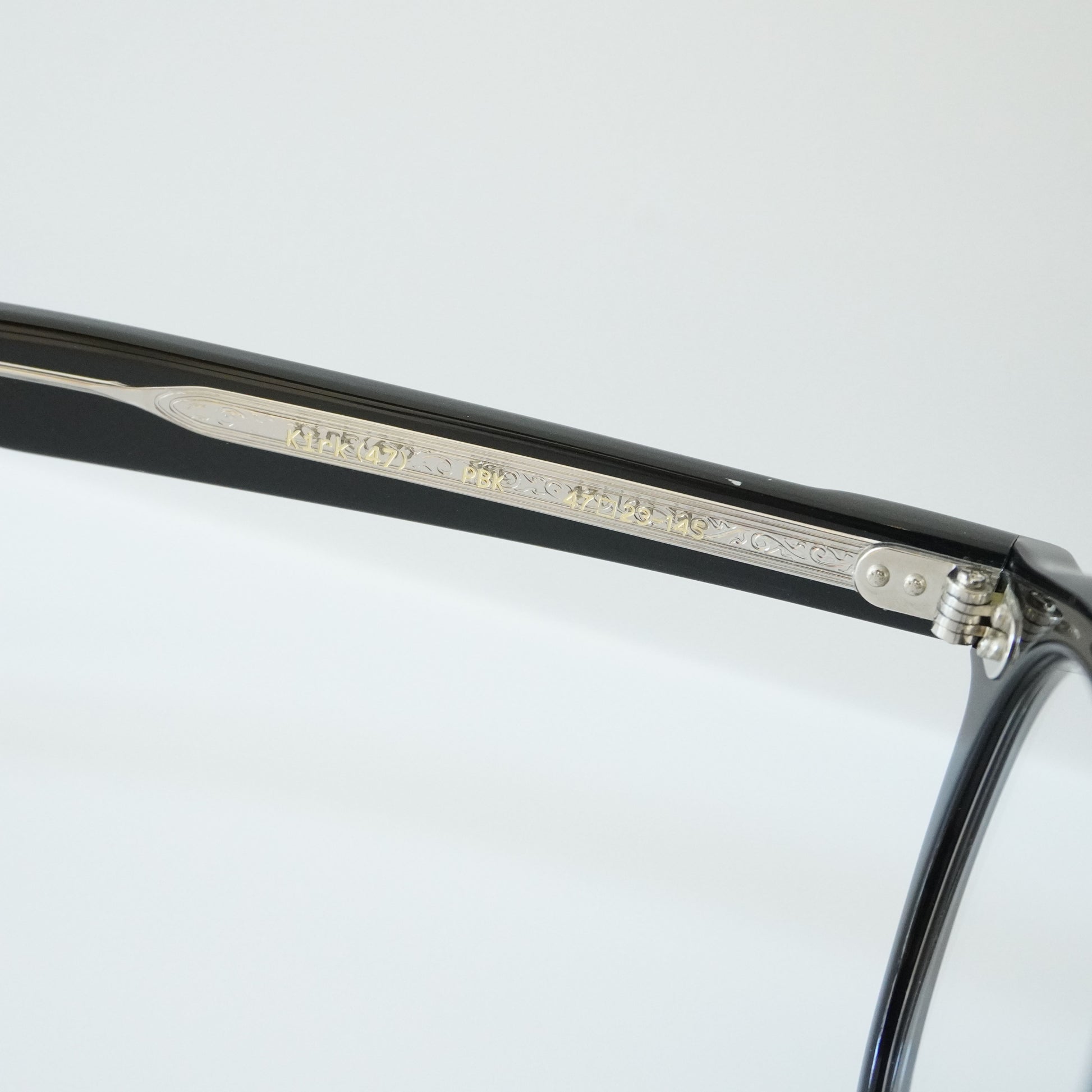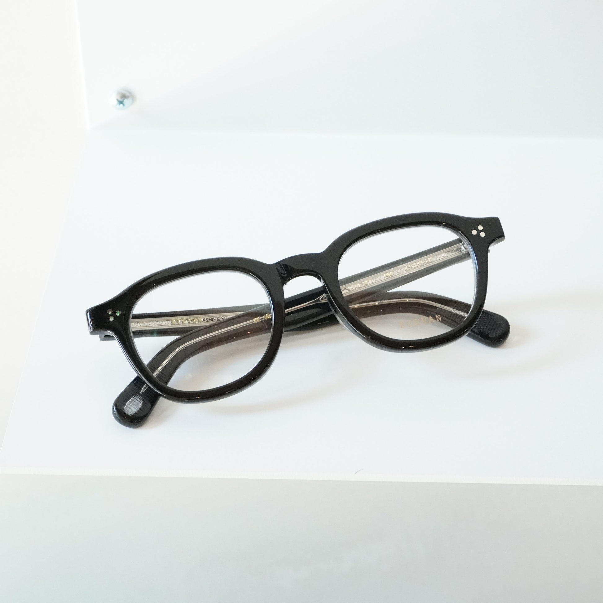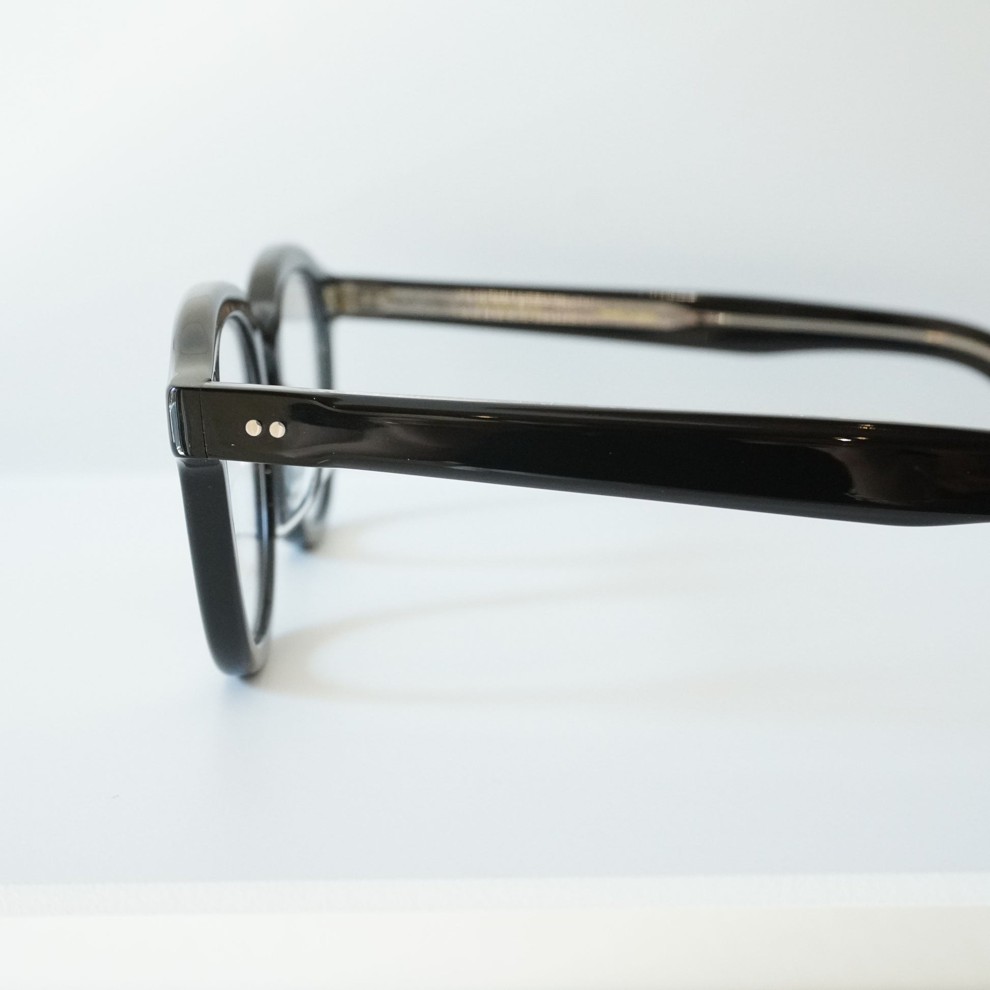正面はやや厚みのあるウェリントンフロント、1950年代の希少なフレンチヴィンテージに見られる上下のベベルカットが特徴的なテンプルを合わせたモデル。フロントには3PINかしめ丁番、テンプルには2PINかしめ丁番を合わせオーセンティックに仕上げた。