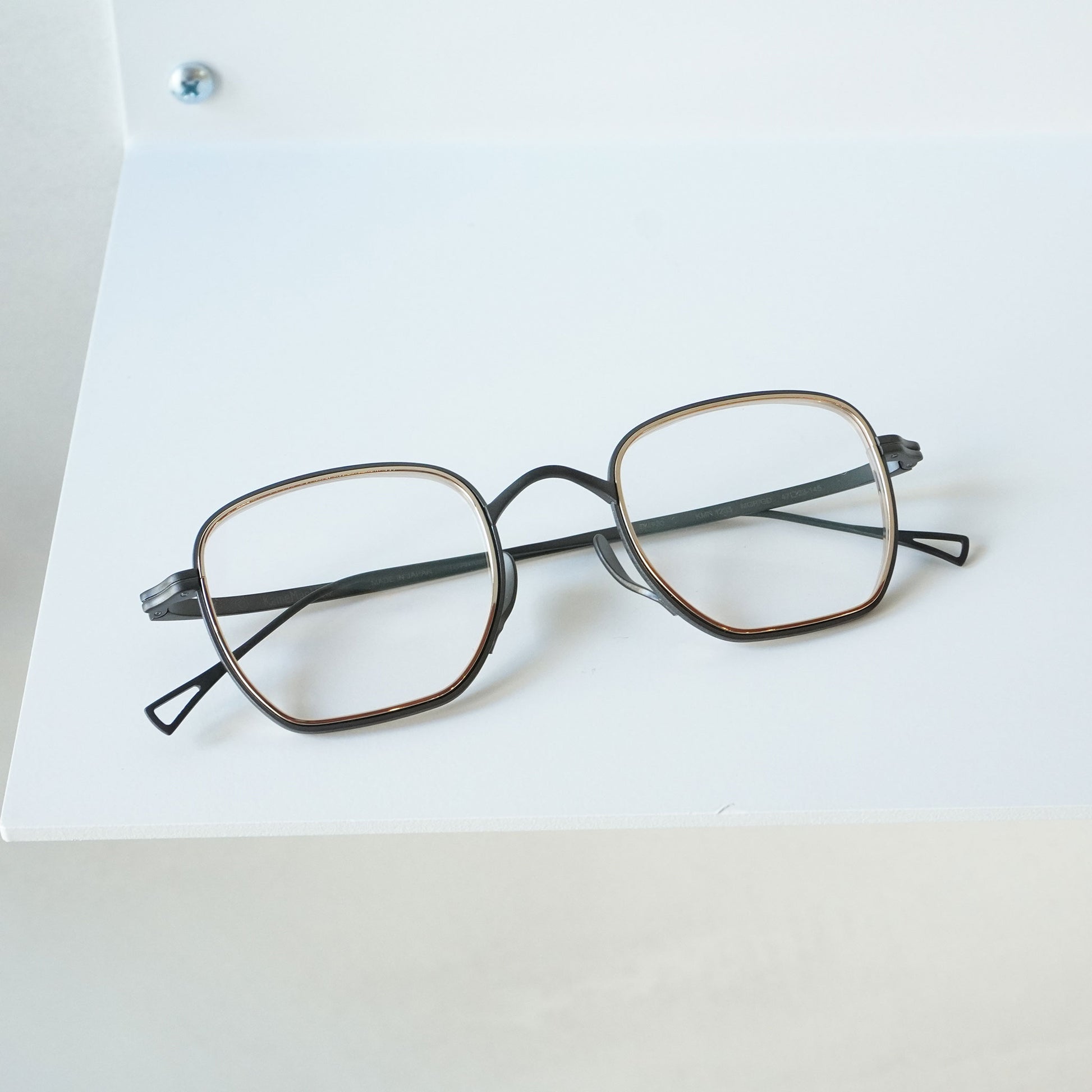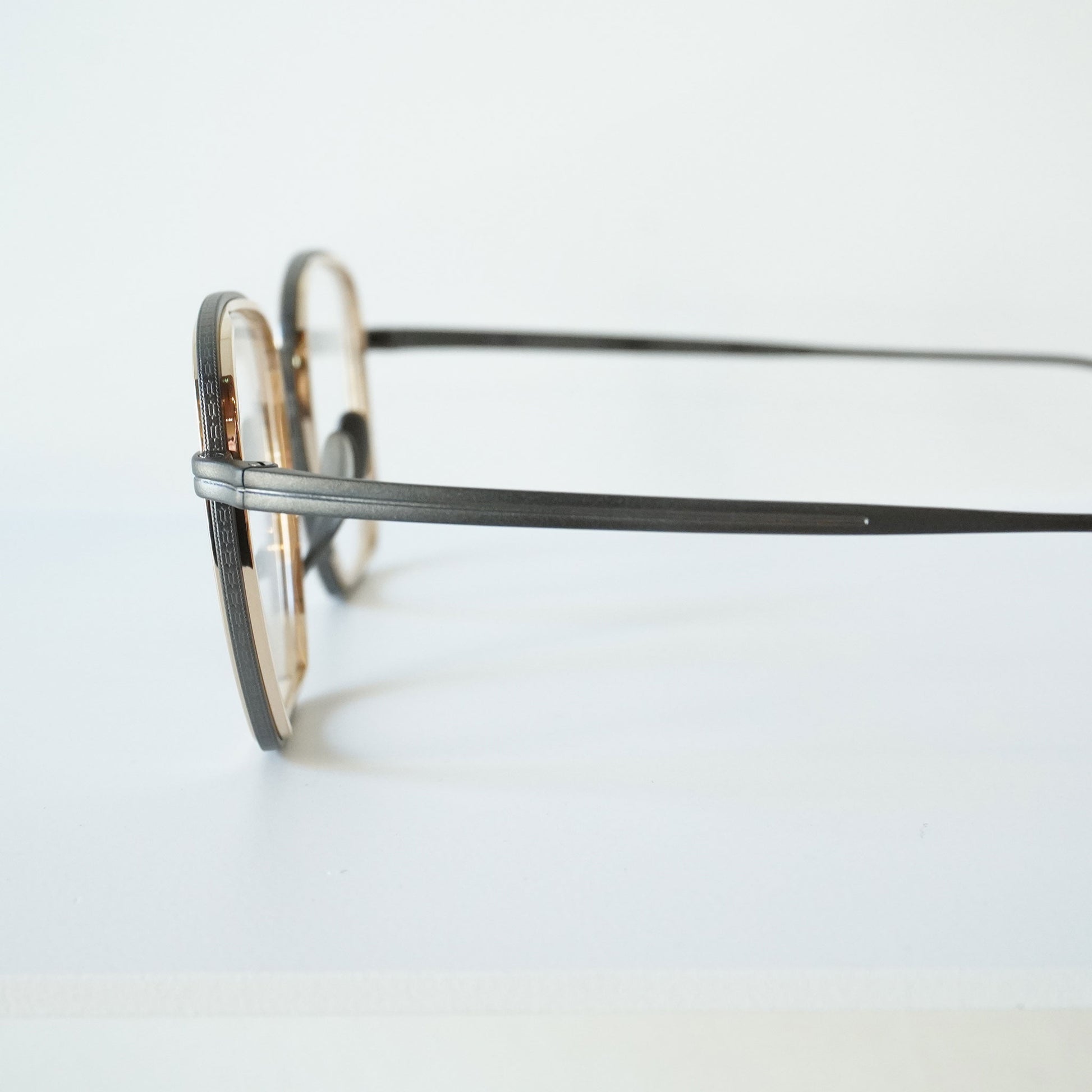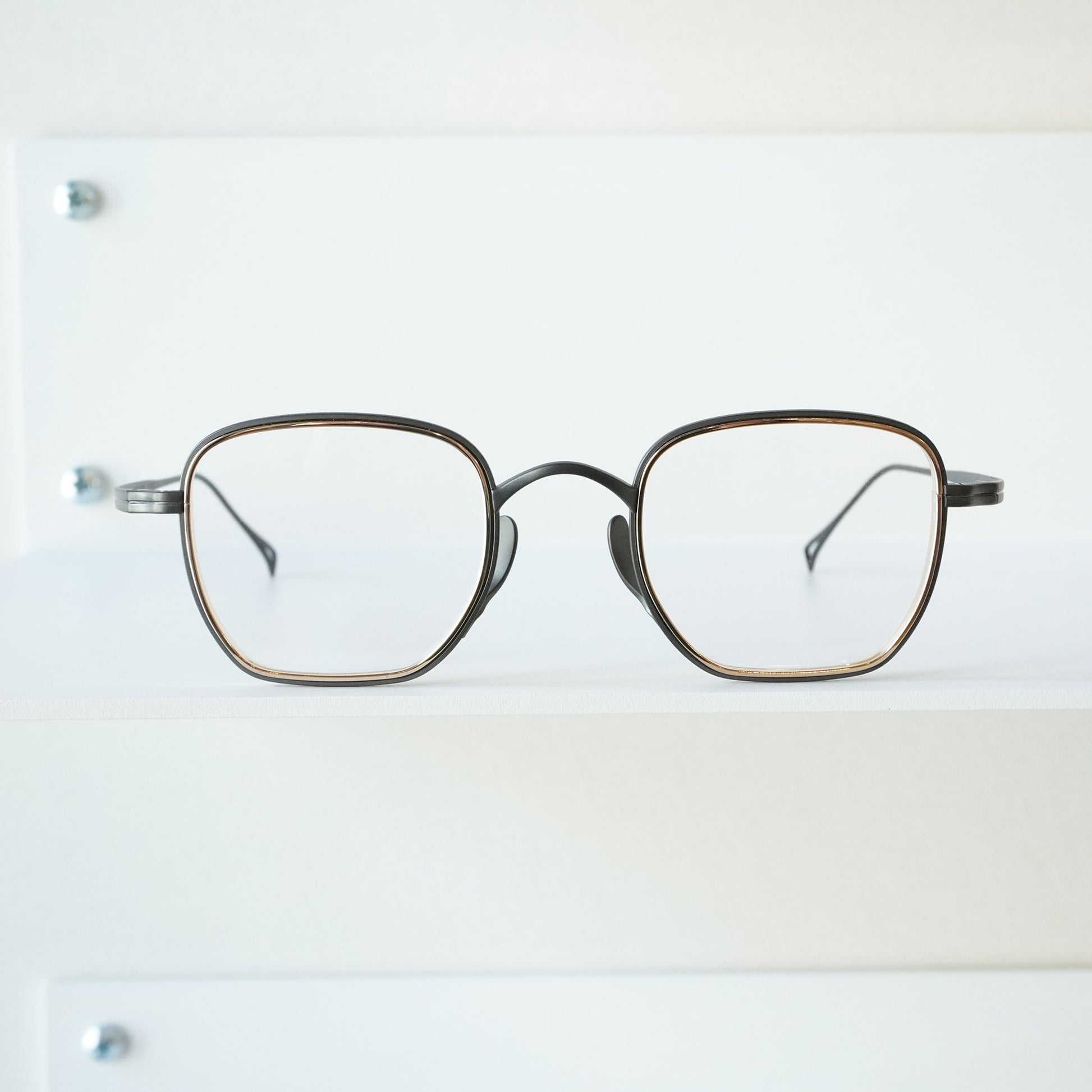 カメマンネンでは珍しいゆったりとした大きめのメタルフレーム。スクエア型の男女問わず掛けやすいデザインと人気の二重に重なってるメタルが特徴的です。