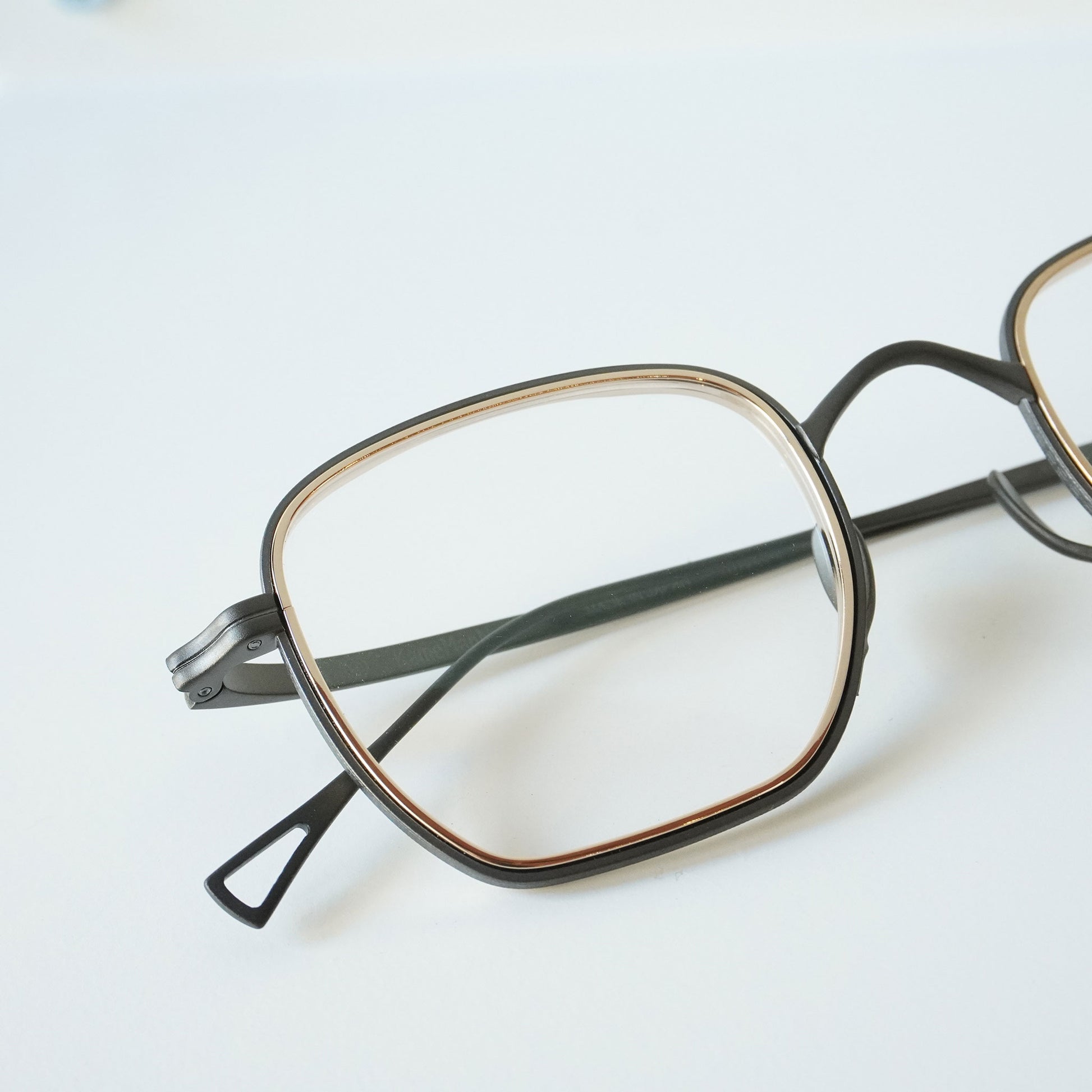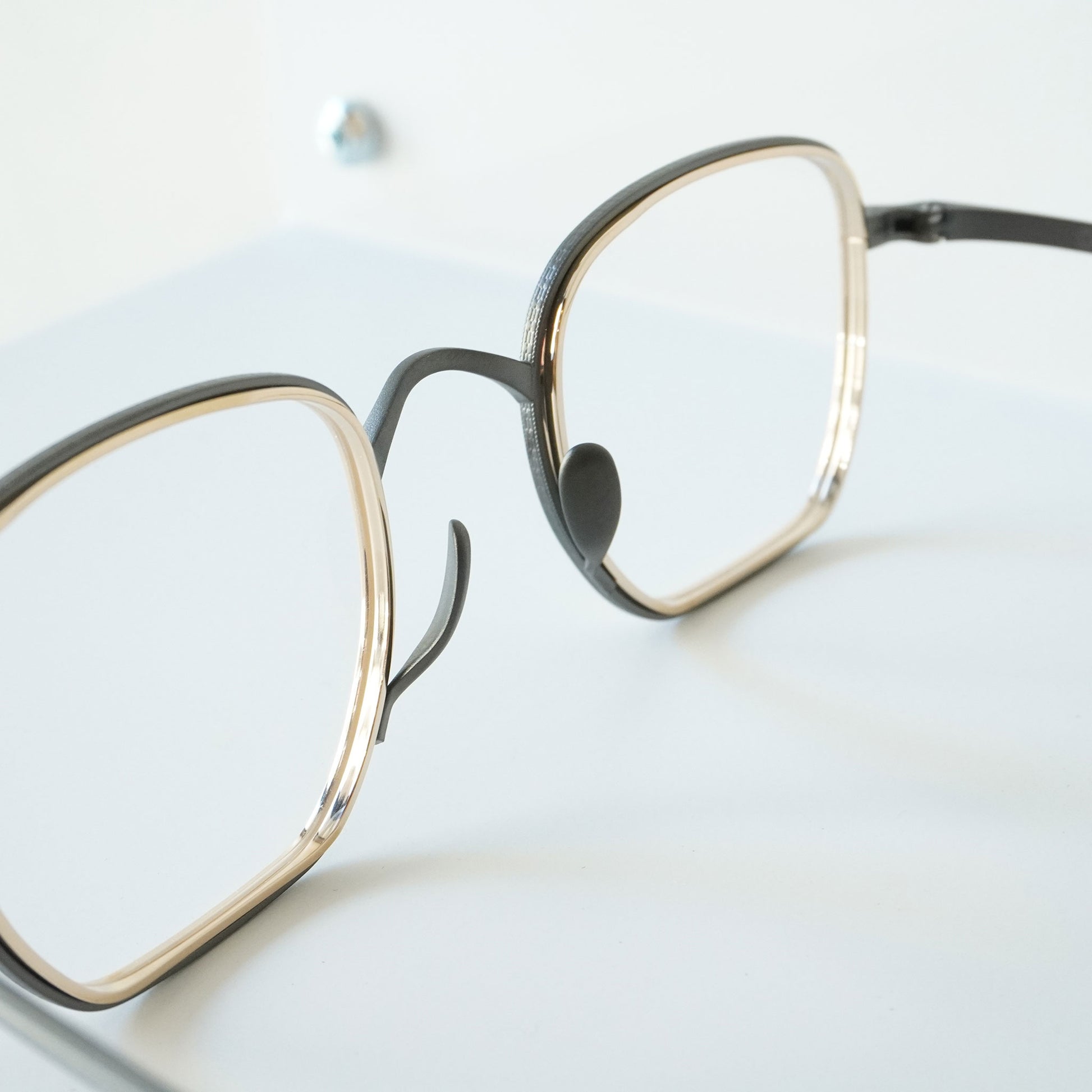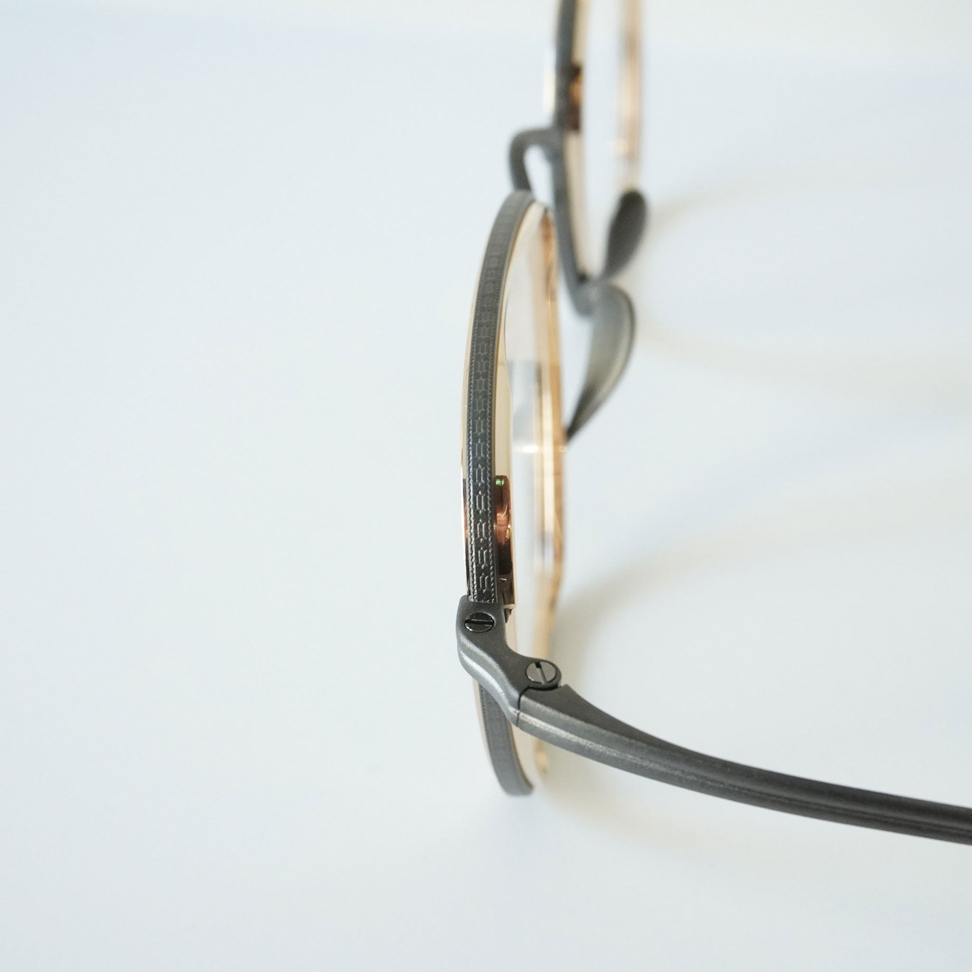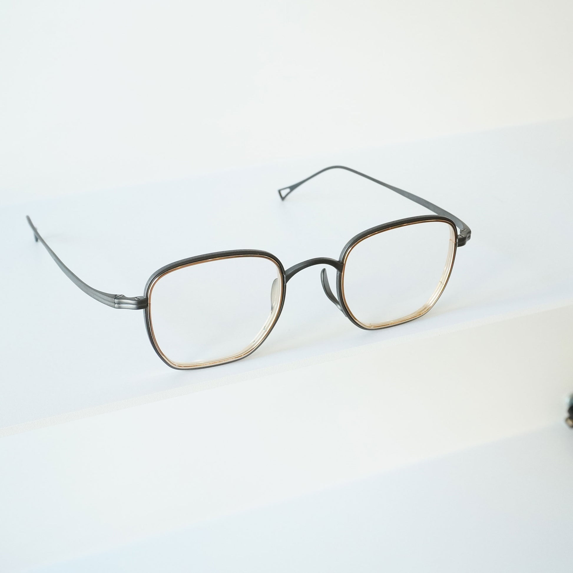 カメマンネンでは珍しいゆったりとした大きめのメタルフレーム。スクエア型の男女問わず掛けやすいデザインと人気の二重に重なってるメタルが特徴的です。