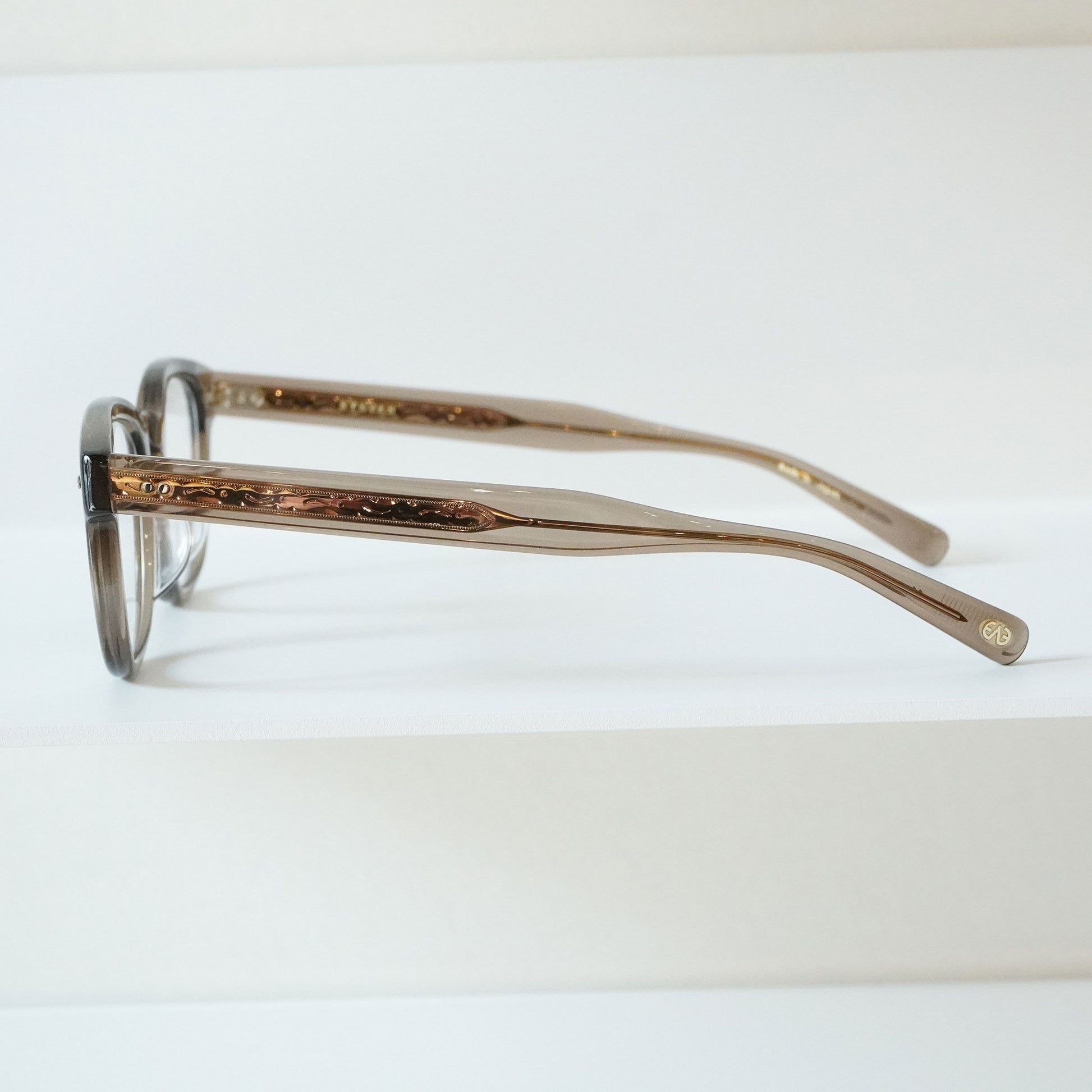 ボストンウェリントンフロントに、オリジナルのカシメ飾り丁番を採用したプラスチックフレーム。 テンプル芯には、クラシックカーのパーツからインスパイアされた柄を表裏に彫り込んだオリジナル芯を採用しています。