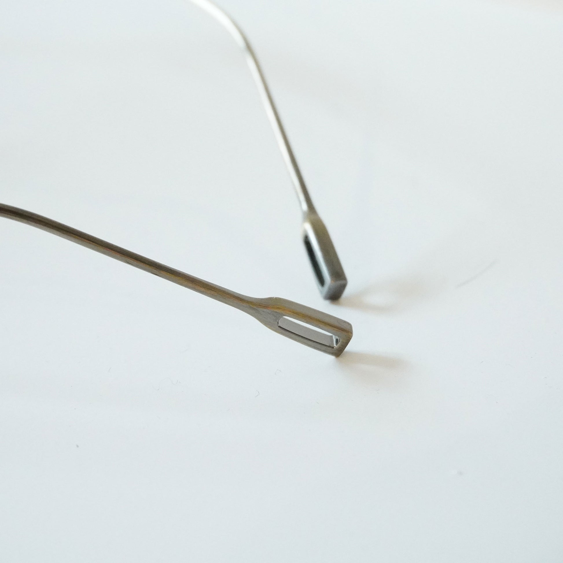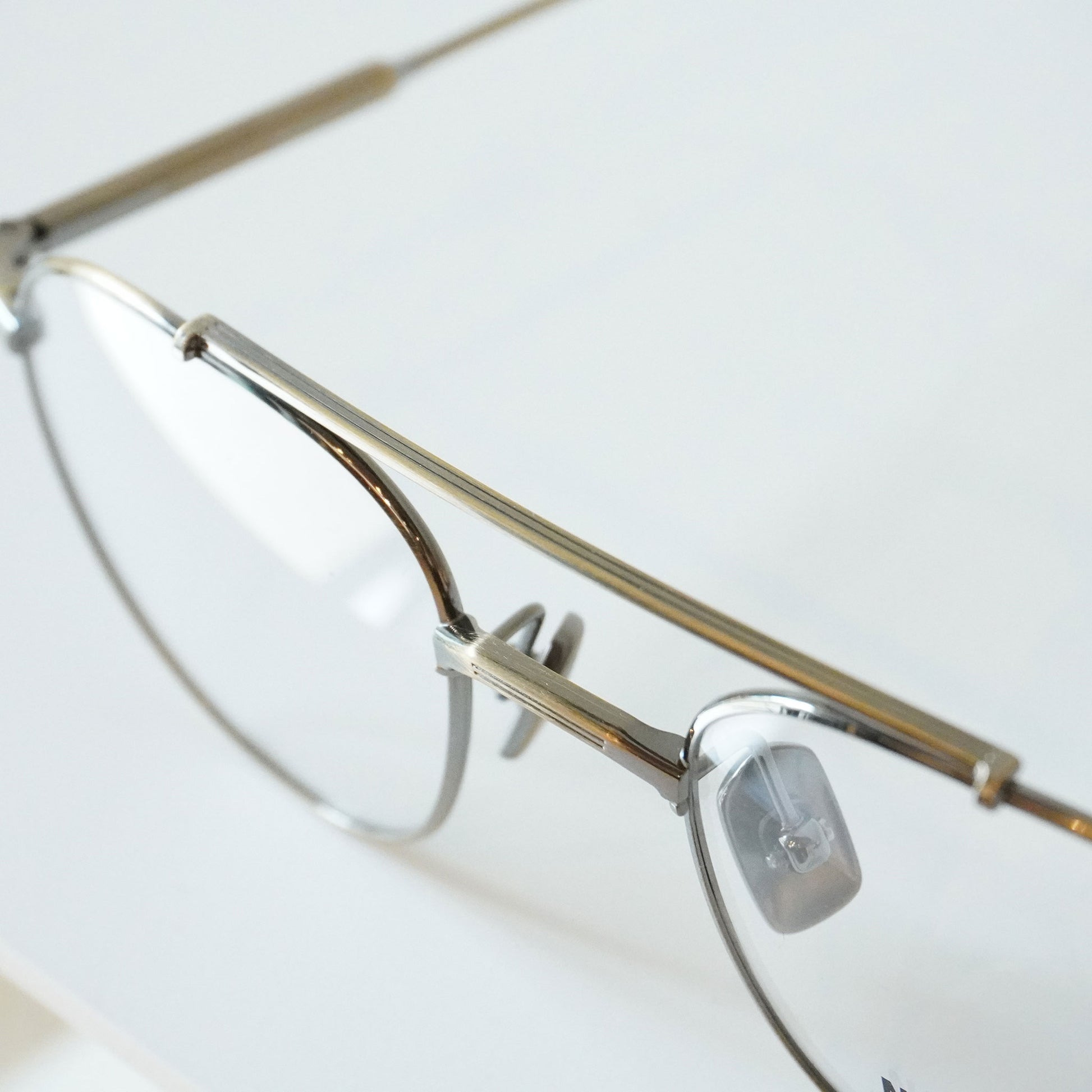 ストロベリーシェイプ(イチゴ型)はそのままにブリッジやテンプルは角のあるデザインに仕上げより機械的な要素を加えたメガネです。バーブリッジをつけよりメンズライクな印象になっています。