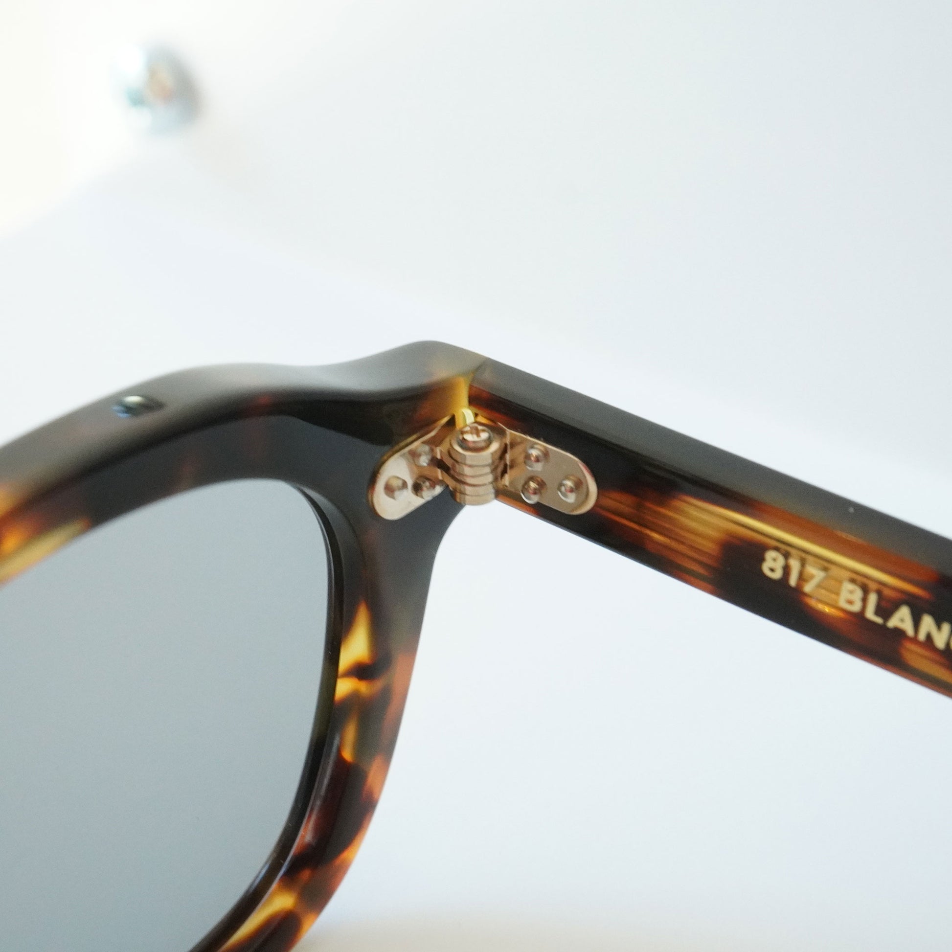 BLANC は仏語で " 白 " を表し、何色にでも染まることができるピュアでシンプルなイメージと、絵画で「光」・「光沢」などを表現するときに白い絵の具を使うところから名付けられた。ブランドシグニチャーは左テンプルエンドのサイン。