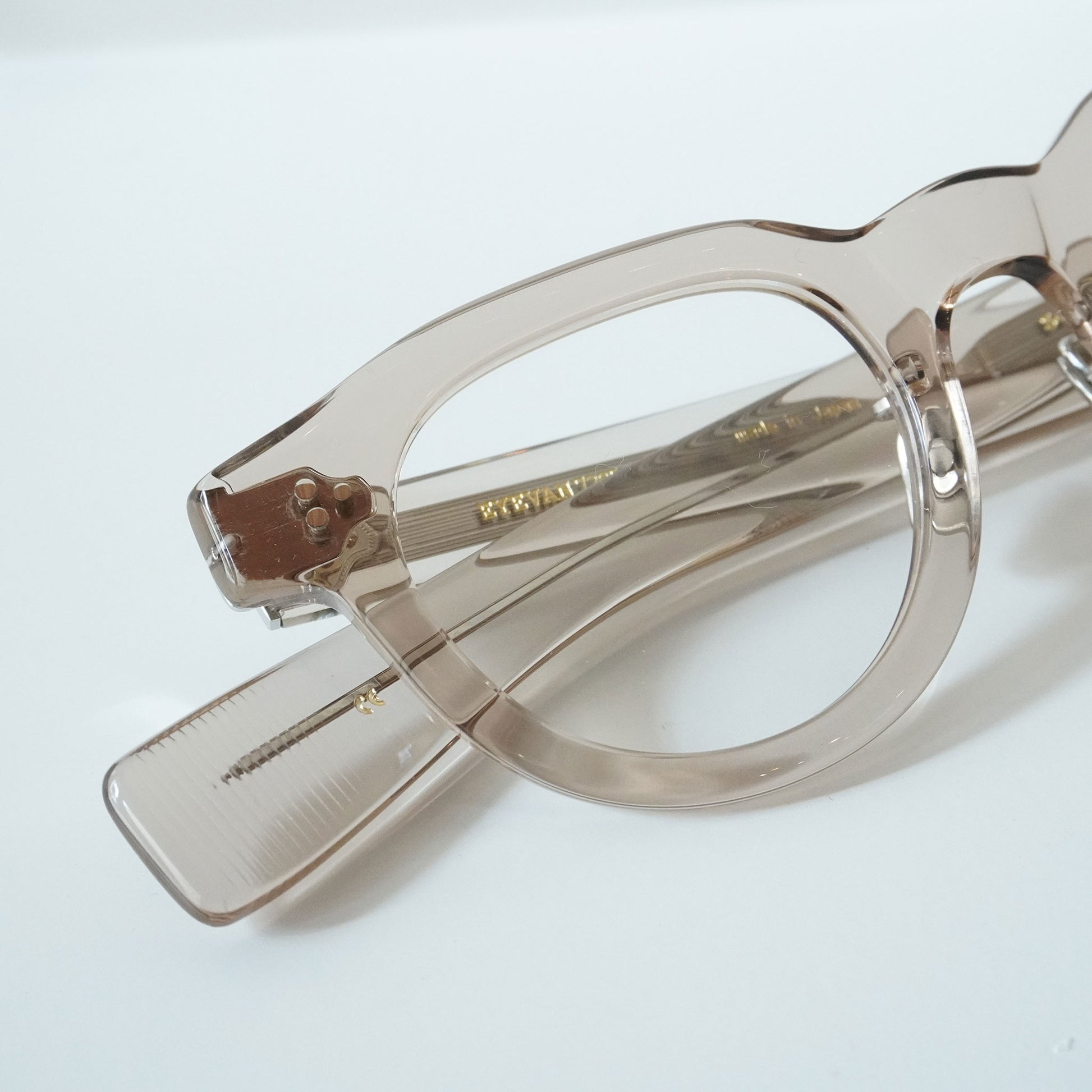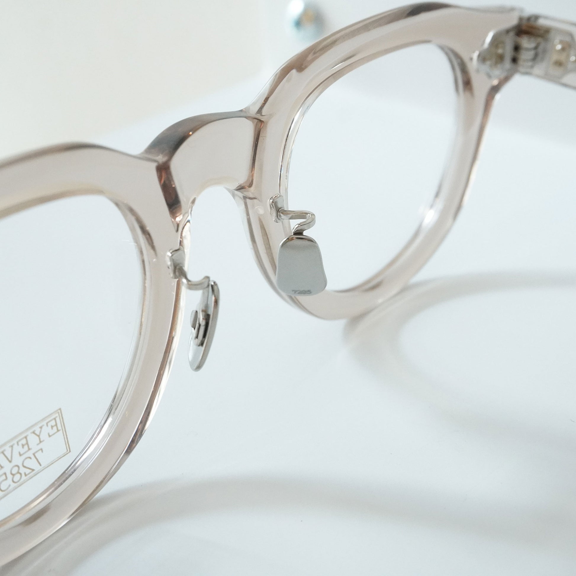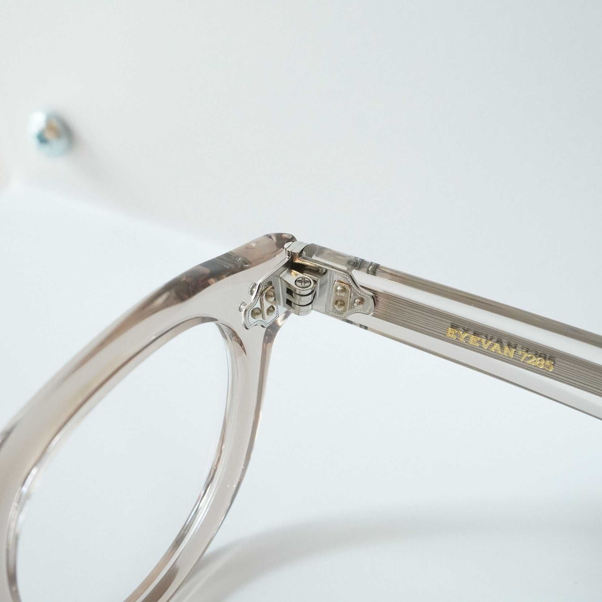 極太のテンプルを支えるために3PINを用いながらも、PINの大きさを変えて丁番の面積を抑えるという0.1mm単位の配慮をした設計をしている。 またテンプル芯も EYEVAN 7285 アルミケースに配されたストライプ柄を型押しで刻印したオリジナルパーツ。