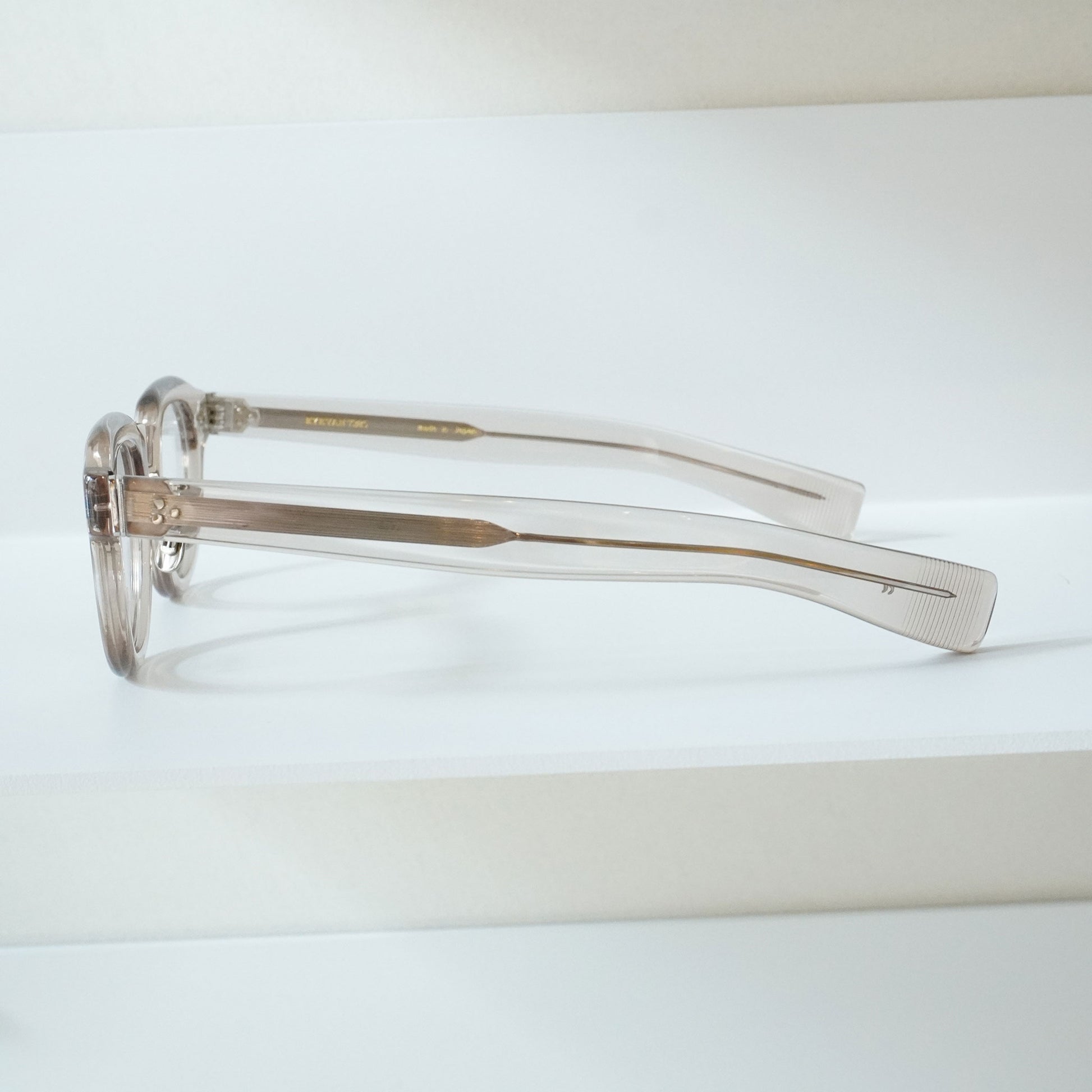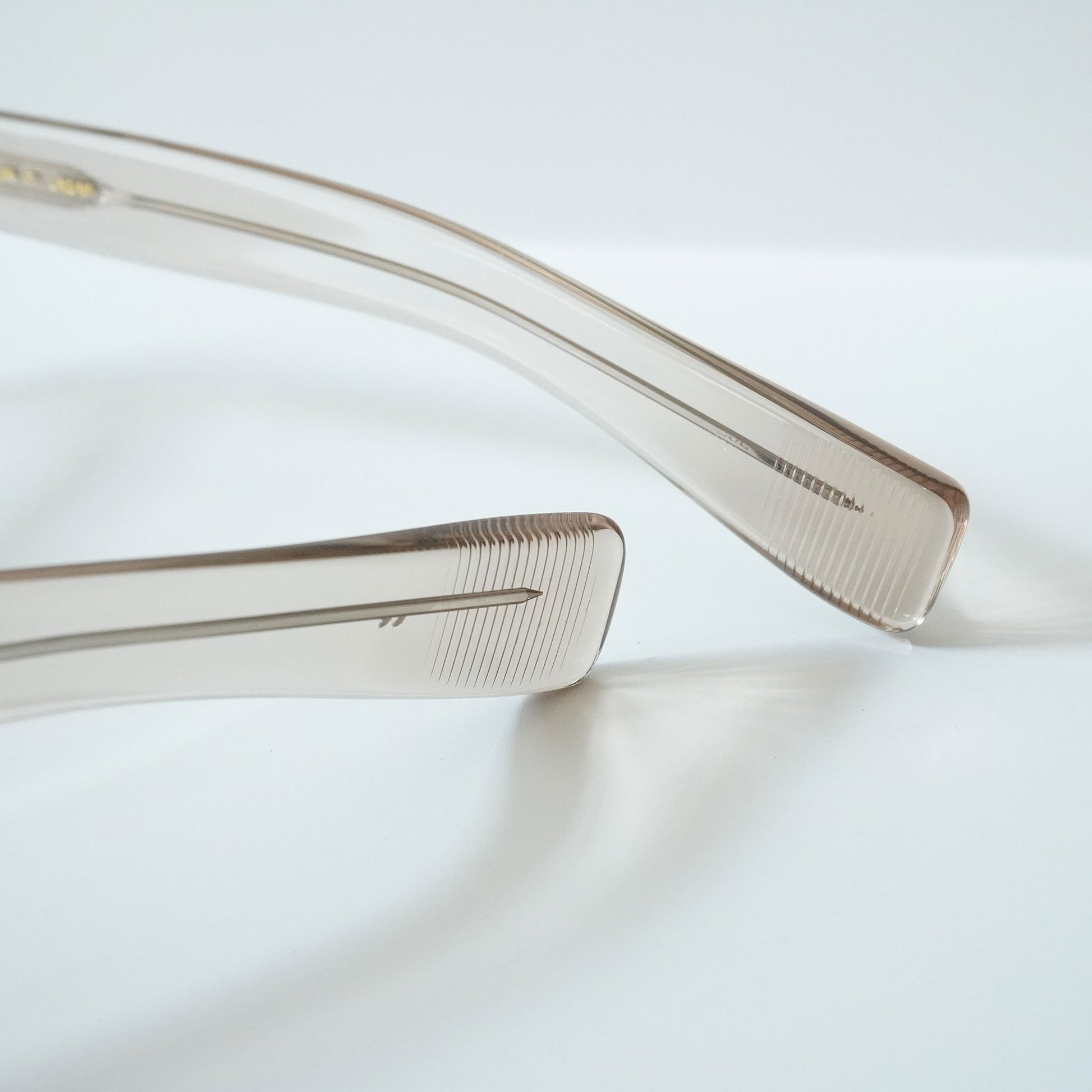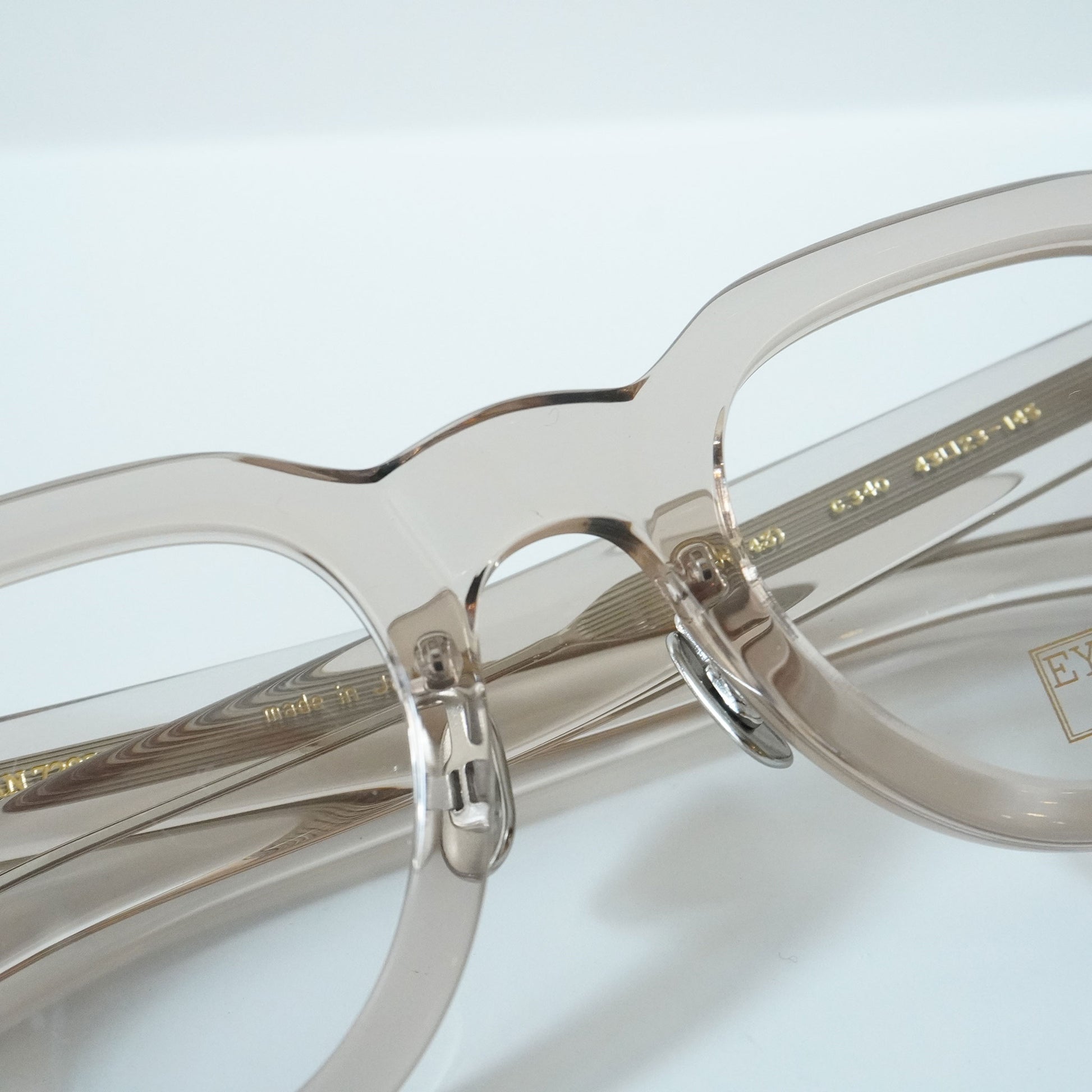 極太のテンプルを支えるために3PINを用いながらも、PINの大きさを変えて丁番の面積を抑えるという0.1mm単位の配慮をした設計をしている。 またテンプル芯も EYEVAN 7285 アルミケースに配されたストライプ柄を型押しで刻印したオリジナルパーツ。