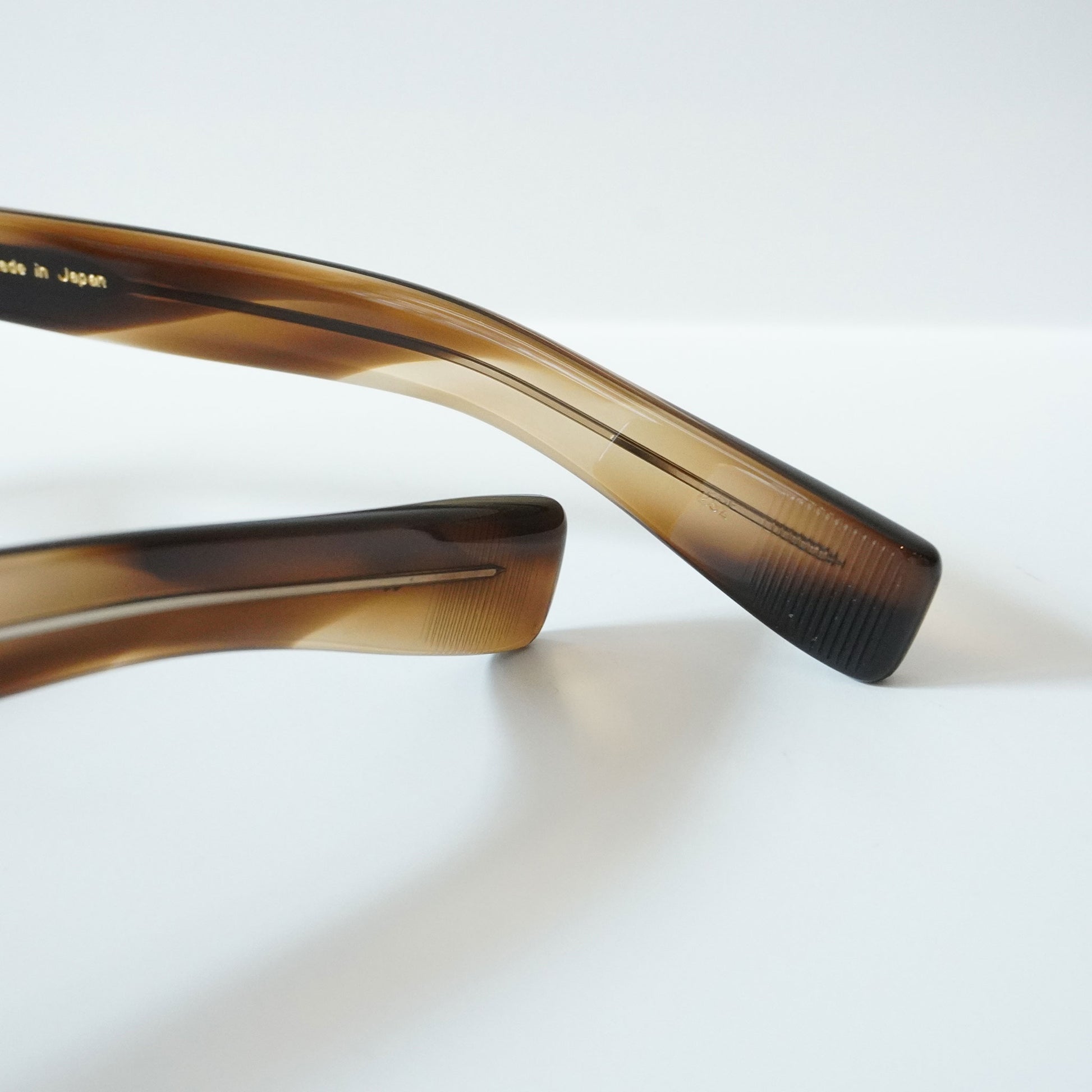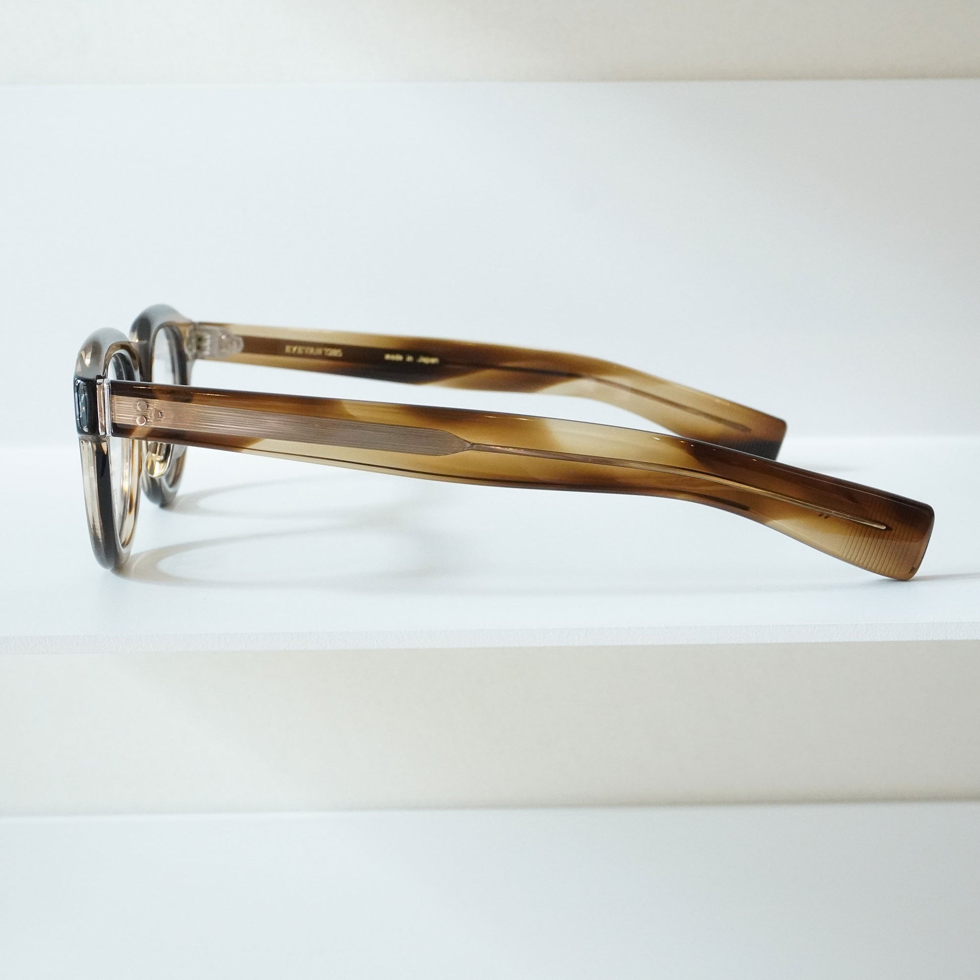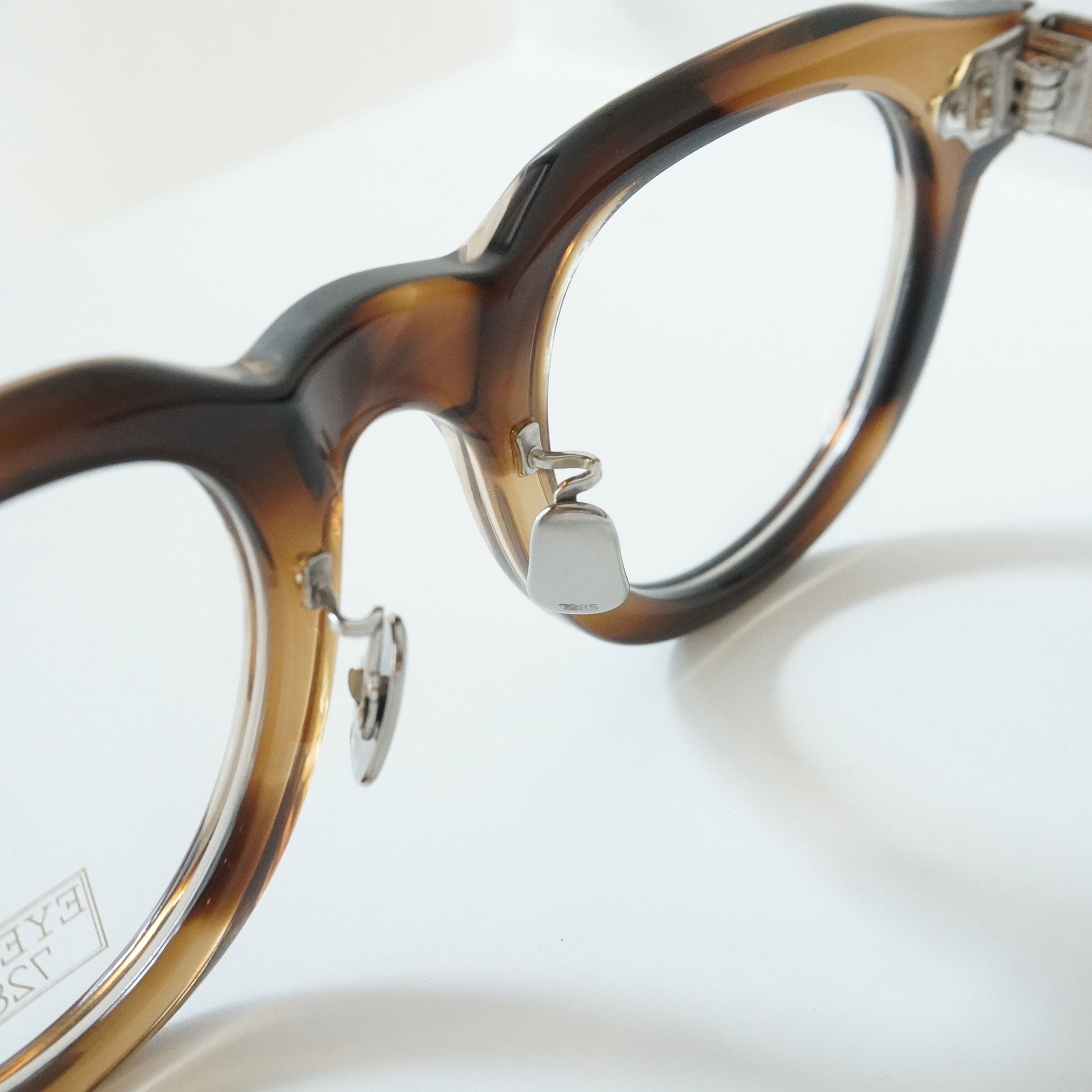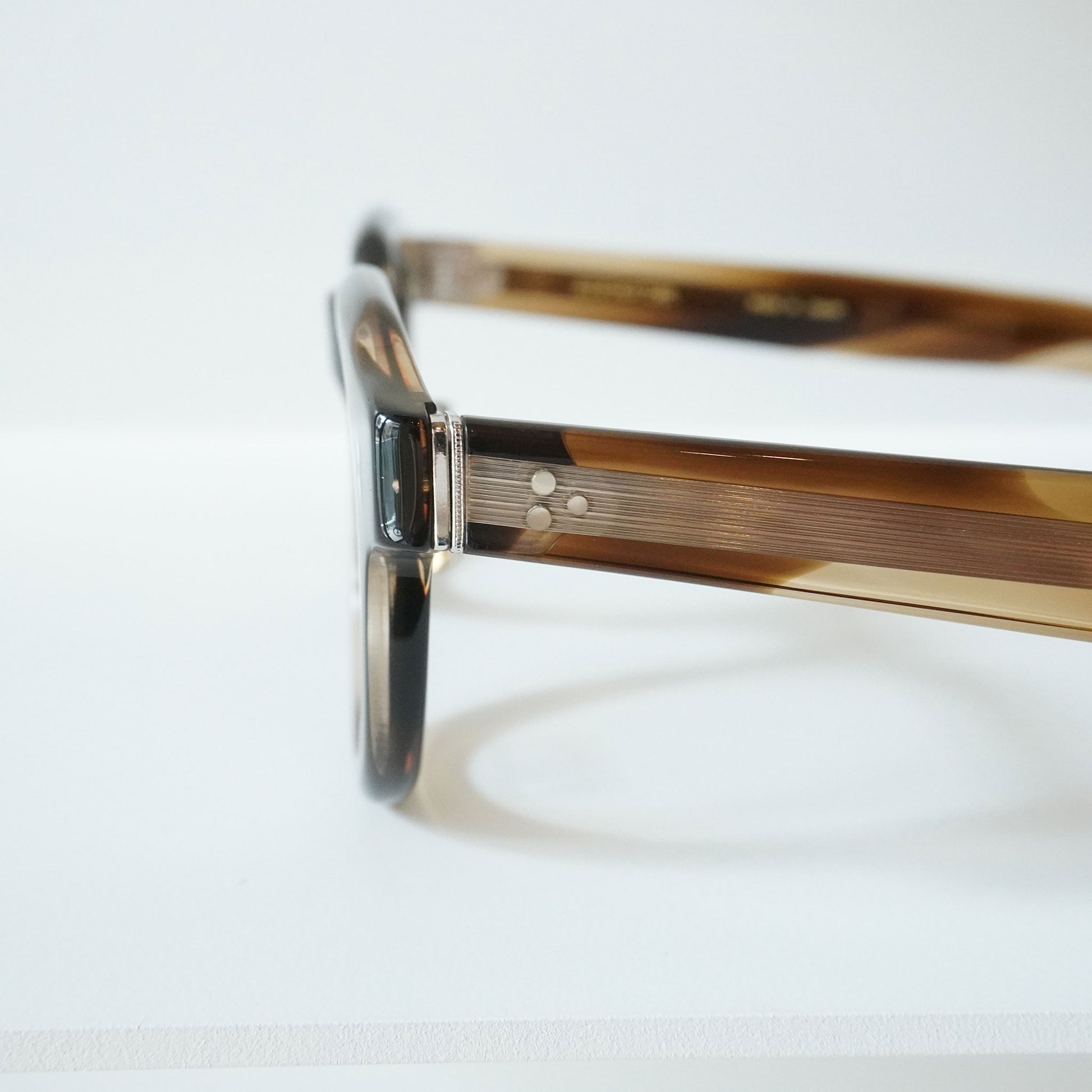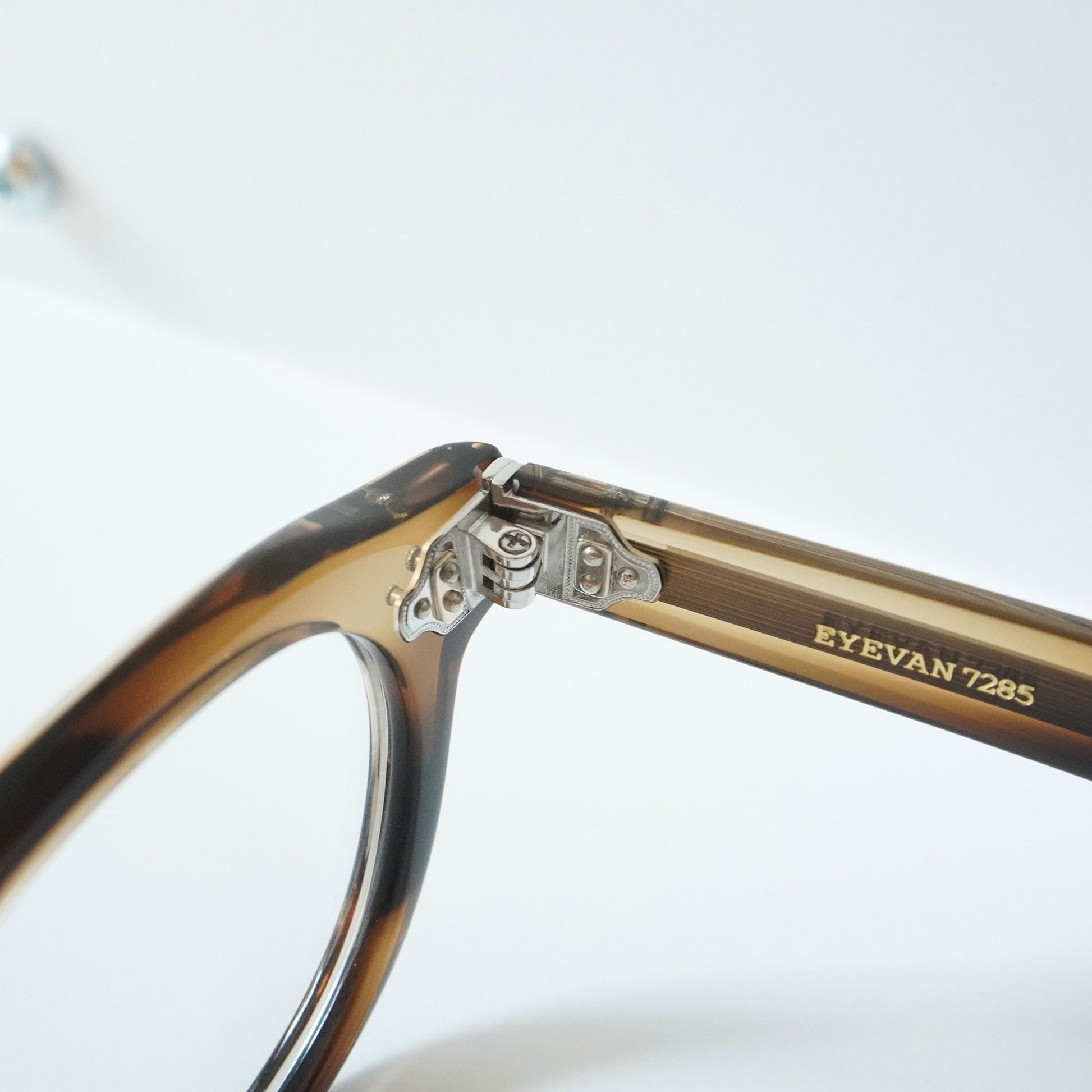 極太のテンプルを支えるために3PINを用いながらも、PINの大きさを変えて丁番の面積を抑えるという0.1mm単位の配慮をした設計をしている。 またテンプル芯も EYEVAN 7285 アルミケースに配されたストライプ柄を型押しで刻印したオリジナルパーツ。