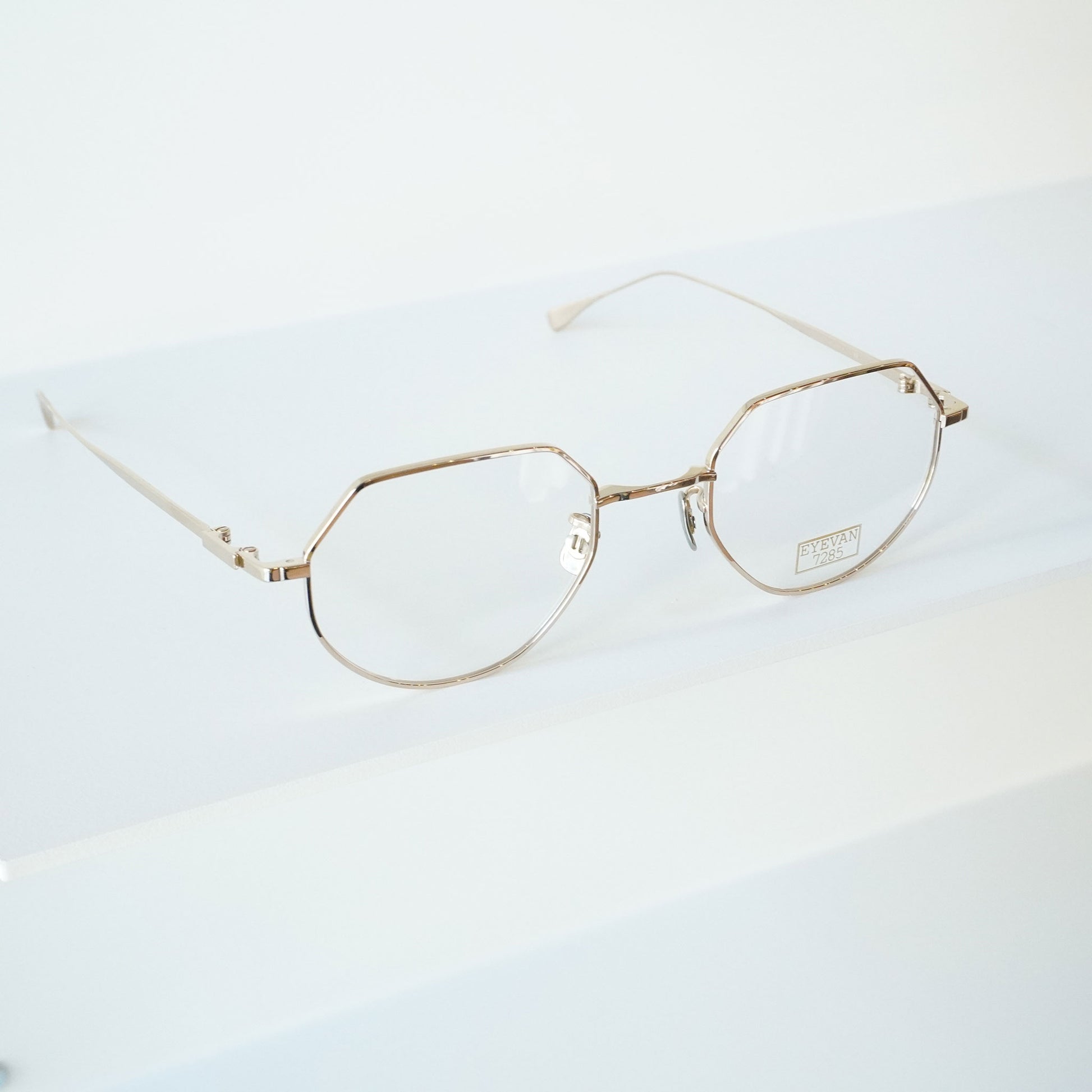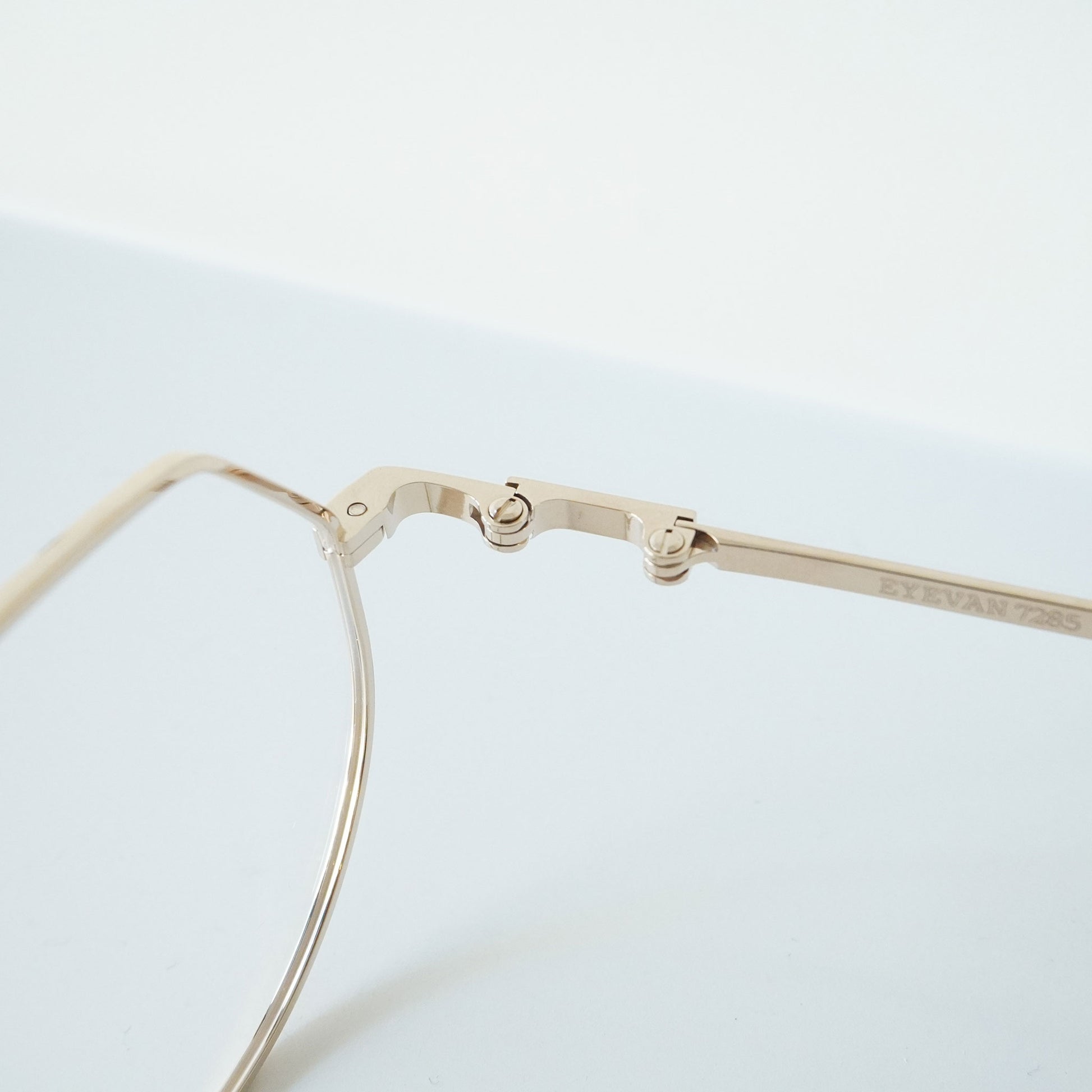 それらの膨大なデザインソースをブレンドし眼鏡というプロダクトに落とし込んでいます。40年代に製造されたフランス製のフォークをソースとしたテンプル、70年代の視力検査枠の構造を取り入れたメタルフレーム、日本の古い寺院の唐草柄からインスパイアされた模様を配したパーツなどが、その考えを具現化したものです。また、EYEVAN 7285の製品は、世界トップクラスの眼鏡生産地である福井県鯖江市の熟練した眼鏡職人の手作業と最新の機械によるマシンメイドの複合した生産工程により作り出されています。伝統的な製法と新しい製法を組み合わせて作り上げる眼鏡は、一見シンプルで何気ないデザインの物が多いですが、細部は非常に技巧的で、鯖江でも特に高い技術を持つ限られた職人の手作業による工程が多くを占めます。約400工程もの作業を経て丁寧に時間をかけて作り上げる眼鏡は工業製品というよりも現代の工芸品と言えるものです。