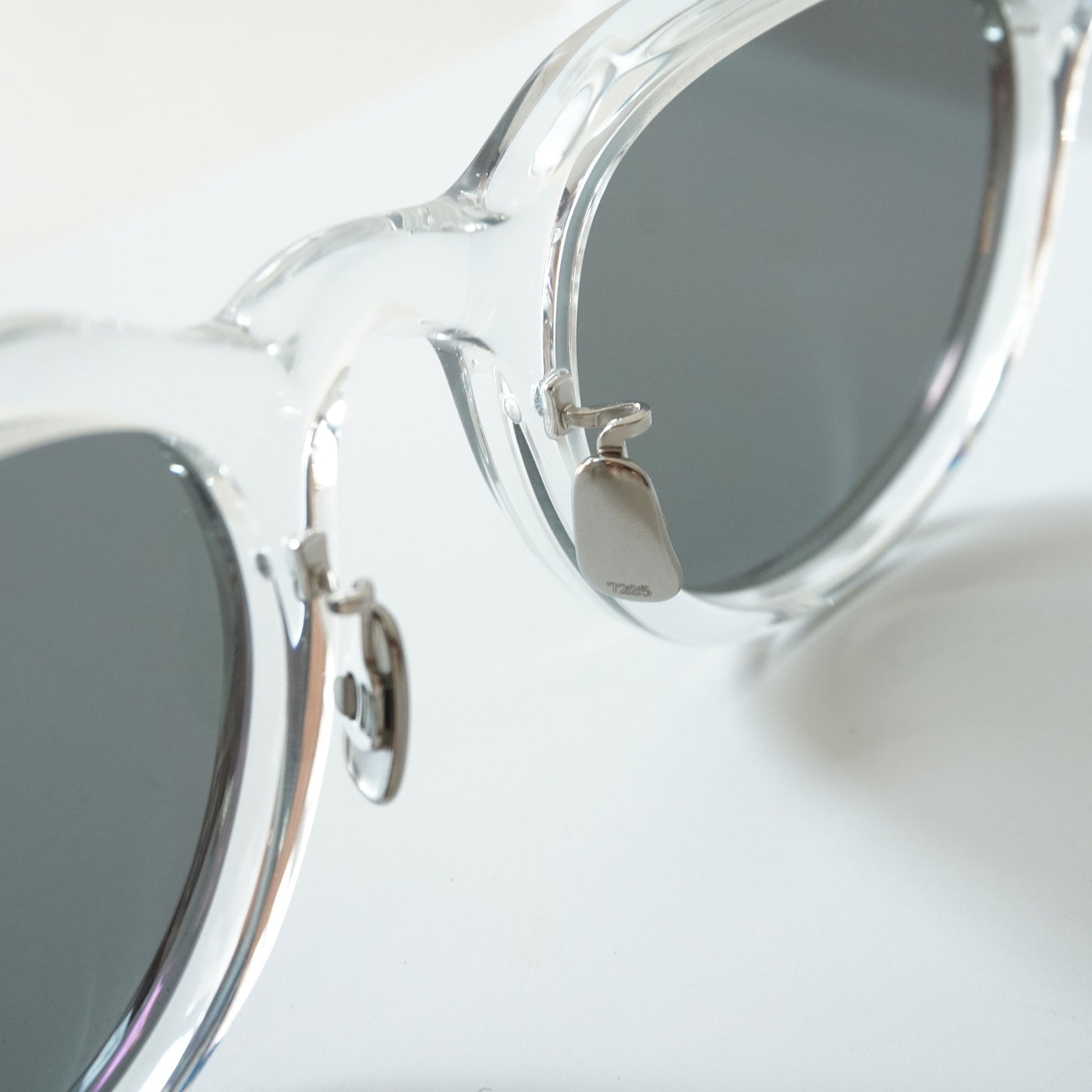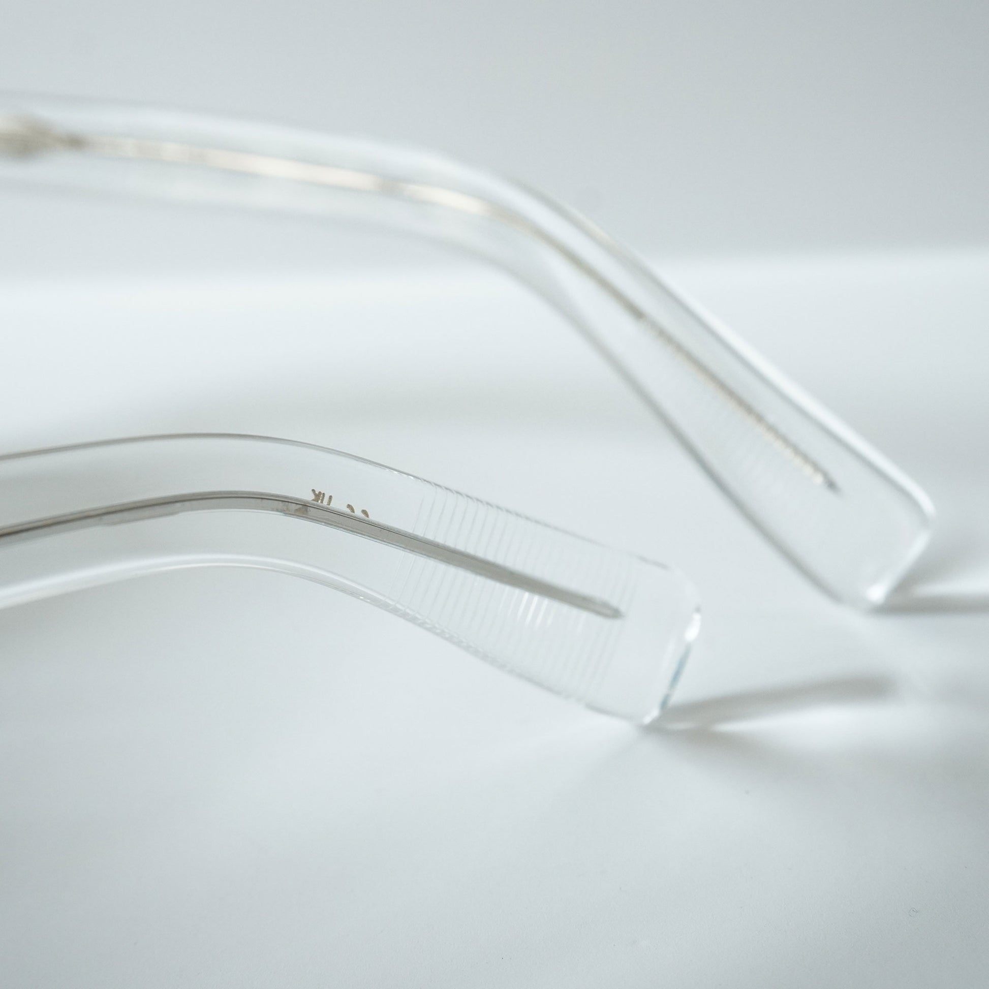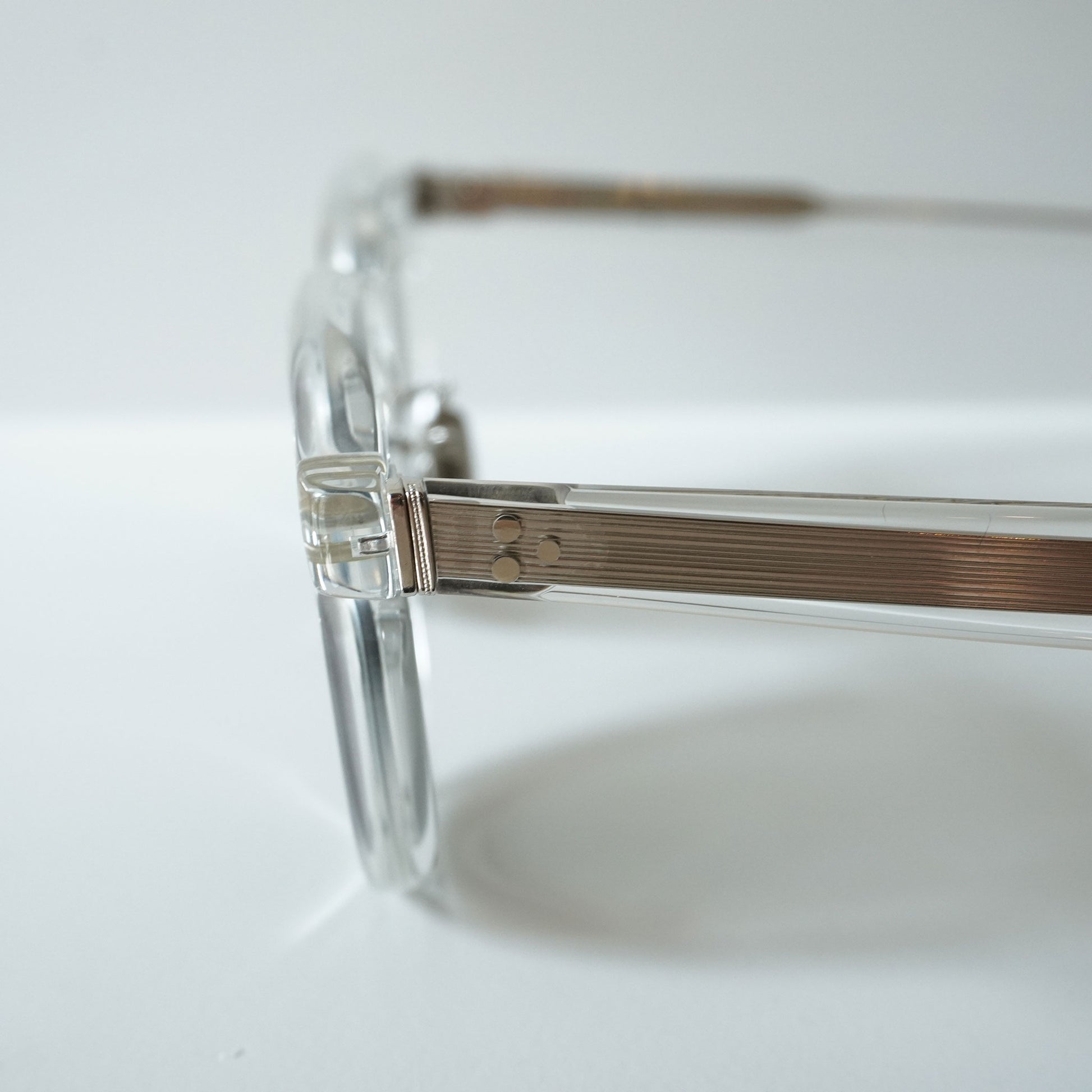 リムを中太に変え、テンプルもやや細手の新規パーツで組み上げた。 フロントとテンプルの丁番もこのモデルのために新規で作製した。 ミリタリー丁番、2+1PIN(一つだけ異なる大きさのPIN)、パテントを取得しているオリジナルの二股チタンパットなど細部までこだわり抜いたディテールで構成されている。