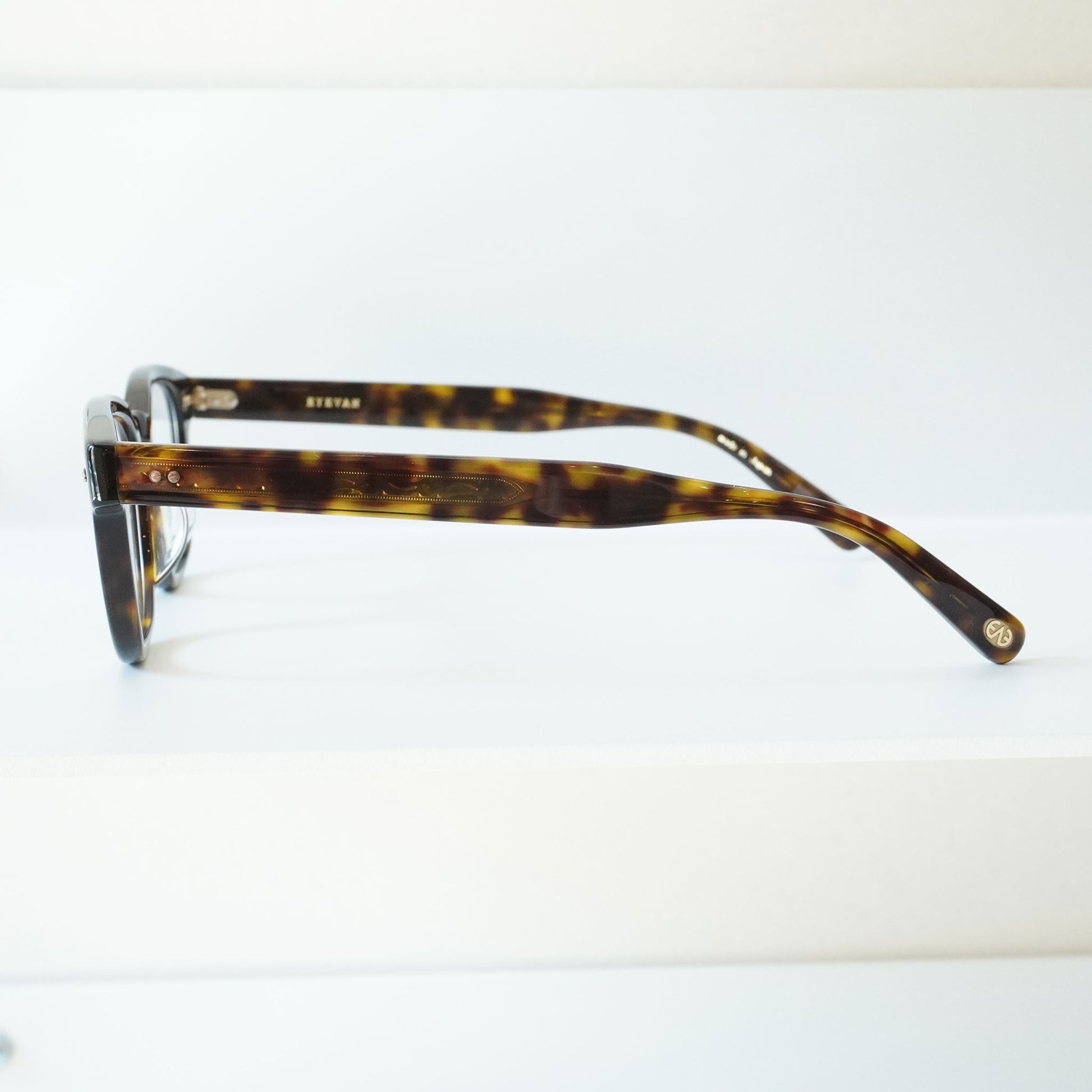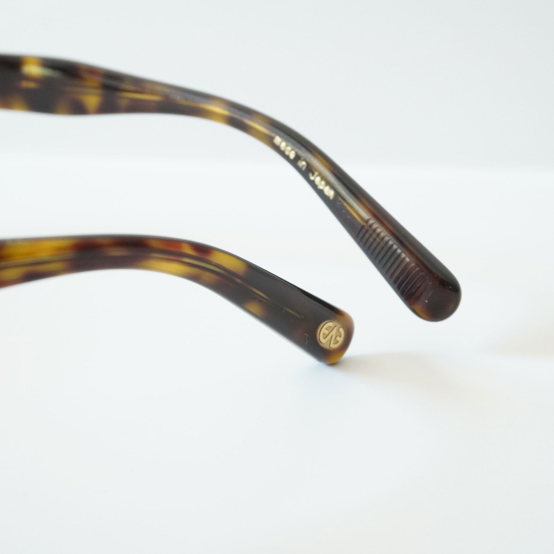 ボストンウェリントンフロントに、オリジナルのカシメ飾り丁番を採用したプラスチックフレーム。 テンプル芯には、クラシックカーのパーツからインスパイアされた柄を表裏に彫り込んだオリジナル芯を採用。
