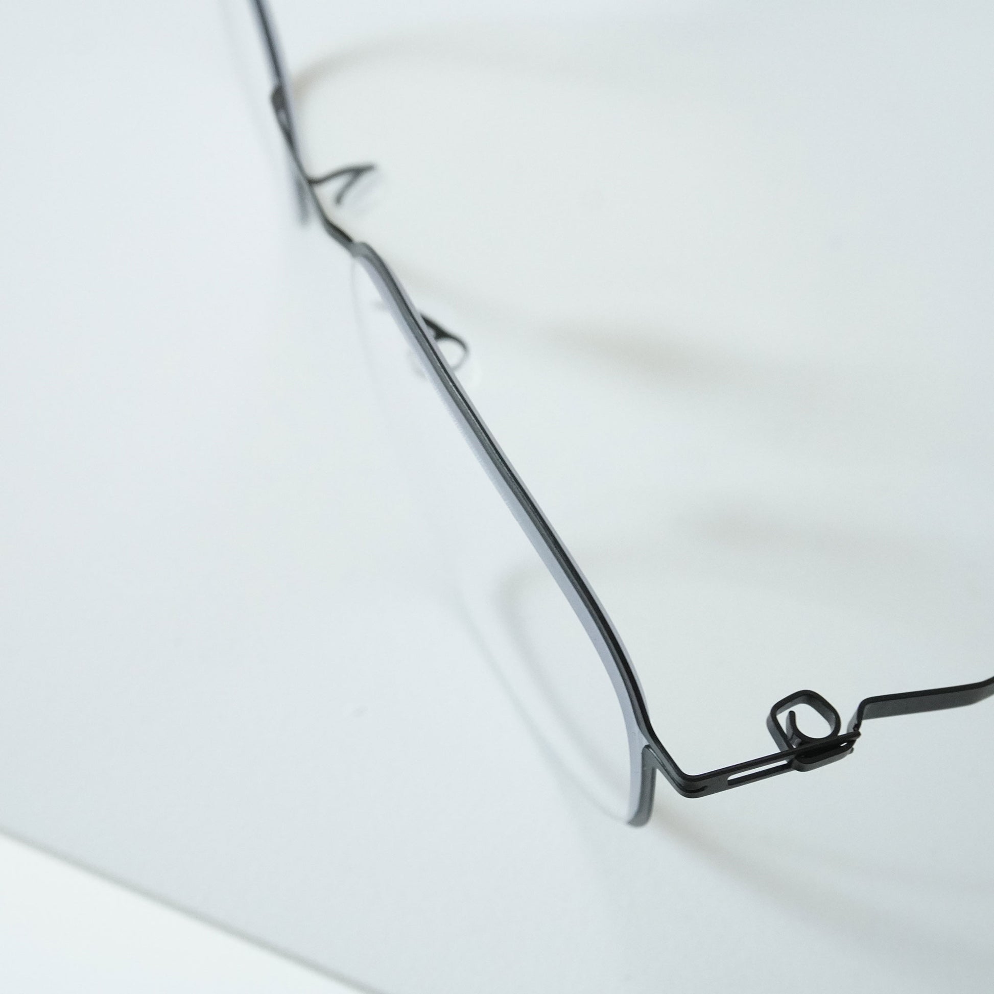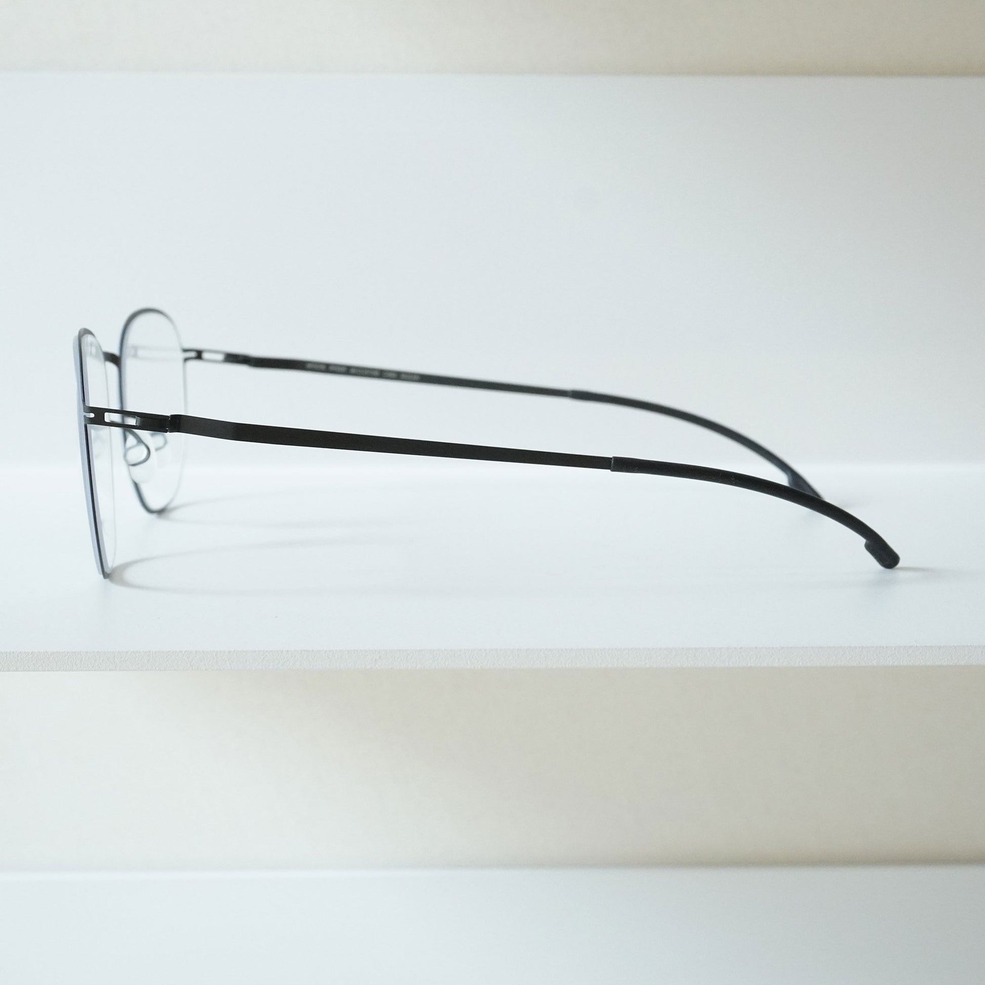 やや多角形のスクエアシェイプ。メンズライクに掛けられる人気のメタルフレーム。