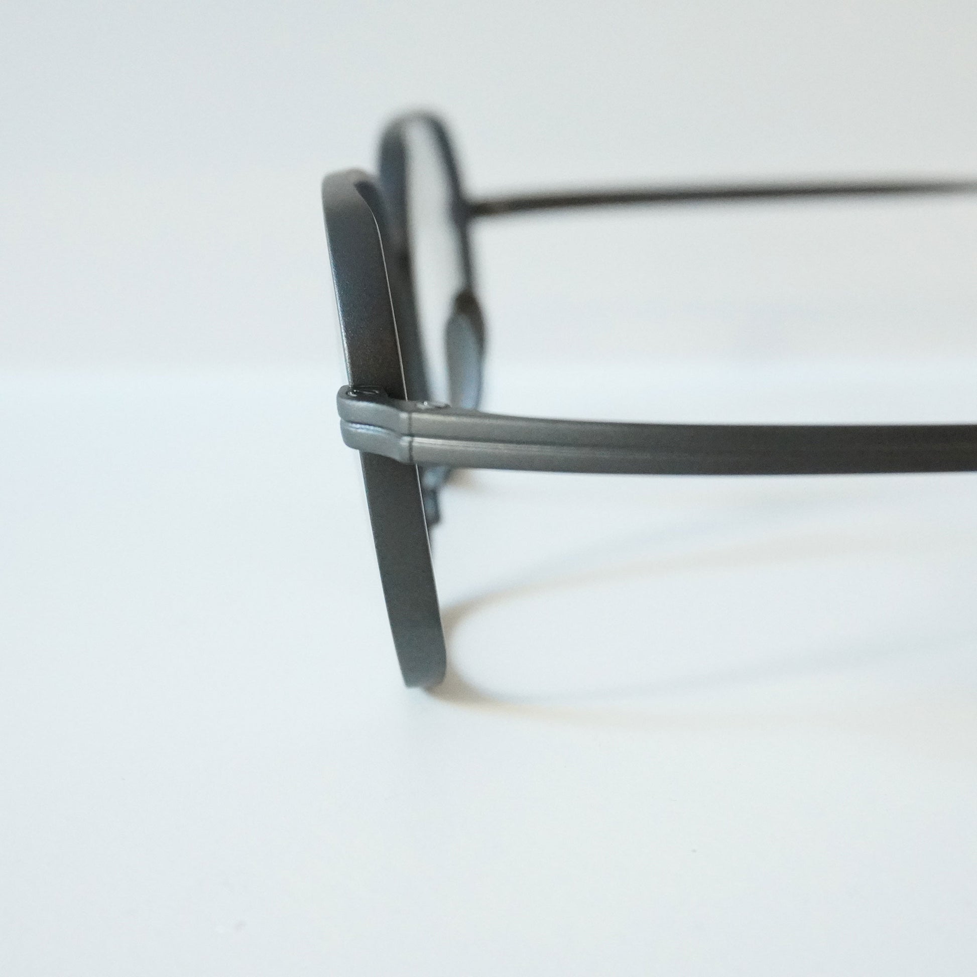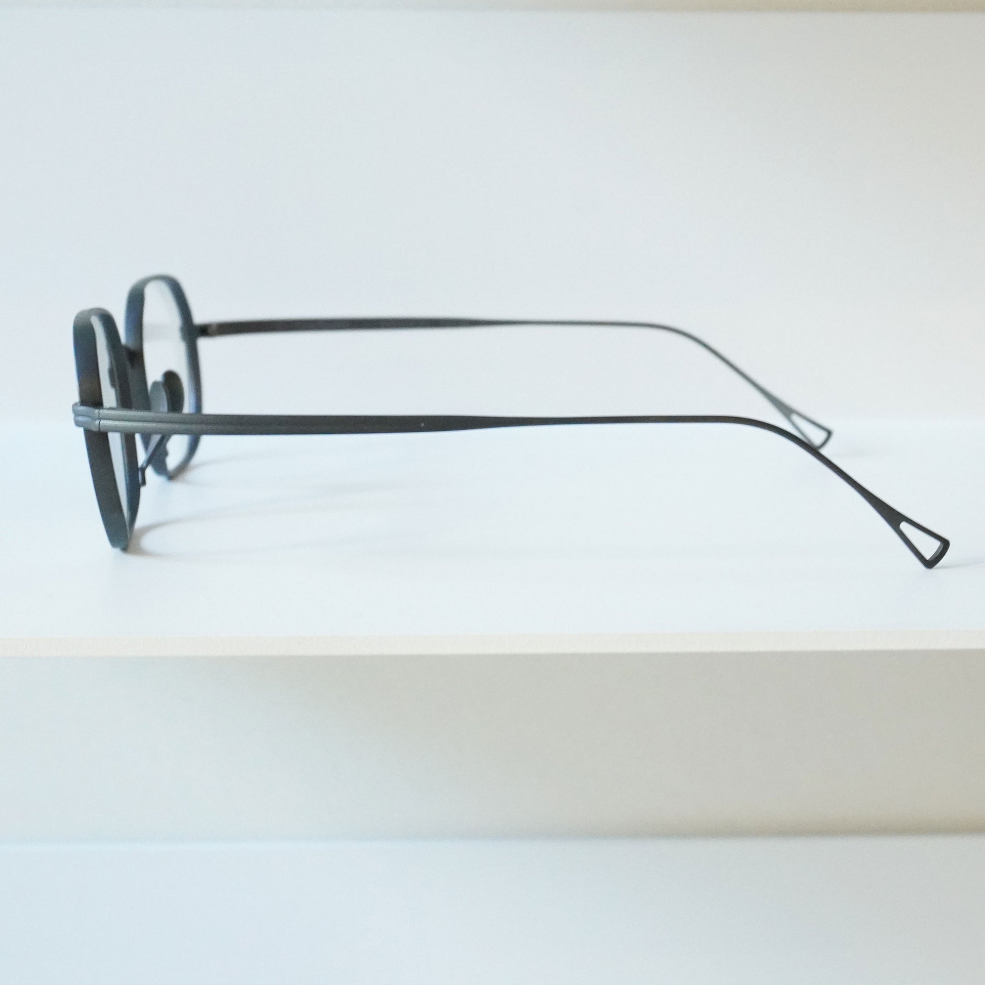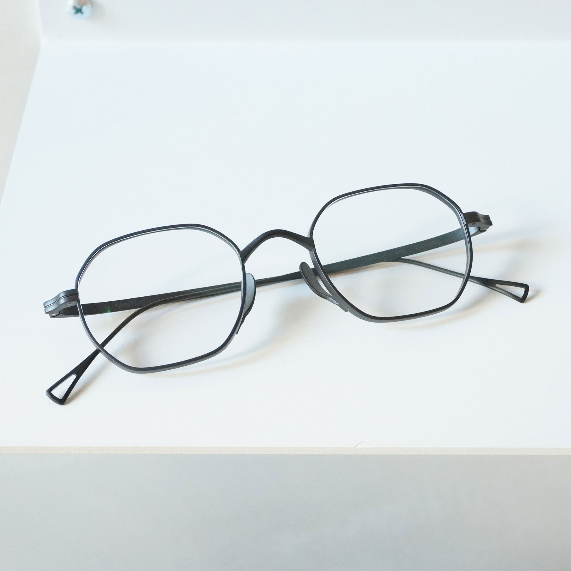多角形のスクエアなシェイプ、リムは厚く横顔と正面の印象が違う魅力的なモデル。