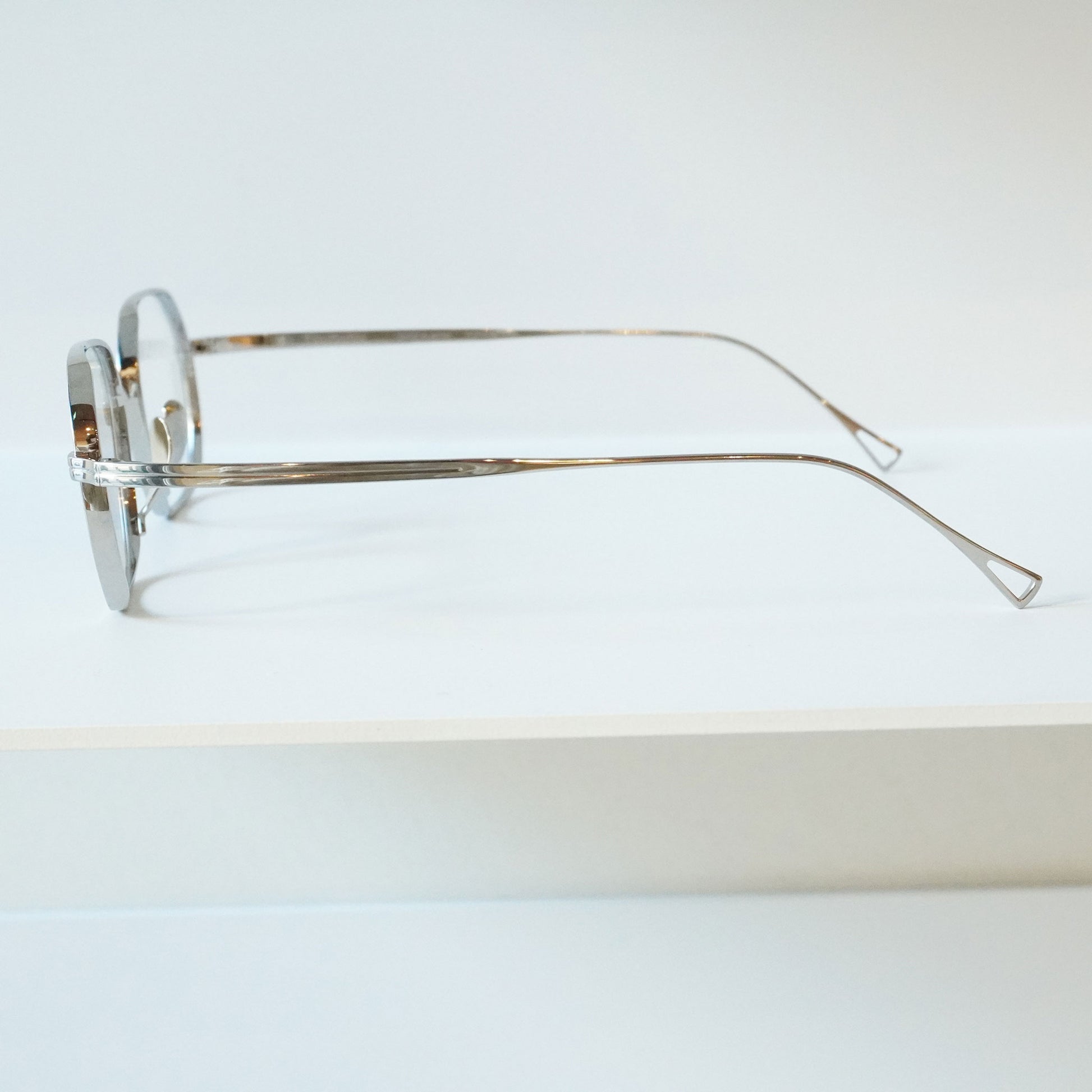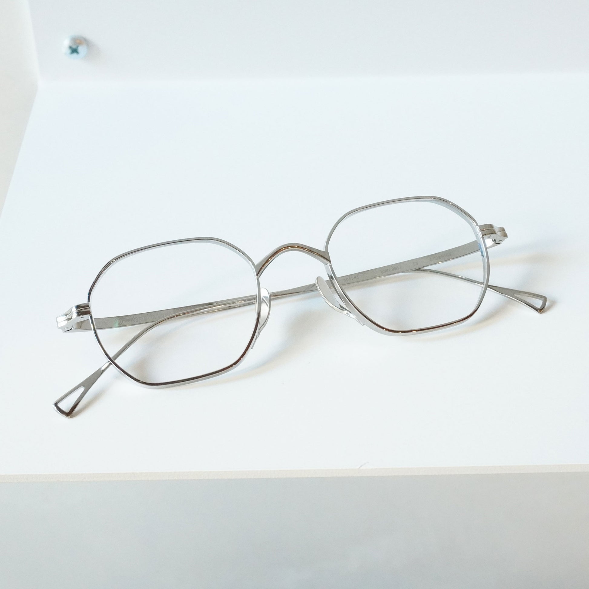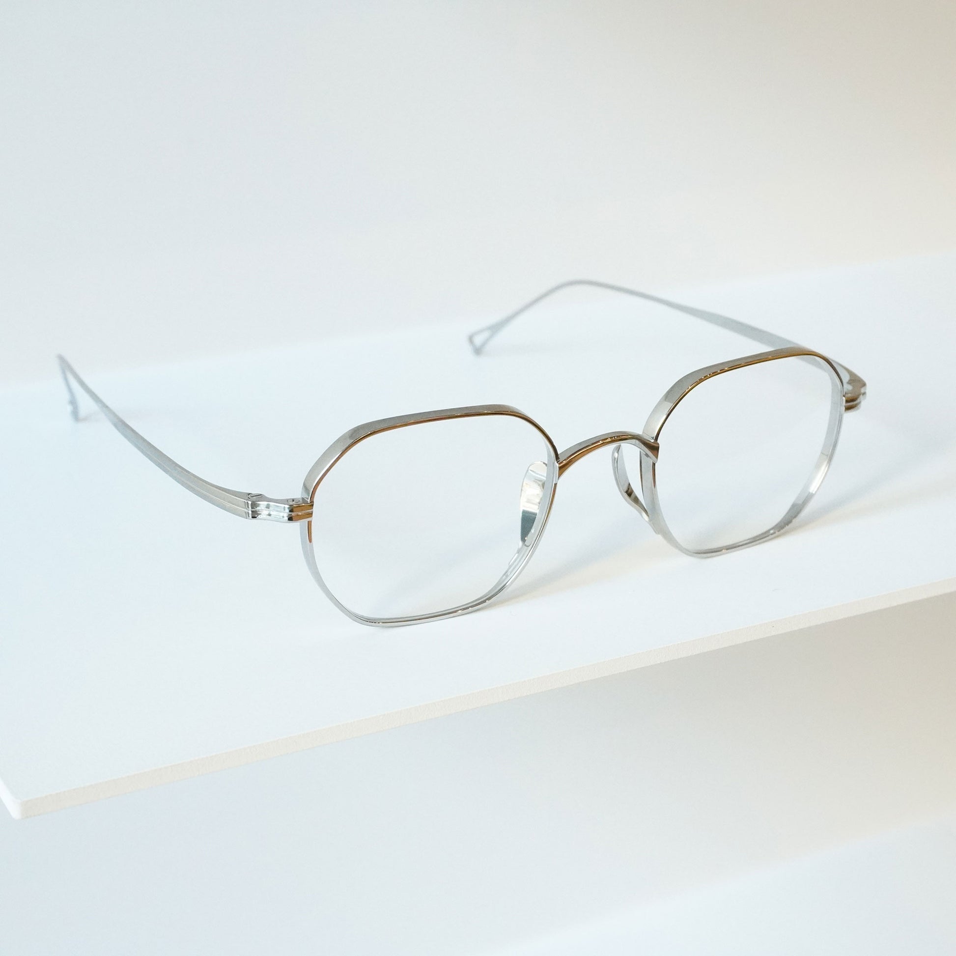 多角形のスクエアなシェイプ、リムは厚く横顔と正面の印象が違う魅力的なモデル。