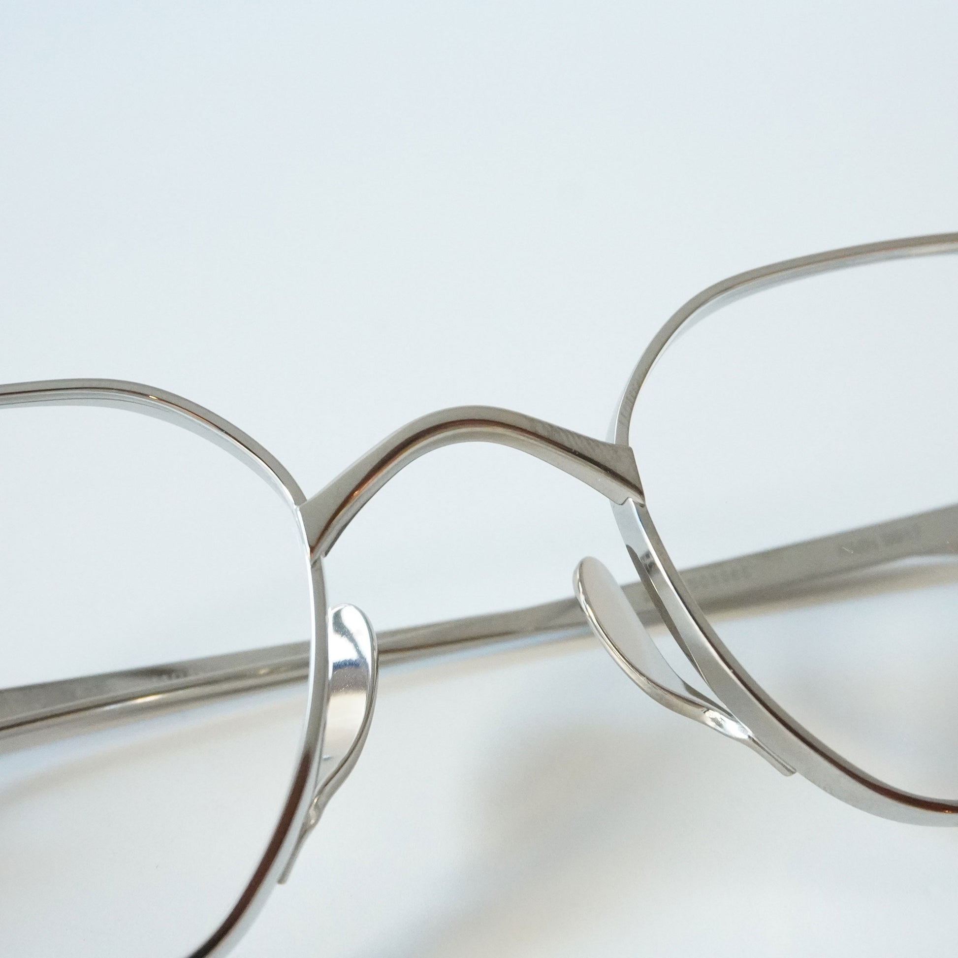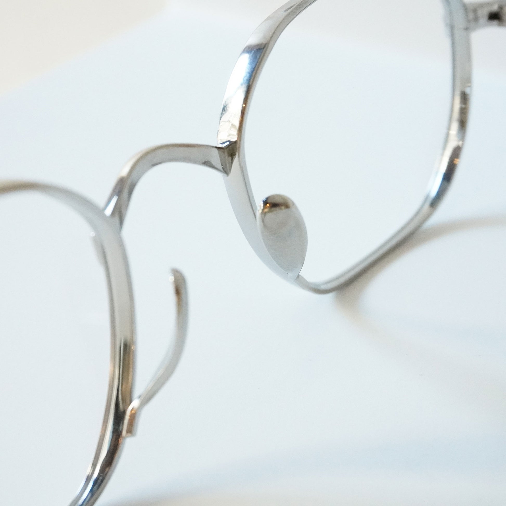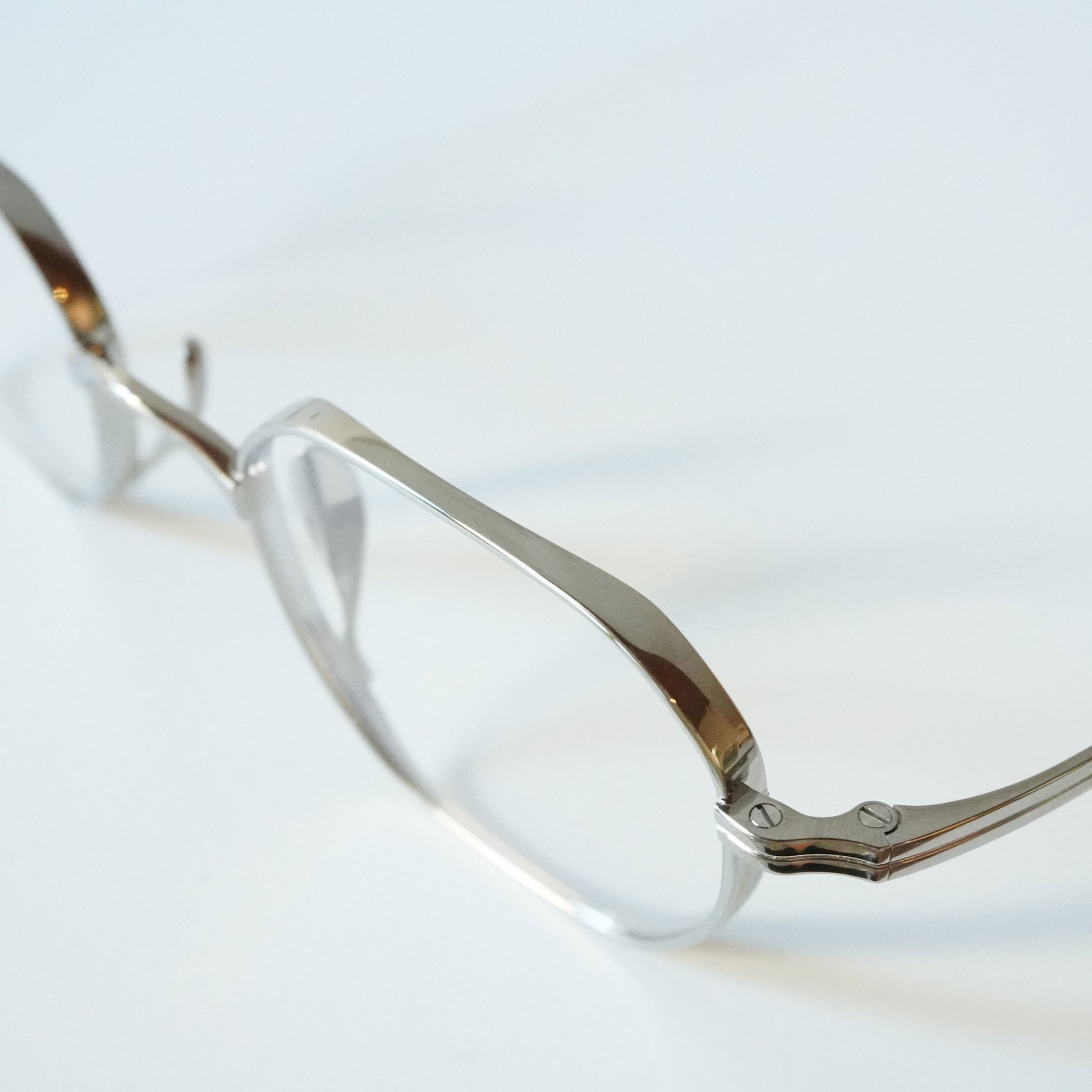 多角形のスクエアなシェイプ、リムは厚く横顔と正面の印象が違う魅力的なモデル。