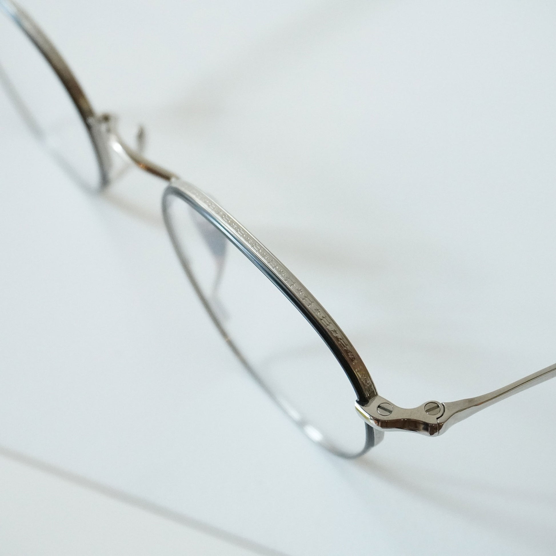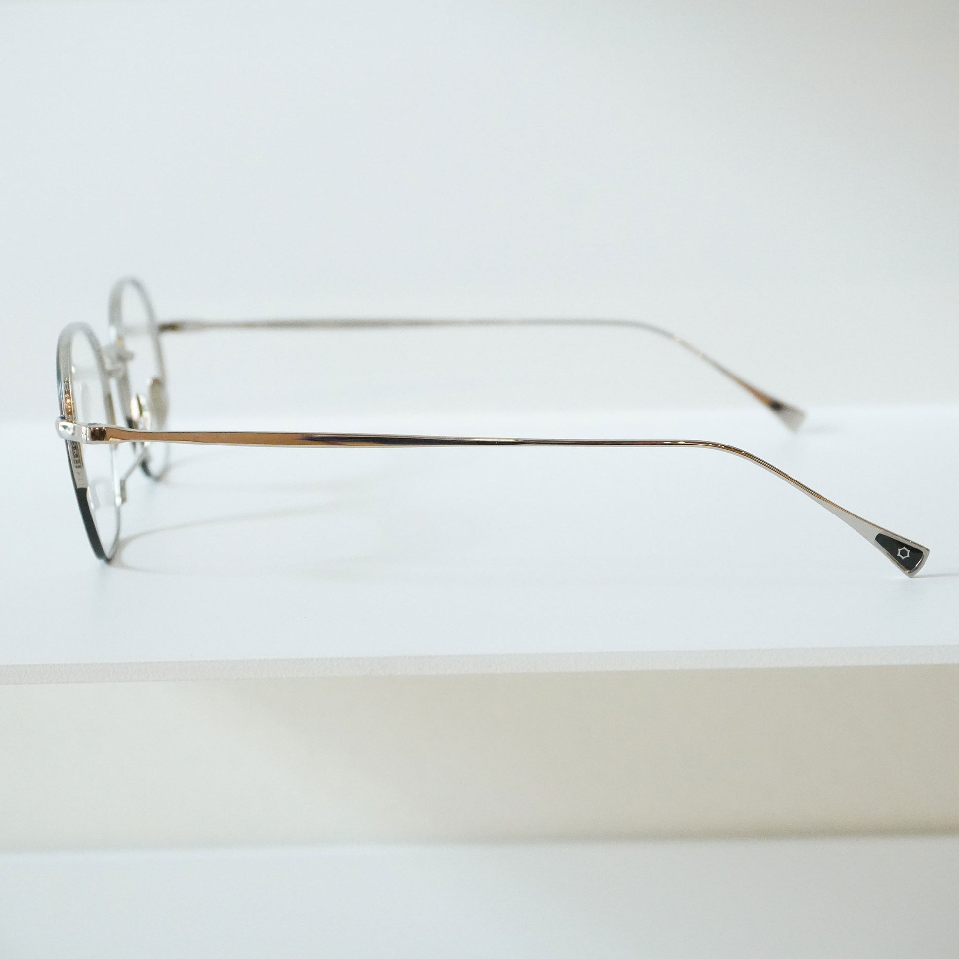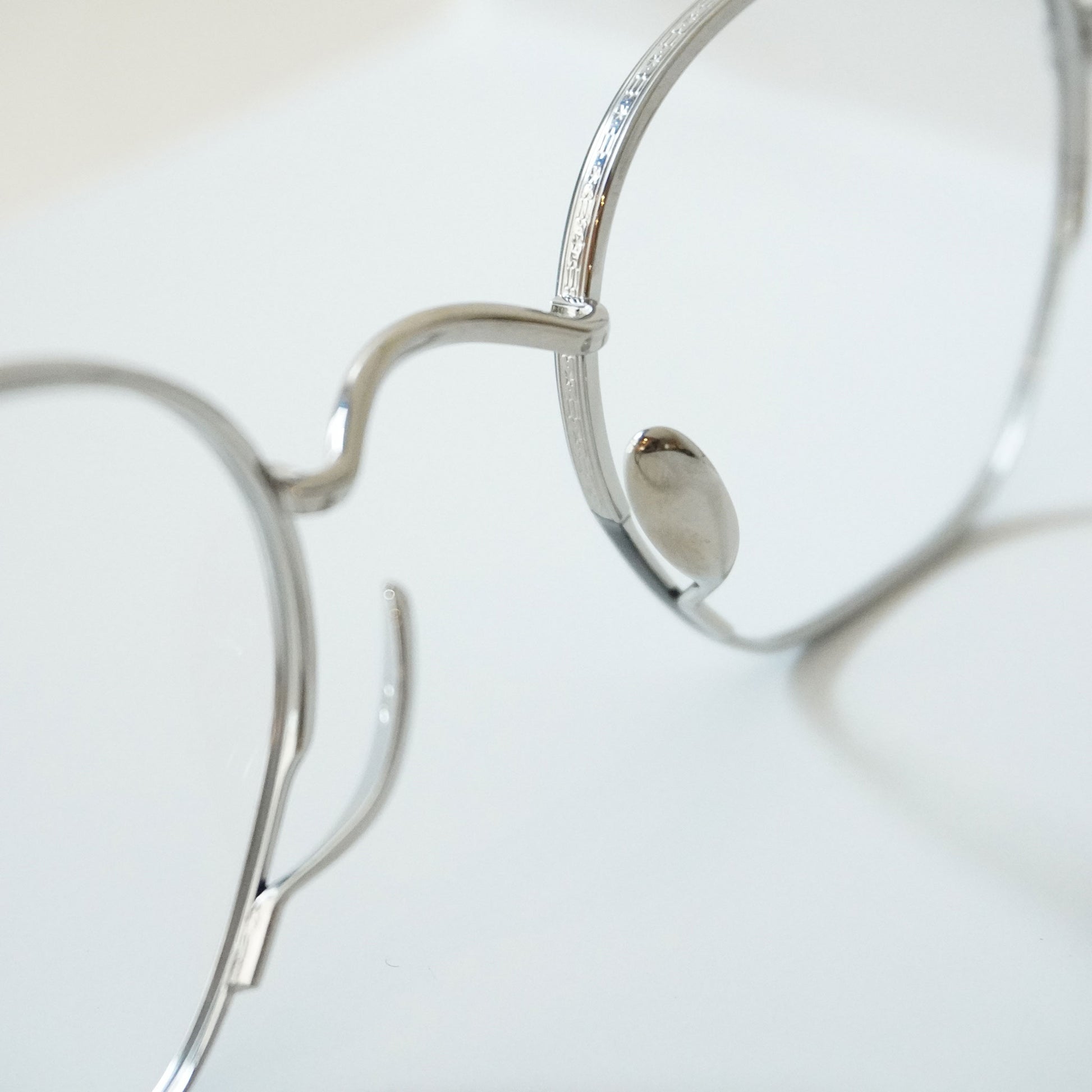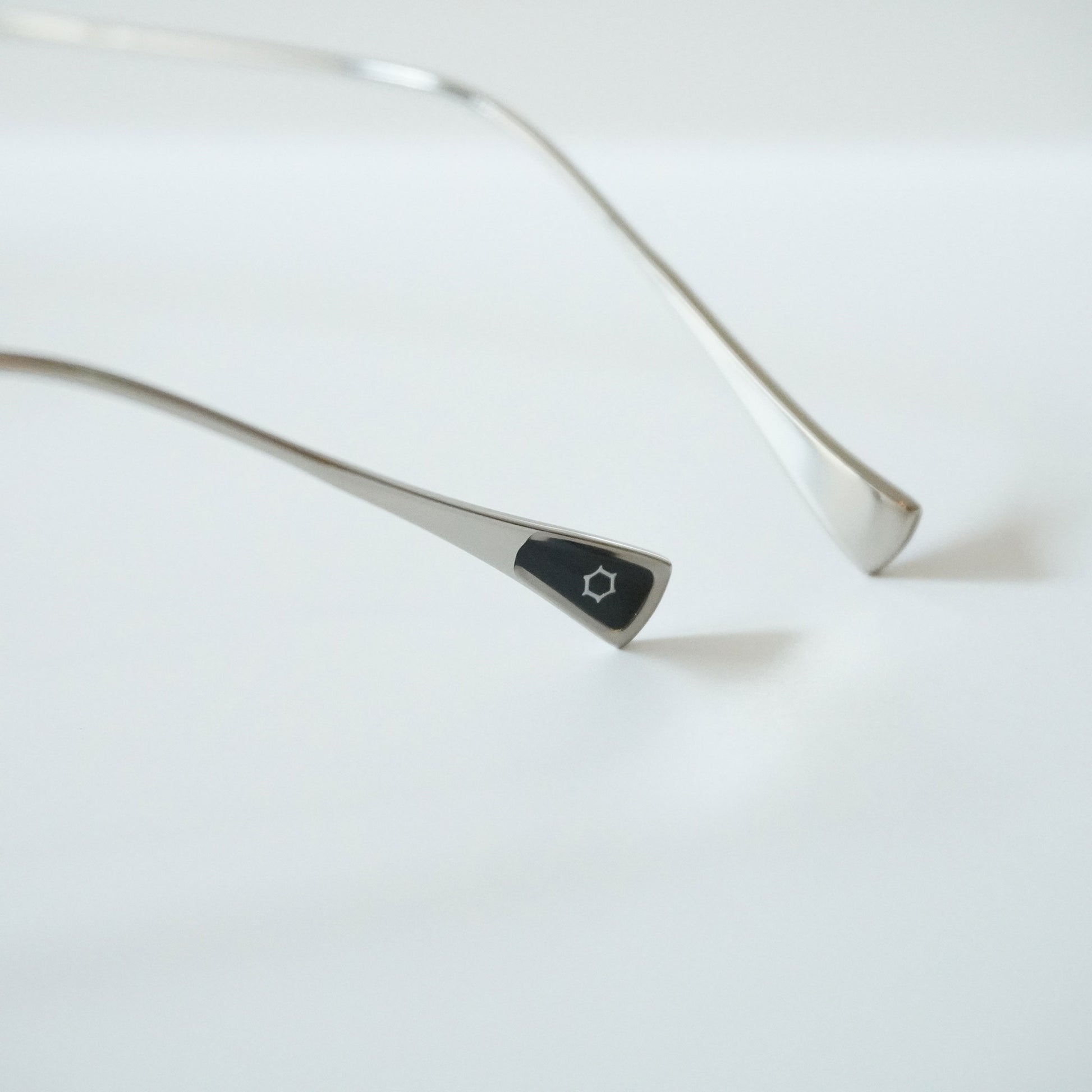 直線と曲線が調和した六角形に近い独自のフォルムに、“亀甲彫金”と“四葉”の意匠を掛け合わせたKMN5502。伝統と革新が交差するこのフレームには、健康・長寿・安全といった普遍的な願いが込められています。角度によって浮かび上がる繊細な彫金が、掛ける人の気分を引き立てます。