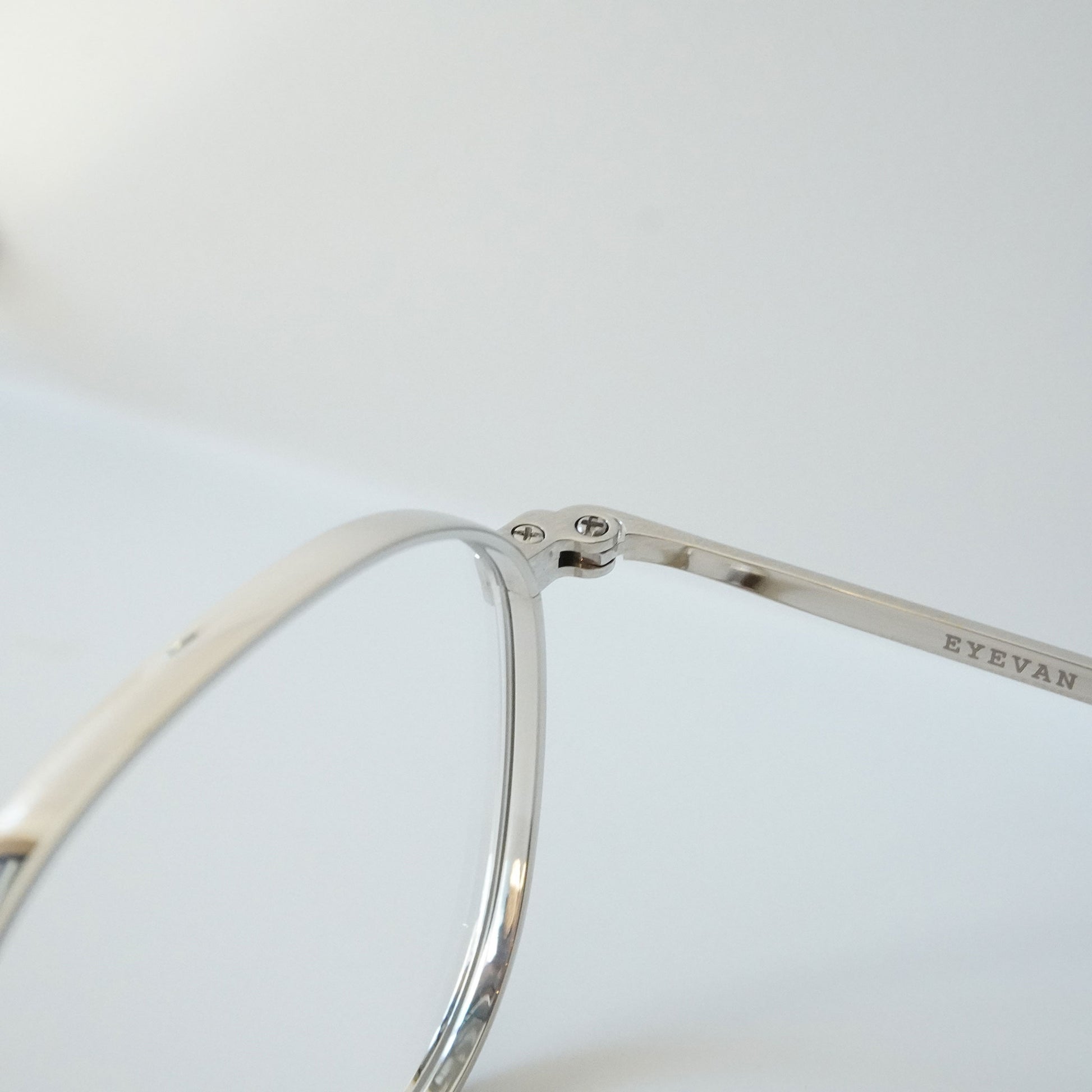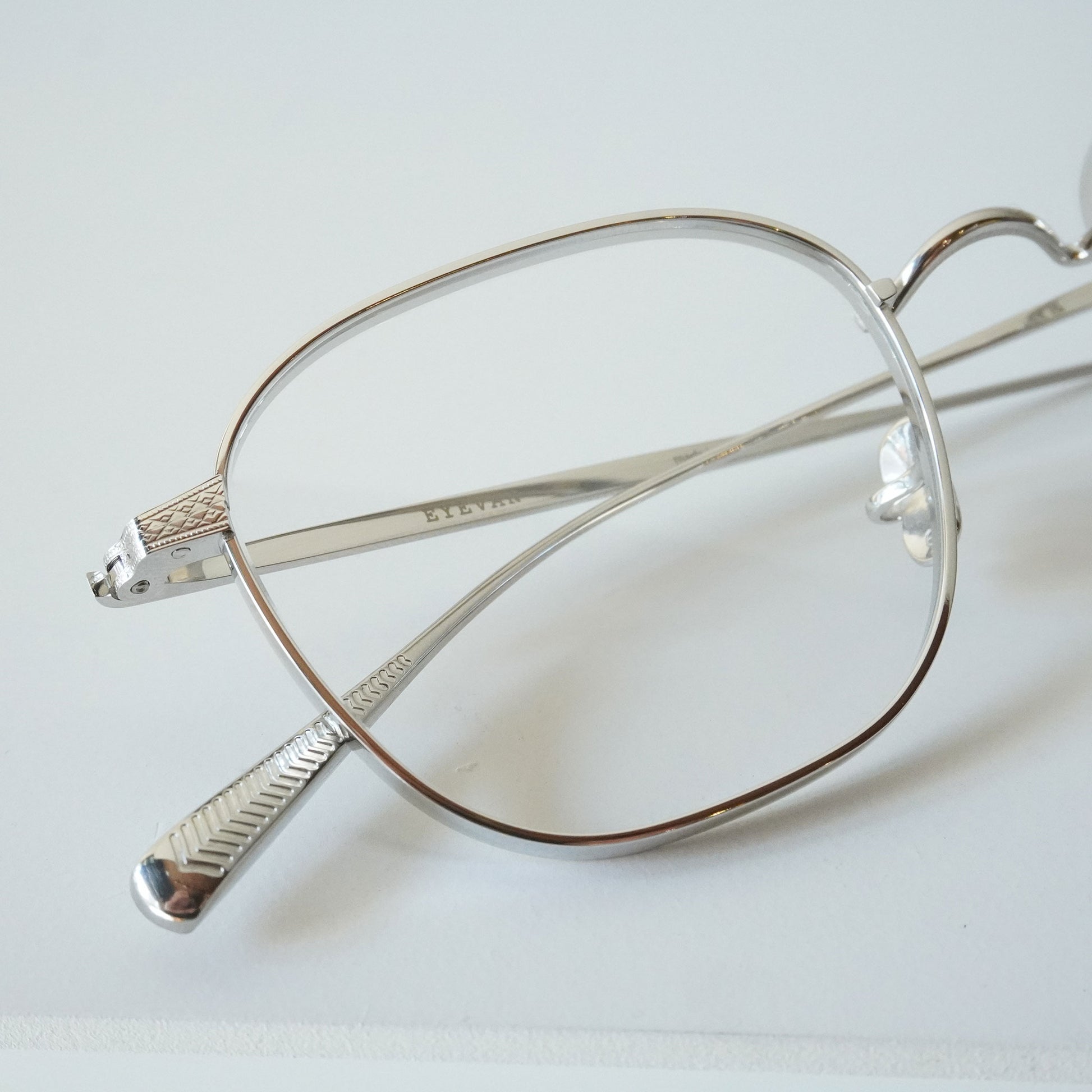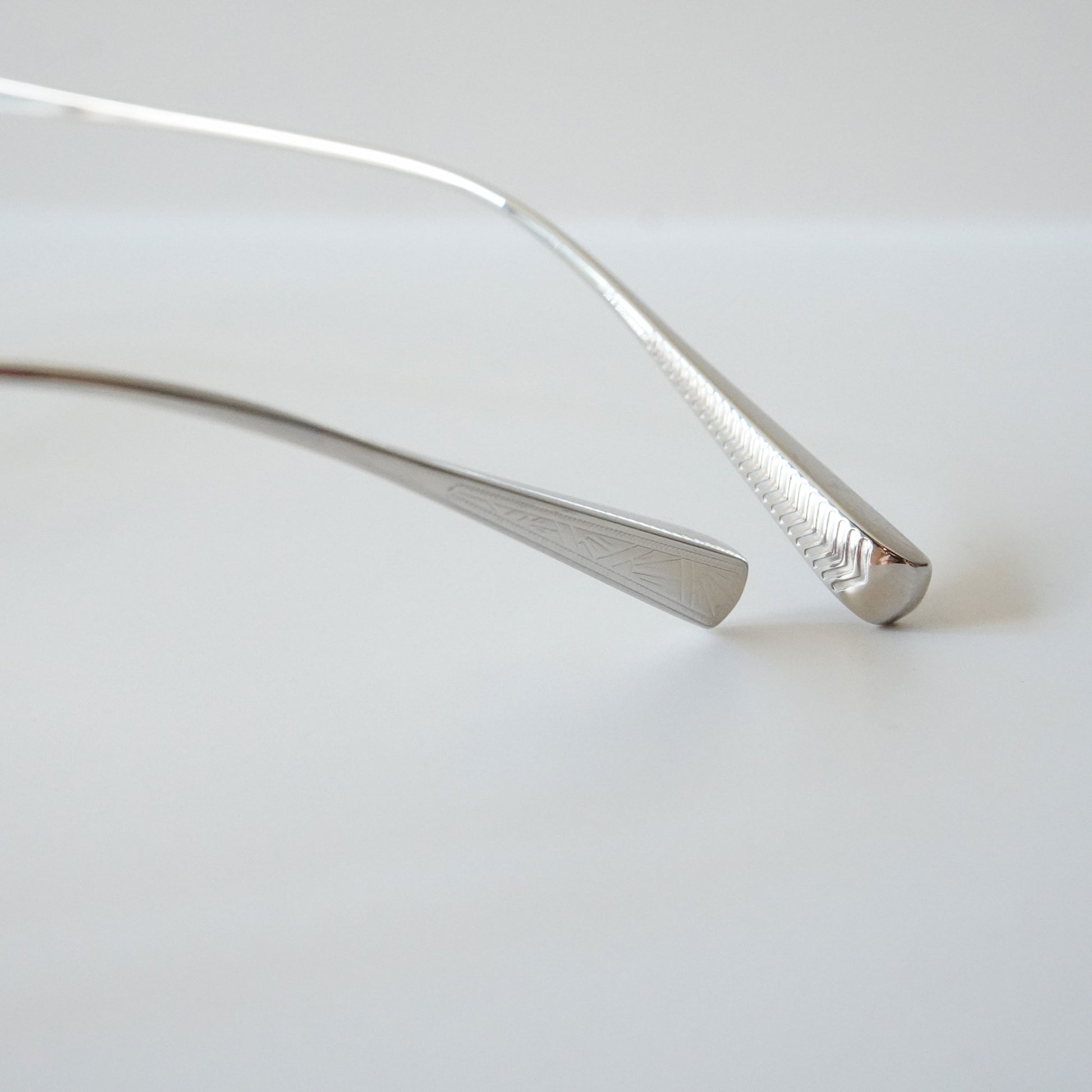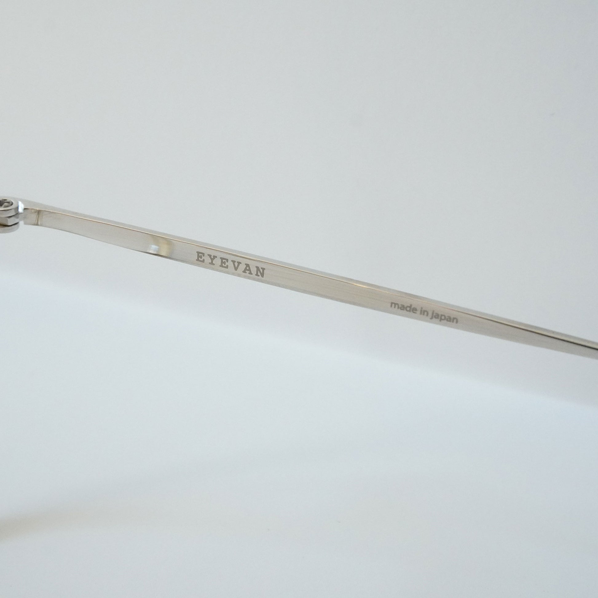形は柔らかさのある四角いシェイプ、特徴的なのが1930年代のセーフティゴーグルをイメージソースとした4mm厚のリムです。ヨロイからテンプルにかけて職人の手彫りマスターによる美しい彫金柄が細部にまで施されています。、ヨロイパーツをテンプルが覆う 「被せ智」と呼ばれる構造内にはストップ丁番機能が備えられ、ヴィンテージの持つ様式美に現代の技術を融合されています。装着感に優れたチタンを使ってEYEVANらしいデザイン性と機能性に優れたモデルになっています。
