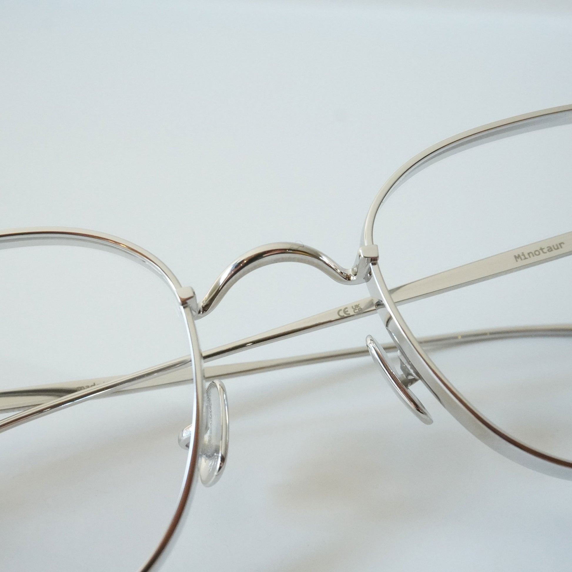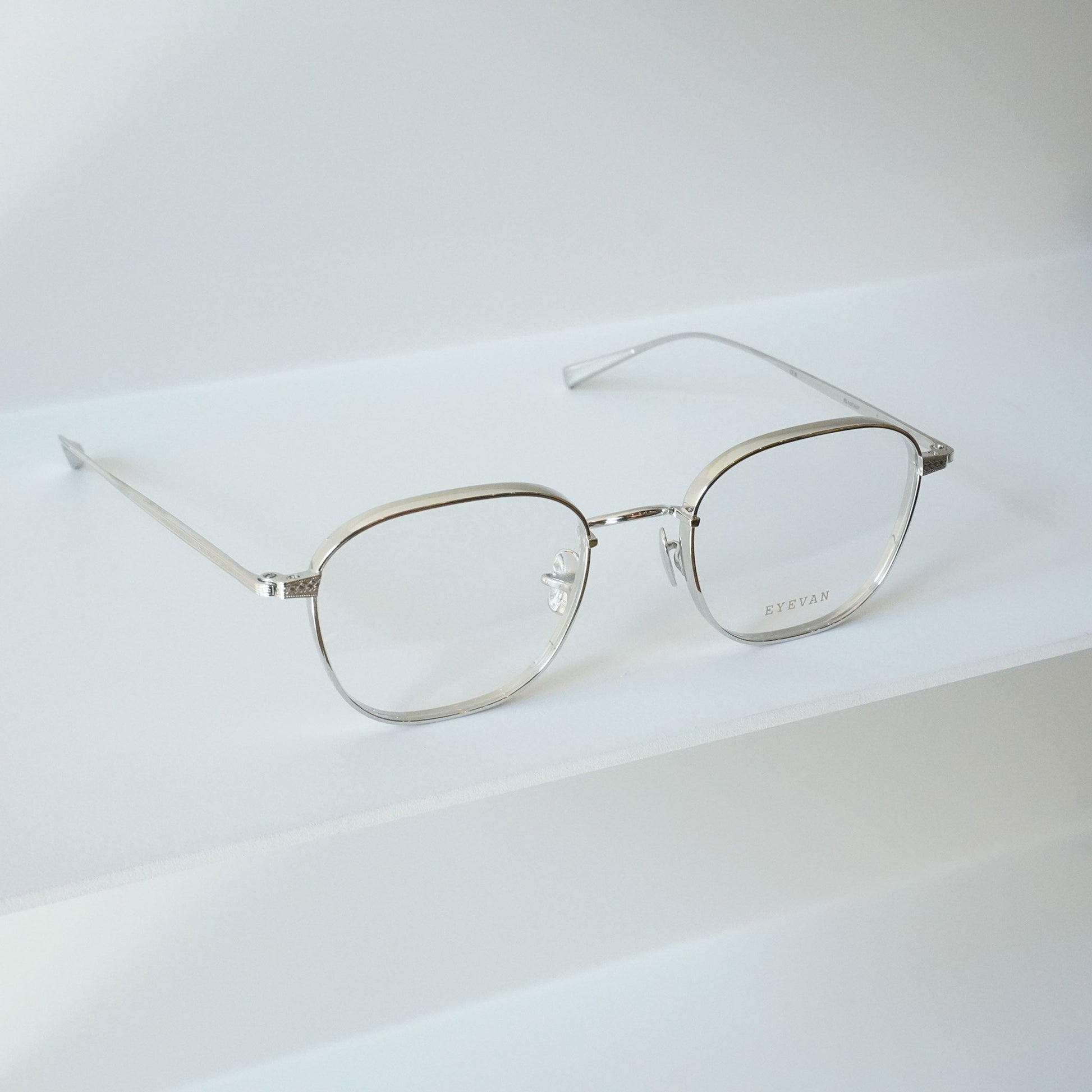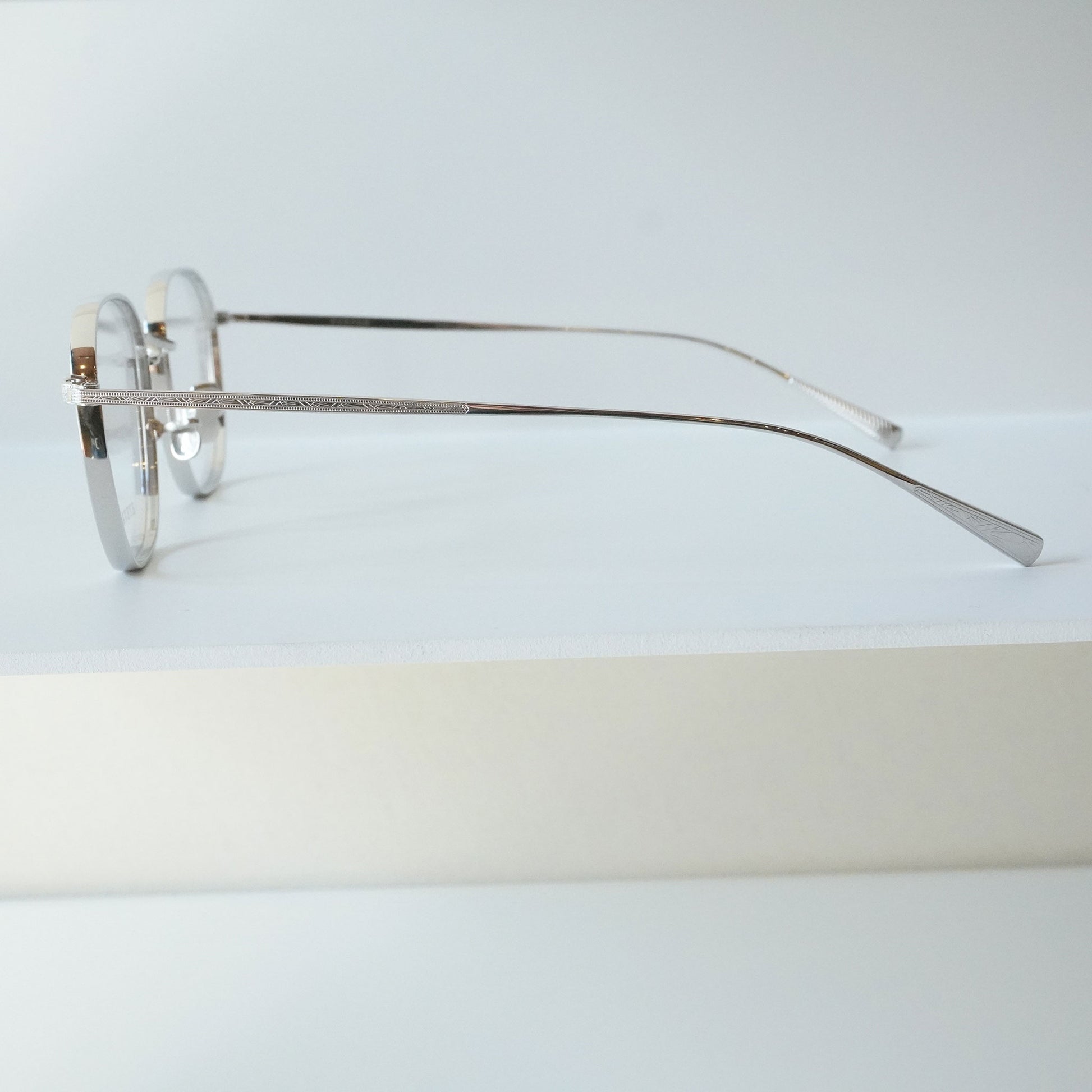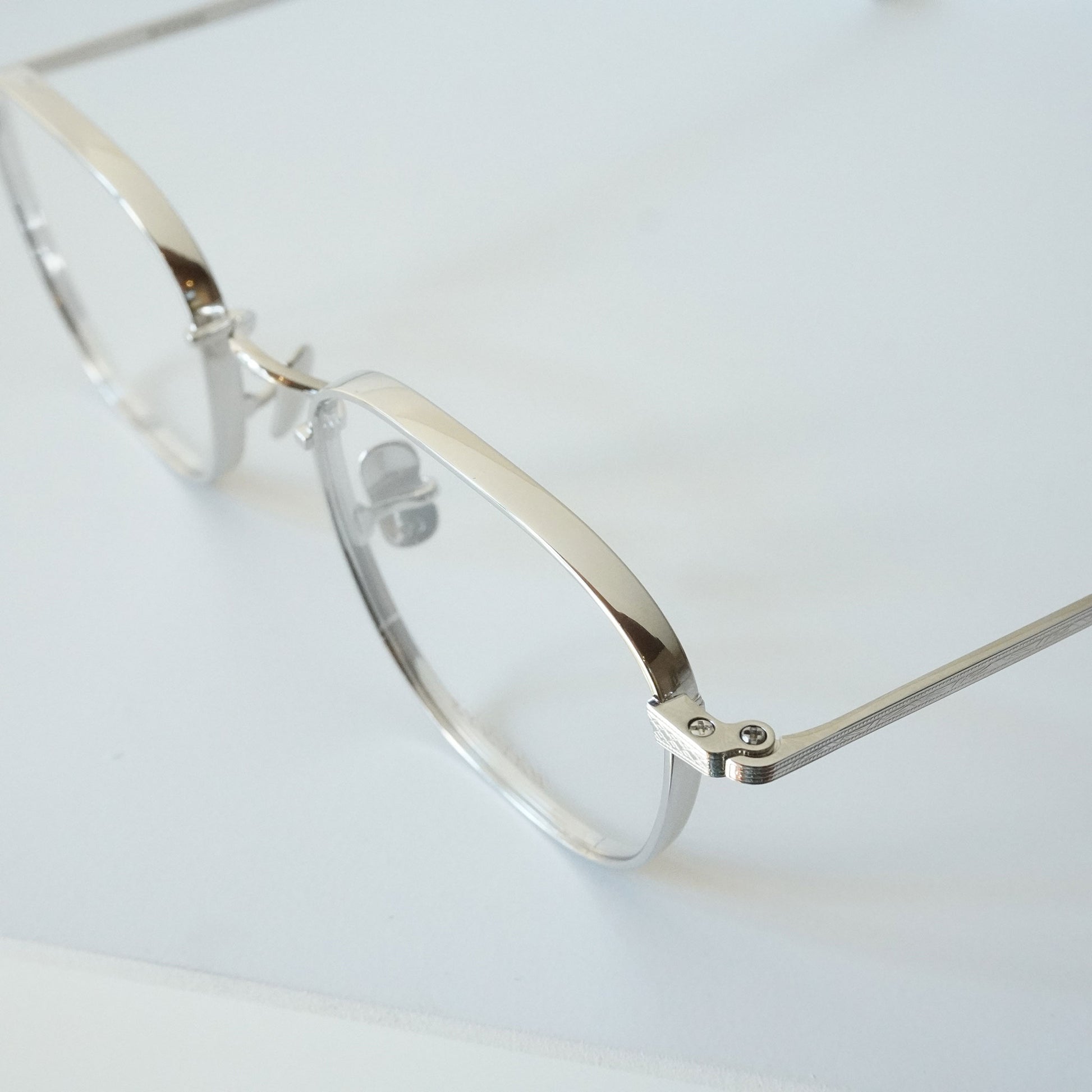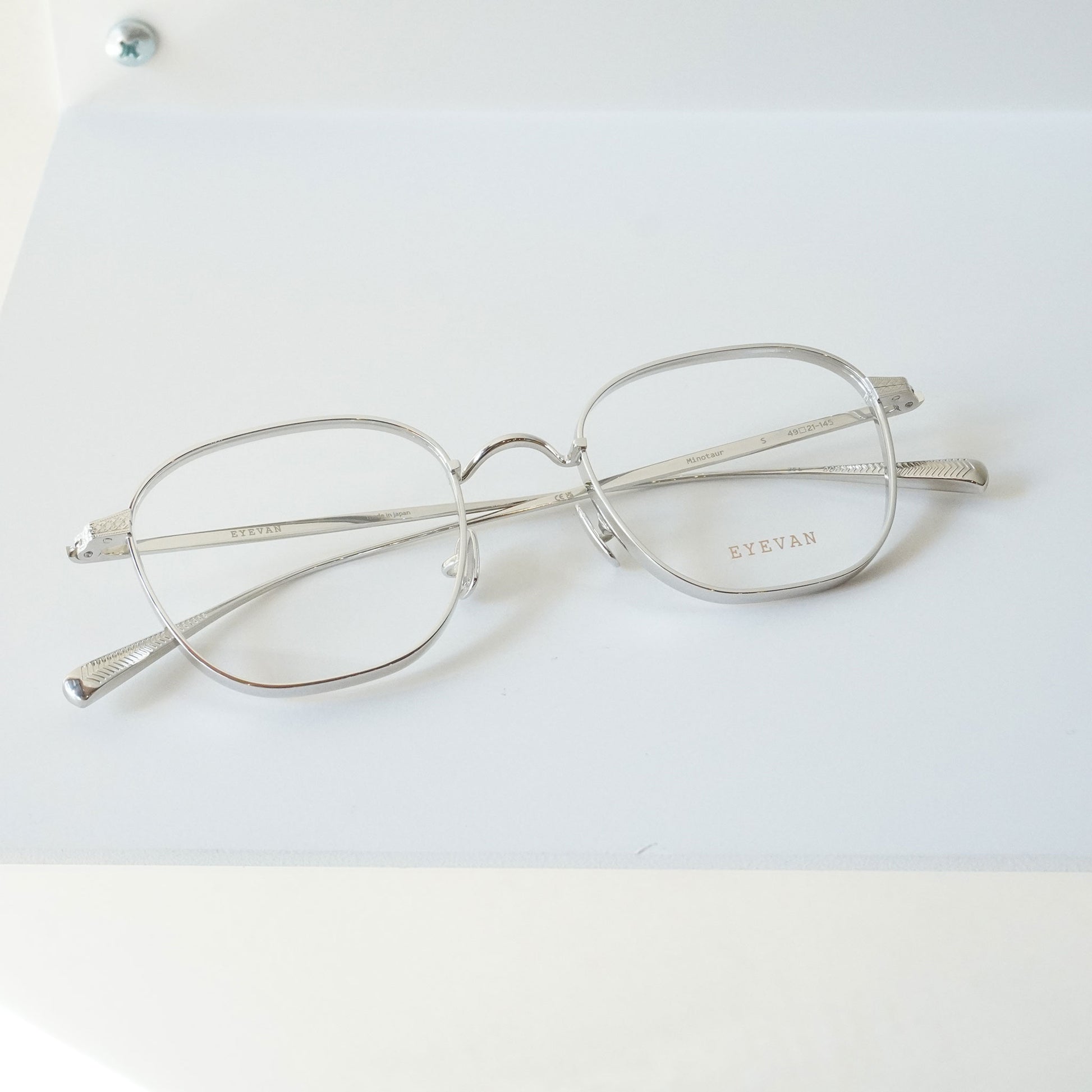 形は柔らかさのある四角いシェイプ、特徴的なのが1930年代のセーフティゴーグルをイメージソースとした4mm厚のリムです。ヨロイからテンプルにかけて職人の手彫りマスターによる美しい彫金柄が細部にまで施されています。、ヨロイパーツをテンプルが覆う 「被せ智」と呼ばれる構造内にはストップ丁番機能が備えられ、ヴィンテージの持つ様式美に現代の技術を融合されています。装着感に優れたチタンを使ってEYEVANらしいデザイン性と機能性に優れたモデルになっています。