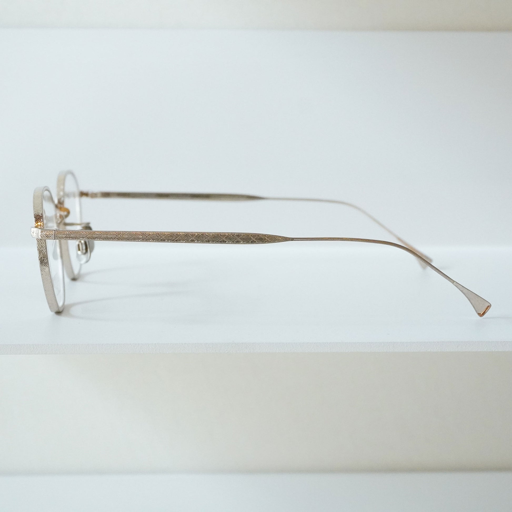 VAN柄(アルファベットのV.A.Nが隠されたオリジナル柄)をパーツの表面すべてに型押しした総柄の眼鏡。直線的なデザインで構成された柄だが、マスターの全ての柄を一人の職人が手彫りで仕上げることにより、強過ぎない柔らかい存在感を形にすることができた。