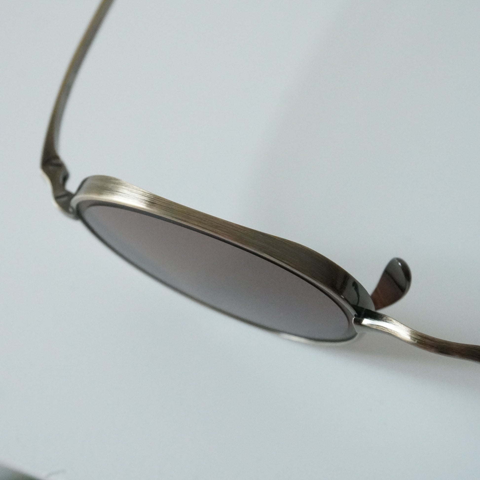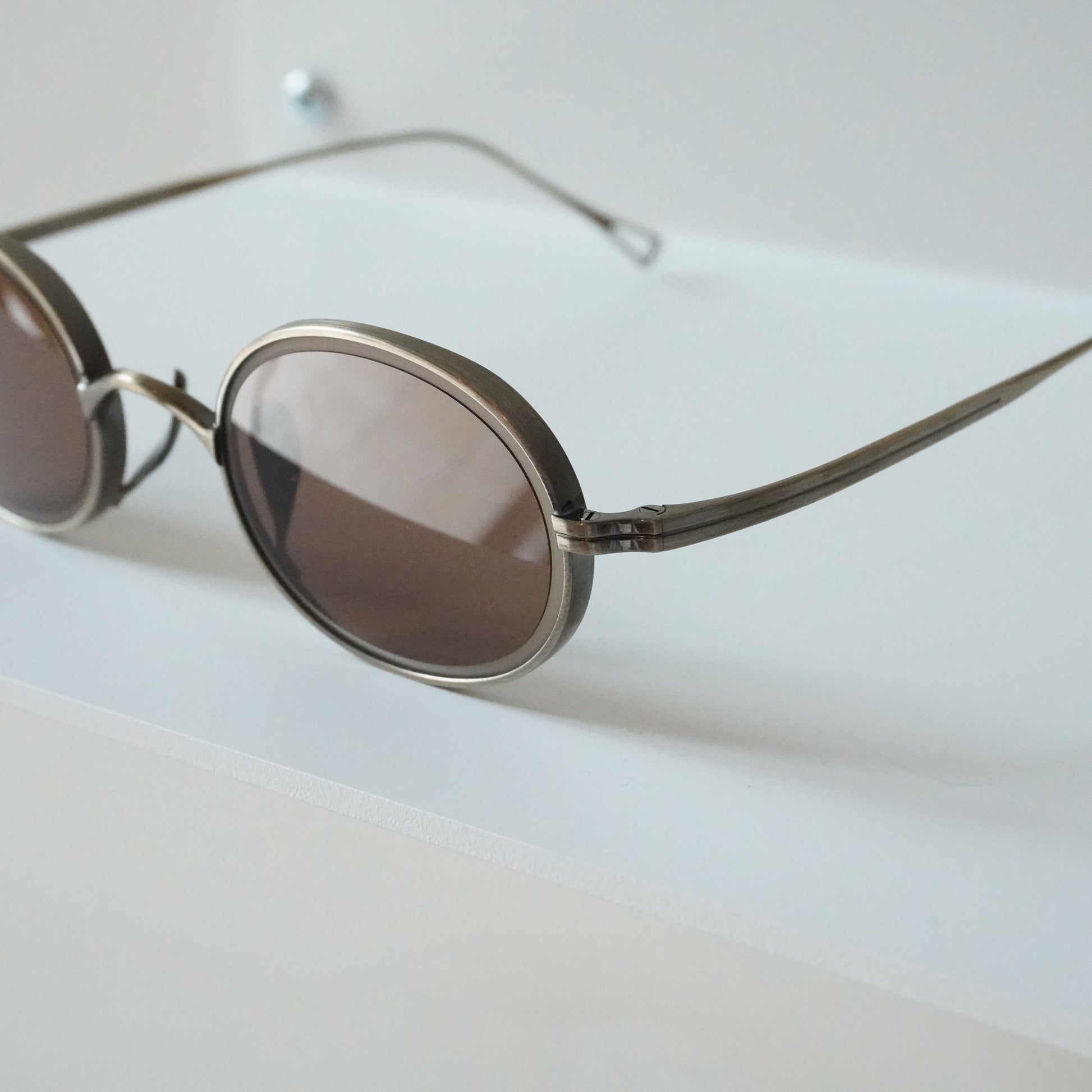 太阳镜采用椭圆形厚框设计。这是一款散发着独特气息的专业产品编号。 KameManNen 的原创镜片是采用全钛材质的舒适型号,通过刮擦外周呈现出不同质感的大胆镜片规格。